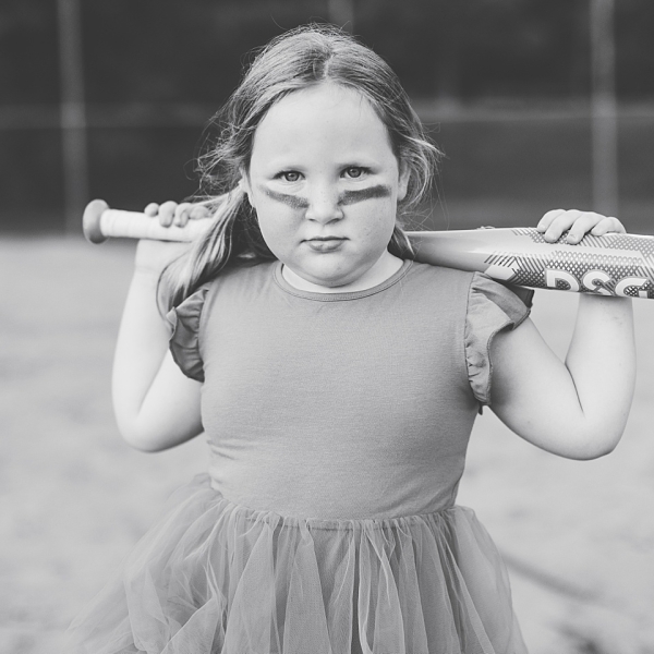 I had an absolute blast doing t-ball portraits for this little spunk of a girl! Her mom Cassie contacted me to say that her daughter had joined t-ball this year and was absolutely crushing it. And needless to say, this girl loves t-ball. She enjoys telling the coach that she should be playing 1st base because 3rd base is boring, she gets aggravated that no one is keeping score, and enjoys sporting poofy princess dresses *and* her t-ball gear whenever possible (i.e. this shoot). So Cassie and I organized a little shoot for her where she could run the bases, catch the ball, pose in her pink princess dress and her helmet, and of course – hit stuff with a bat. She was such a little trooper and had the best time, especially autographing a baseball for her mom. It was a blast and I’m pretty sure I got my exercise in too. :)