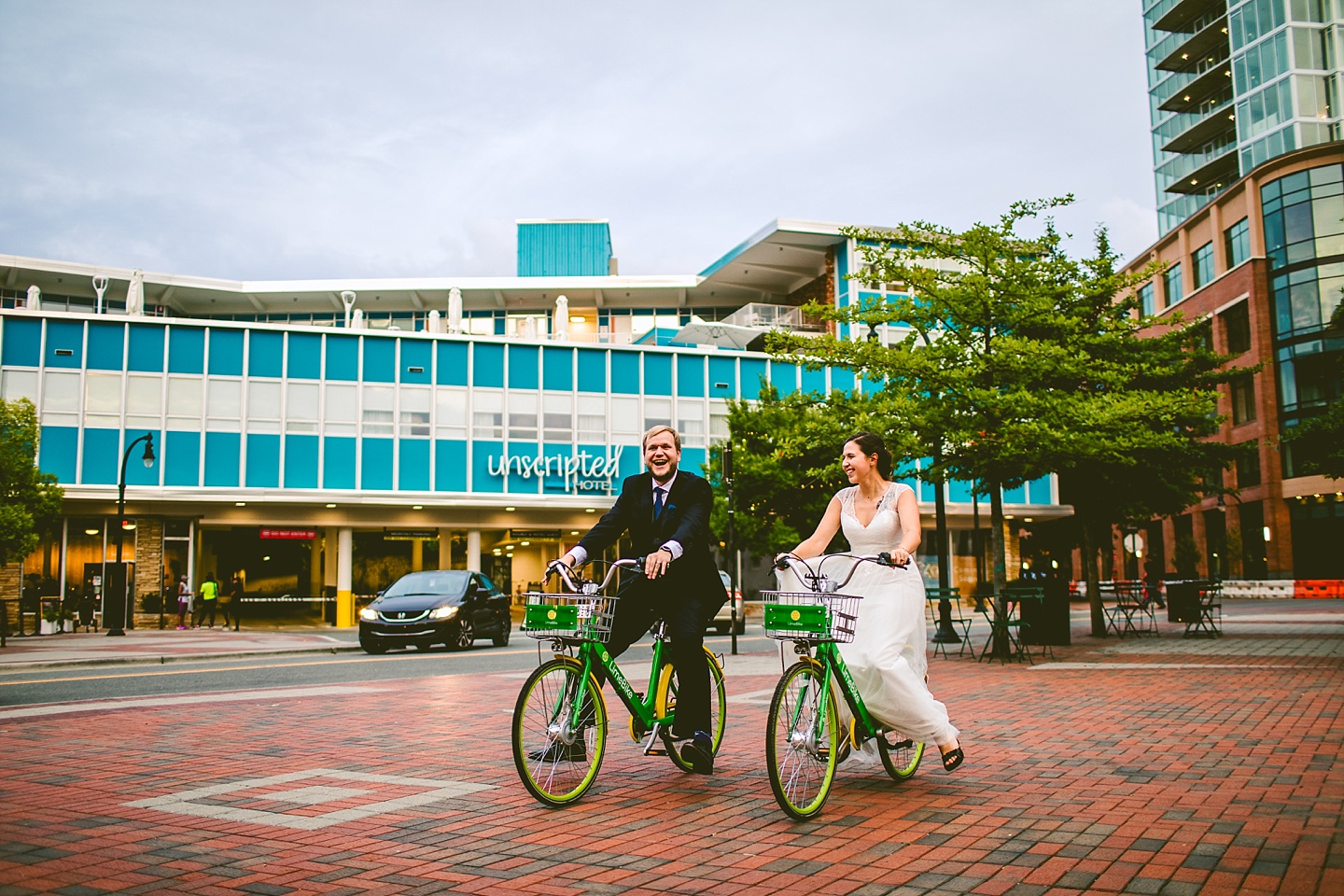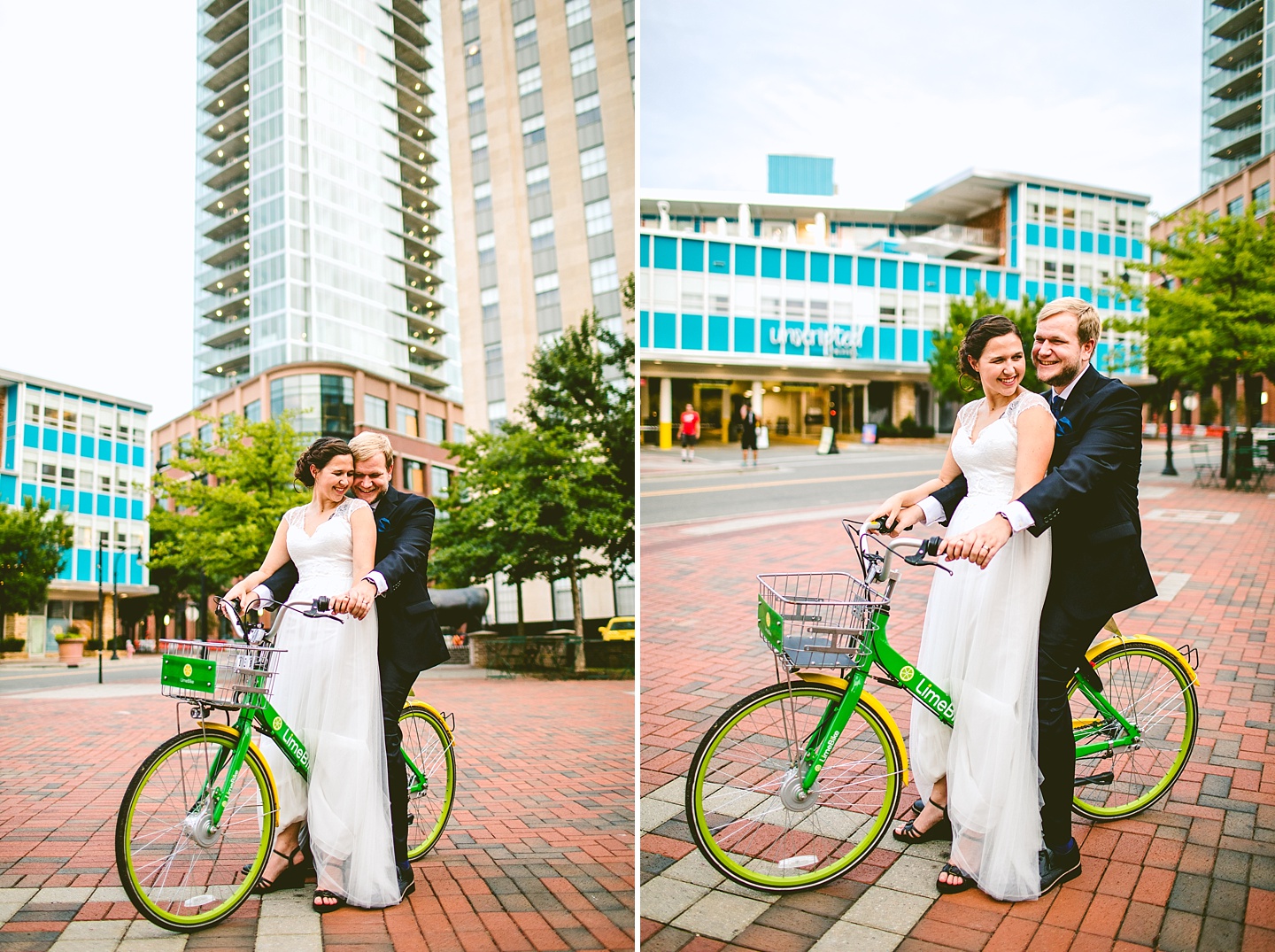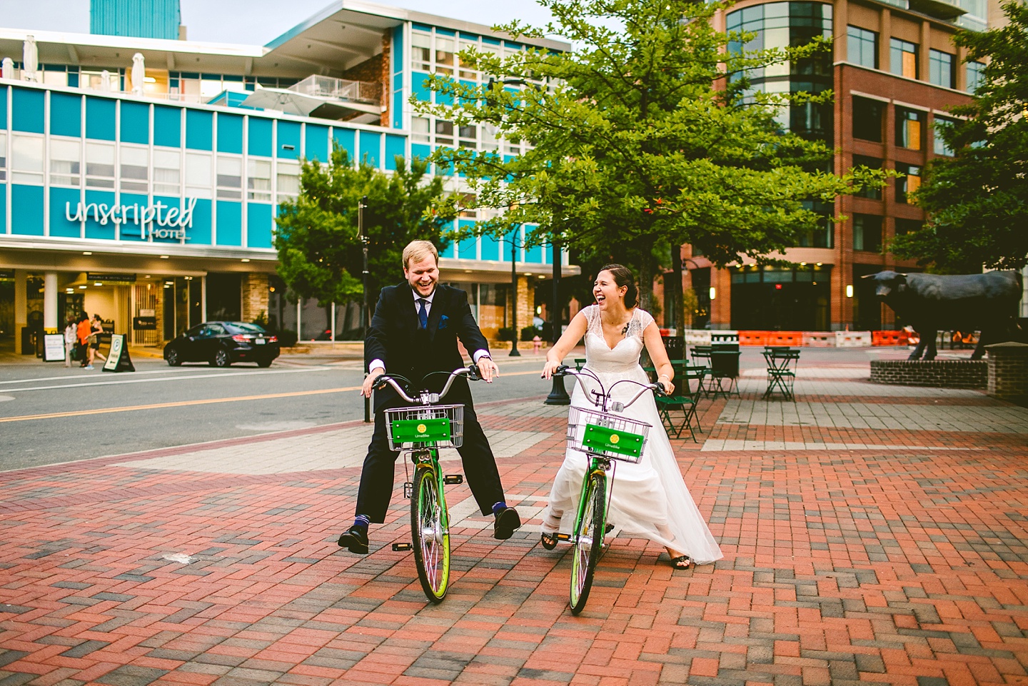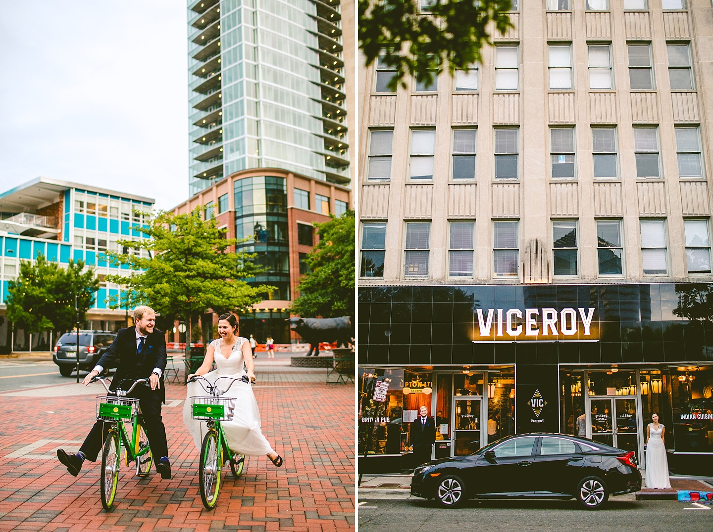 It was a pleasure to meet and work with these guys on an elopement-style session! Jessi and Alec got married at the courthouse and celebrated with family later in the week, but they wanted photos in all their garb downtown prior to the festivities, and we were happy to oblige. They are such a sweet couple, and into all things science. They met at an observatory (I believe Alec proclaimed himself the King of the Observatory at one point, which is a truly amazing and wonderful title) and have been having outdoorsy and sciencey adventures together ever since. They also like good music and movies and can ride a rented bike downtown like nobody’s business. It’s not easy to get on one of those things wearing a significant amount of tulle or a suit, but they managed quite well. We hit up all their favorite local spots in Durham (shout out to Viceroy for being nice enough to let us take a few inside!) and got to know this awesome pair. Congratulations to Jessi+Alec!