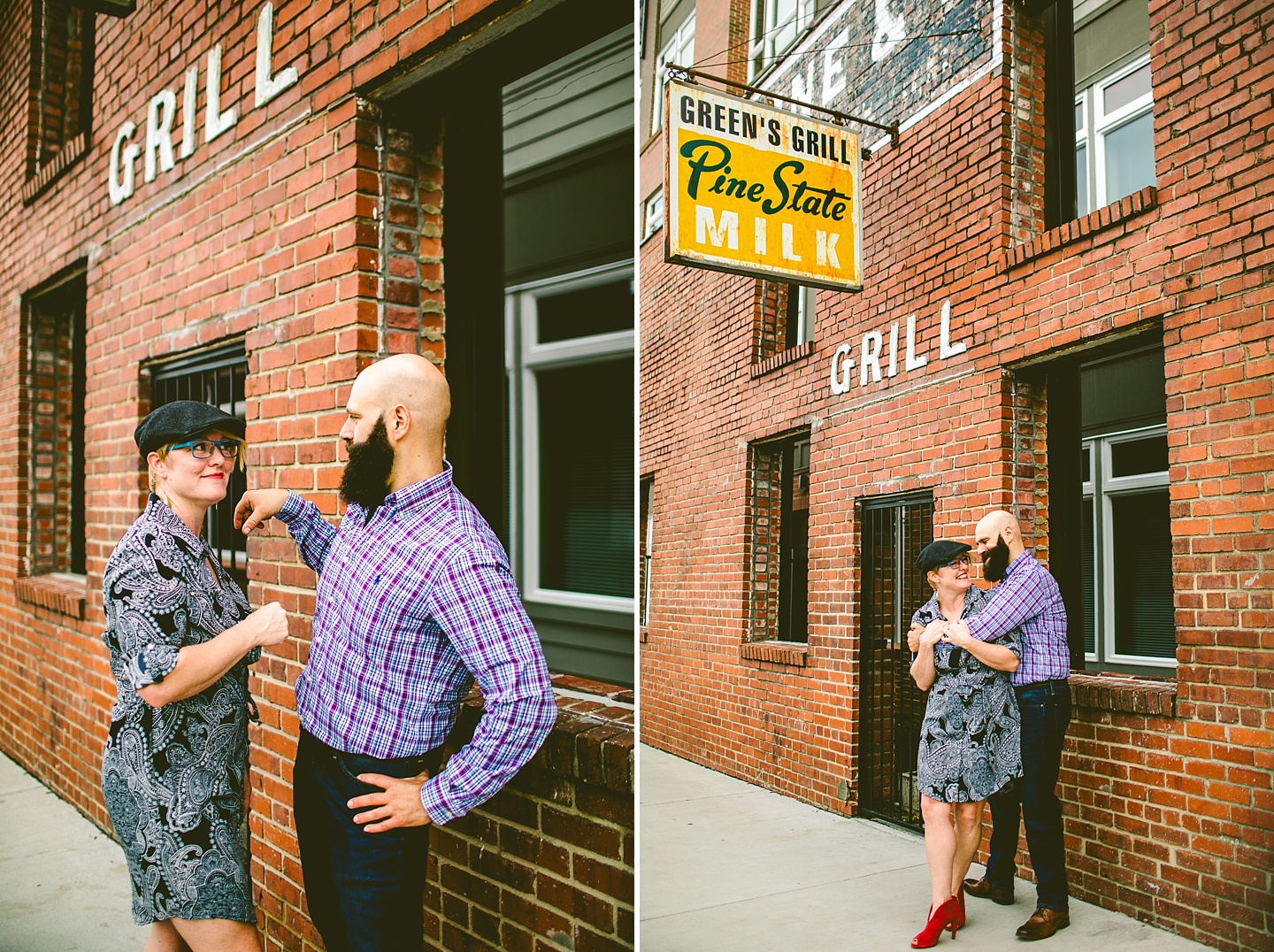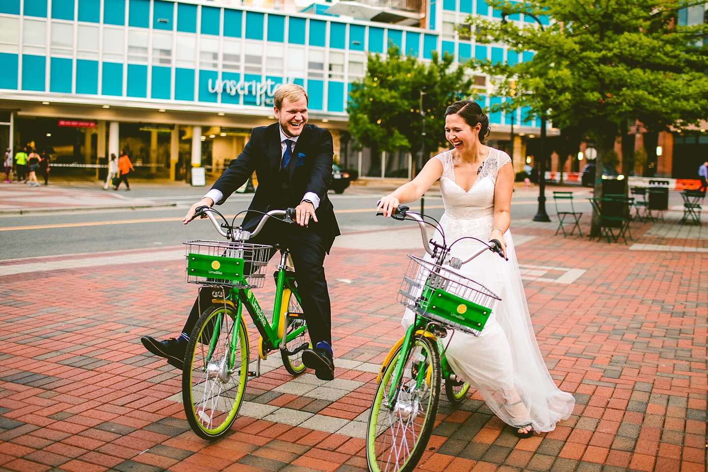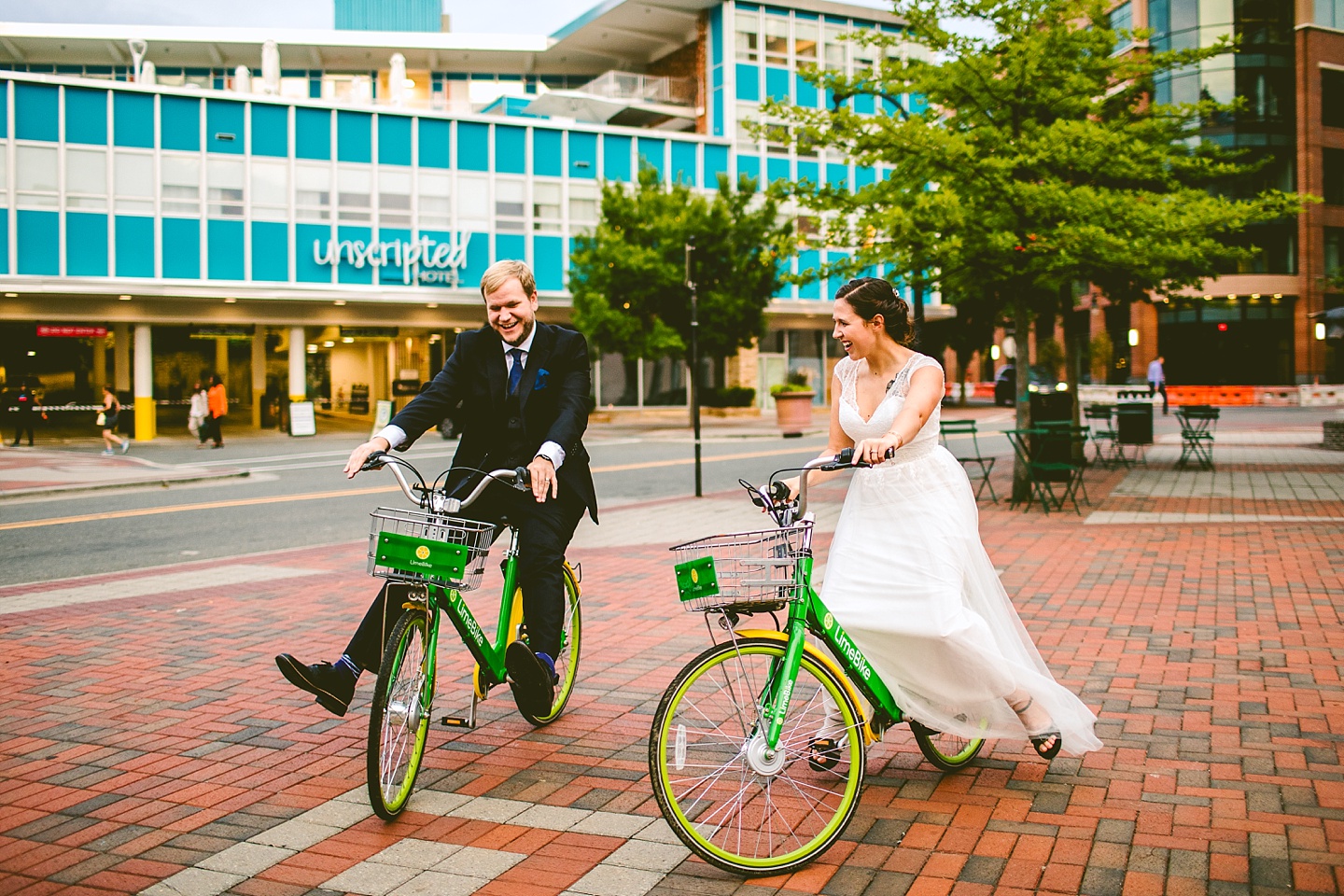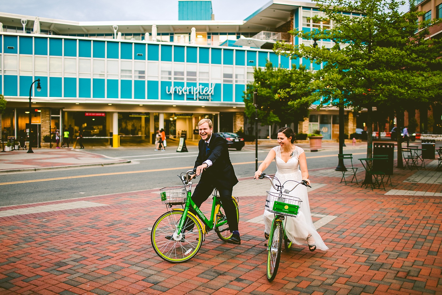 It was a pleasure to meet and work with these guys on an elopement-style session! Jessi and Alec got married at the courthouse and celebrated with family later in the week, but they wanted photos in all their garb downtown prior to the festivities, and we were happy to oblige. They are such a sweet couple, and into all things science. They met at an observatory (I believe Alec proclaimed himself the King of the Observatory at one point, which is a truly amazing and wonderful title) and have been having outdoorsy and sciencey adventures together ever since. They also like good music and movies and can ride a rented bike downtown like nobody’s business. It’s not easy to get on one of those things wearing a significant amount of tulle or a suit, but they managed quite well. We hit up all their favorite local spots in Durham (shout out to Viceroy for being nice enough to let us take a few inside!) and got to know this awesome pair. Congratulations to Jessi+Alec!