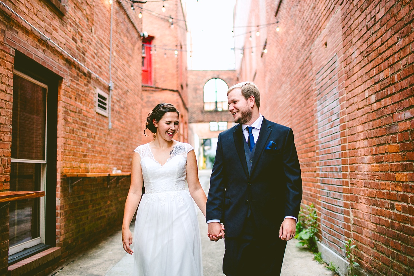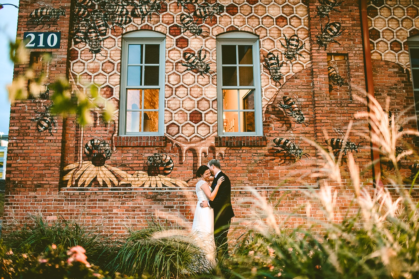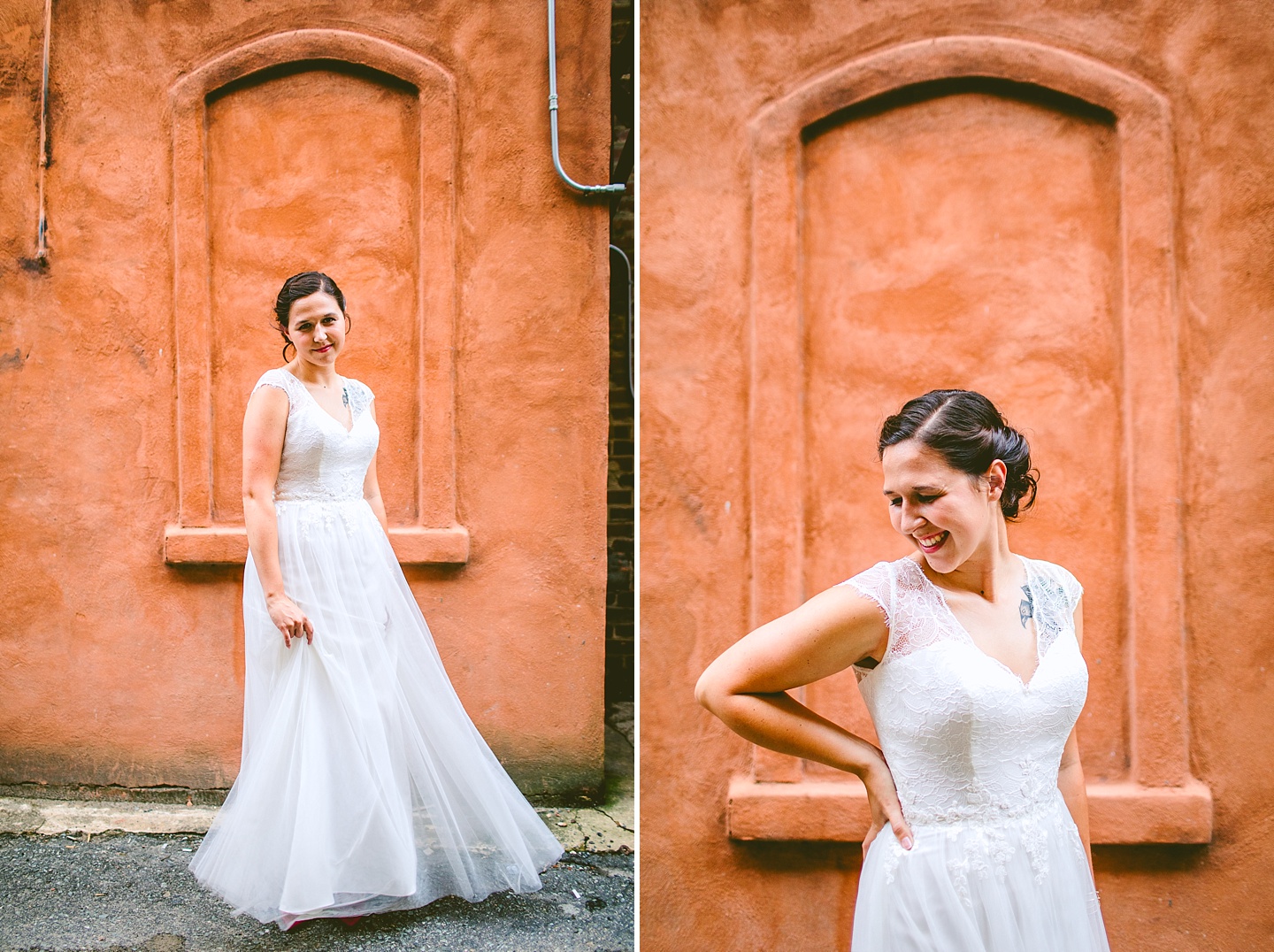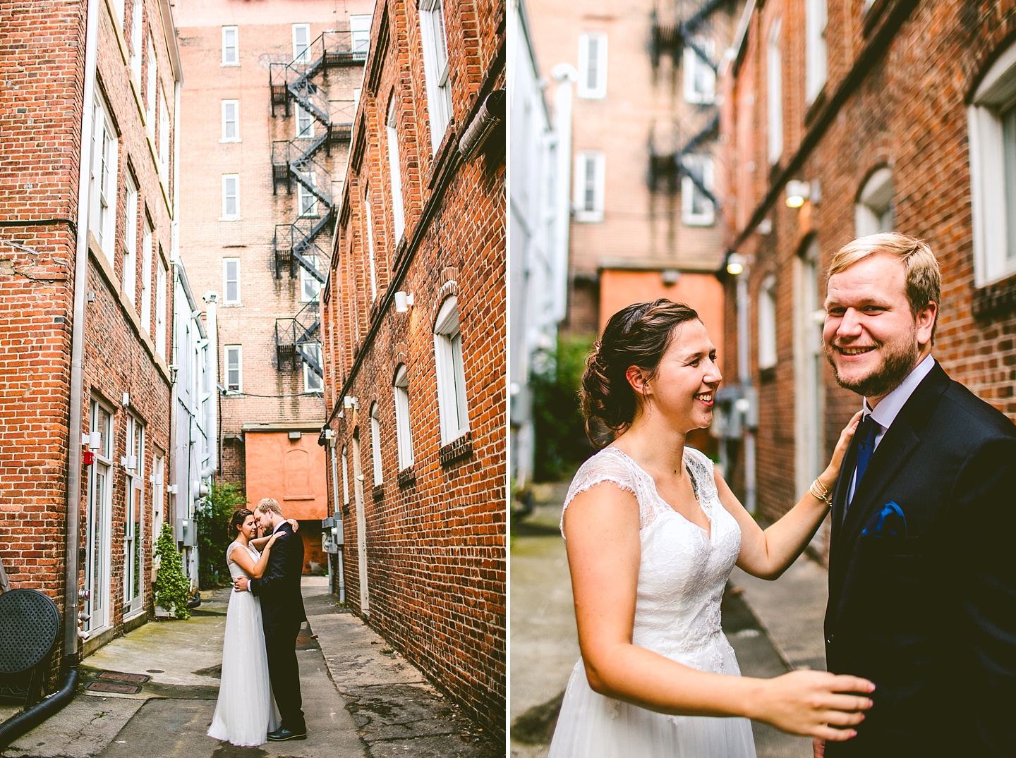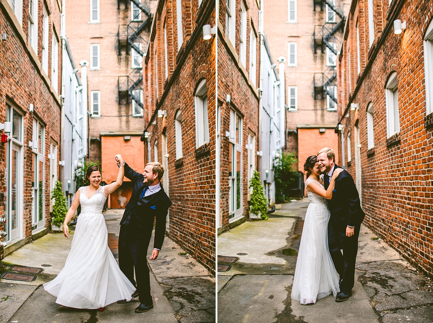It was a pleasure to meet and work with these guys on an elopement-style session! Jessi and Alec got married at the courthouse and celebrated with family later in the week, but they wanted photos in all their garb downtown prior to the festivities, and we were happy to oblige. They are such a sweet couple, and into all things science. They met at an observatory (I believe Alec proclaimed himself the King of the Observatory at one point, which is a truly amazing and wonderful title) and have been having outdoorsy and sciencey adventures together ever since. They also like good music and movies and can ride a rented bike downtown like nobody’s business. It’s not easy to get on one of those things wearing a significant amount of tulle or a suit, but they managed quite well. We hit up all their favorite local spots in Durham (shout out to Viceroy for being nice enough to let us take a few inside!) and got to know this awesome pair. Congratulations to Jessi+Alec!