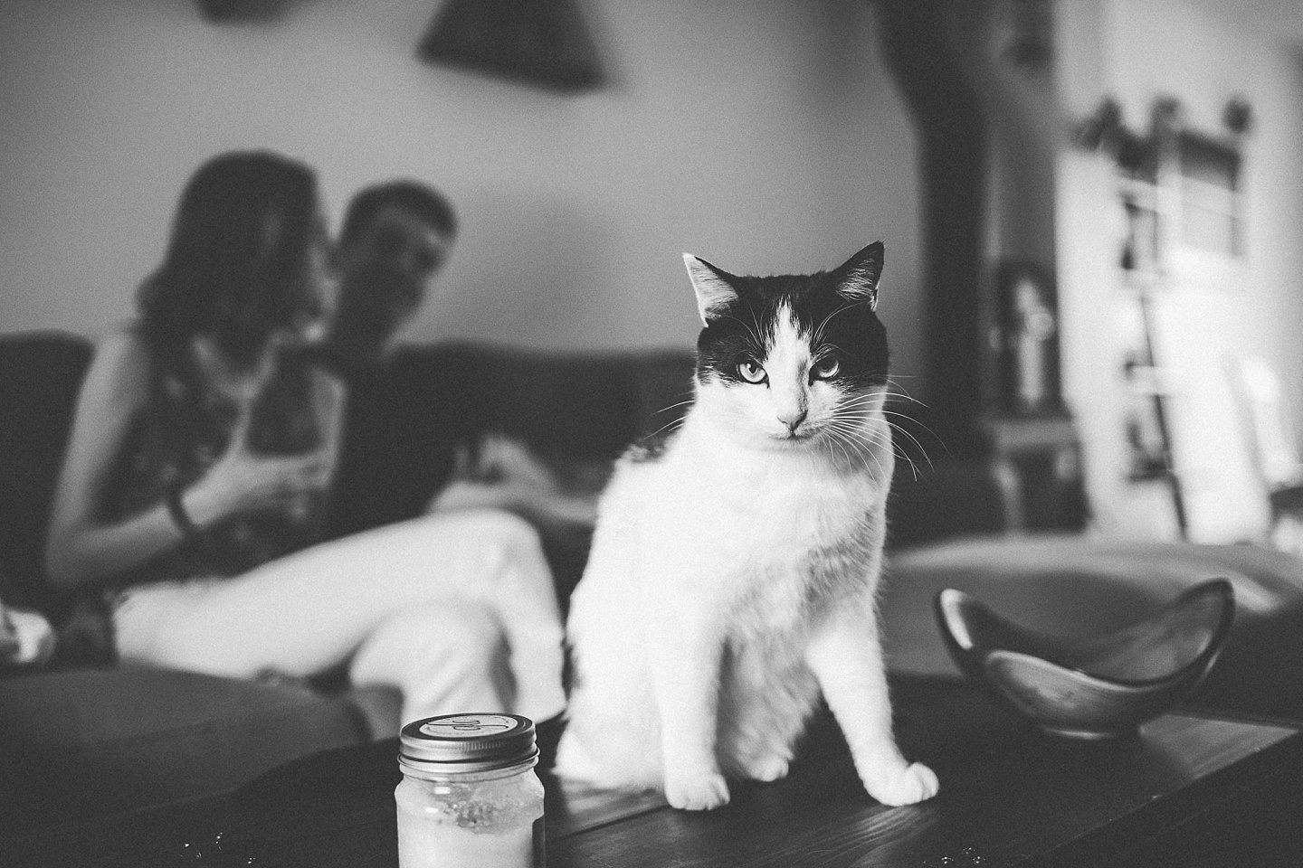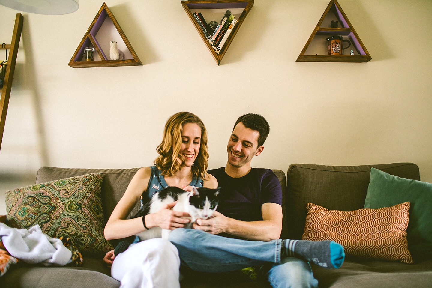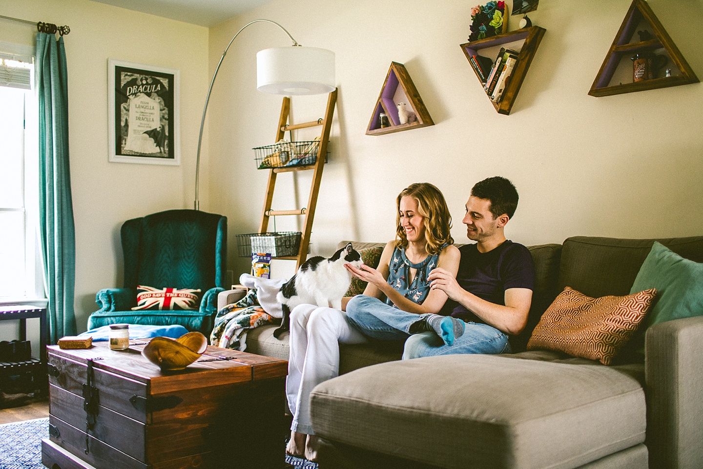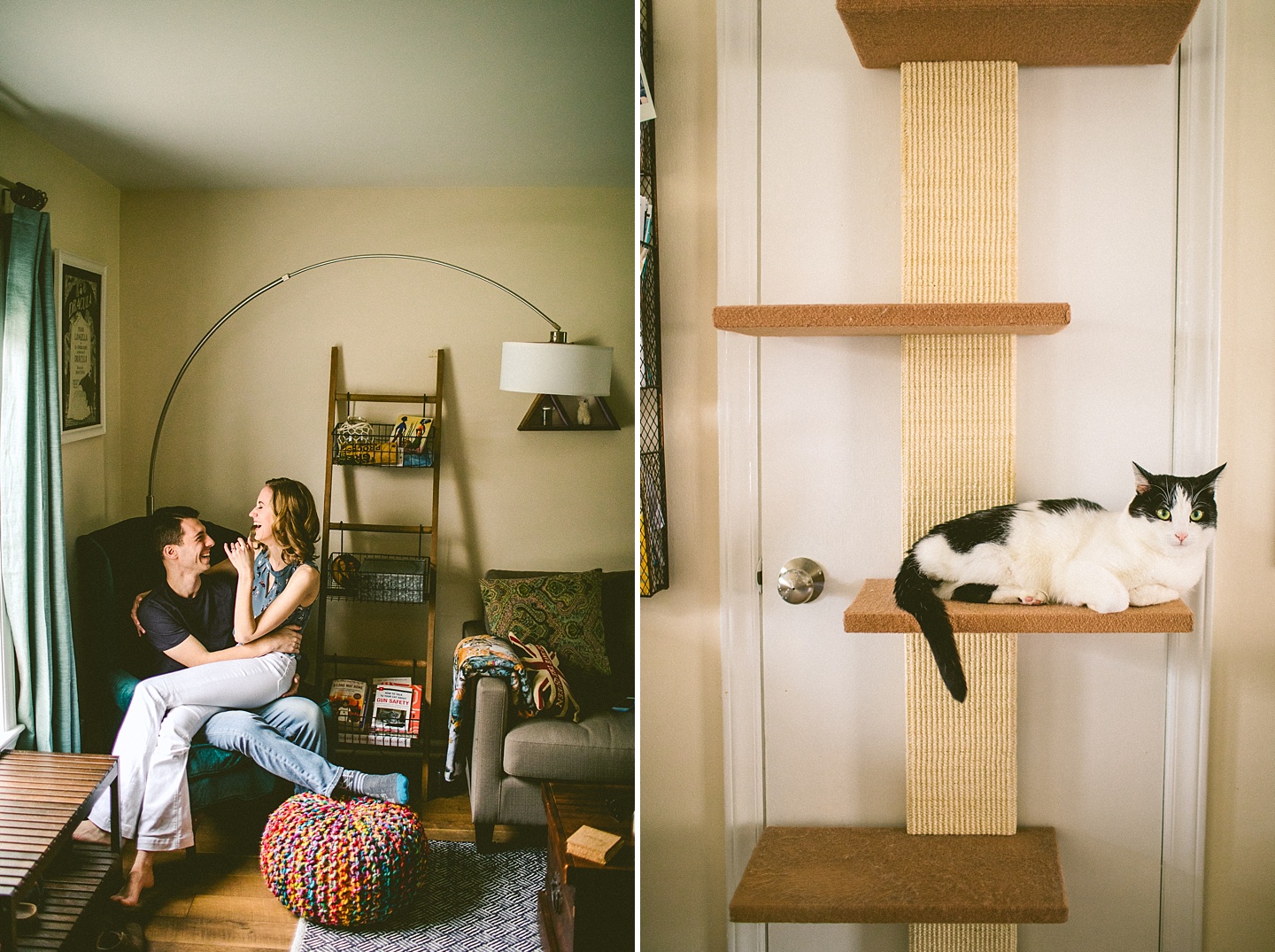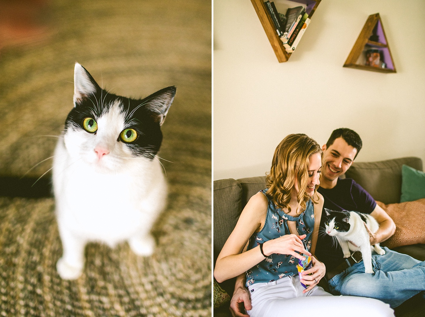 WE NEED MORE ENGAGEMENT SESSIONS WITH CATS. Do you hear me, internet? Cats. More cats. We are not short on adorable doggos, but we are short on cats. That being said, you have to hire us fully prepared that your engagement session is just going to turn into pictures of your cats. Jessica was prepared for that (cat dress, cat blanket, book on how to talk to your cat about guns). RJ did stop us during the session to say something like, “Wait, aren’t these supposed to be pictures of us?” but I’m pretty sure he was joking due to the cat salt & pepper shakers, Jackson Galaxy books, and polaroids of their cats adorning their walls.