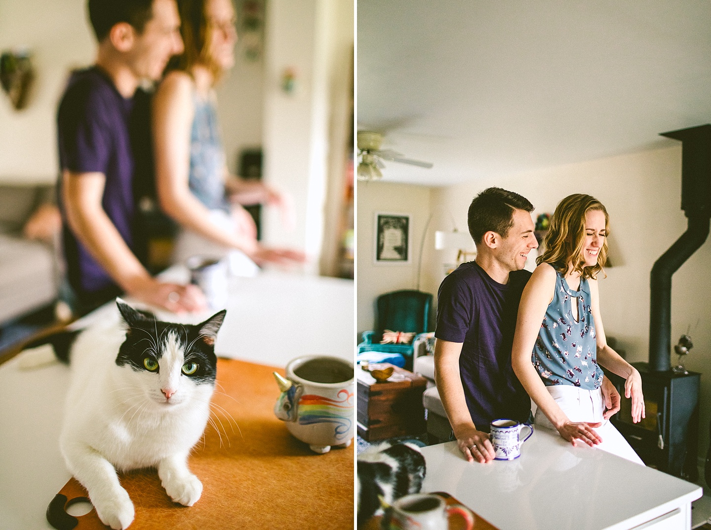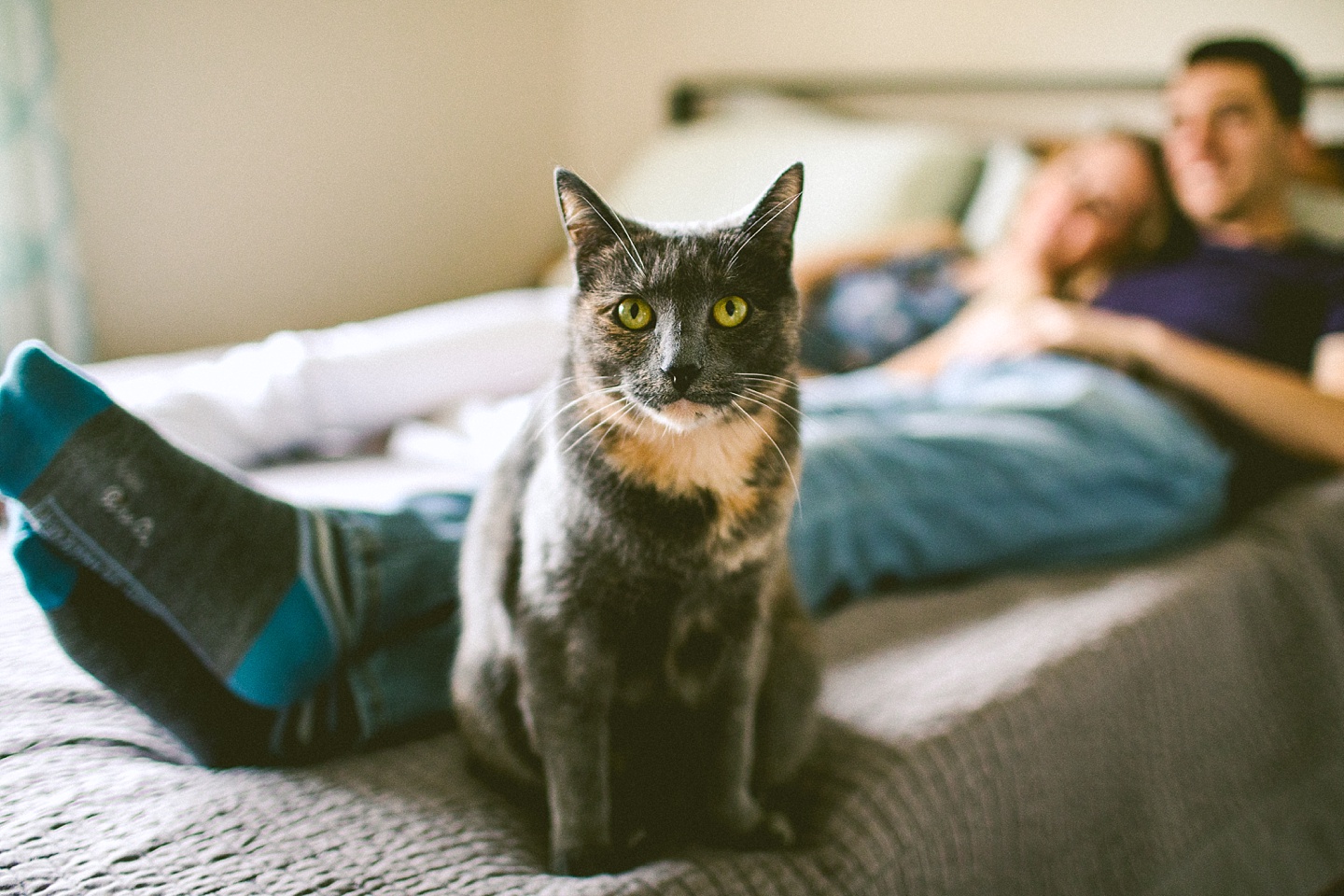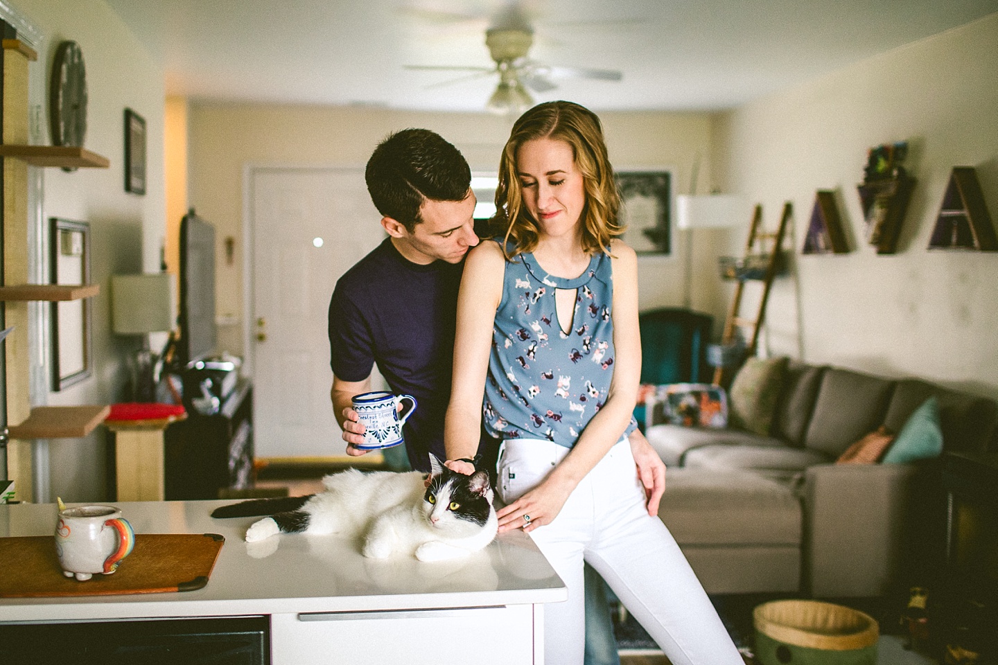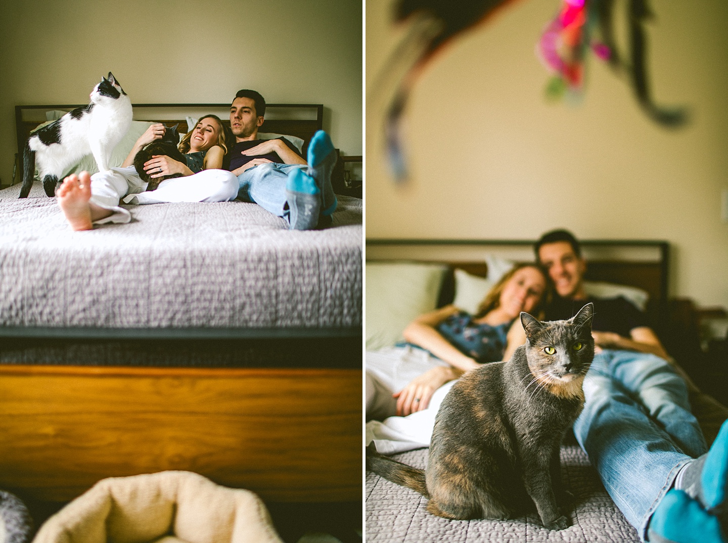 WE NEED MORE ENGAGEMENT SESSIONS WITH CATS. Do you hear me, internet? Cats. More cats. We are not short on adorable doggos, but we are short on cats. That being said, you have to hire us fully prepared that your engagement session is just going to turn into pictures of your cats. Jessica was prepared for that (cat dress, cat blanket, book on how to talk to your cat about guns). RJ did stop us during the session to say something like, “Wait, aren’t these supposed to be pictures of us?” but I’m pretty sure he was joking due to the cat salt & pepper shakers, Jackson Galaxy books, and polaroids of their cats adorning their walls.