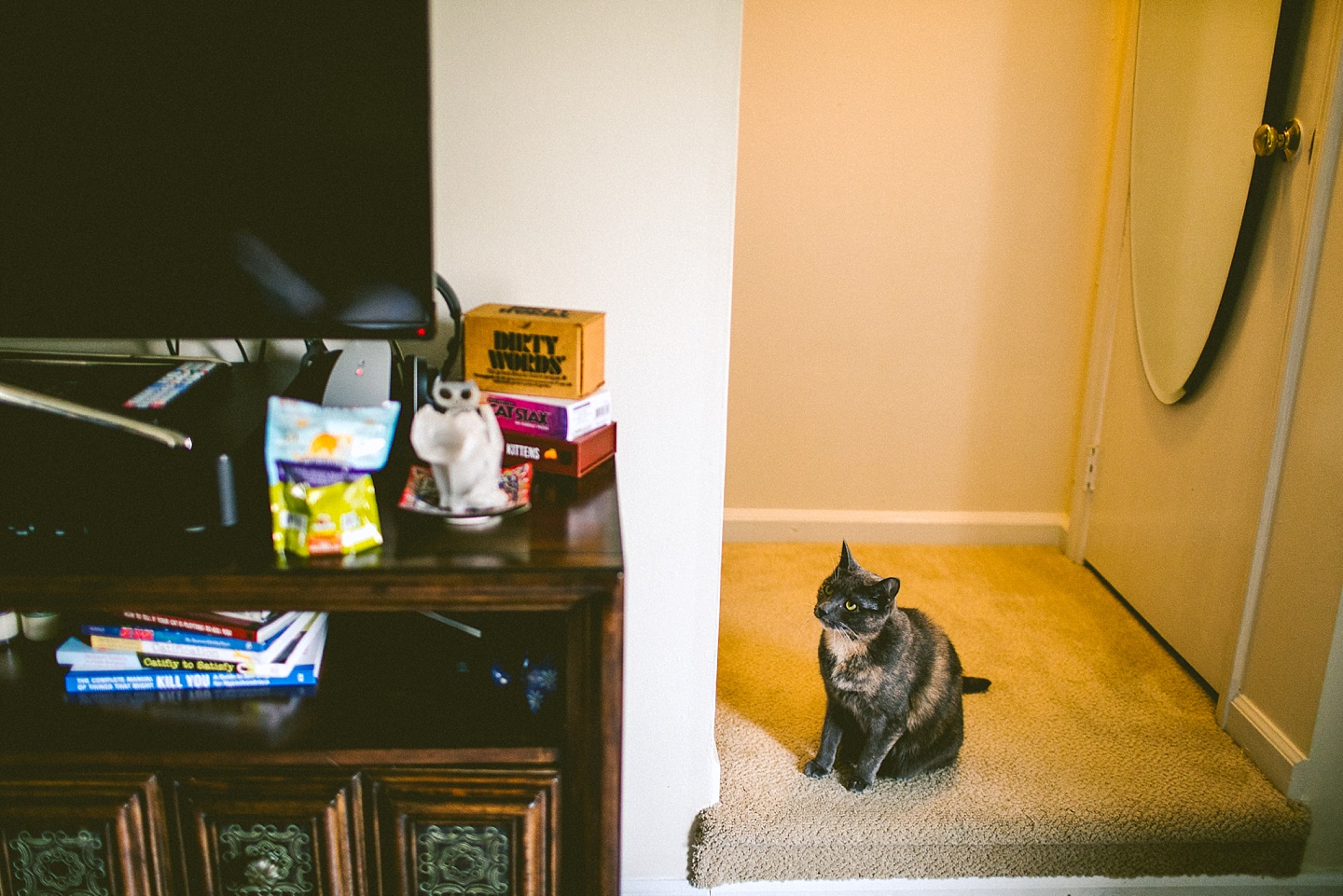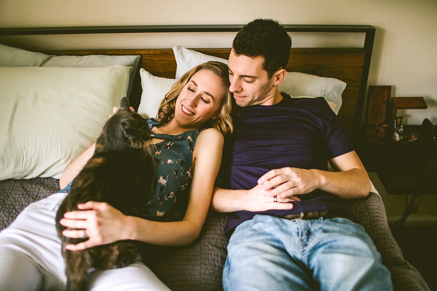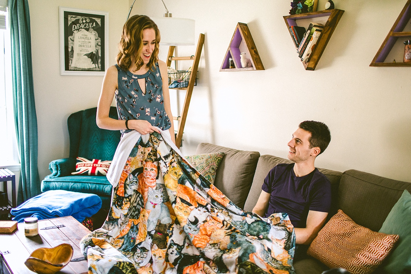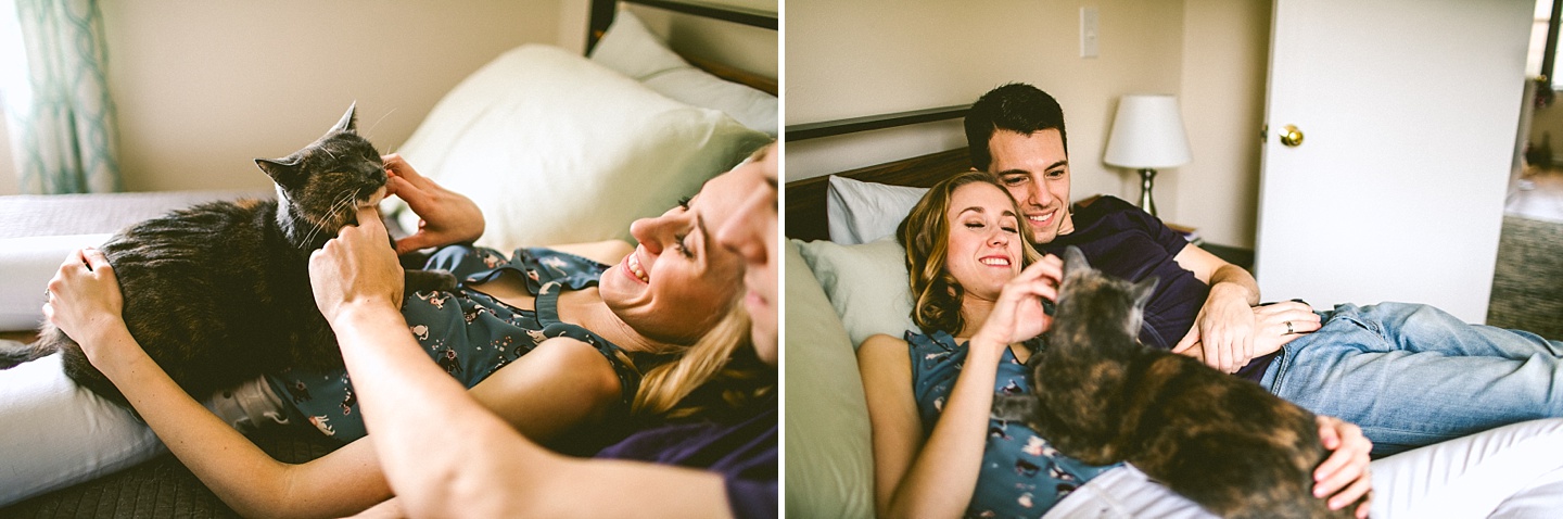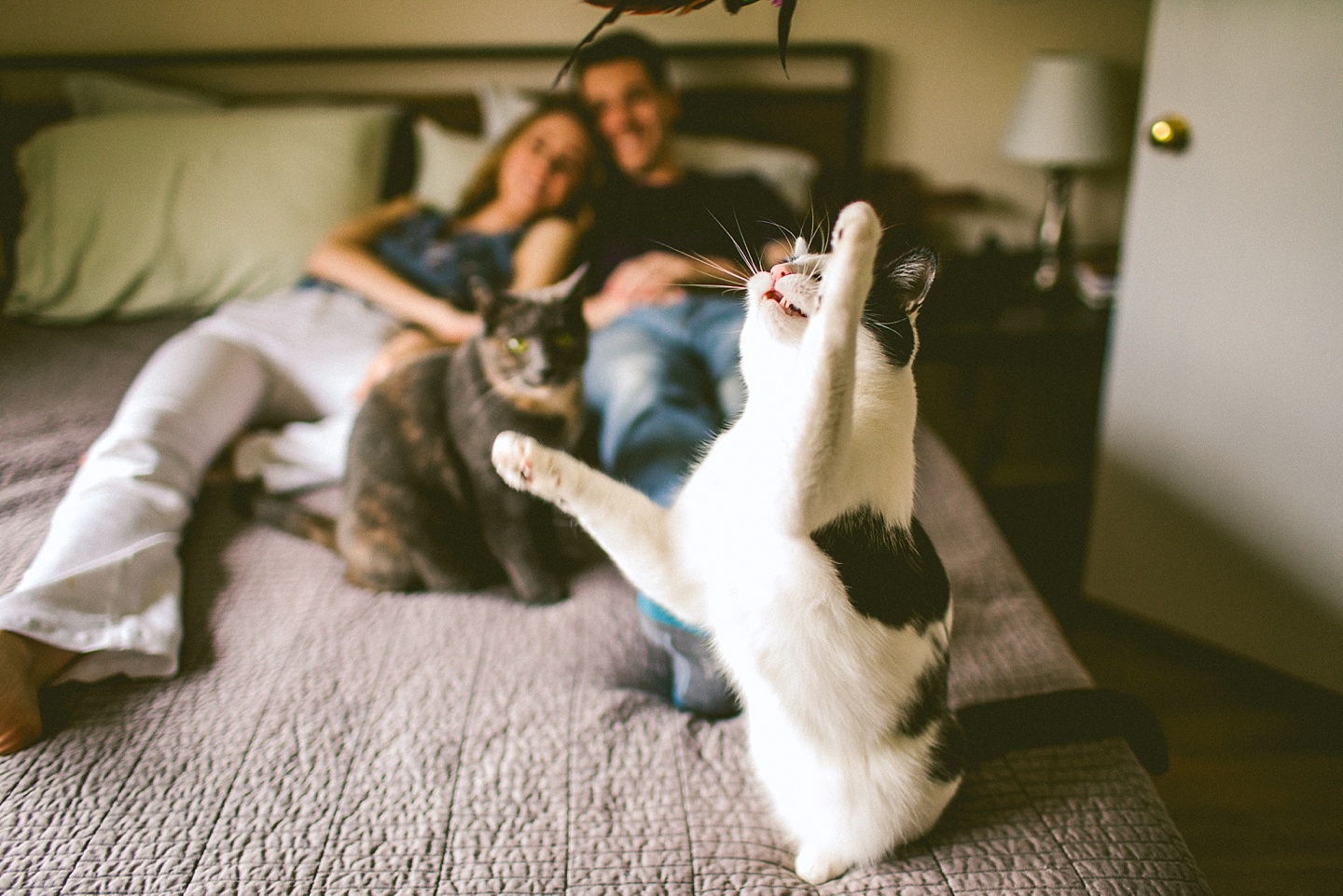 WE NEED MORE ENGAGEMENT SESSIONS WITH CATS. Do you hear me, internet? Cats. More cats. We are not short on adorable doggos, but we are short on cats. That being said, you have to hire us fully prepared that your engagement session is just going to turn into pictures of your cats. Jessica was prepared for that (cat dress, cat blanket, book on how to talk to your cat about guns). RJ did stop us during the session to say something like, “Wait, aren’t these supposed to be pictures of us?” but I’m pretty sure he was joking due to the cat salt & pepper shakers, Jackson Galaxy books, and polaroids of their cats adorning their walls.