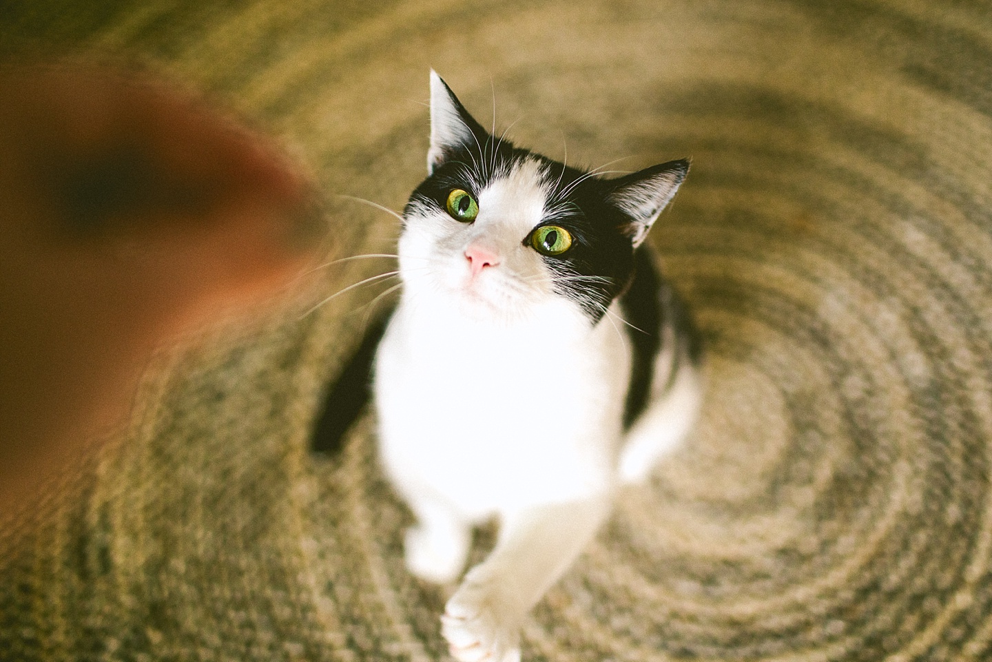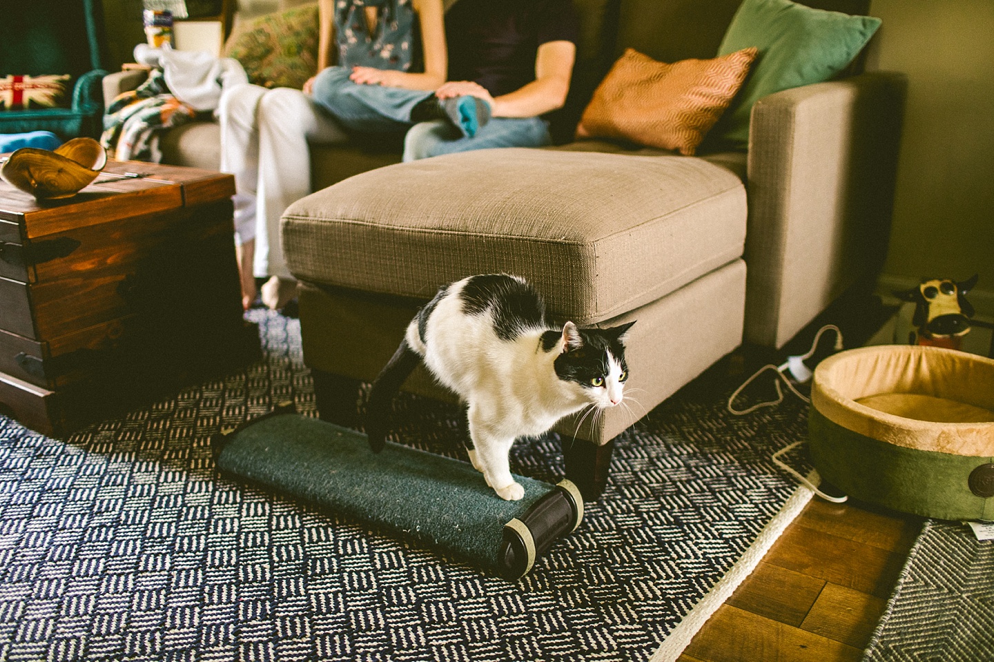 These guys have two cats: Lola, a tortie, who gave us several hisses of love while trying to drag away an entire bag of treats with her teeth up the stairs, and Misha, a black and white tripod cow cat from Russia. Yes, literally from Russia. Jessica and RJ adopted him in the states after he was already a tripod. We have been told he was “in a car accident in Russia” when he lost his leg, which brings up several questions for me. The phrasing wasn’t “hit by a car,” which is what it normally would be, but rather that he was “in a car accident,” which to me implies that he might have been driving. So, my conclusion is that Misha is possibly (probably) a Russian spy. His owners claim he’s not smart enough, but he’s literally the only cat I’ve ever know who can do tricks (sit, shake, turn around). Jessica and RJ claim that this is because RJ works from home and has time to train him, but both Geoff and myself work from home, and our cats are untrained in almost every way. So… before I get all the evidence in, I’ll watch what I say around Misha… just in case. Both cats are adorable.