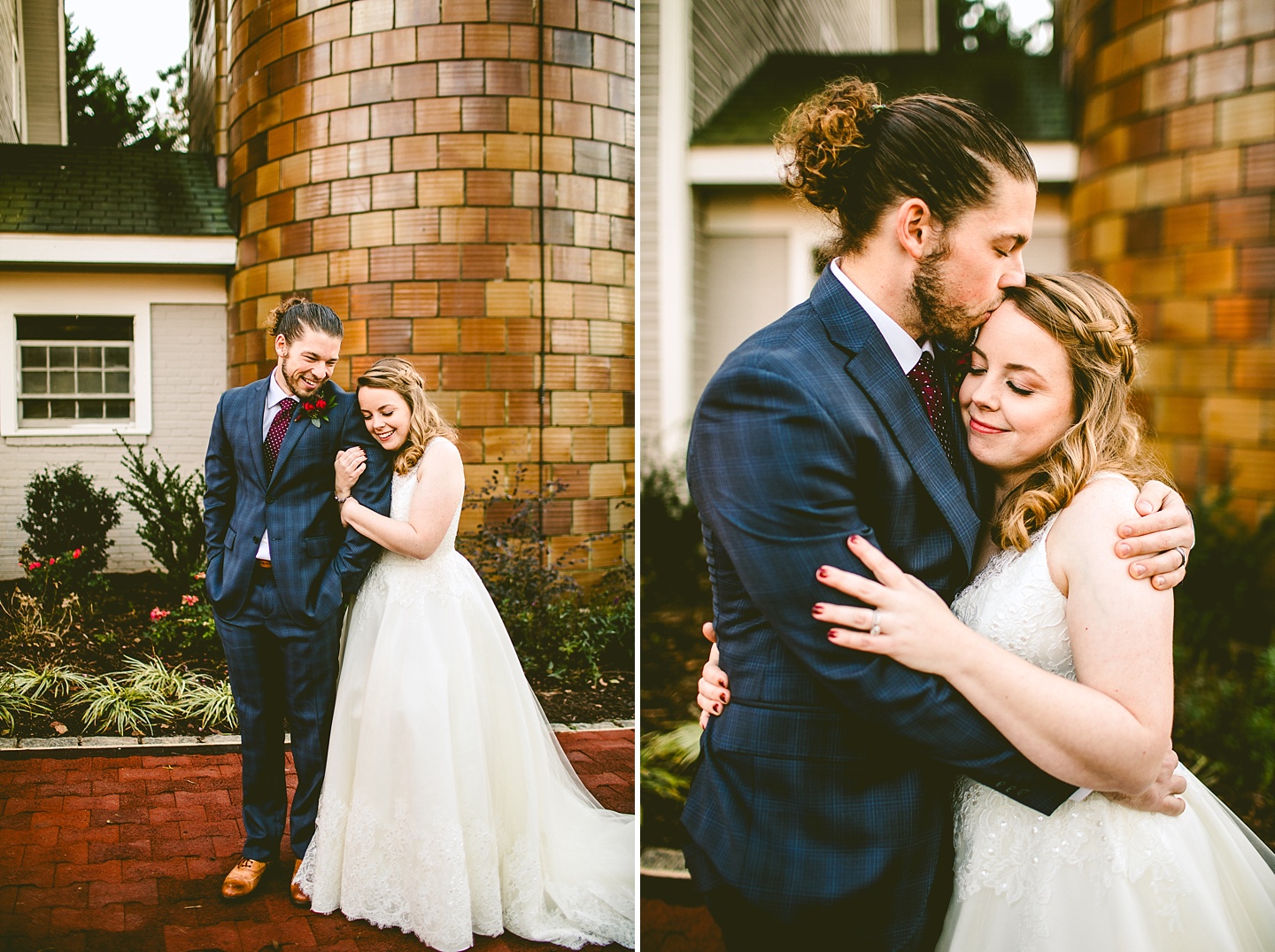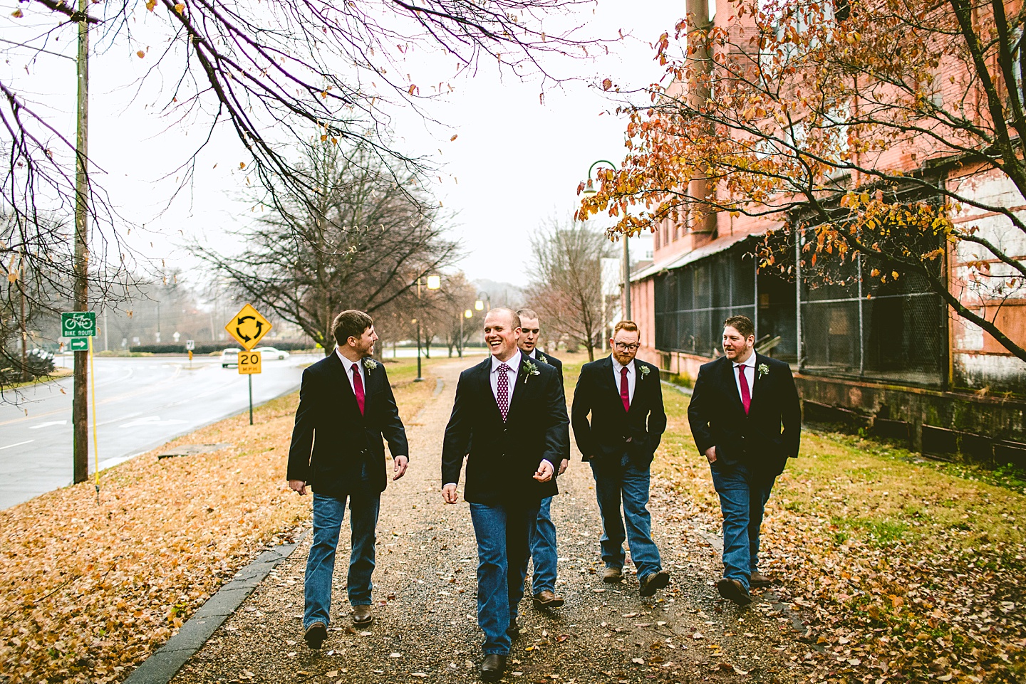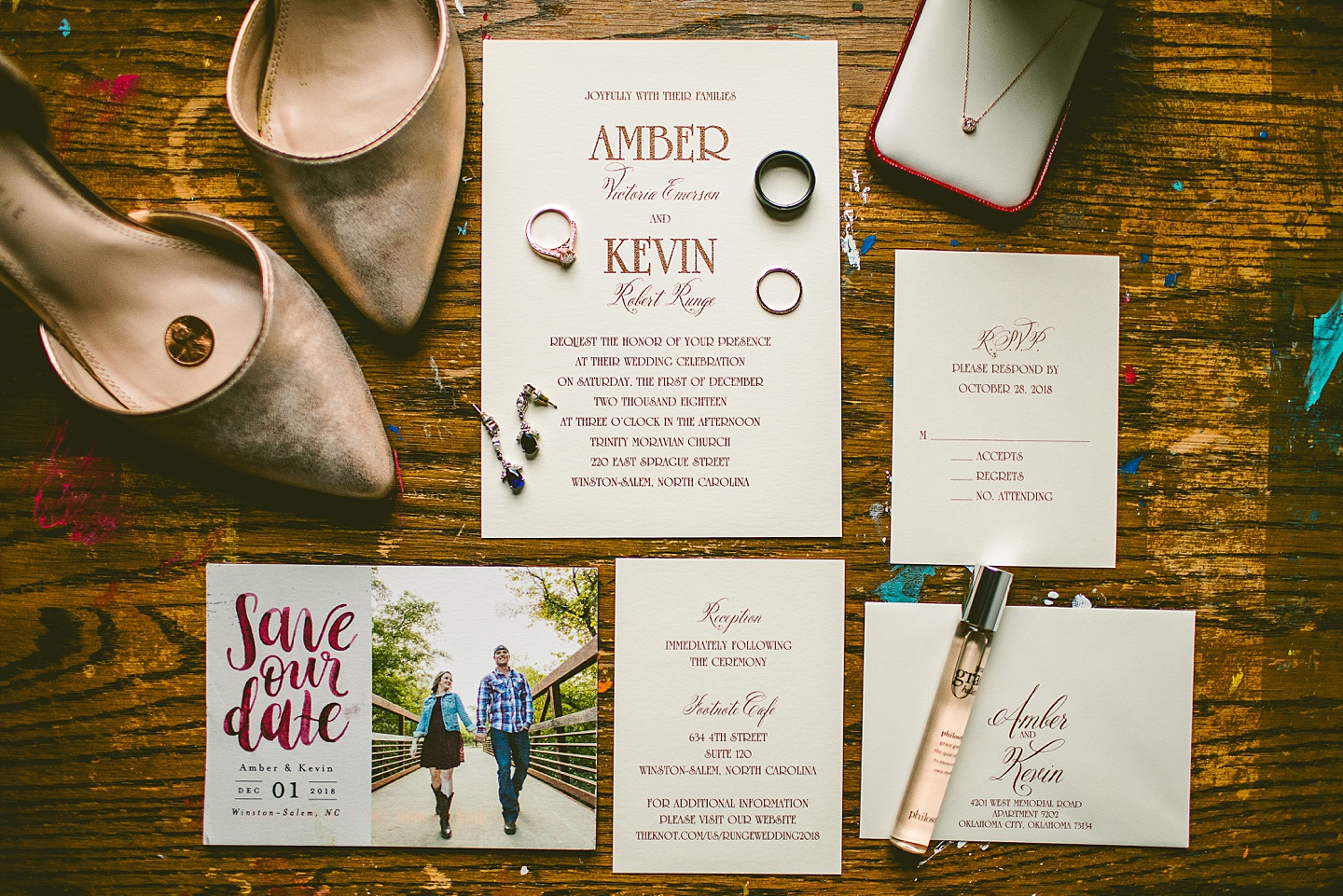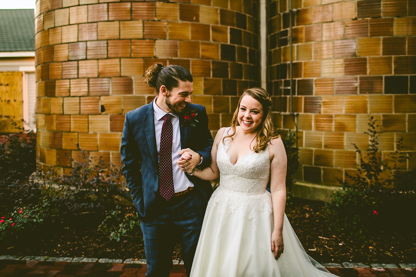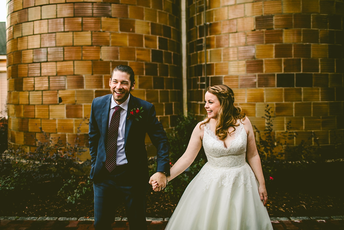 Prior to the pictures, Amber and Kevin were married at the Trinity Moravian Church in a ceremony that included some sweet traditions. A unity candle was lit first, then Amber and Kevin passed that light to their own candles, then to the wedding party members, and out into every wedding guest present. Amber was also wearing a pink ribbon prior to the ceremony, which was changed into a blue ribbon by her mother to signify a married woman in accordance with Moravian traditions. Then we froze outside for a while on a bridge. Then we went to Footnote to celebrate with dancing and cake and some Pearl Jam (yessss). It was a beautiful day for these two stellar people, and we wish them the best of luck in their lives in Oklahoma! So glad we were your photographers!
