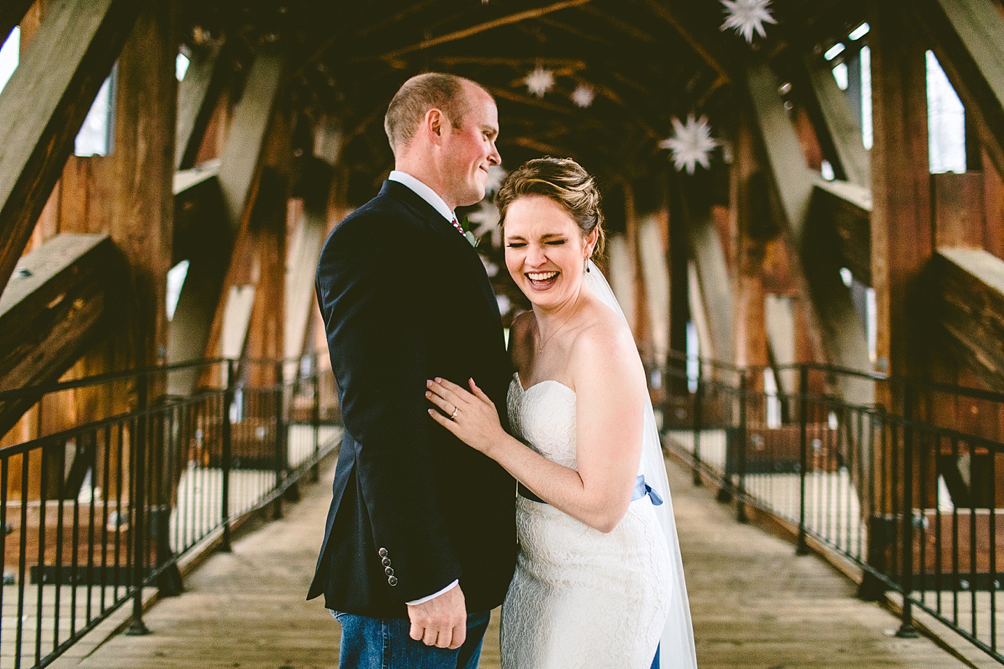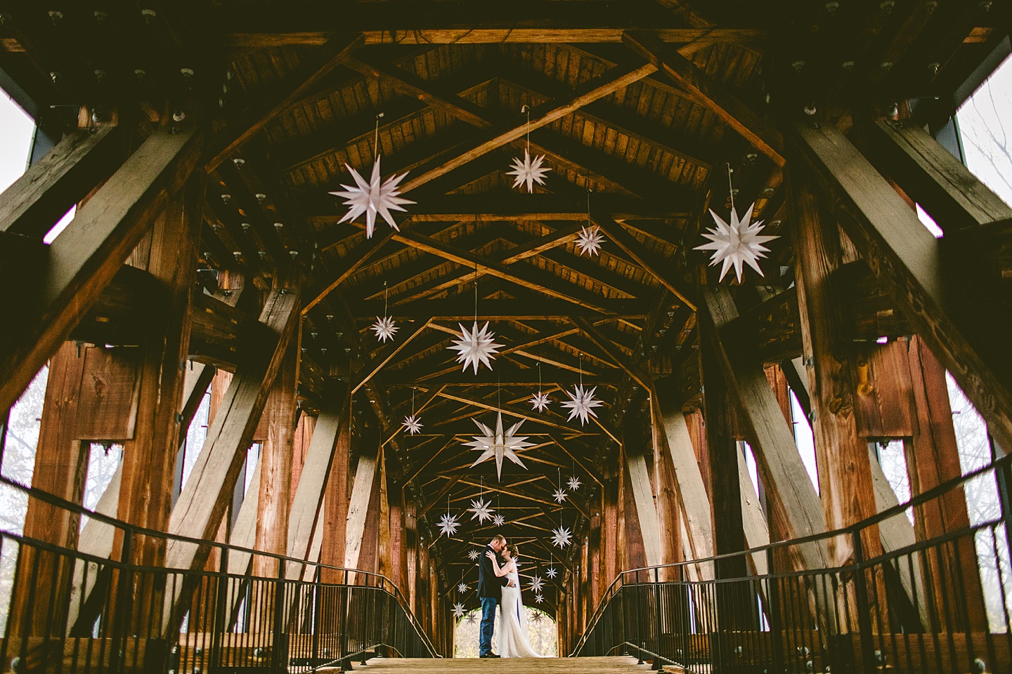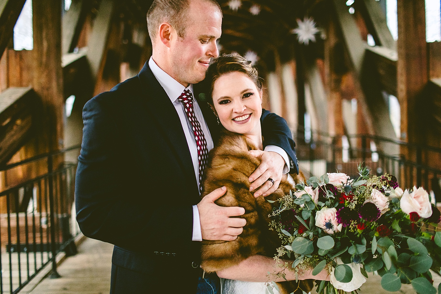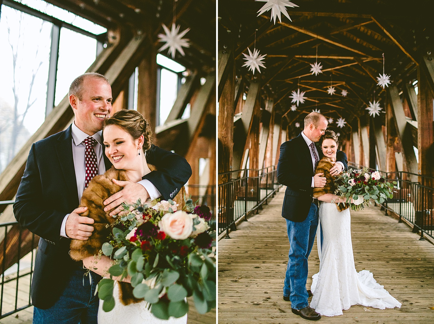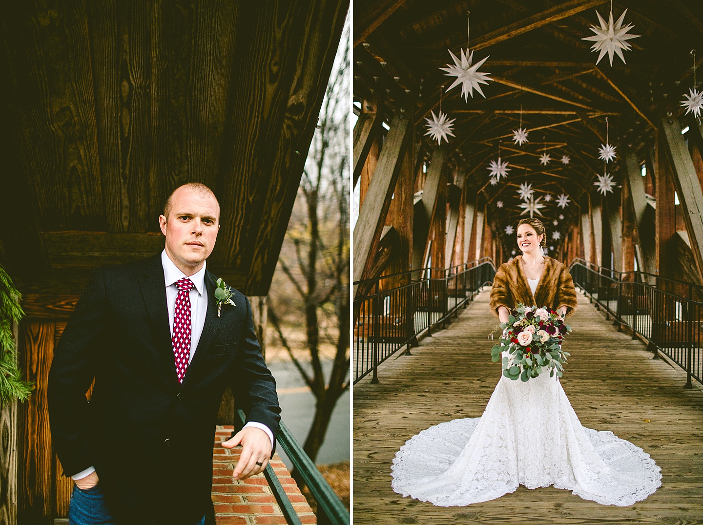 Amber and Kevin have been client gems for many months now and we’ve been so lucky to have them! Not only do they like cats (check) and Star Wars (check) and The Walking Dead (check) and Game of Thrones (check) but they are also going to Costa Rica for their honeymoon which is where we went (check) AND are rad enough people to not let a decent amount of really cold rain and weather get them down for their wedding. We were planning on doing their portraits around Old Salem (which is so cute from what I saw on the trolley) but due to pretty significant rainfall and super cold conditions we headed straight for the WONDERFULLY ADORABLE covered bridge instead and took over. Not a bad rain plan for pictures at all. Amber and Kevin remained positive and adorable themselves and had a great time, so rain didn’t spoil this parade. And I am loving all these winter stoles! Not only do they look cute but I do get them to wear them occasionally for half the time shooting so they also keep me warm as well (that’s the only reason why I have brides sometimes remove them).