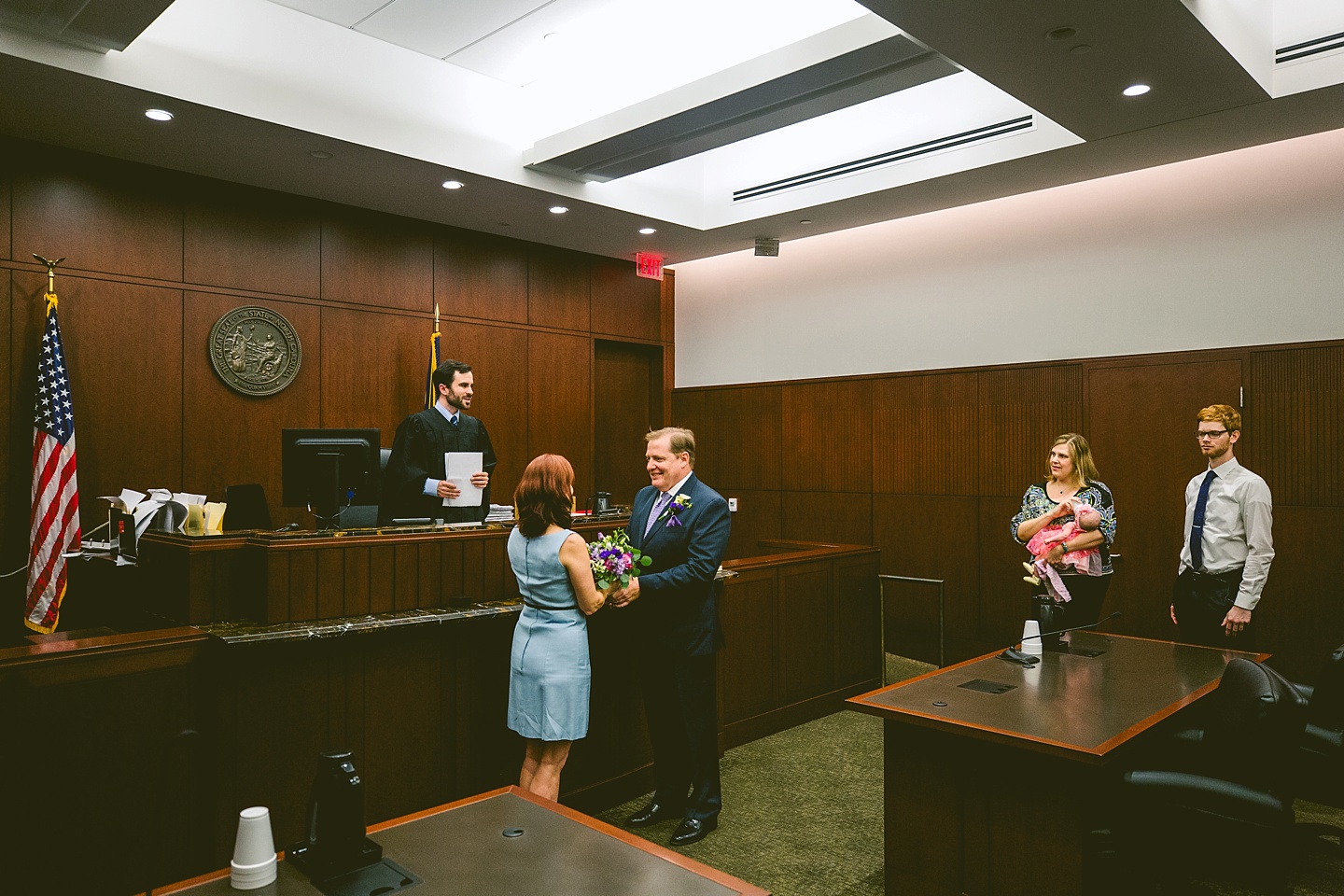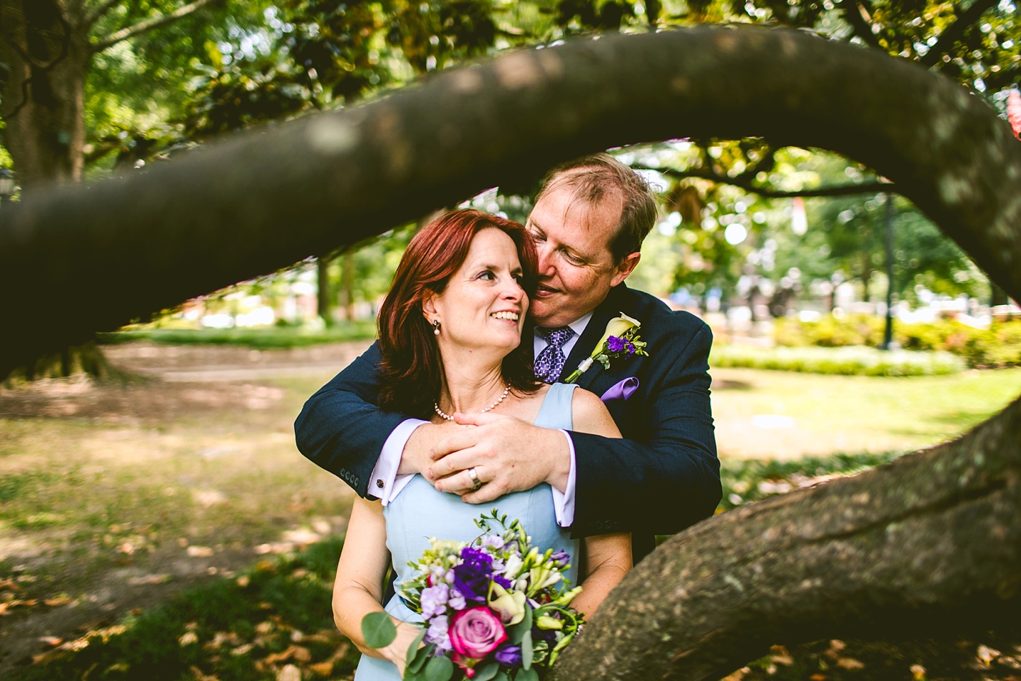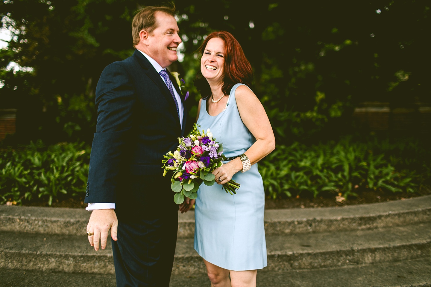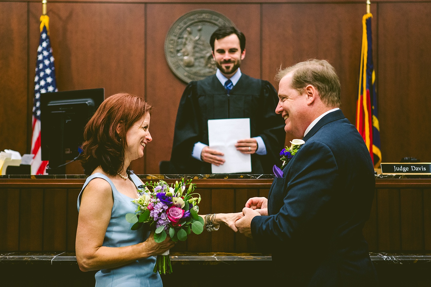 MaryAnne and Bob met 30 years ago in the Naval Academy and finally tied the knot on Tuesday, July 25th at the courthouse in Raleigh, NC after reuniting via the joys of Facebook three years ago. They were joined by us, MaryAnne’s son Thomas, their friend Jen, and Jen’s baby daughter Barrett as they happily wed downtown. And when I say happily, I mean happily. MaryAnne and Bob are meant for each other, and giddy and adorable in one another’s presence. MaryAnne tells us that Bob even eats beets now because of her. That’s dedication. He proposed on Pike’s Peak in the snow and also requested a Bird of Paradise boutonniere for the wedding so I’d say he’s a keeper.