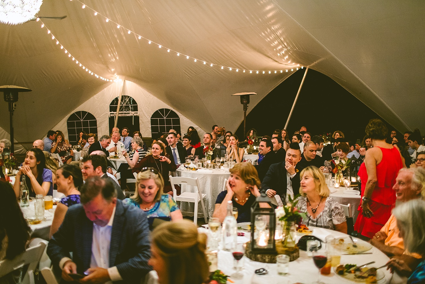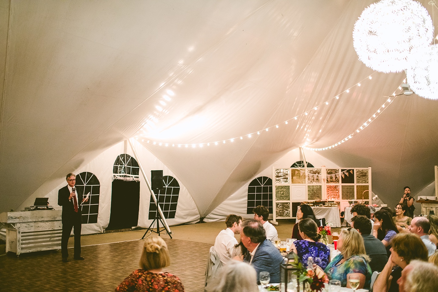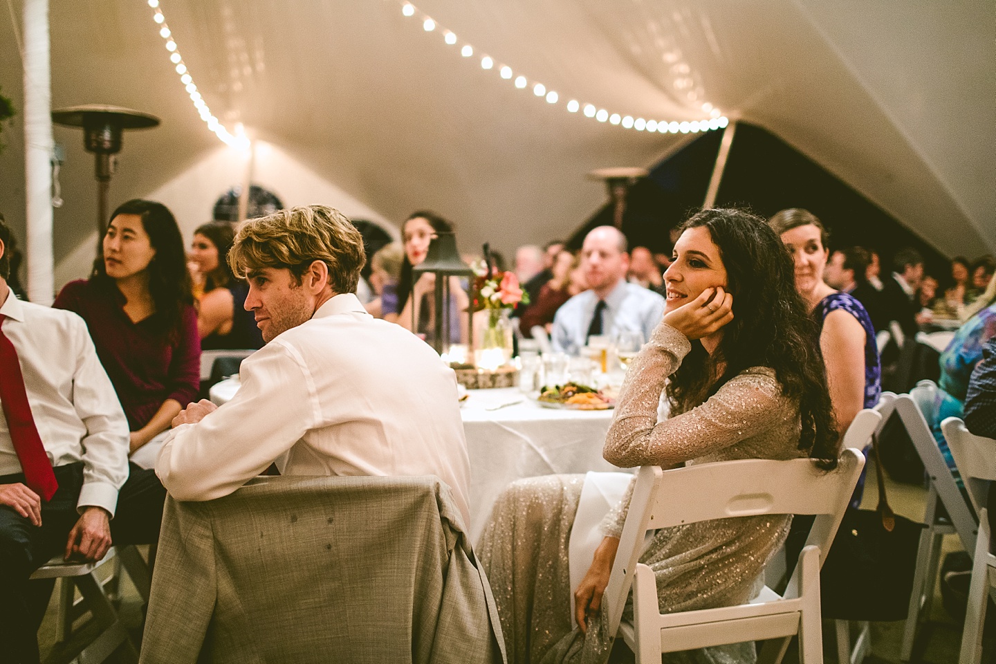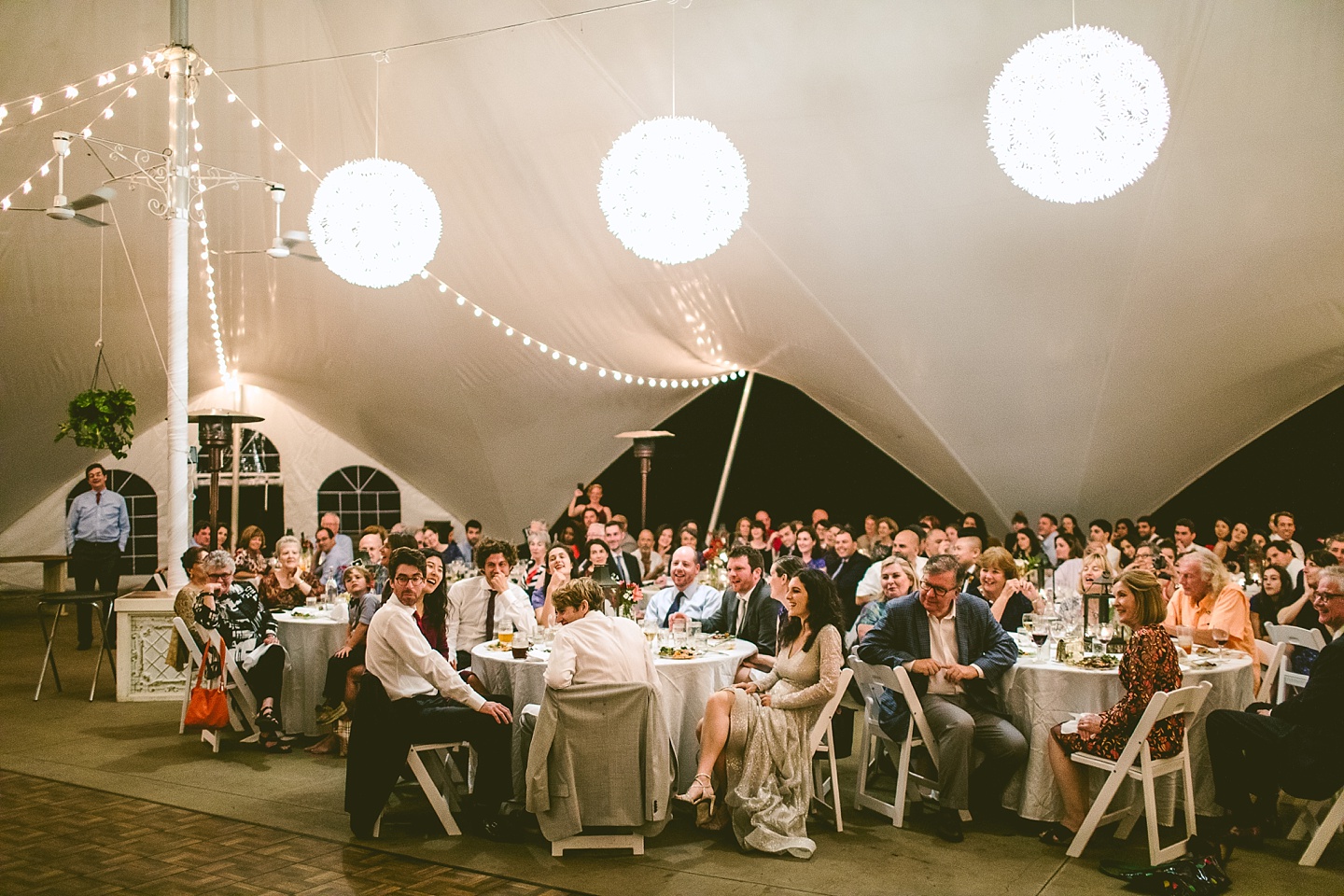 After the beautiful ceremony presided over by their college pastor, Sarah and Jimmy and crew headed to the Crest Pavilion on top of another really steep hill. It is so pretty up there… and, while we avoided the rain, it was thundering during our newlywed pictures and we could see the rain in the distance. It was pretty awesome. Their decorations for the rehearsal was so cute and beautifully handmade. Their tablecards had quotes about relationships on one side, and the goals for their first year of marriage written on the other. It was really interesting to read them and such a great idea to create newlywed goals like that!
