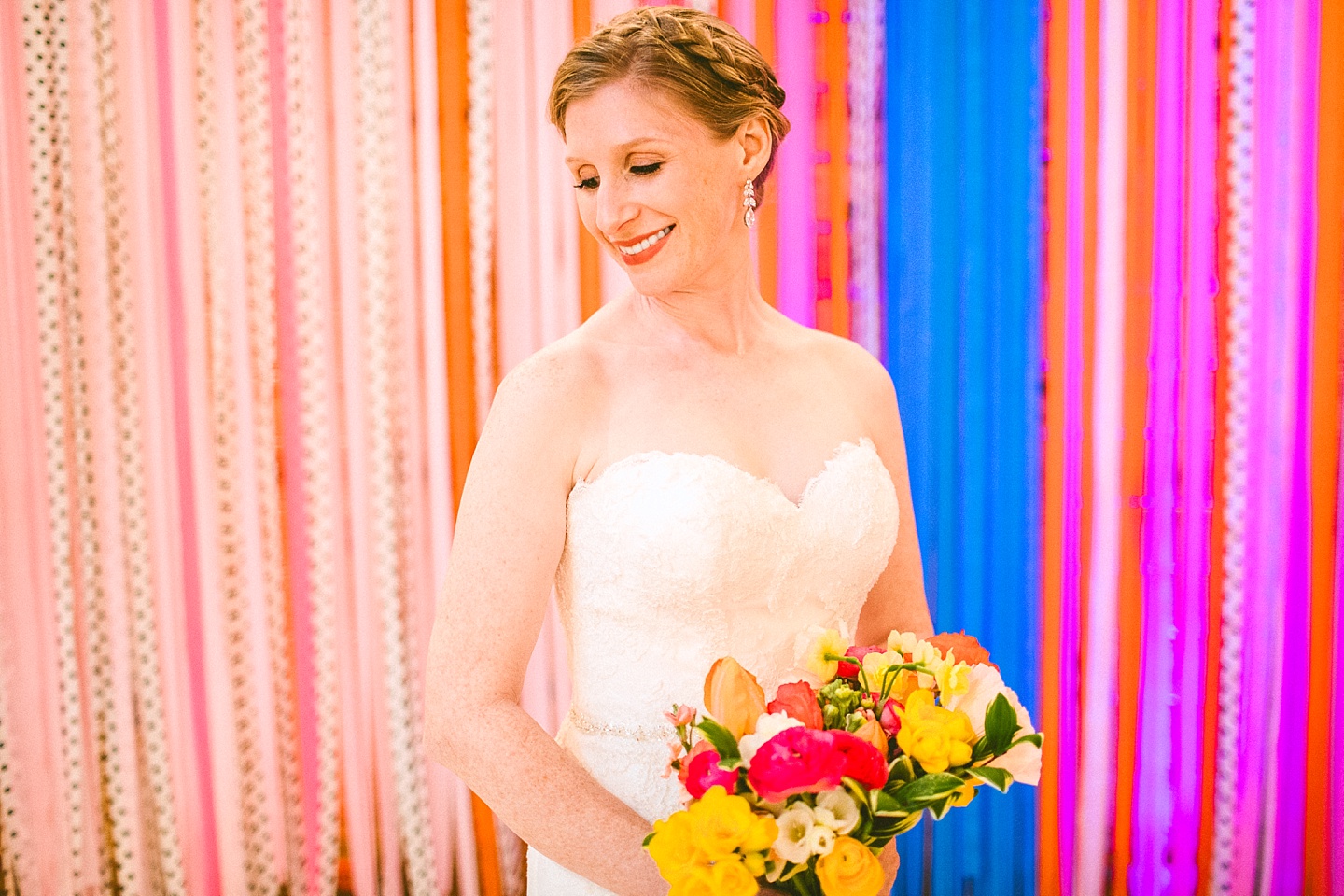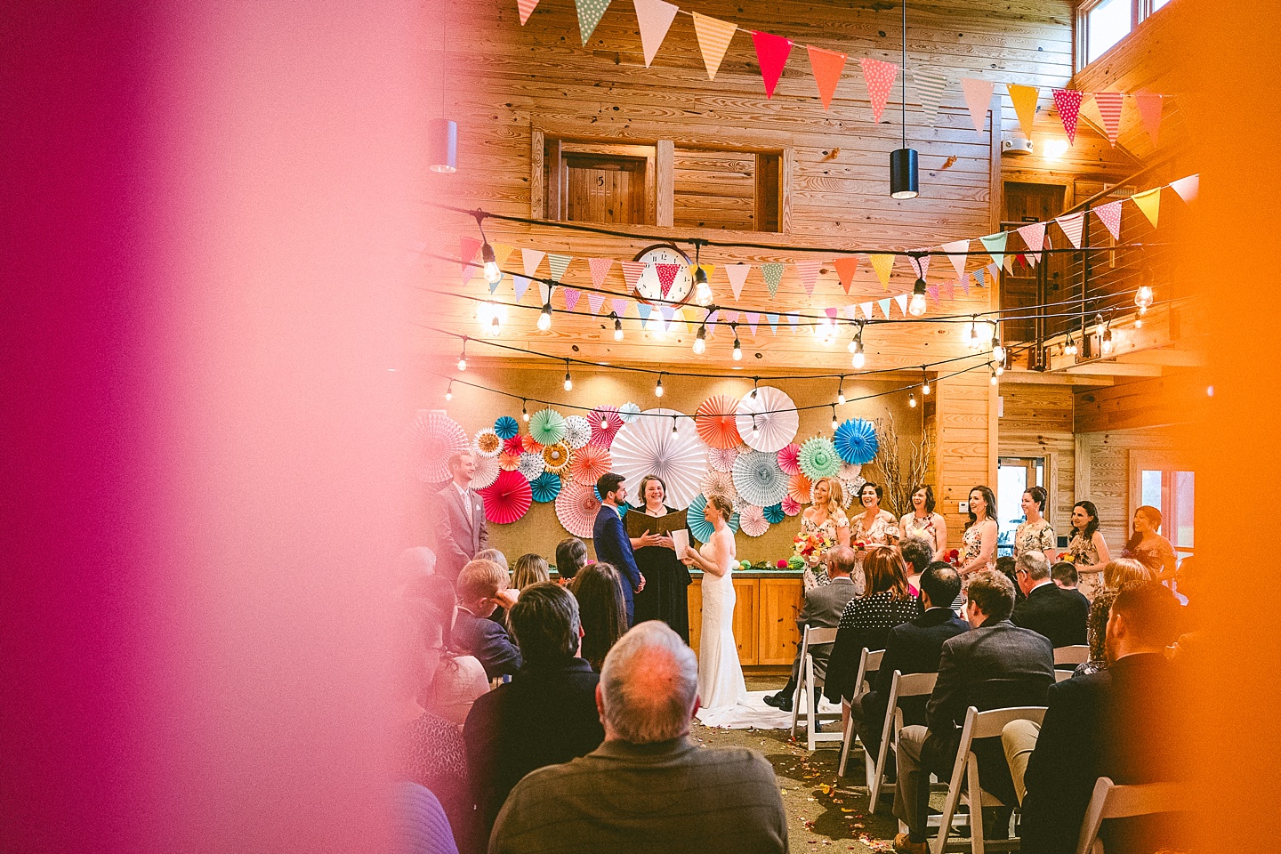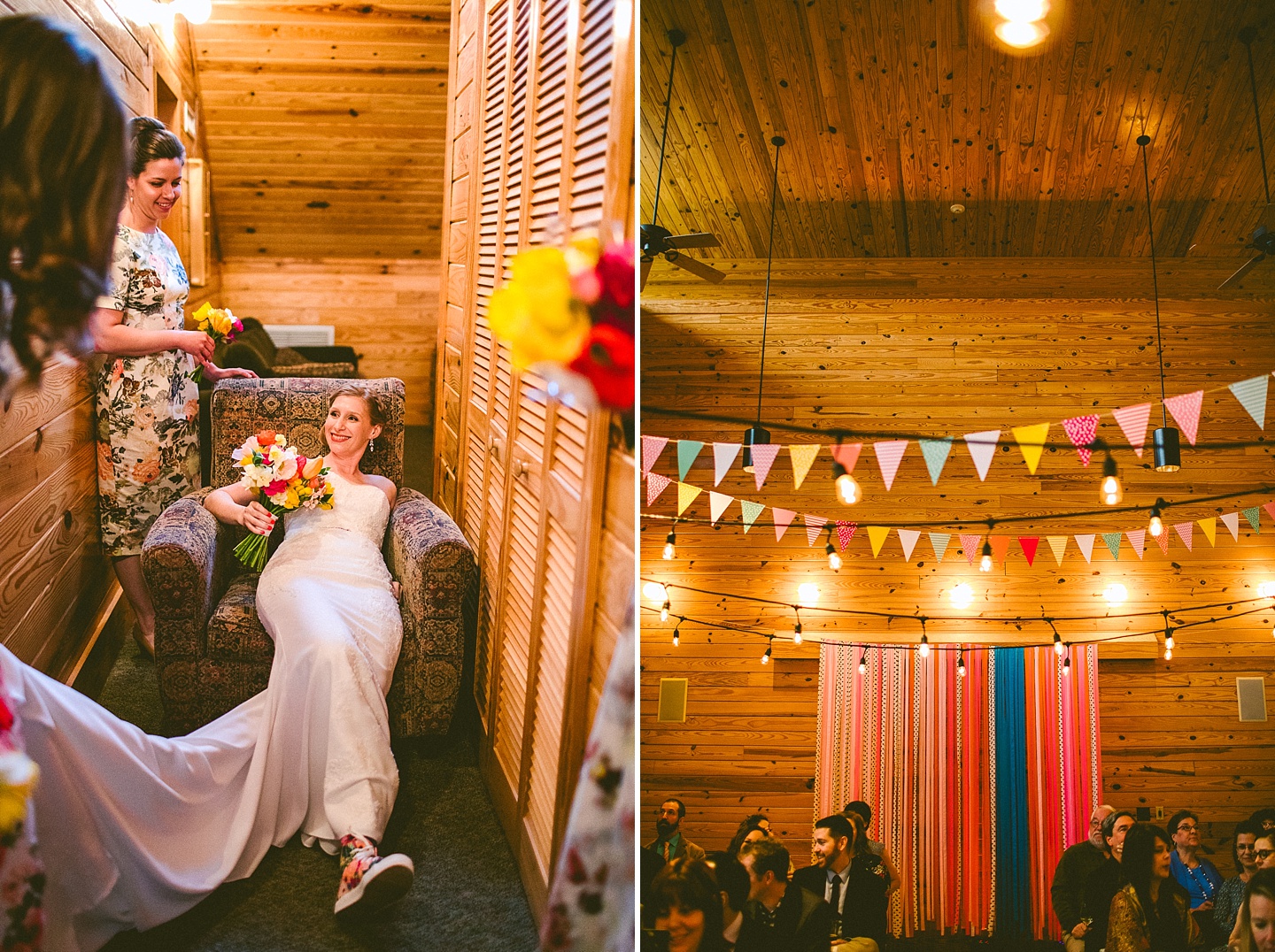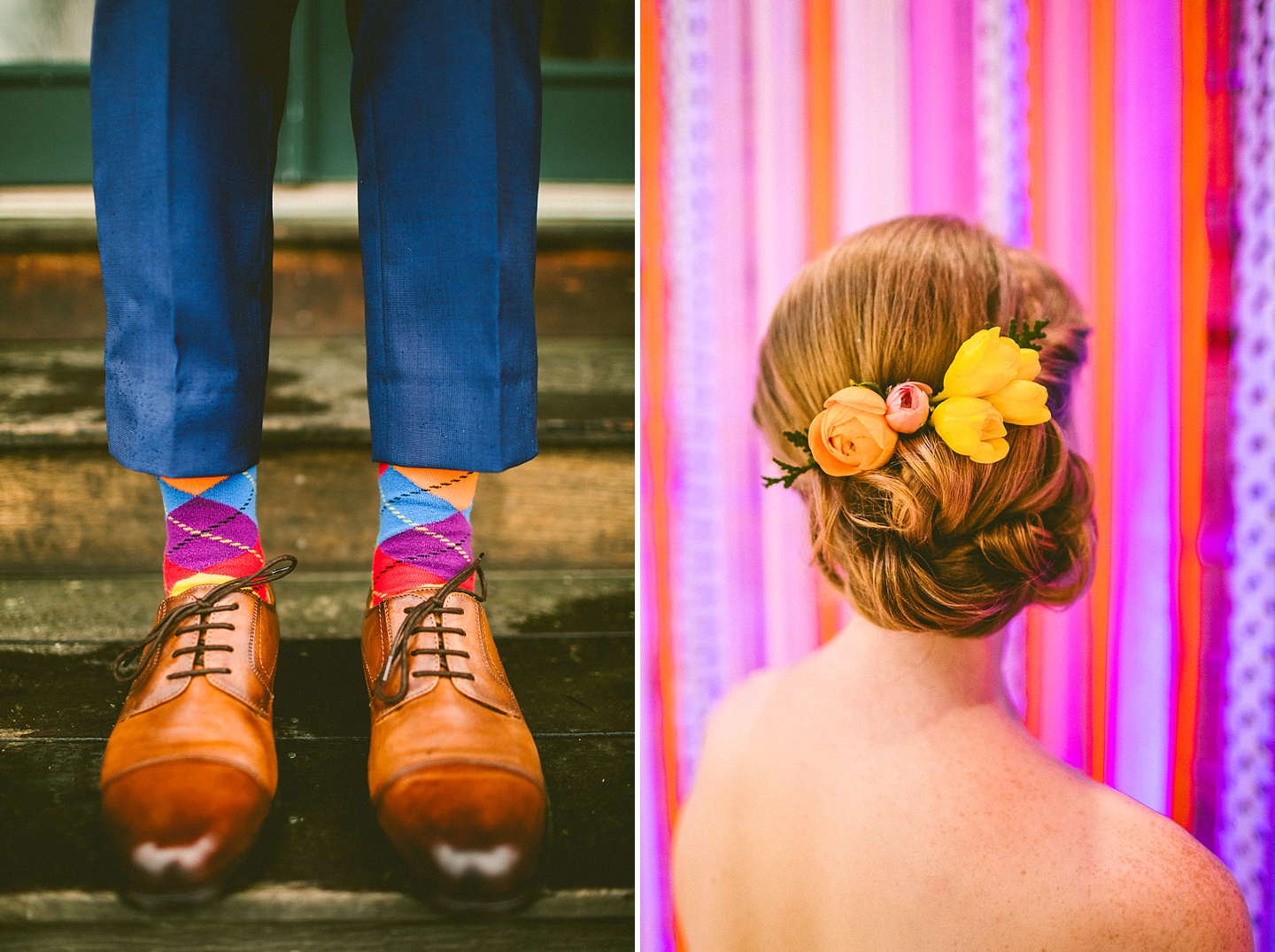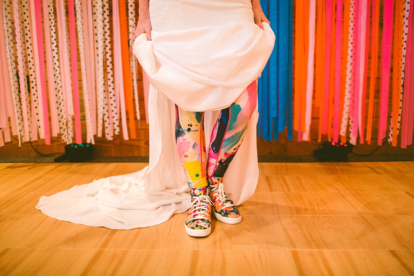 Caity and Kevin had the best weather ever for their December engagement session so I guess it only figures that it would come back and bite us later. Their wedding day was collllld and produced a constant rain that went kinda sideways under umbrellas so we didn’t go out in it much. Also, we were all freezing. But, because it was so cold, Caity decided to wear her badass colored leggings under her wedding dress on a whim which was highly encouraged by myself and all her bridesmaids because YES. She also occasionally busted out a pink leather jacket which was also praised and adored. And, because Caity and Kevin are very clever and thought ahead about things, the Rigmor House was decorated beautifully inside and allowed for plenty of colorful photo ops. Despite the dreariness outside, we were happy and colorful and warm INSIDE OUR HEARTS (and inside the Rigmor House). So much color, all the color, flag bunting forever and ever amen.