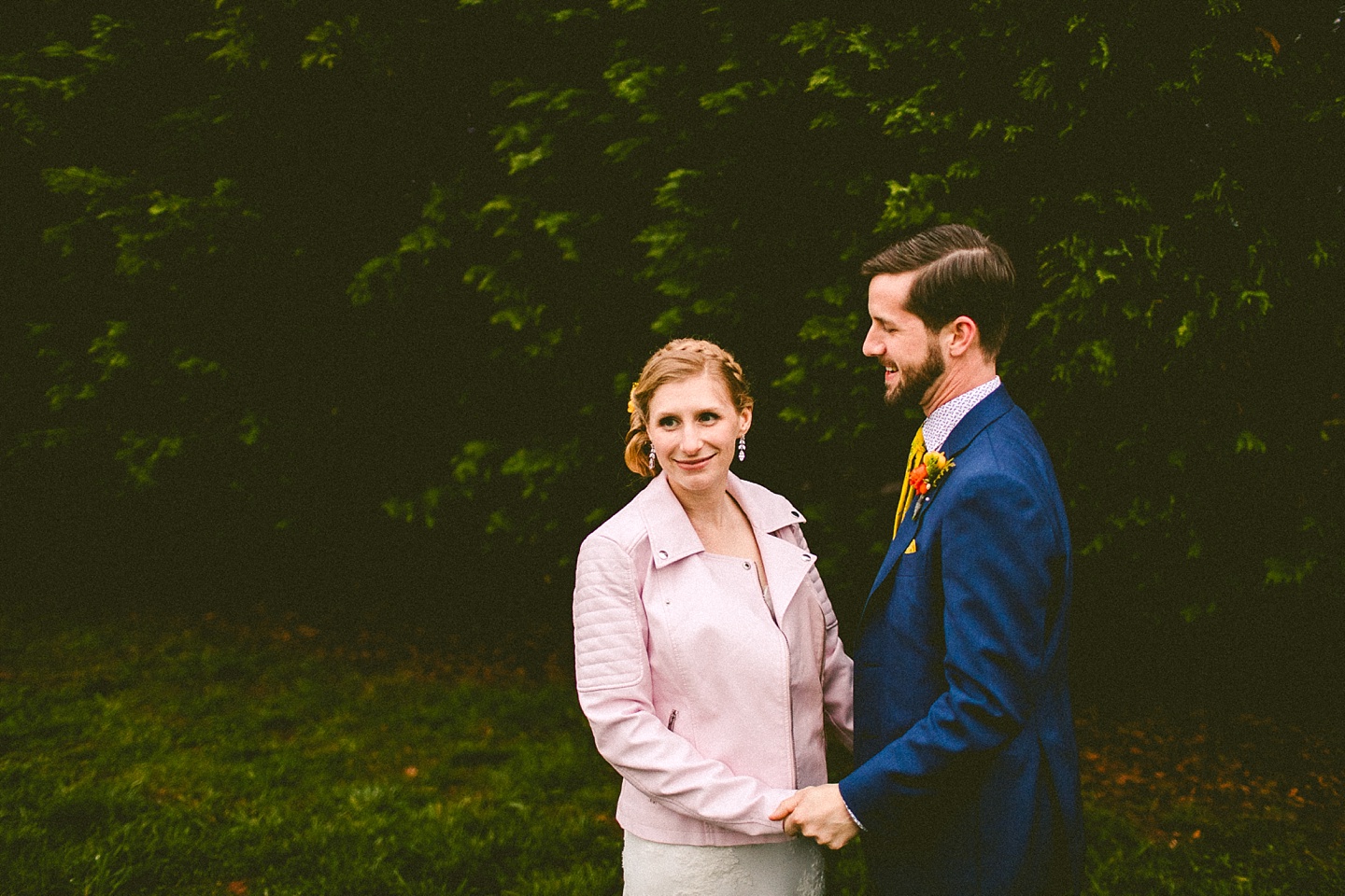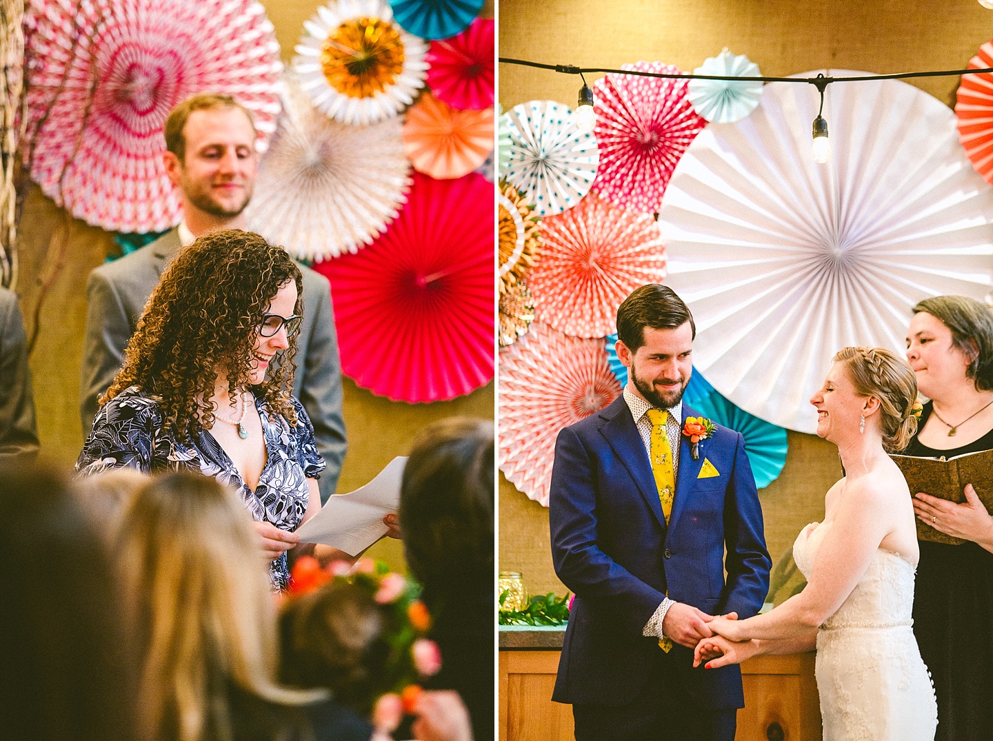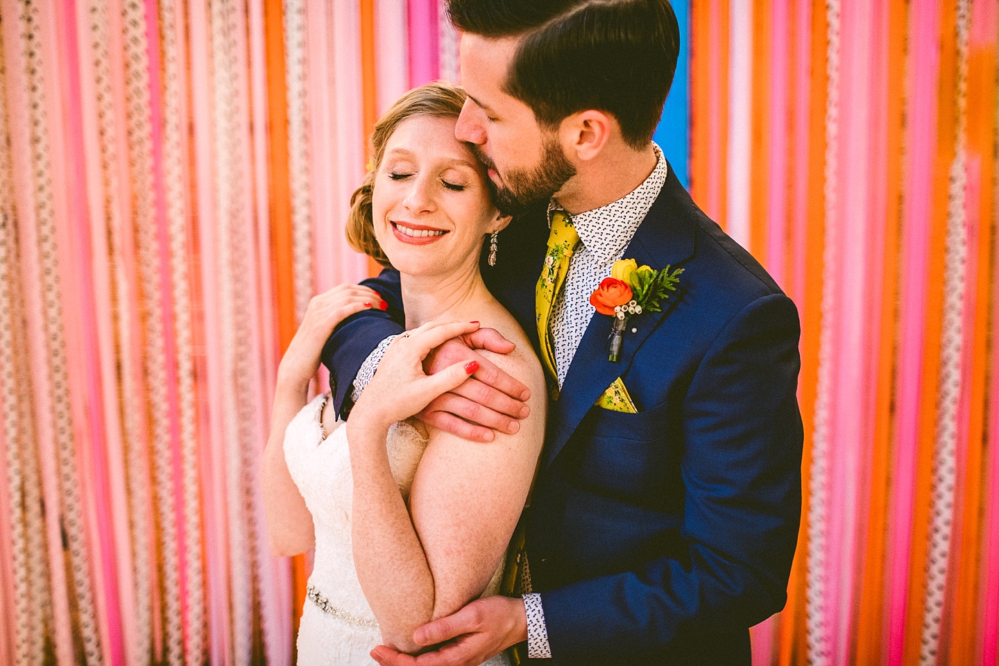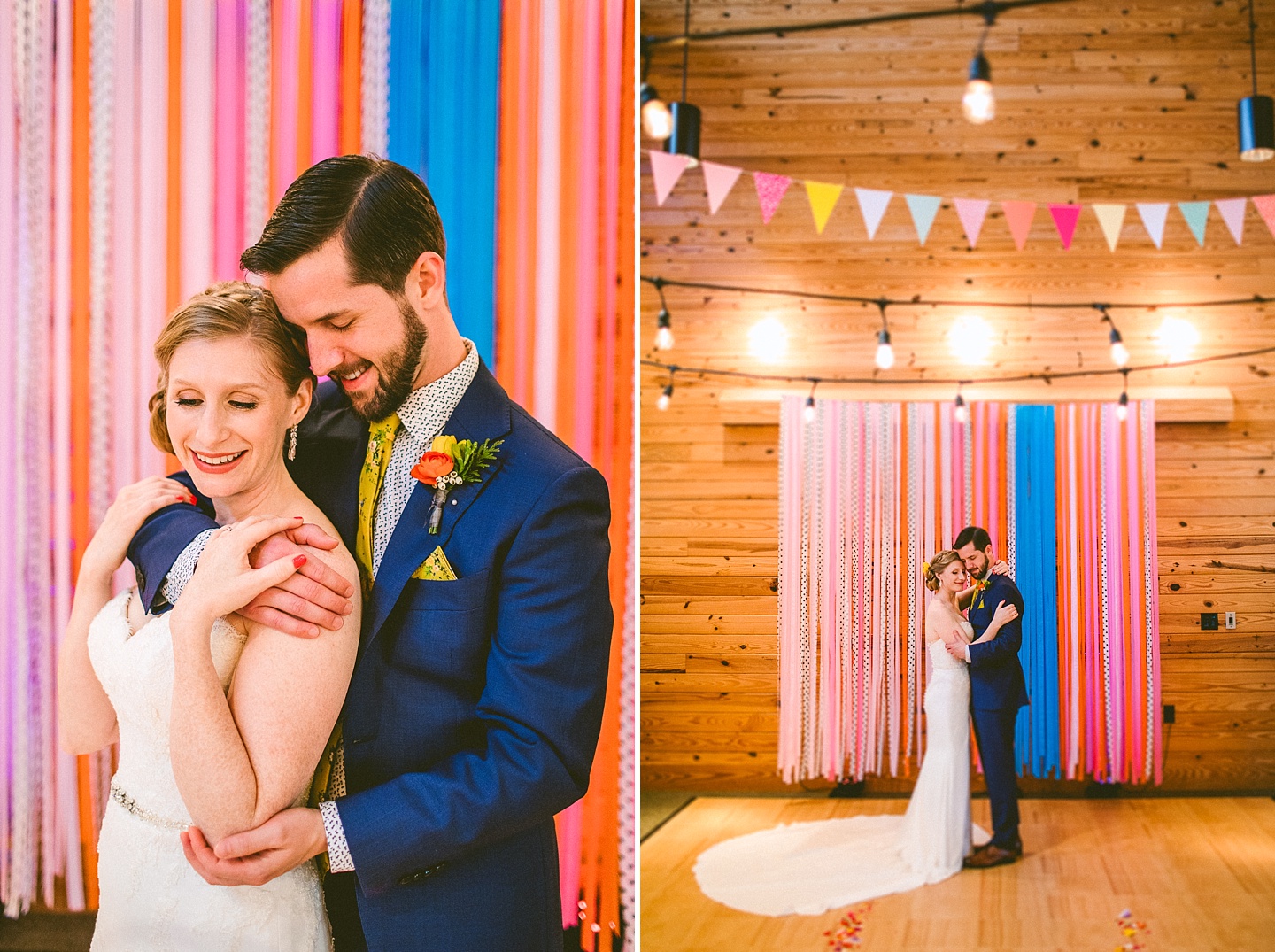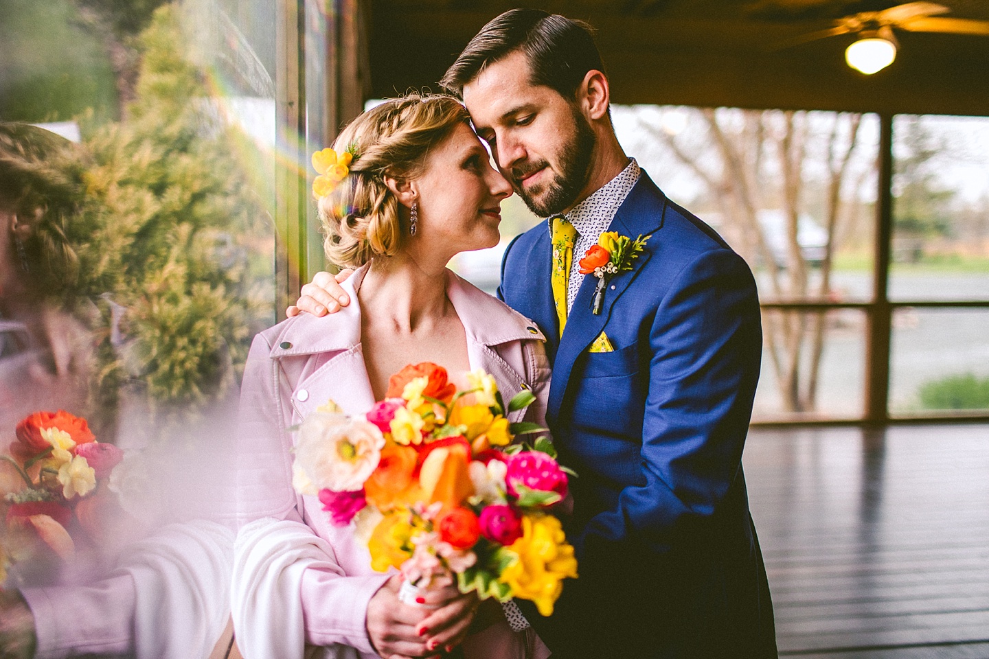 Caity and Kevin had the best weather ever for their December engagement session so I guess it only figures that it would come back and bite us later. Their wedding day was collllld and produced a constant rain that went kinda sideways under umbrellas so we didn’t go out in it much. Also, we were all freezing. But, because it was so cold, Caity decided to wear her badass colored leggings under her wedding dress on a whim which was highly encouraged by myself and all her bridesmaids because YES. She also occasionally busted out a pink leather jacket which was also praised and adored. And, because Caity and Kevin are very clever and thought ahead about things, the Rigmor House was decorated beautifully inside and allowed for plenty of colorful photo ops. Despite the dreariness outside, we were happy and colorful and warm INSIDE OUR HEARTS (and inside the Rigmor House). So much color, all the color, flag bunting forever and ever amen.
