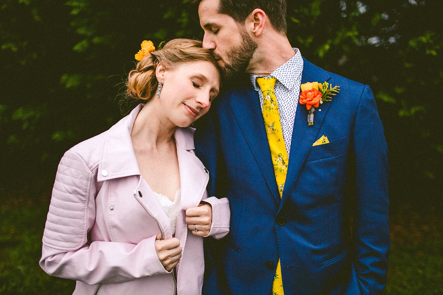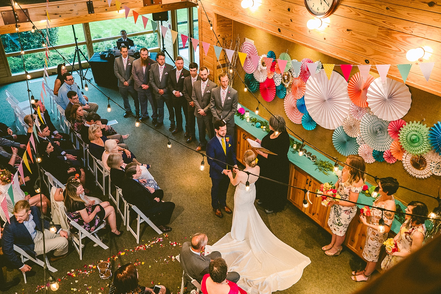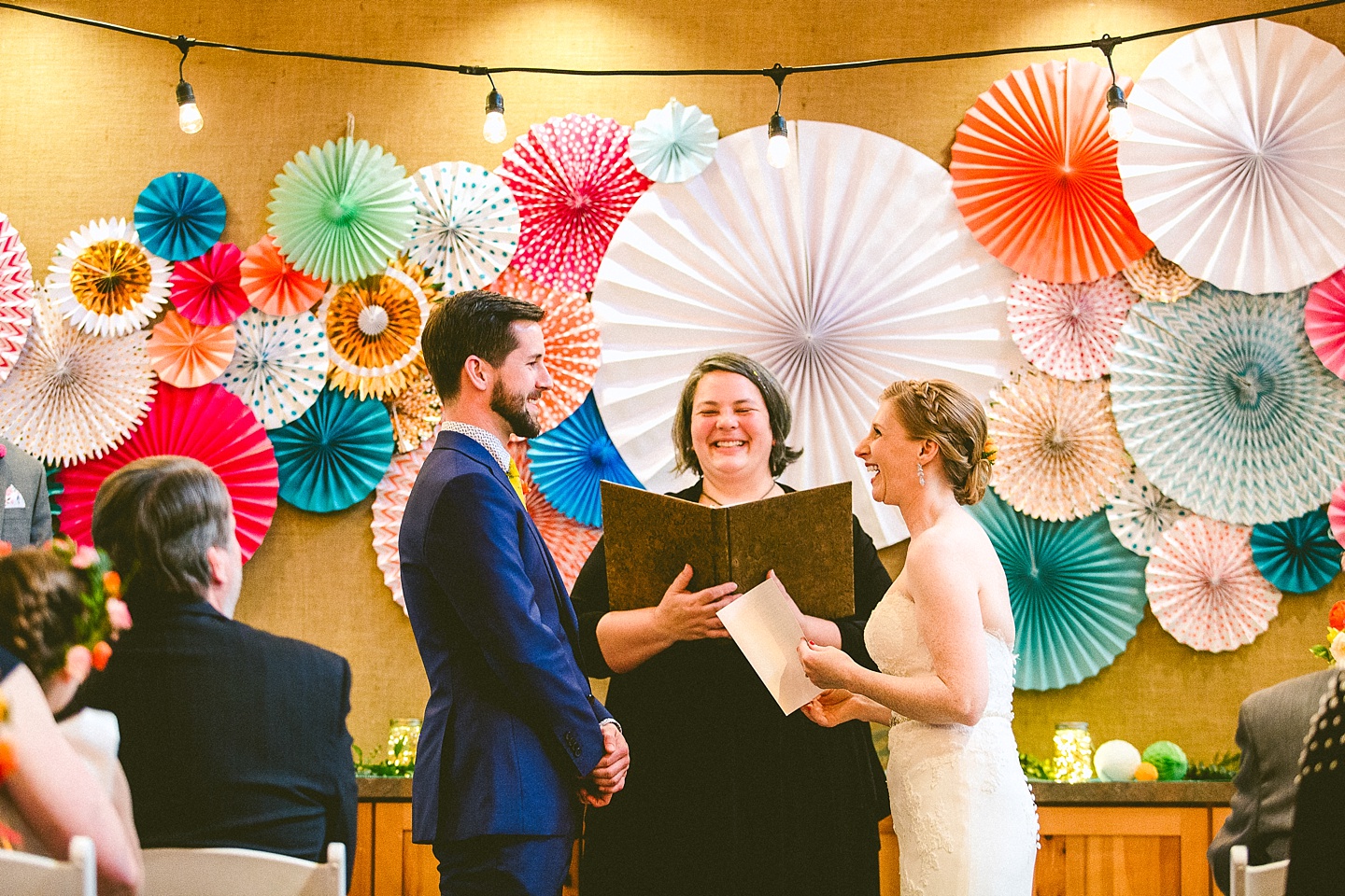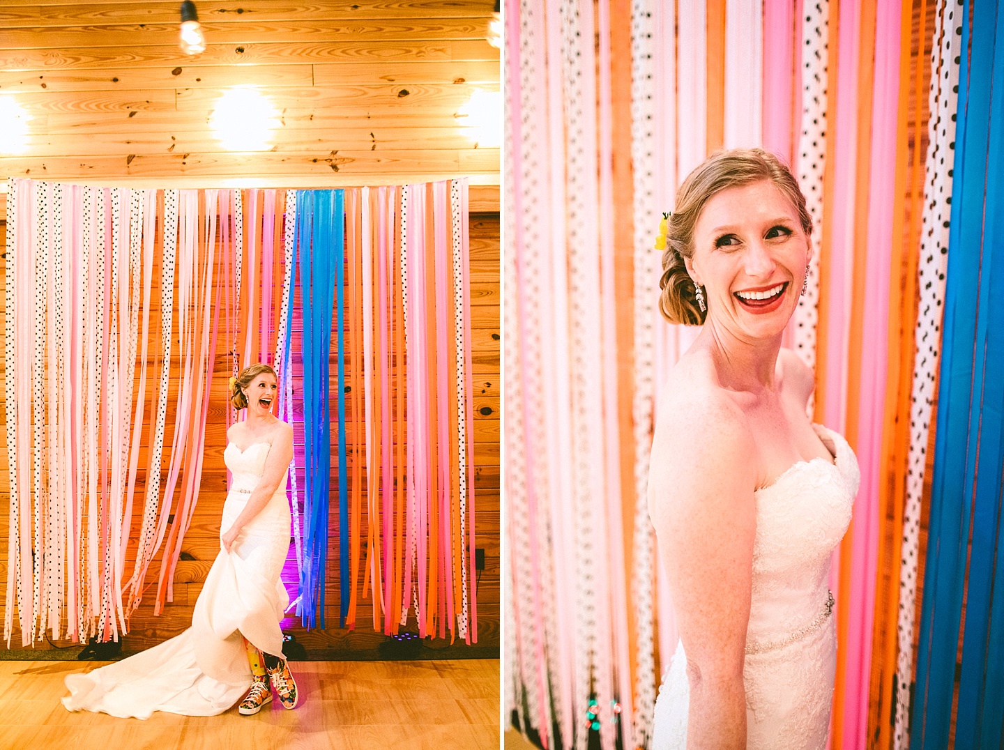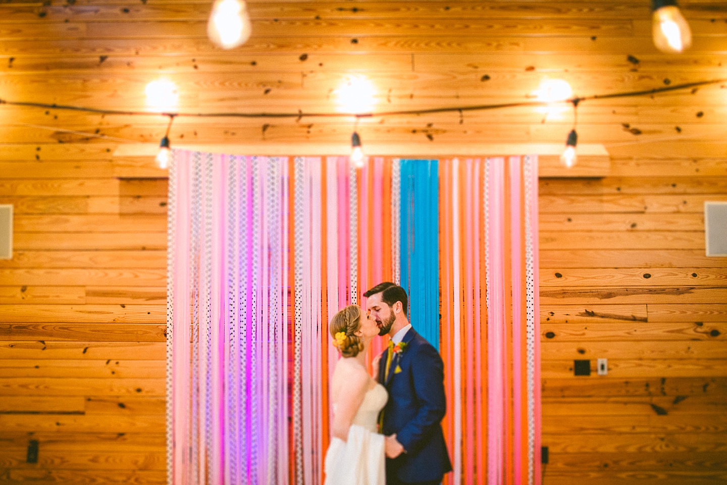 Caity and Kevin had the best weather ever for their December engagement session so I guess it only figures that it would come back and bite us later. Their wedding day was collllld and produced a constant rain that went kinda sideways under umbrellas so we didn’t go out in it much. Also, we were all freezing. But, because it was so cold, Caity decided to wear her badass colored leggings under her wedding dress on a whim which was highly encouraged by myself and all her bridesmaids because YES. She also occasionally busted out a pink leather jacket which was also praised and adored. And, because Caity and Kevin are very clever and thought ahead about things, the Rigmor House was decorated beautifully inside and allowed for plenty of colorful photo ops. Despite the dreariness outside, we were happy and colorful and warm INSIDE OUR HEARTS (and inside the Rigmor House). So much color, all the color, flag bunting forever and ever amen.