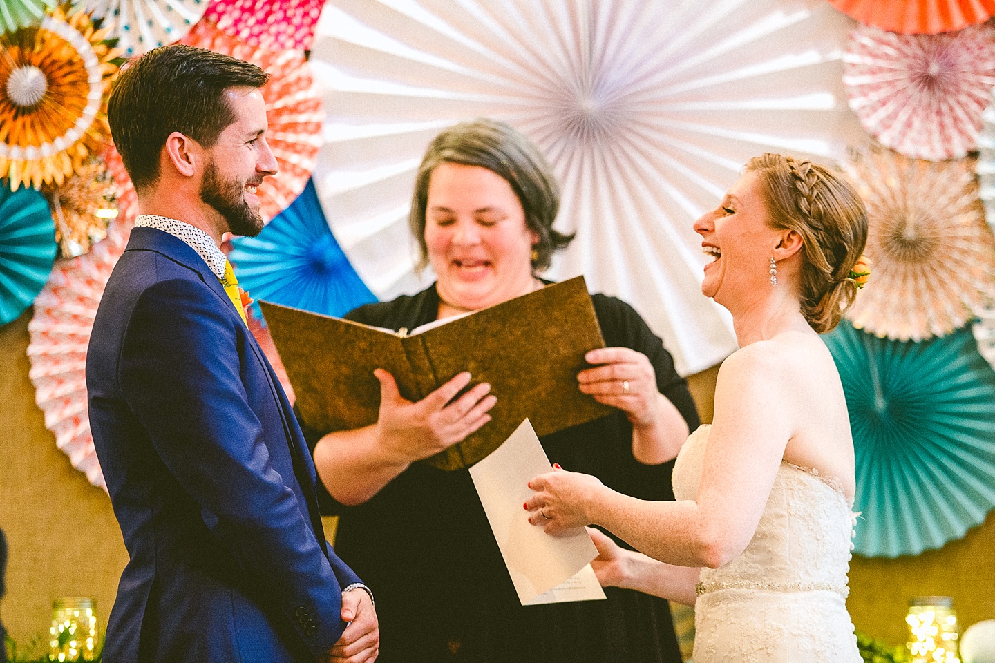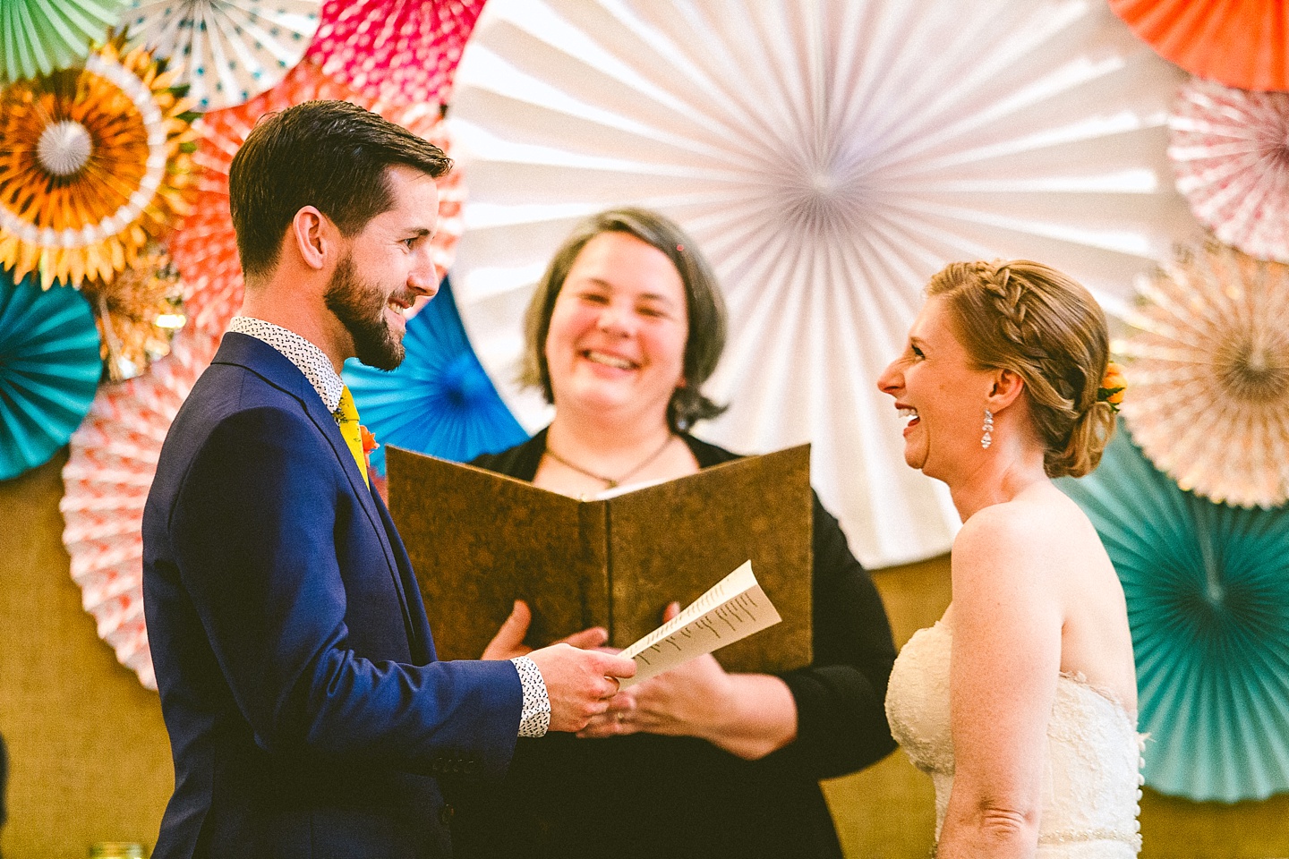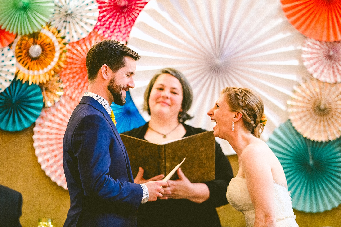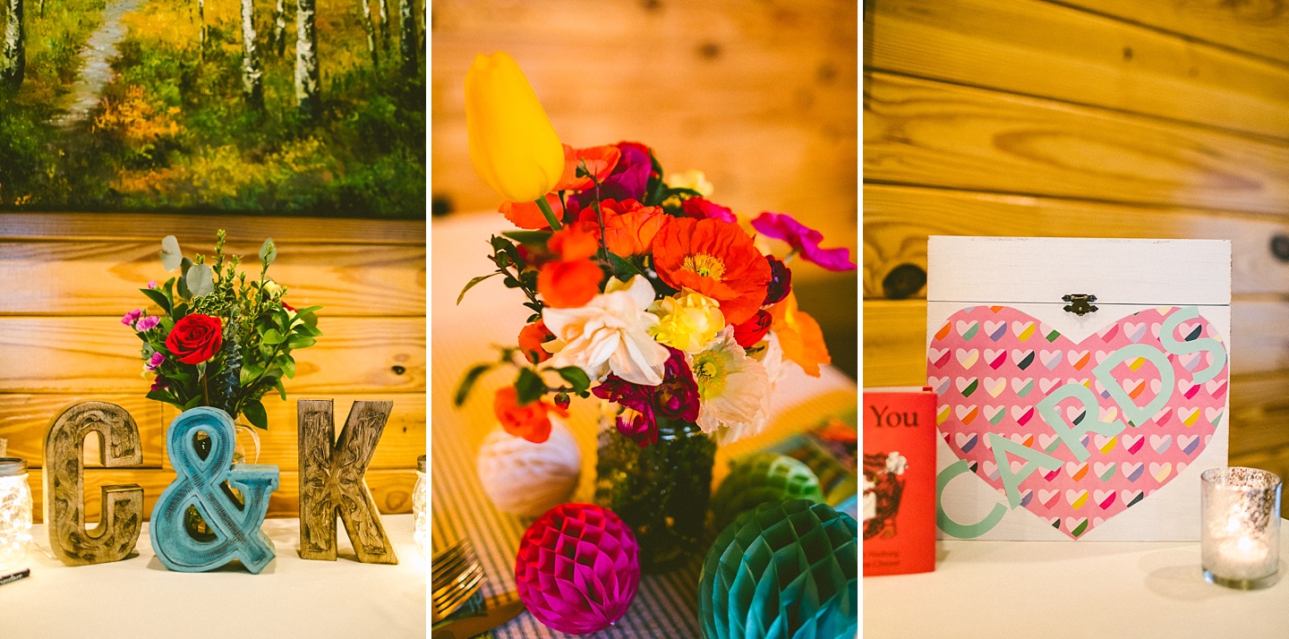 Caity and Kevin had the best weather ever for their December engagement session so I guess it only figures that it would come back and bite us later. Their wedding day was collllld and produced a constant rain that went kinda sideways under umbrellas so we didn’t go out in it much. Also, we were all freezing. But, because it was so cold, Caity decided to wear her badass colored leggings under her wedding dress on a whim which was highly encouraged by myself and all her bridesmaids because YES. She also occasionally busted out a pink leather jacket which was also praised and adored. And, because Caity and Kevin are very clever and thought ahead about things, the Rigmor House was decorated beautifully inside and allowed for plenty of colorful photo ops. Despite the dreariness outside, we were happy and colorful and warm INSIDE OUR HEARTS (and inside the Rigmor House). So much color, all the color, flag bunting forever and ever amen.