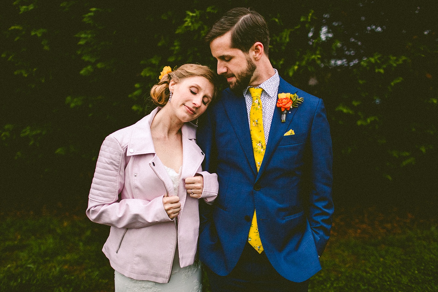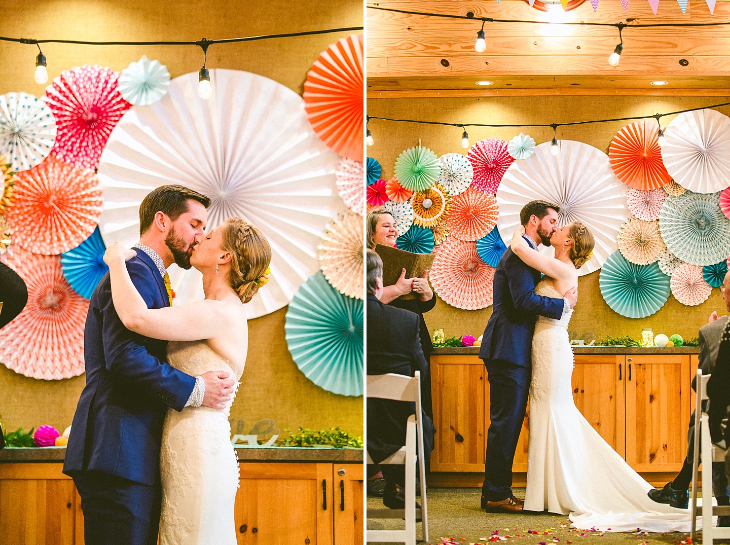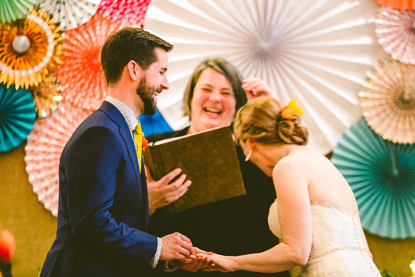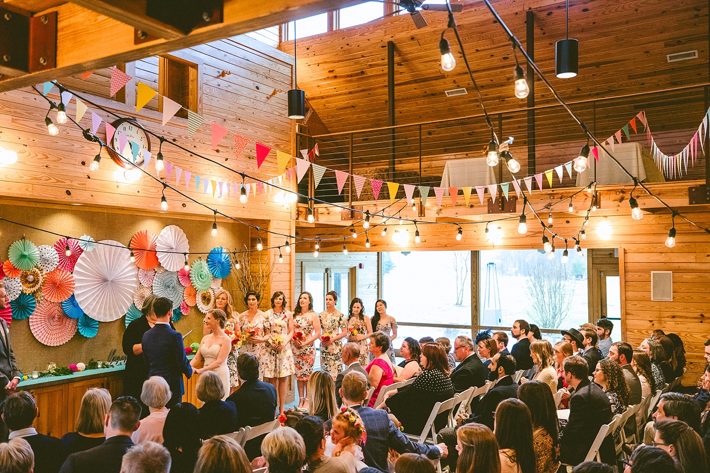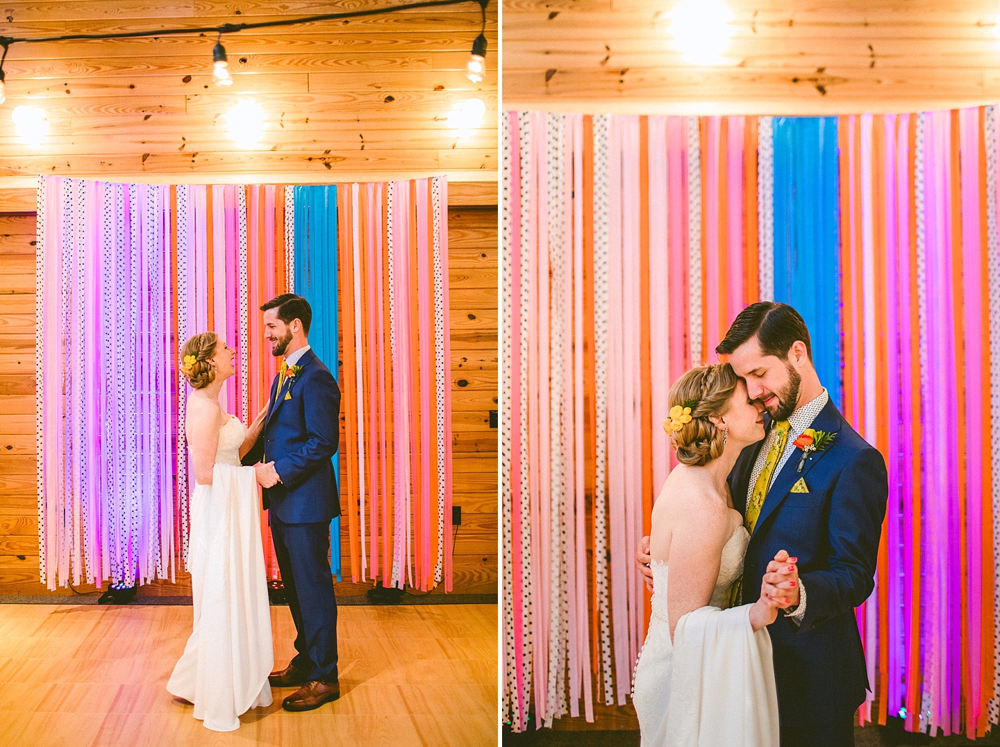 Caity and Kevin had the best weather ever for their December engagement session so I guess it only figures that it would come back and bite us later. Their wedding day was collllld and produced a constant rain that went kinda sideways under umbrellas so we didn’t go out in it much. Also, we were all freezing. But, because it was so cold, Caity decided to wear her badass colored leggings under her wedding dress on a whim which was highly encouraged by myself and all her bridesmaids because YES. She also occasionally busted out a pink leather jacket which was also praised and adored. And, because Caity and Kevin are very clever and thought ahead about things, the Rigmor House was decorated beautifully inside and allowed for plenty of colorful photo ops. Despite the dreariness outside, we were happy and colorful and warm INSIDE OUR HEARTS (and inside the Rigmor House). So much color, all the color, flag bunting forever and ever amen.