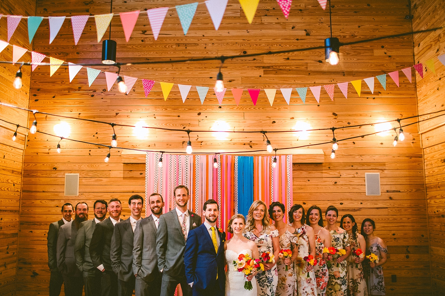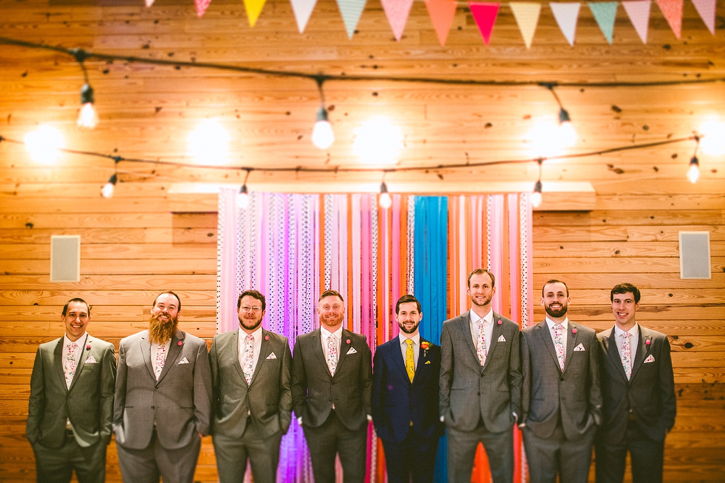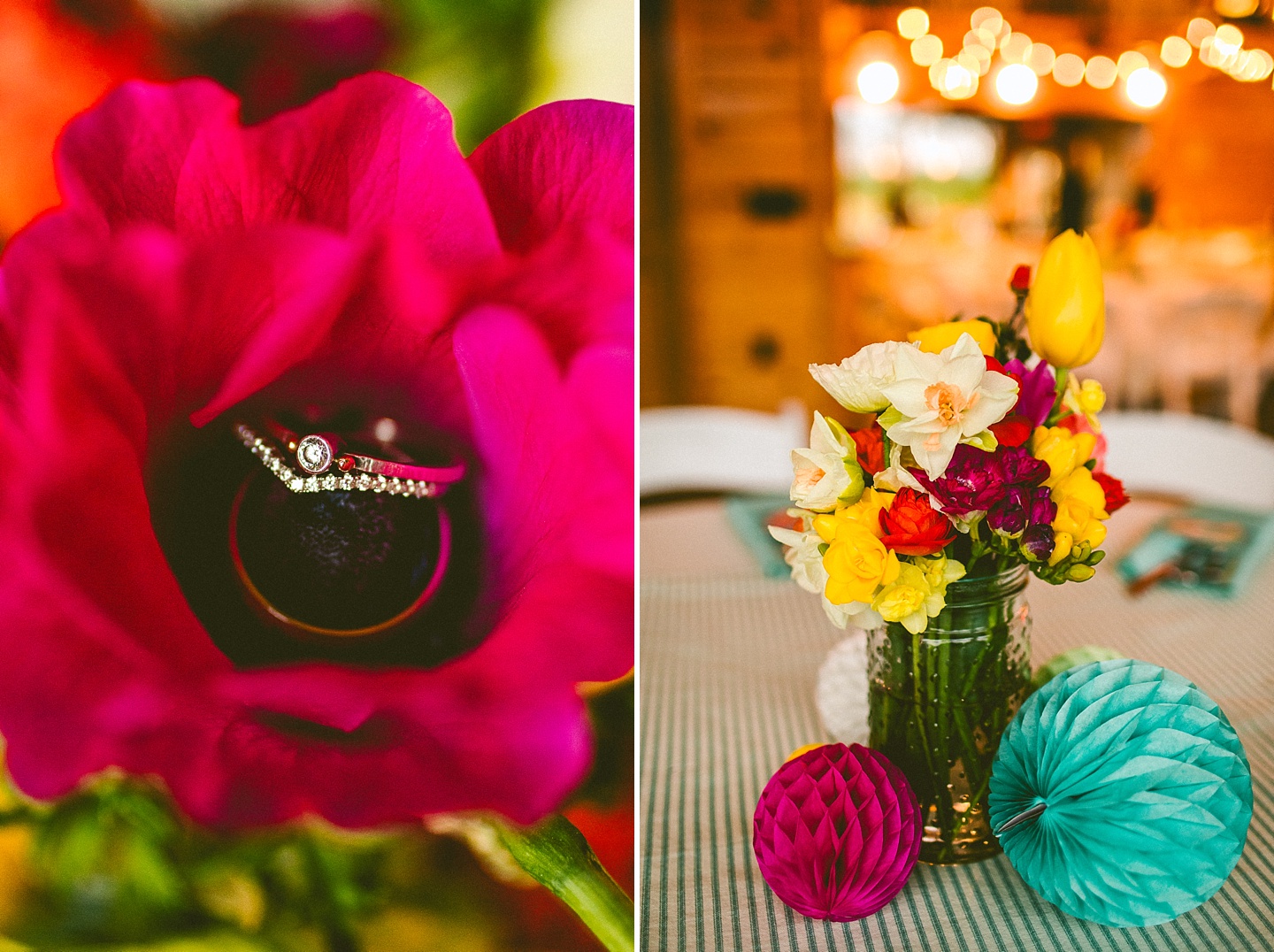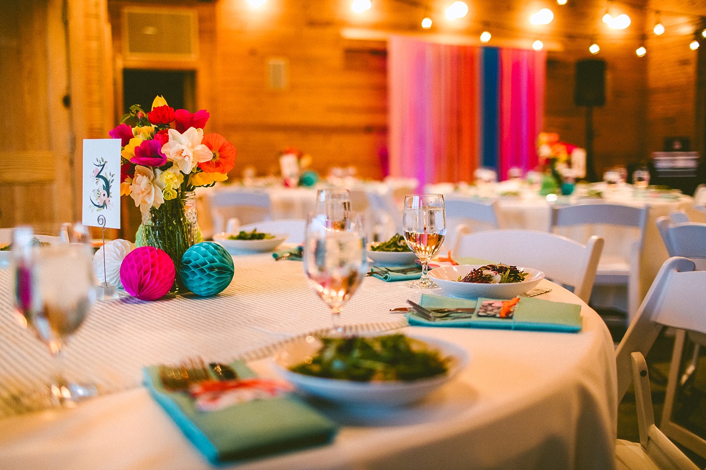 This was a total breath of fresh air wedding! Lindsay and Zac, who were married at a new venue in Greensboro called Adam’s Place (a private property that’s been recently renovated to accommodate outdoor ceremonies and receptions), held a stunning wedding. What was so great was that they chose all bright, vibrant colors instead of a single color or two, and it just had such a happy feel about it. :) I met these two only very recently, but in the short time we’ve known each other it’s clear that they are amazing people with a wonderful group of supportive family and friends. We had a great time working with their wonderful bridesmaids and groomsmen as well! The ceremony was held outdoors and it was hot… and I mean hot. As in, both Geoff’s camera and my camera overheated during the ceremony (no, neither stopped taking pictures, thank goodness, but the red warning light was totally on and the LCD screen was blank for about five minutes). There were a few moments where I was prepared to black out. Maybe it’s because I’m from the north, as no one in the wedding party (even Lindsay with her heavy and gorgeous dress) broke a sweat. But the ceremony was beautiful and lead to an even more beautiful reception. Let me tell you – outdoor receptions in the evening in NC are just beyond beautiful (when the weather’s nice, of course). The lighting was perfect and they danced on the patio. It was super low stress and everyone was so nice. Lindsay and Zac took off at the end of the night and headed to Jamaica for their honeymoon. Enjoy their adorably detailed wedding!