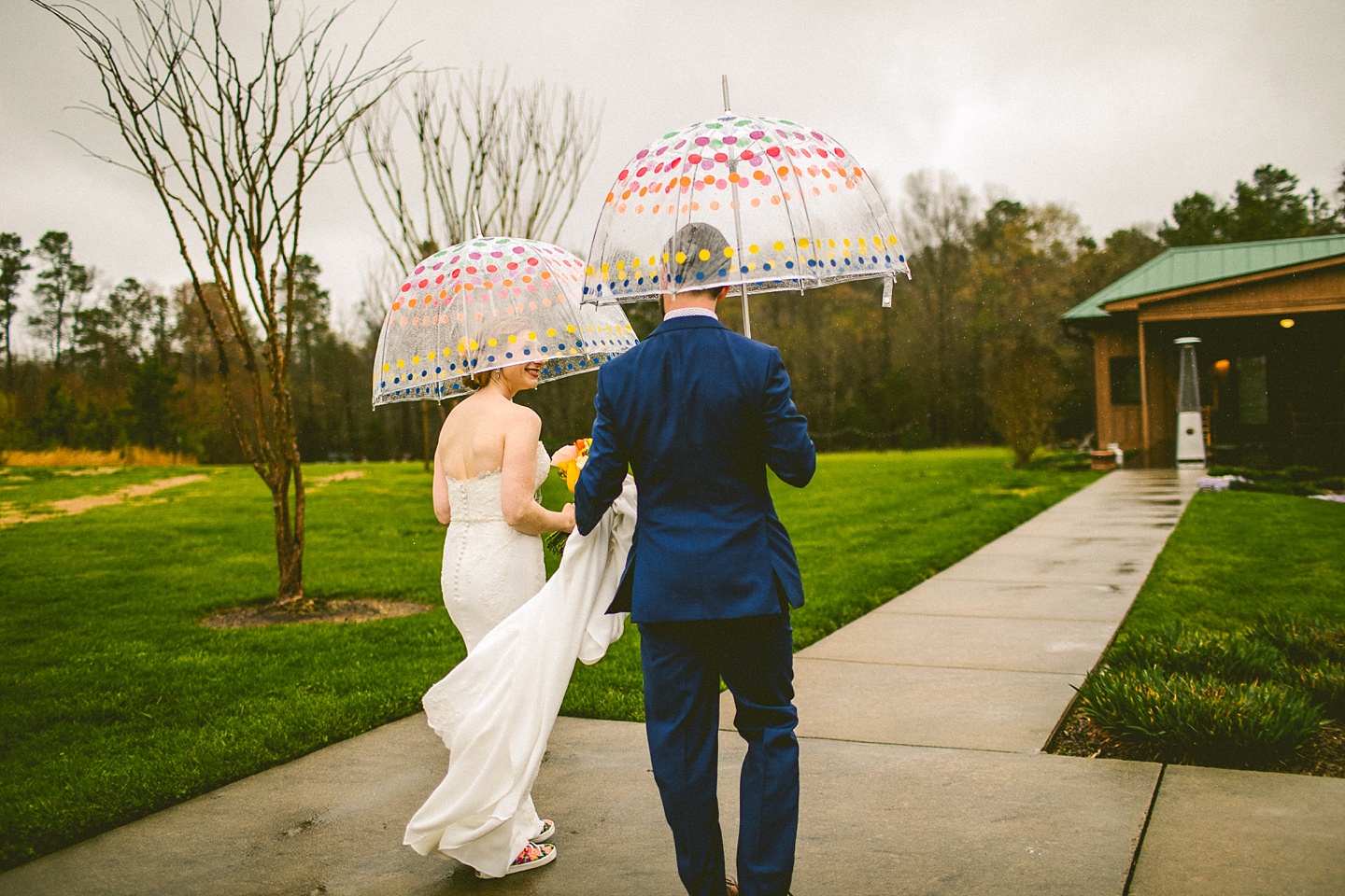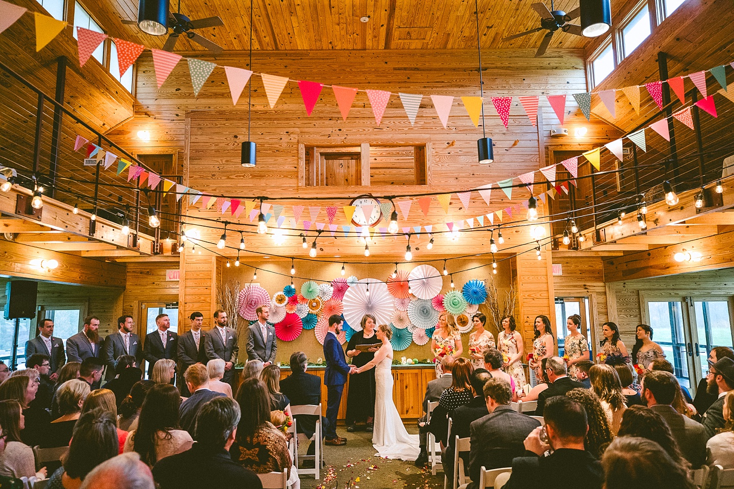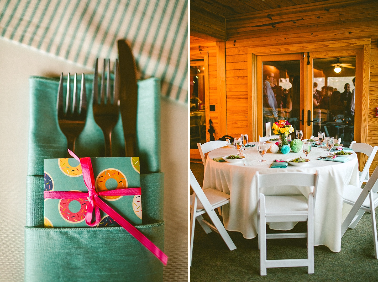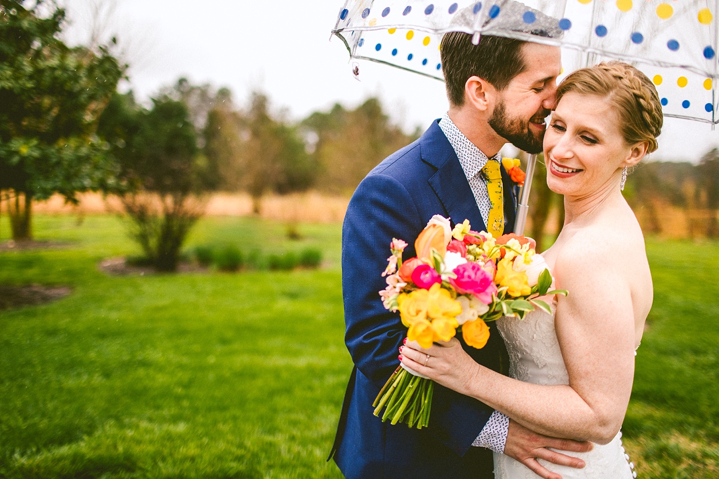 This was a total breath of fresh air wedding! Lindsay and Zac, who were married at a new venue in Greensboro called Adam’s Place (a private property that’s been recently renovated to accommodate outdoor ceremonies and receptions), held a stunning wedding. What was so great was that they chose all bright, vibrant colors instead of a single color or two, and it just had such a happy feel about it. :) I met these two only very recently, but in the short time we’ve known each other it’s clear that they are amazing people with a wonderful group of supportive family and friends. We had a great time working with their wonderful bridesmaids and groomsmen as well! The ceremony was held outdoors and it was hot… and I mean hot. As in, both Geoff’s camera and my camera overheated during the ceremony (no, neither stopped taking pictures, thank goodness, but the red warning light was totally on and the LCD screen was blank for about five minutes). There were a few moments where I was prepared to black out. Maybe it’s because I’m from the north, as no one in the wedding party (even Lindsay with her heavy and gorgeous dress) broke a sweat. But the ceremony was beautiful and lead to an even more beautiful reception. Let me tell you – outdoor receptions in the evening in NC are just beyond beautiful (when the weather’s nice, of course). The lighting was perfect and they danced on the patio. It was super low stress and everyone was so nice. Lindsay and Zac took off at the end of the night and headed to Jamaica for their honeymoon. Enjoy their adorably detailed wedding!