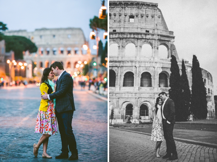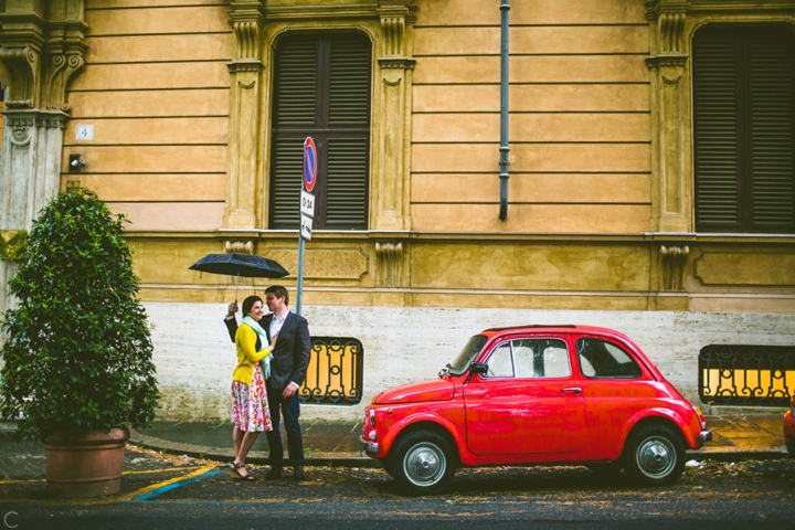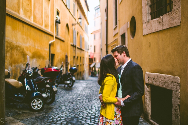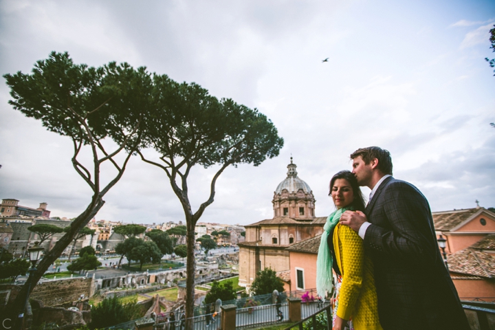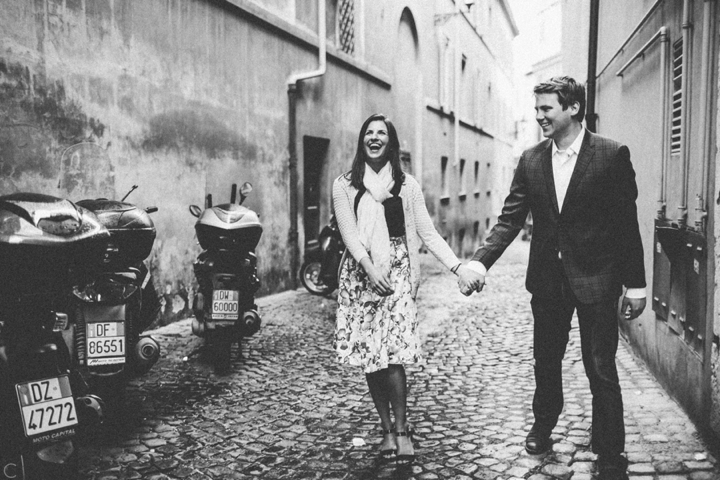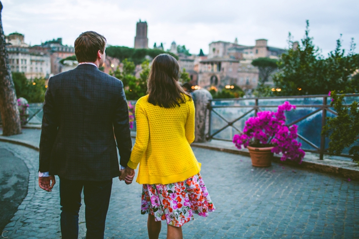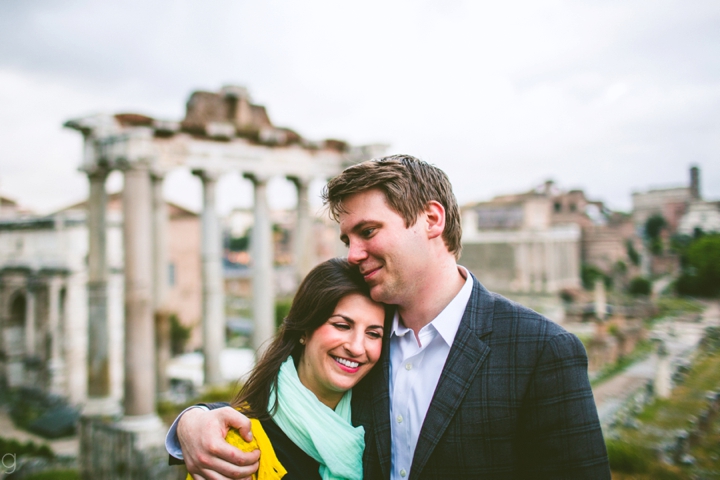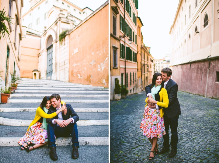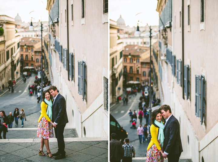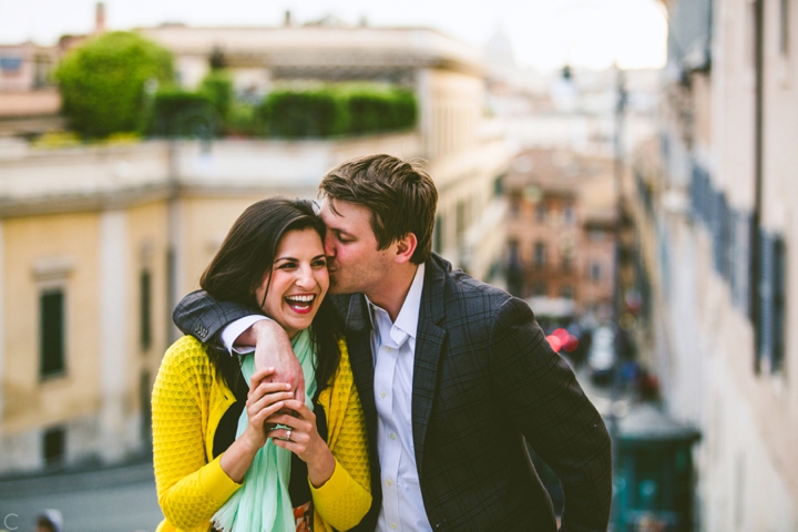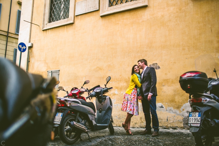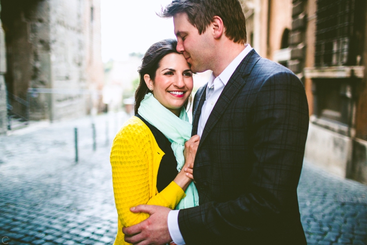 So as to not be redundant, I’m going to save our super long-winded paragraph about how we ended up photographing Carlena and Andrew’s wedding in Italy for their wedding blog post because it’s a fun story. So just fast forward to the part where we’re in Italy, and Carlena and Andrew are there, and we’re all in Rome for about two days. We decided to photograph their engagement session in Rome instead of Positano (where their wedding was) because we knew they’d look different and because when in Rome! (Don’t worry, that’s the only time I’ll use it, I promise). We ran around alleys and dodged Vespas. We got offered a lot of selfie sticks and got rained on quite a bit.  We saw the Roman Forum and got asked if we were British or New Yorkers by a couple having an internal debate about our accents. We stupidly turned down a woman handing out free french fries because we were so used to turning down the selfie sticks that we didn’t realize we made a mistake until it was too late. Rome is busy and full of people and cars and old, impressive things. And we were happy to see it with these two fine people.