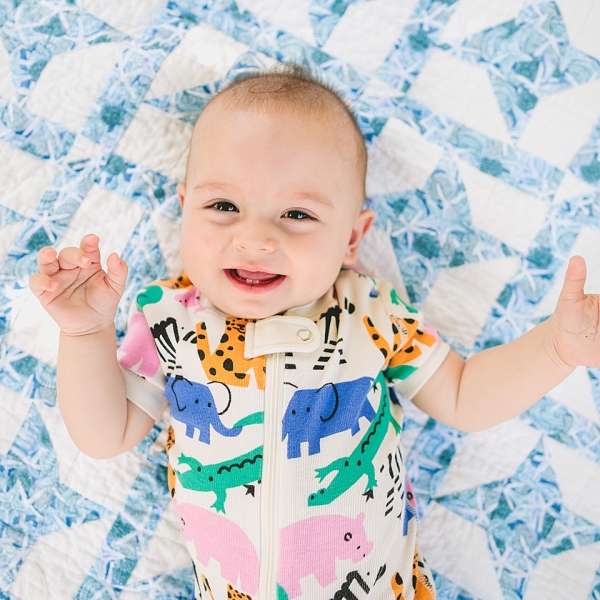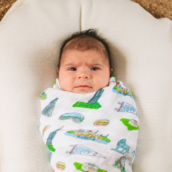 It was so much fun to meet this beautiful family! Sarah and Ryan have a newborn baby girl who was four weeks at the time of this shoot and who did a stellar job modeling in a variety of adorable outfits (also swaddled in an adorable Chicago-themed blankie). She’s being carefully watched over by her two older sisters, a Goldendoodle named Bella and a Bernadoodle named Daisy, who absolutely love their new addition. Bella and Daisy also absolutely loved me, and the feeling was mutual. They are such sweet pups! They did their best job modeling for photos alongside their new sister in their very gorgeous home. Everyone was so excited for Baby Girl’s arrival and for her photoshoot, and I’m so glad I got to be a part of documenting the early days of their family together.