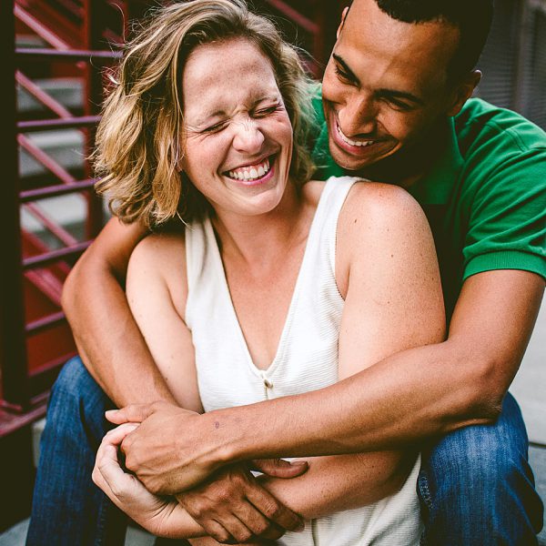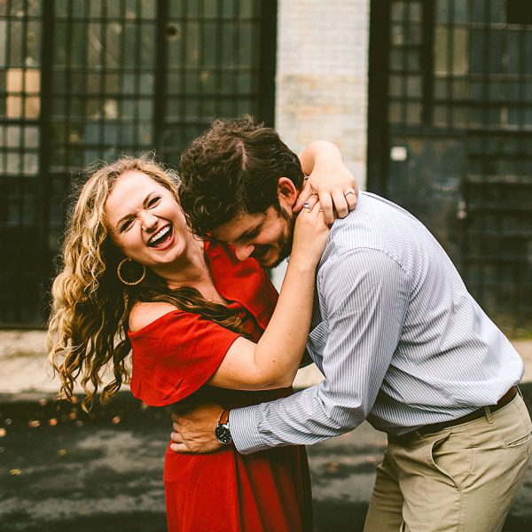 Geoff and I photographed Katie and Tony’s wedding in Virginia back in 2017 when Katie wore this incredible pantsuit. Thankfully, the Durham area gained Katie and Tony back recently (!) and now we can have dinner with them and talk about podcasts. In addition, I was lucky enough to get to photograph them recently for a couple’s session! I love doing portraits with couples as it’s low-key and fun, and it’s cool to look back on them later with your partner (the best part is that no matter how old you think you look now, when you look back on pictures later, you will always look younger than you currently do! Isn’t that great?). We did a few at their house with their dog Caroline who is really adorable but only likes a handful of people (and I am not one of them… probably a Caroline vs. Carolyn thing) so I took photos of her from 25 feet away, and then we moved on to downtown Durham. Part of the fun of shooting in August is the fact that the weather doesn’t make a lick of sense, and even with a 10% chance of rain in the forecast, some sort of gnarly front moved in on us with 40mph winds and crazy clouds and we all ended up hiding underneath an overhang for a bit. But I’d happily hang with them under overhangs any day of the week, especially when it stops me from having to photoshop out a bunch of little rain dots on their shirts.