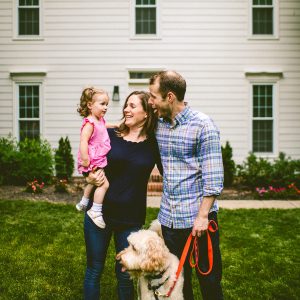 In addition to being our chiropractic heroes, Cortney and James are also dear friends and neighbors. They have a dog named Buddy who is very fluffy and smiley and who I desperately have tried to befriend so I can pet. But alas, Buddy is quite shy, and despite meeting us repeatedly, usually hides behind James or Cortney when he sees us. However! We had a true breakthrough during this session by simply giving him dog treats. Turns out, Buddy is won over with food, and suddenly became our best friend and dog model. I was able to pet him a lot, and I was happy (we’ll see what happens next time we see Buddy out and about, but we’re hoping he remembers). We also attempted to win over their adorable human child Georgia (18mo), who was never quite as convinced about us as Buddy was despite a wide variety of coaxing tricks. But this was probably because she just woke up from a nap (to be fair, I am exactly the same way). However, she came out of her shell when walking buddy and being tossed in the air. Next time we’ll try giving treats to her too and see if it works. Georgia is an excellent, A+ dog walker who also enjoys dandelion puffs, baby dolls, the Lion King, spotting bunnies across the street, trolls, Buddy, and her mom and dad. Cortney and James woke up the next day to Georgia running around saying, “Carolyn! Geoff! Carolyn! Geoff!” so we must’ve made quite the impression on that sweet little lady. We love this entire family to bits.