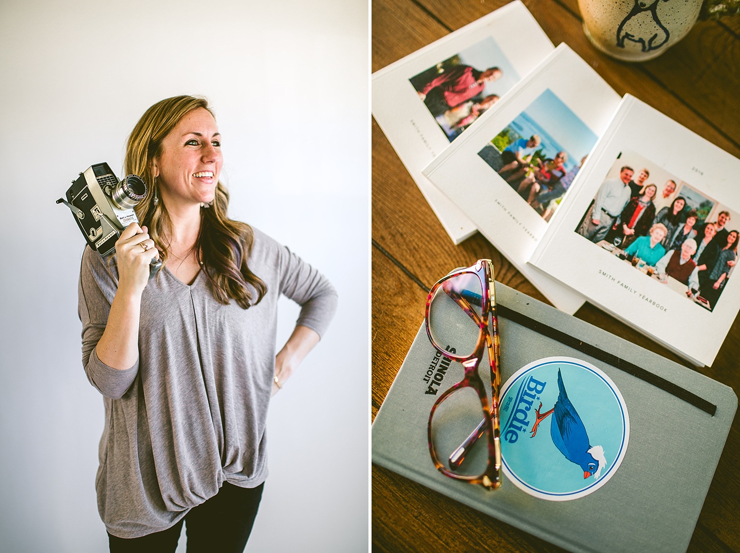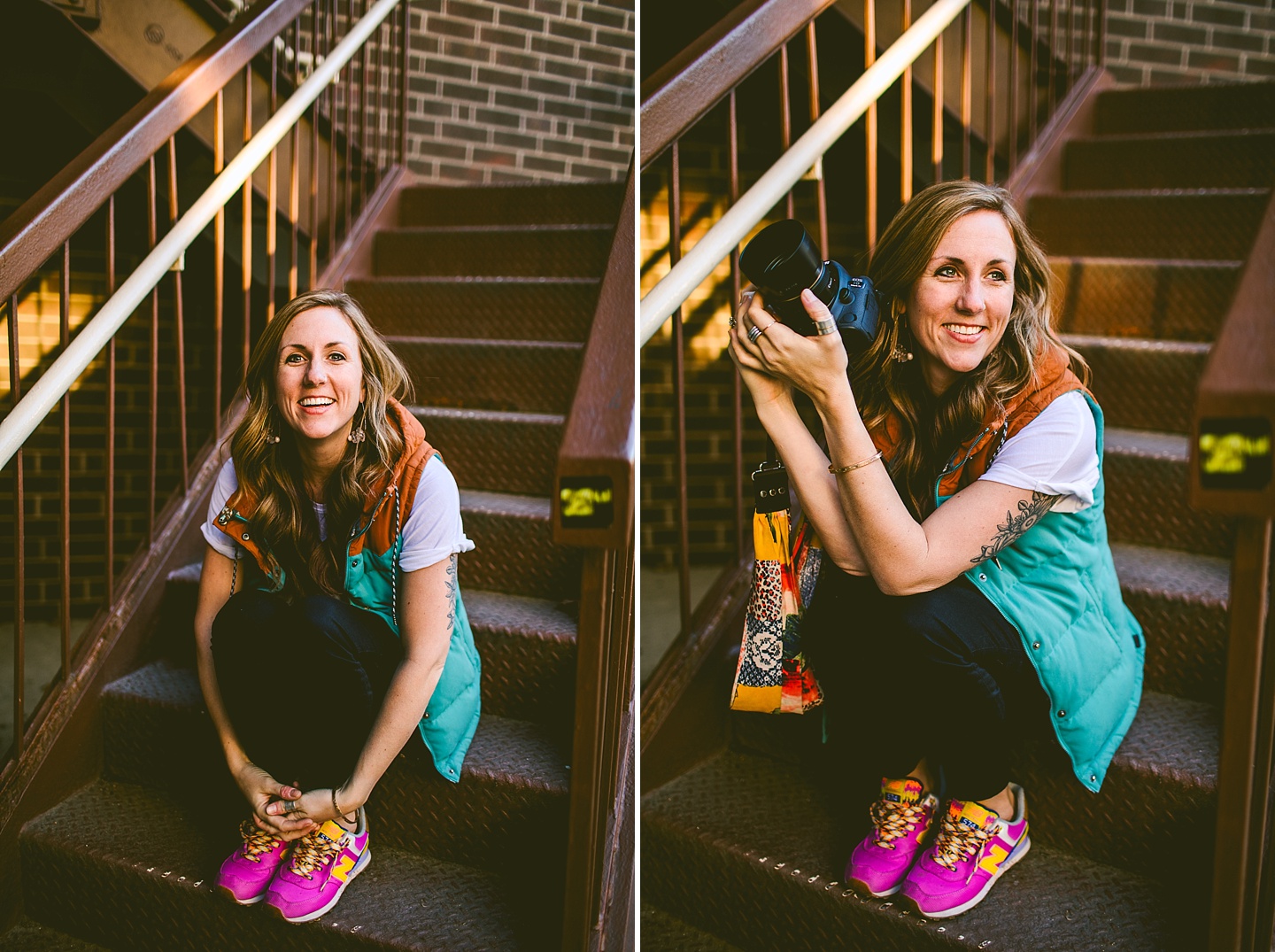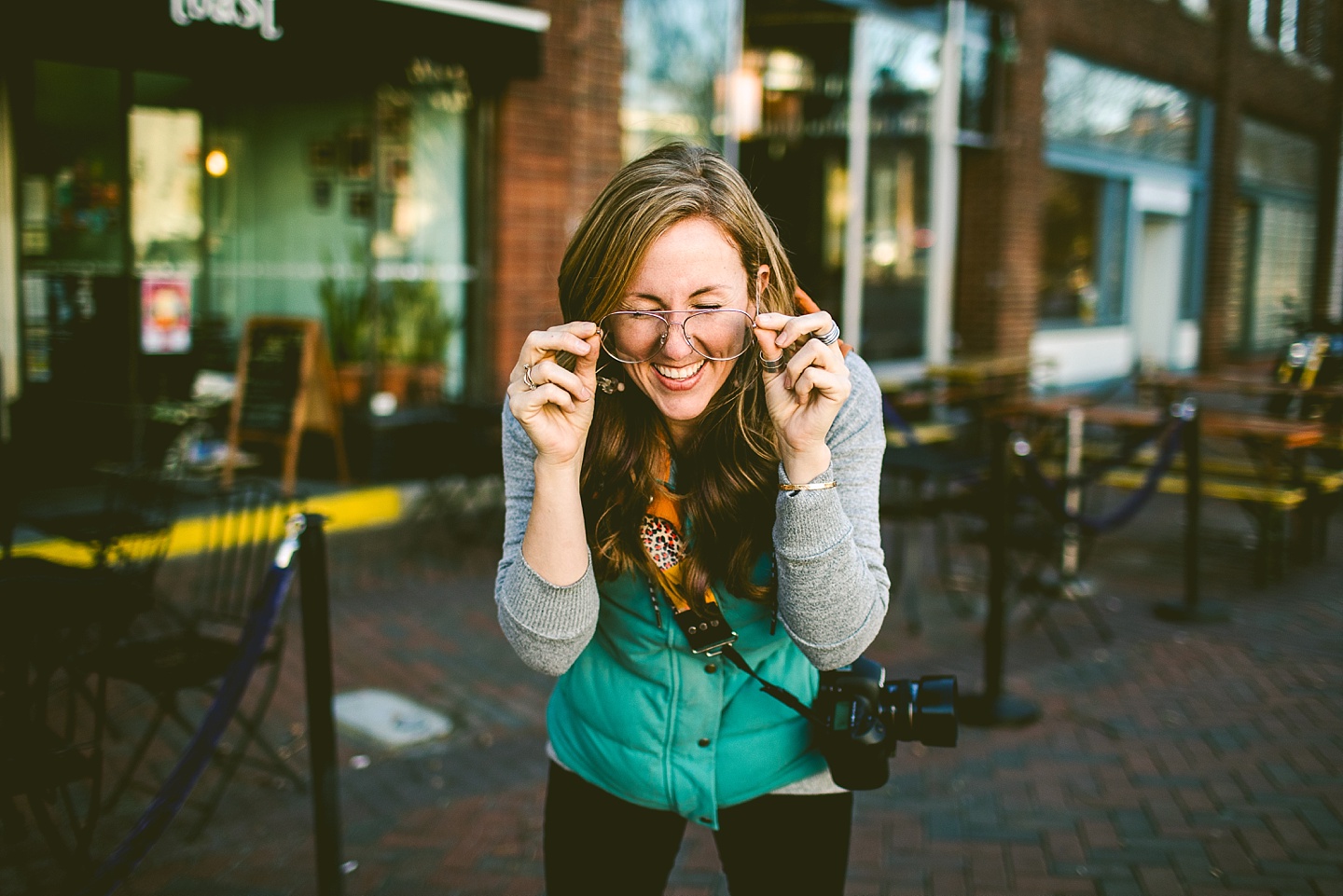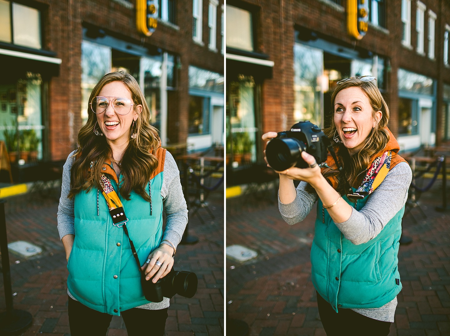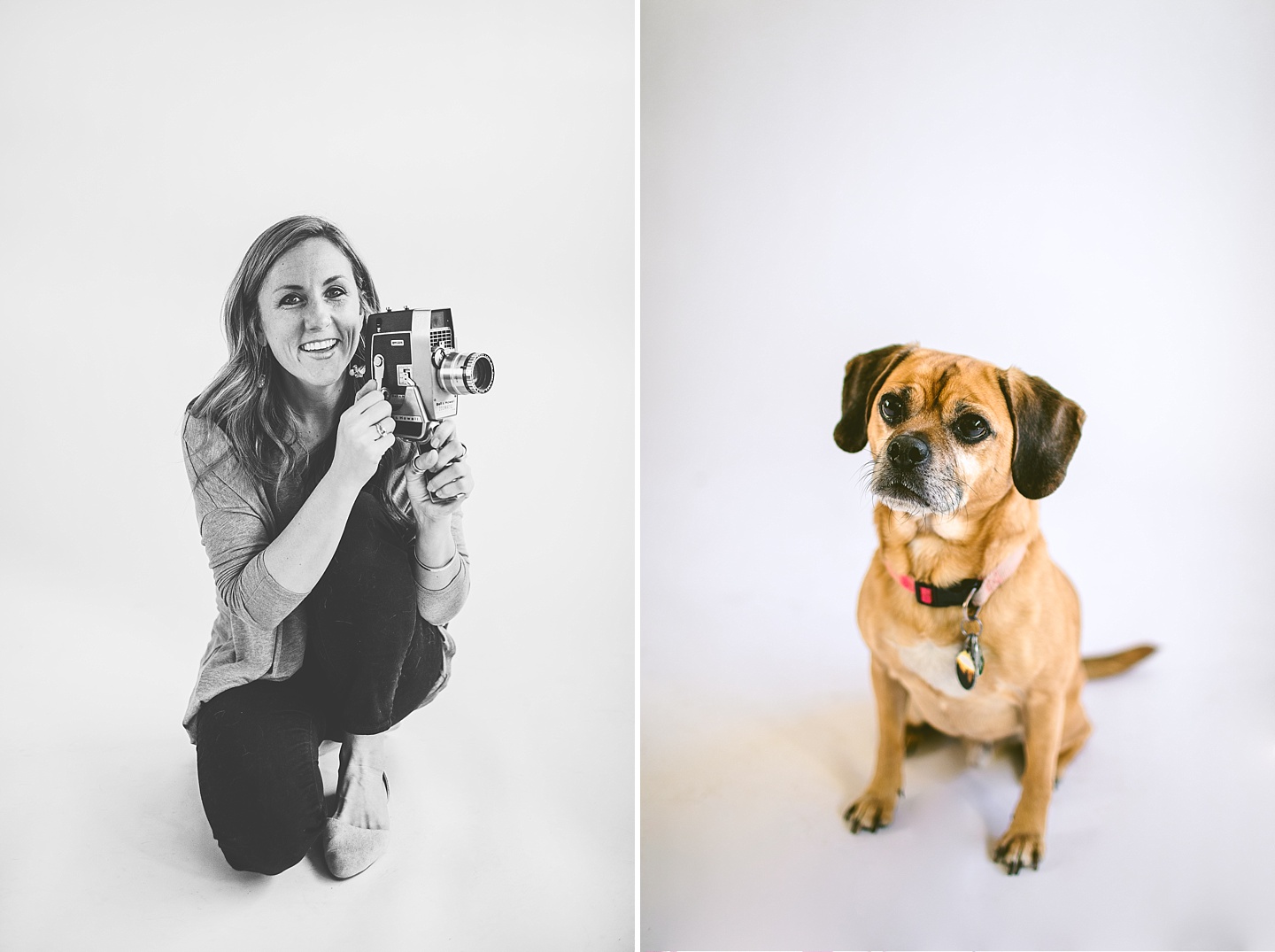 Anyway, Janice told me that Toby doesn’t like it when girls come on too strong to him, so I’m trying to refrain from making this entire post about him. Janice is a dear friend of ours, an extremely talented female bossy lady videographer, a Durhamite, a lover of pups big and small (the small, also adorable, far more loving and friendly doggo in these pictures is Murphy), a trusted colleague, and a wearer of vests and fanny packs. We have a little too much fun photobombing her at weddings (there are probably many minutes of footage she’s accumulated and cut out) and we love her dearly. It was with great pleasure that we photographed her new promo photos for her wedding and commercial videography company Big Dog Little Bed. She is hilarious and charming and adorable and beautiful and intelligent and can rock 1977 dad glasses like there’s no tomorrow. This shoot makes me smile because Janice makes me smile. Also Toby.