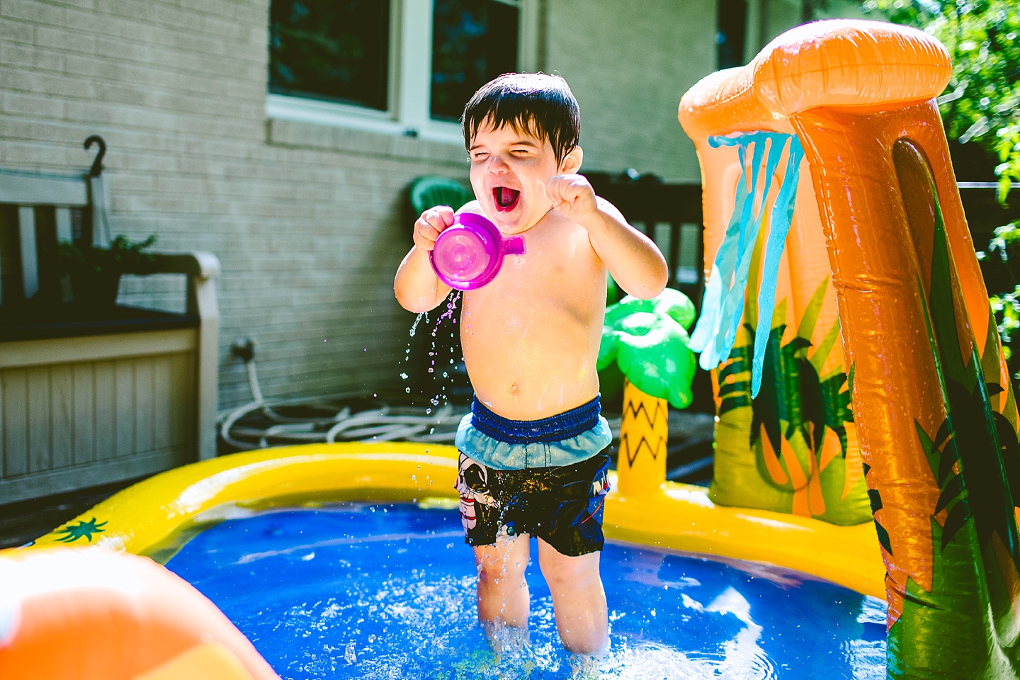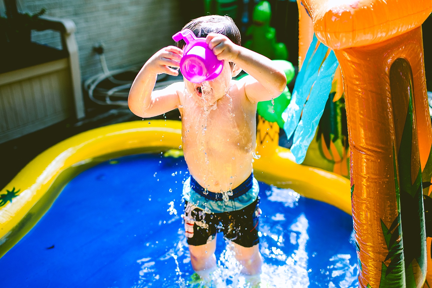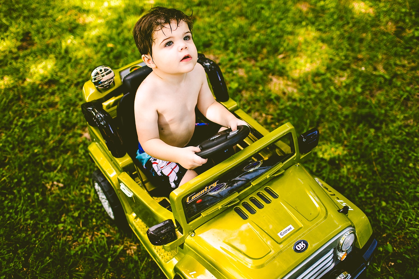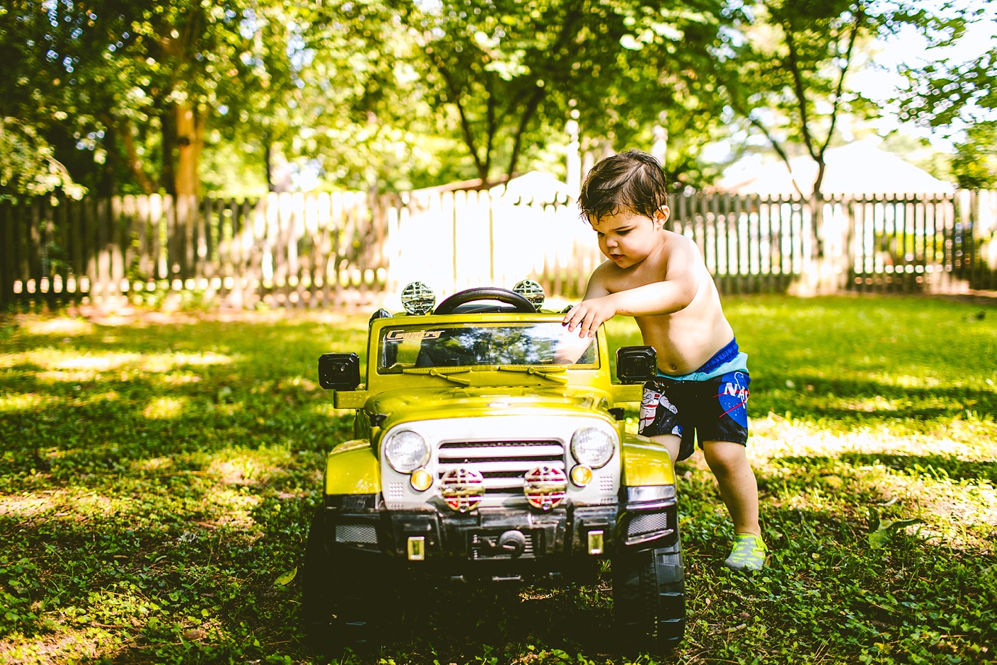 In addition to Men Without Hats, he also enjoys this one song that came programmed into his Jeep. It’s super strange, oddly somber for a child’s toy, but sounds kind of like a teenage version of Journey’s Faithfully. Definitely a breakup song. And when he’s done with the Safety Dance, he cools down to that one, accompanied by slower, sadder Wheels on the Bus hand motions. When he’s done feeling sorry for himself for whatever imaginary breakup he’s going through, he heads straight to his kiddie pool to pick up a cup and then literally pour a ton of water straight into his eyes. He does this repeatedly (always aiming for the top of his head but not quite having the rotator cuff range yet so landing directly into the eyes) and then shakes like he’s about to explode with joy. I think he’s cold, but it’s a delighted cold, so it comes across as enthusiastically explosive.
