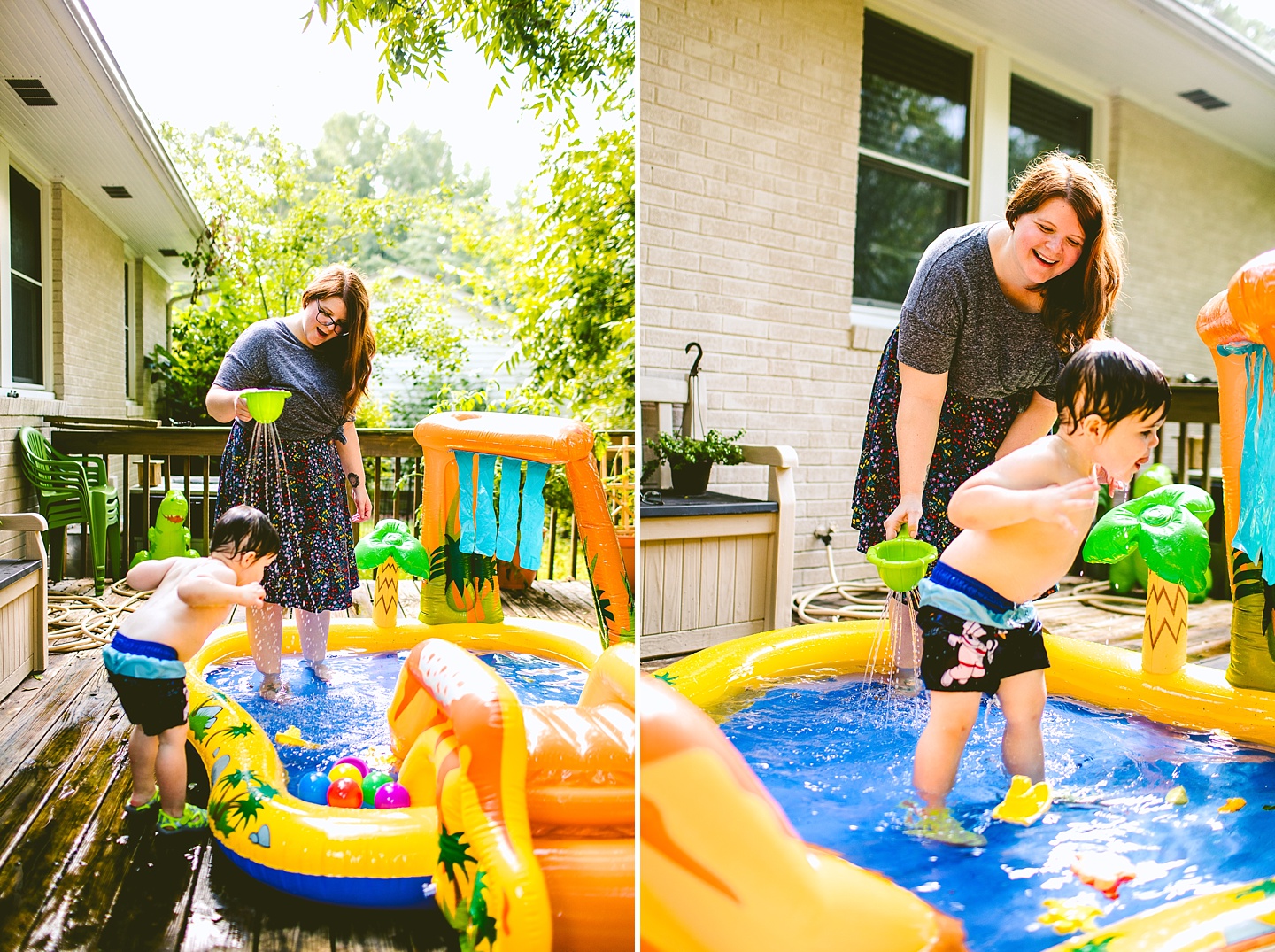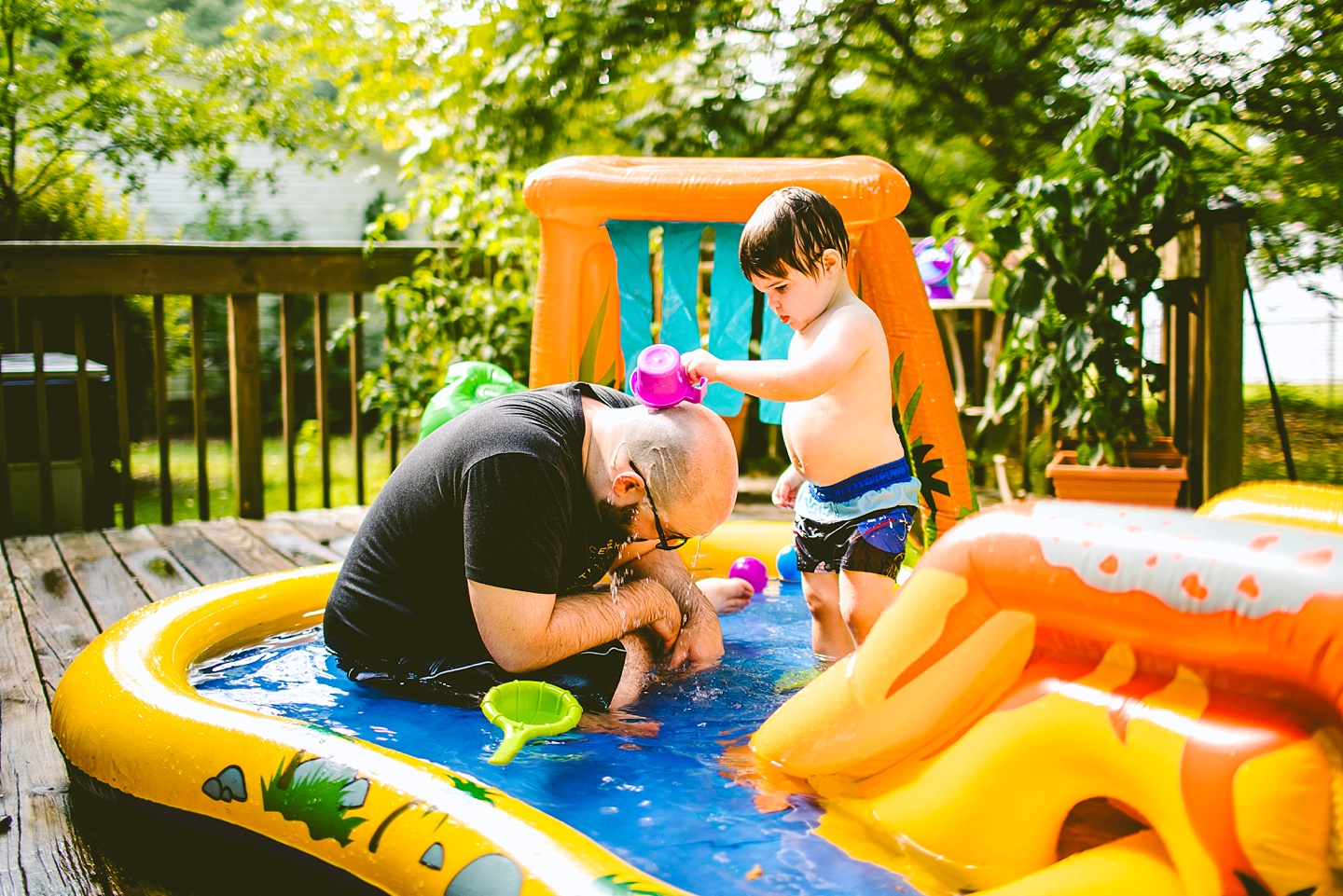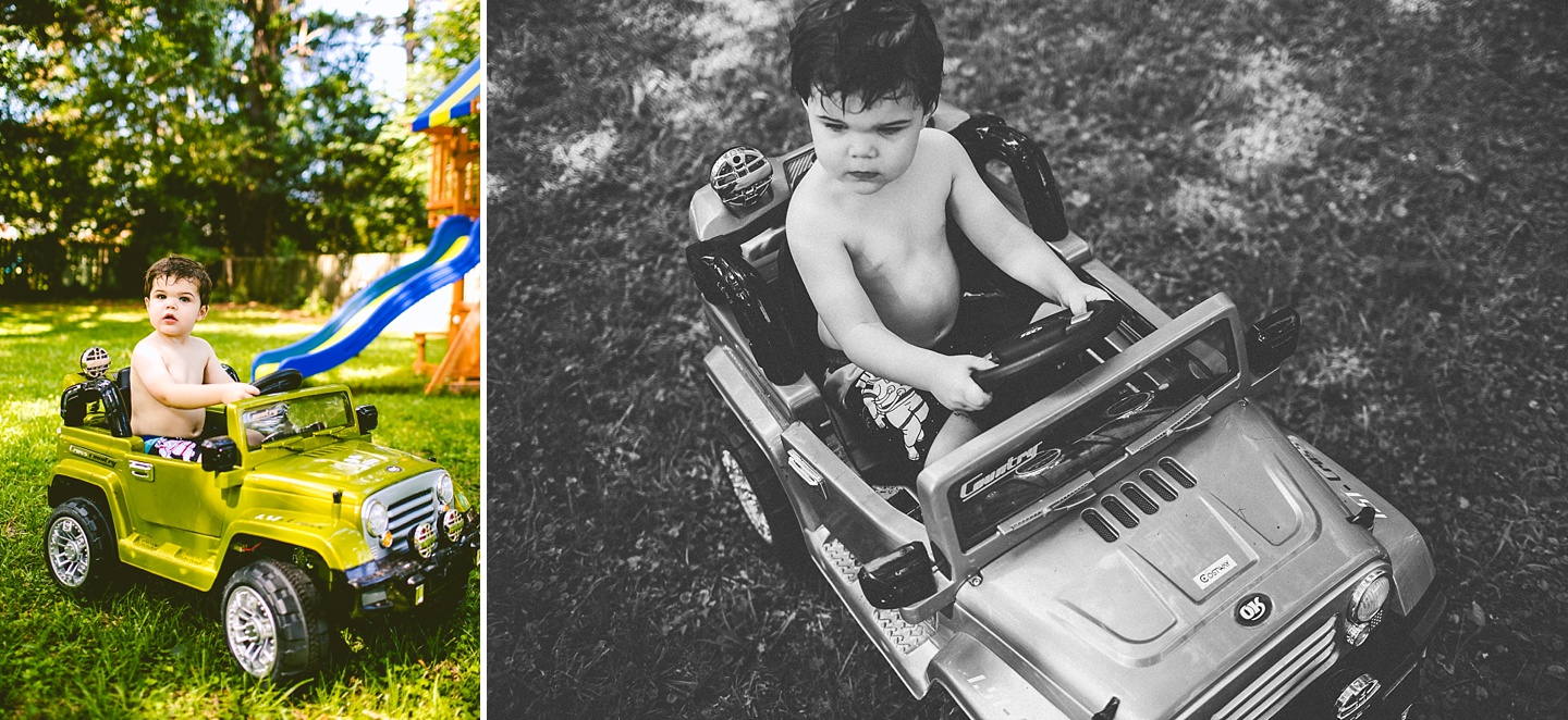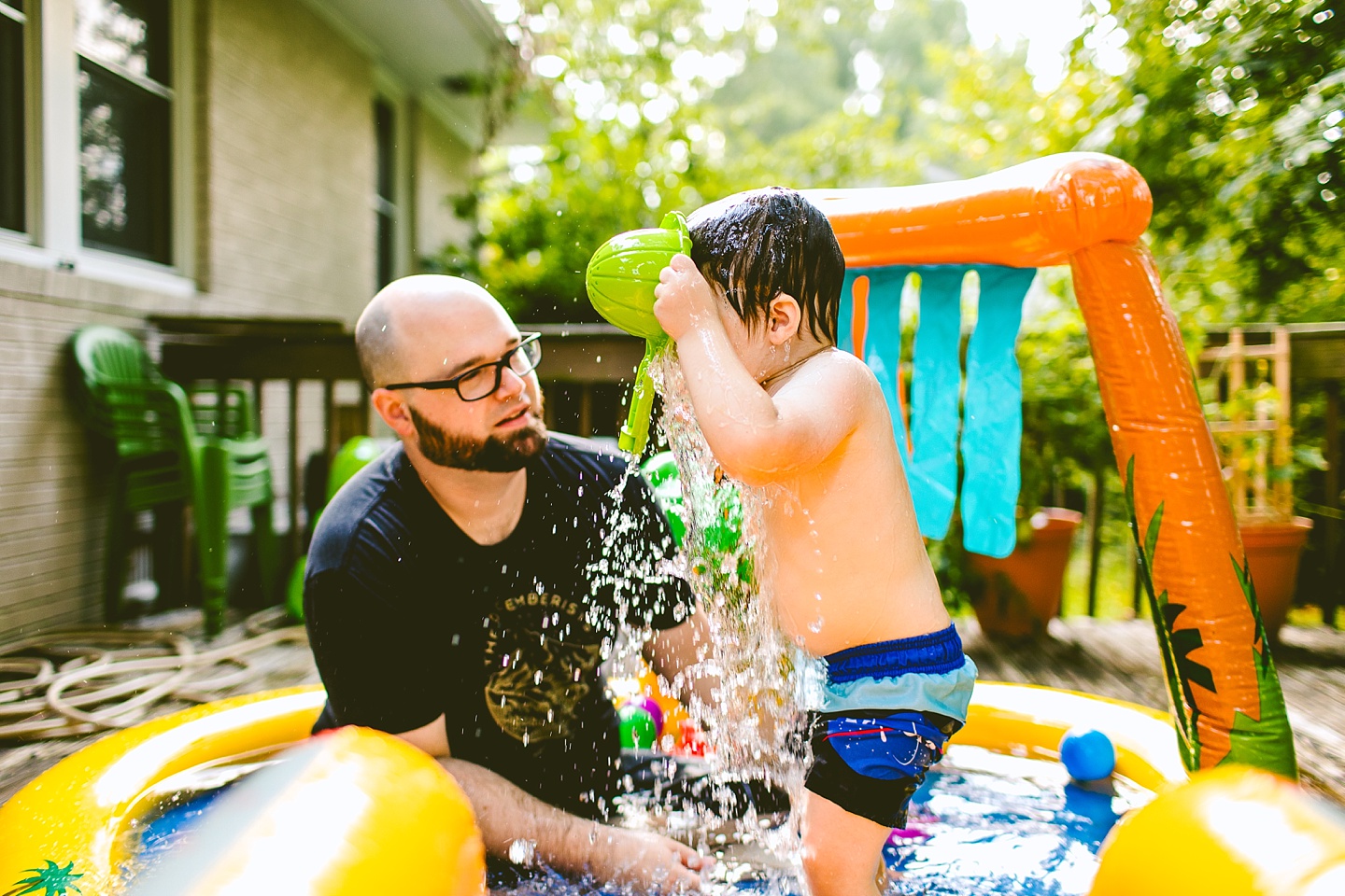 In addition to Men Without Hats, he also enjoys this one song that came programmed into his Jeep. It’s super strange, oddly somber for a child’s toy, but sounds kind of like a teenage version of Journey’s Faithfully. Definitely a breakup song. And when he’s done with the Safety Dance, he cools down to that one, accompanied by slower, sadder Wheels on the Bus hand motions. When he’s done feeling sorry for himself for whatever imaginary breakup he’s going through, he heads straight to his kiddie pool to pick up a cup and then literally pour a ton of water straight into his eyes. He does this repeatedly (always aiming for the top of his head but not quite having the rotator cuff range yet so landing directly into the eyes) and then shakes like he’s about to explode with joy. I think he’s cold, but it’s a delighted cold, so it comes across as enthusiastically explosive.