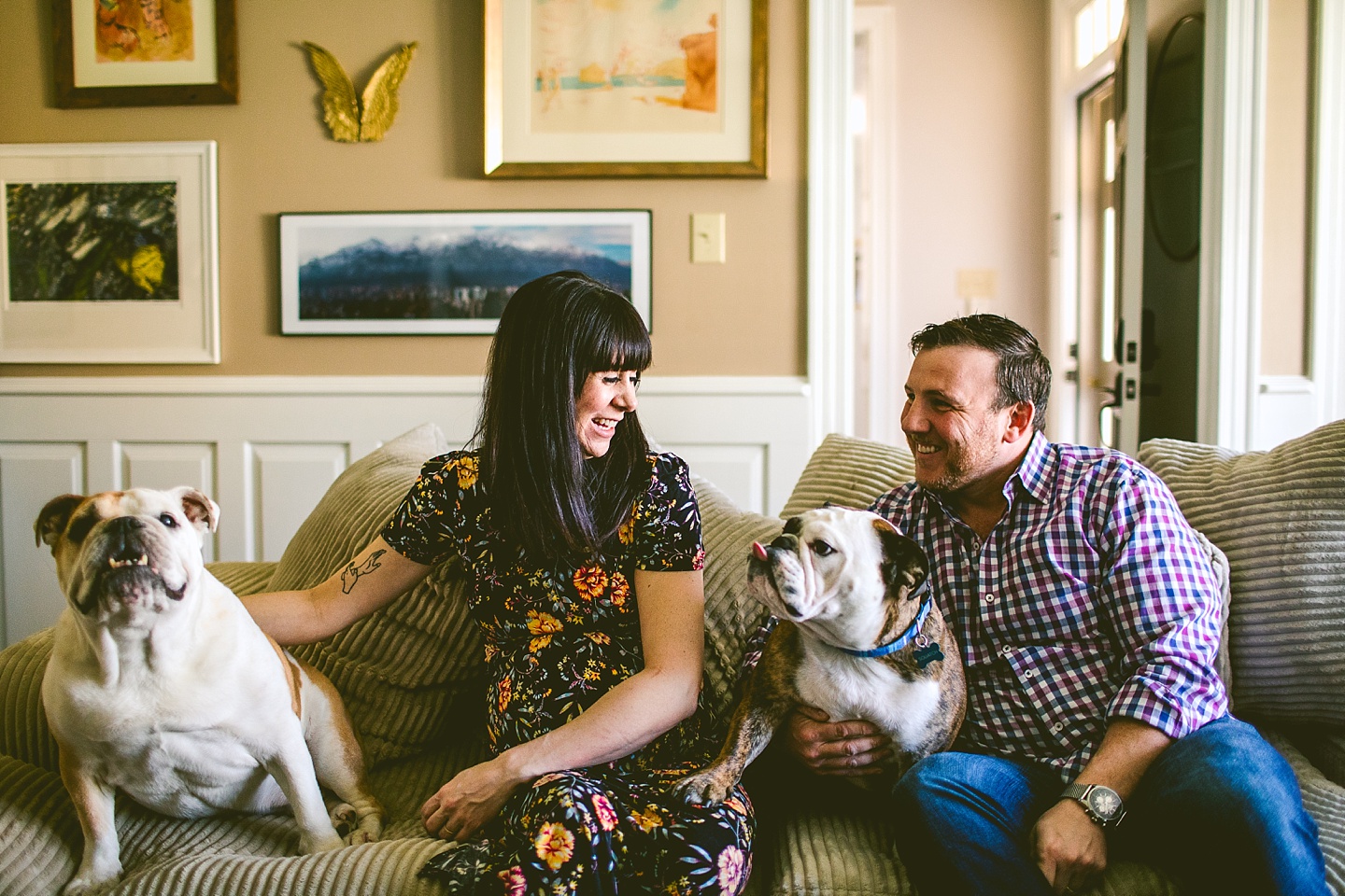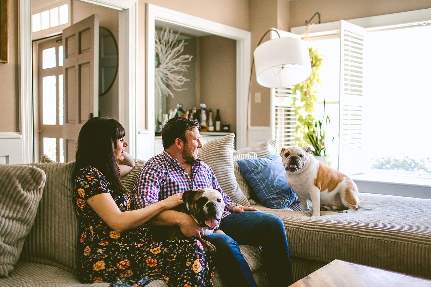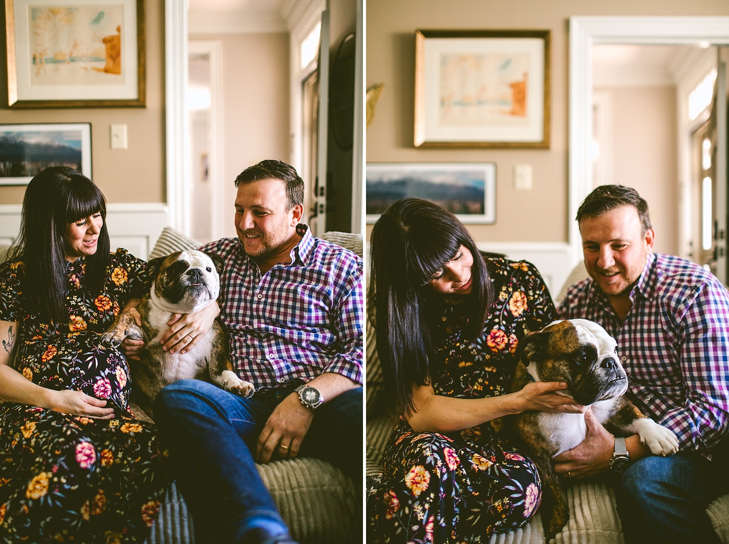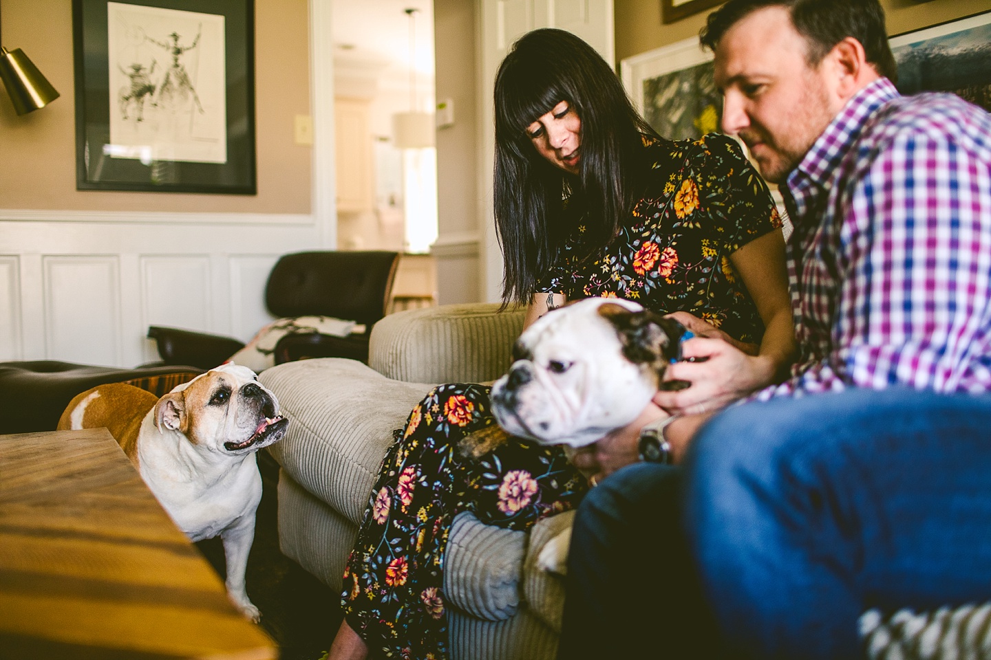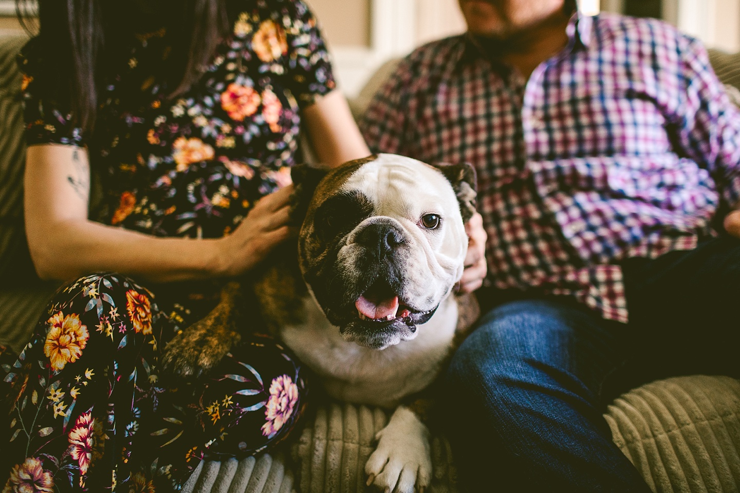 This maternity session had all the things we want out of any session: a Laura Palmer meanwhile hands tattoo, a David Lynch shrine, two English bulldogs, and a listening of “Bodhisattva” by Steely Dan. Also, Sarah’s haircut and X-Files discussions. We like them both a whole bunch, even if they didn’t have the world’s two most adorable English bulldogs who have the quintessential protruding jaws that any self-respecting bulldog would have. They also stick their legs out completely straight and have a bunch of face-rolls (the dogs… not Sarah and Chris) and their names are Seamus and Sasquatch. The point of this session was to document Sarah’s pregnancy and her and Chris’s life together with the pups before the arrival of baby boy in February, and we happily did just that in their wonderful home. Seamus is also getting up there in bulldog years so it was important to photograph his squishy face (he is the lighter, tanner bulldog). Sasquatch is his newer brother who was a gift to Chris on their wedding day (cutest squishiest gift ever).