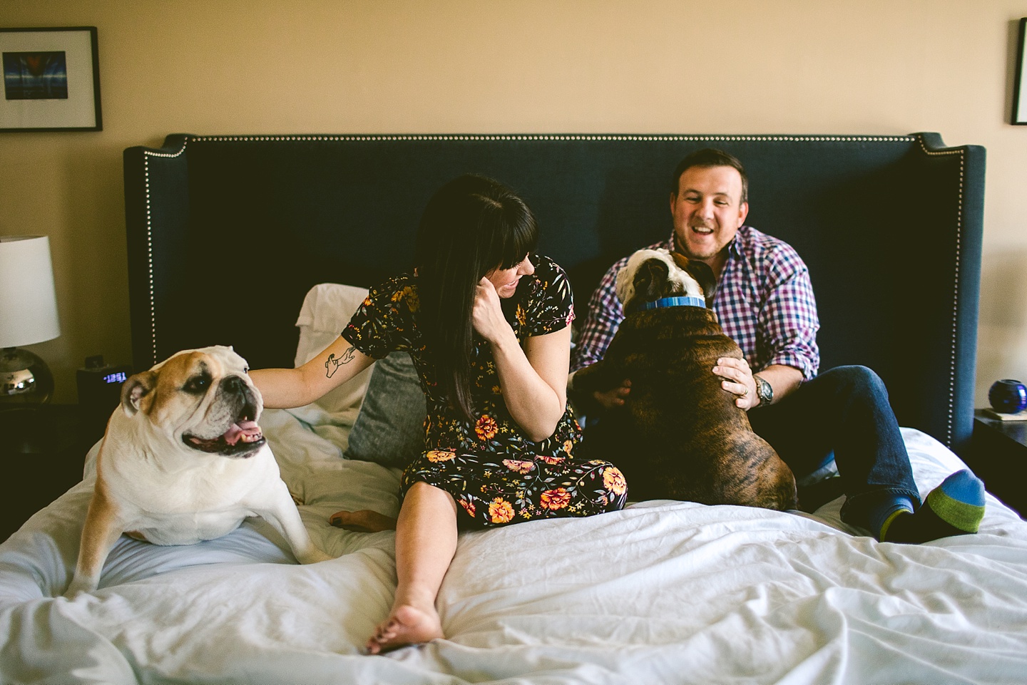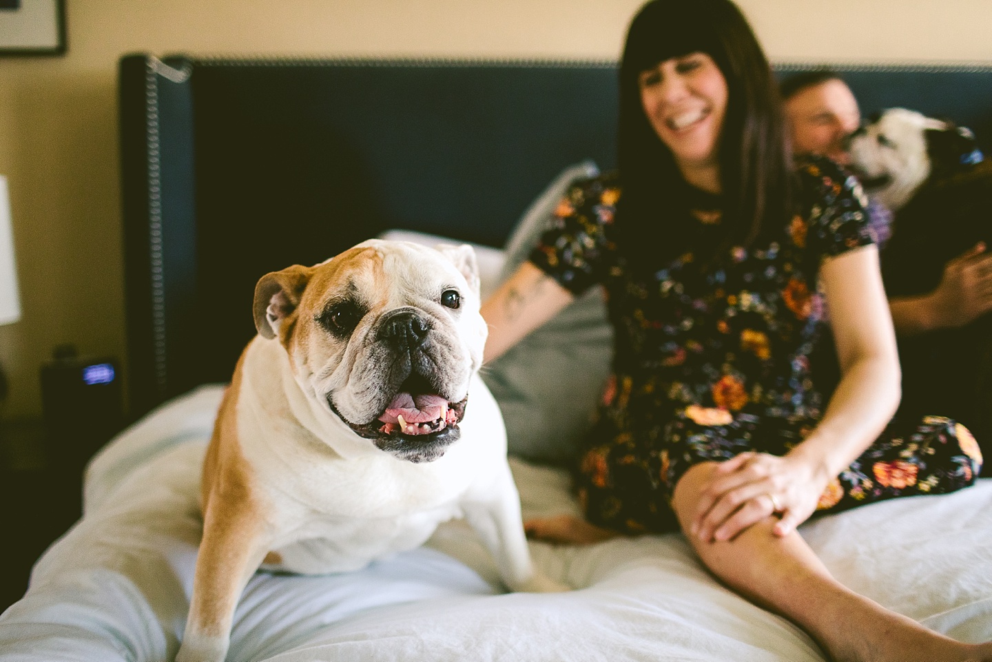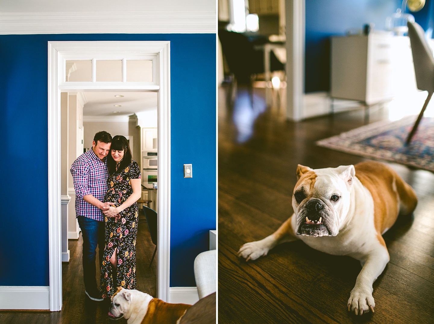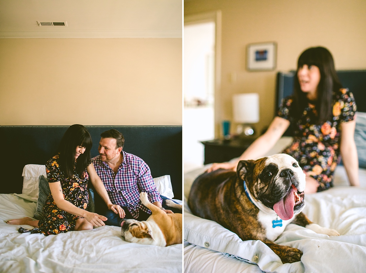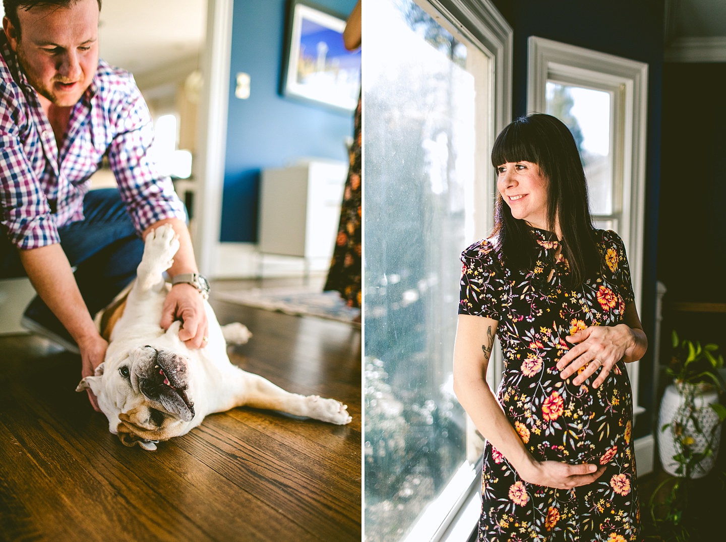 This maternity session had all the things we want out of any session: a Laura Palmer meanwhile hands tattoo, a David Lynch shrine, two English bulldogs, and a listening of “Bodhisattva” by Steely Dan. Also, Sarah’s haircut and X-Files discussions. We like them both a whole bunch, even if they didn’t have the world’s two most adorable English bulldogs who have the quintessential protruding jaws that any self-respecting bulldog would have. They also stick their legs out completely straight and have a bunch of face-rolls (the dogs… not Sarah and Chris) and their names are Seamus and Sasquatch. The point of this session was to document Sarah’s pregnancy and her and Chris’s life together with the pups before the arrival of baby boy in February, and we happily did just that in their wonderful home. Seamus is also getting up there in bulldog years so it was important to photograph his squishy face (he is the lighter, tanner bulldog). Sasquatch is his newer brother who was a gift to Chris on their wedding day (cutest squishiest gift ever).