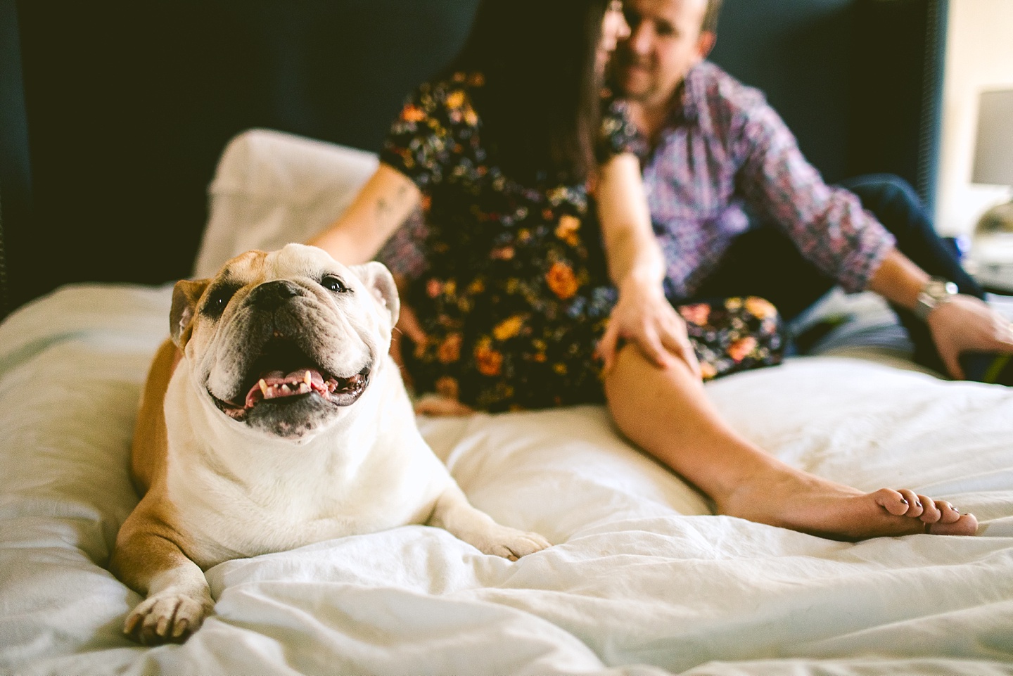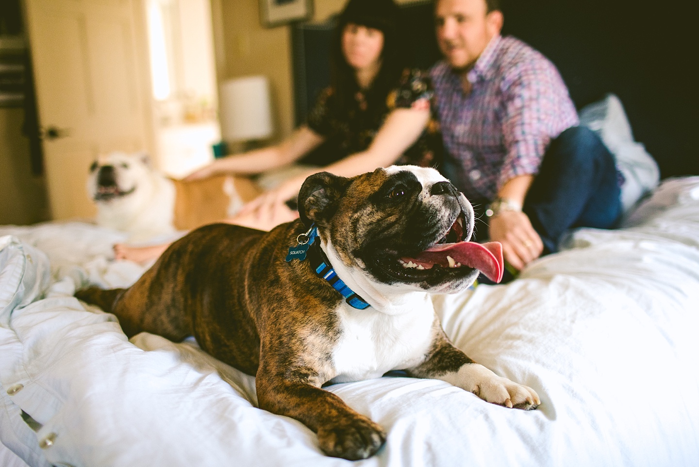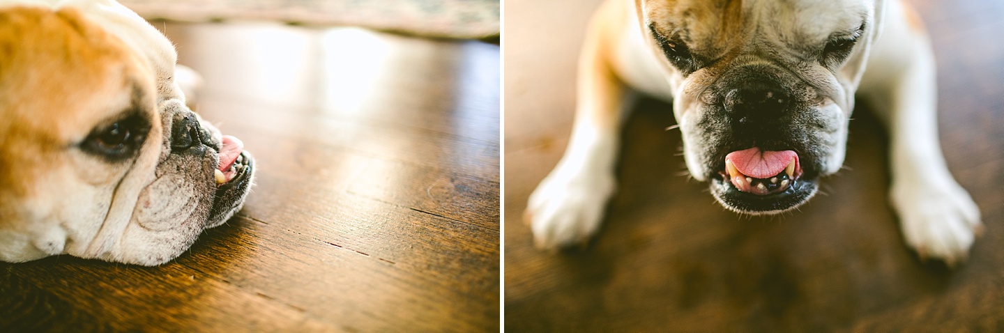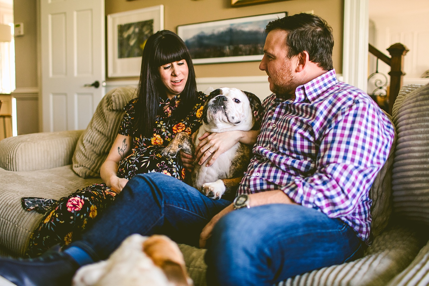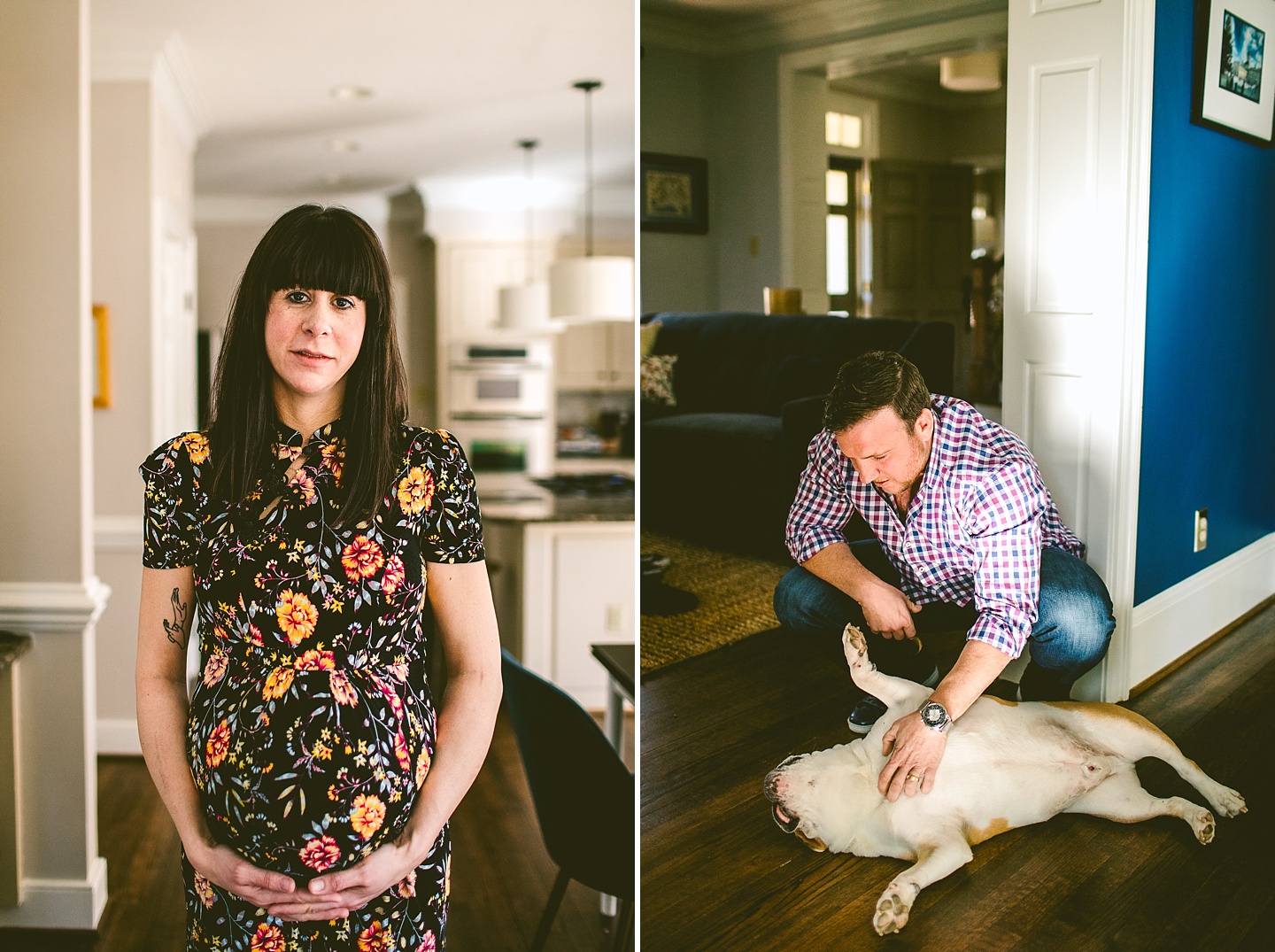 This maternity session had all the things we want out of any session: a Laura Palmer meanwhile hands tattoo, a David Lynch shrine, two English bulldogs, and a listening of “Bodhisattva” by Steely Dan. Also, Sarah’s haircut and X-Files discussions. We like them both a whole bunch, even if they didn’t have the world’s two most adorable English bulldogs who have the quintessential protruding jaws that any self-respecting bulldog would have. They also stick their legs out completely straight and have a bunch of face-rolls (the dogs… not Sarah and Chris) and their names are Seamus and Sasquatch. The point of this session was to document Sarah’s pregnancy and her and Chris’s life together with the pups before the arrival of baby boy in February, and we happily did just that in their wonderful home. Seamus is also getting up there in bulldog years so it was important to photograph his squishy face (he is the lighter, tanner bulldog). Sasquatch is his newer brother who was a gift to Chris on their wedding day (cutest squishiest gift ever).