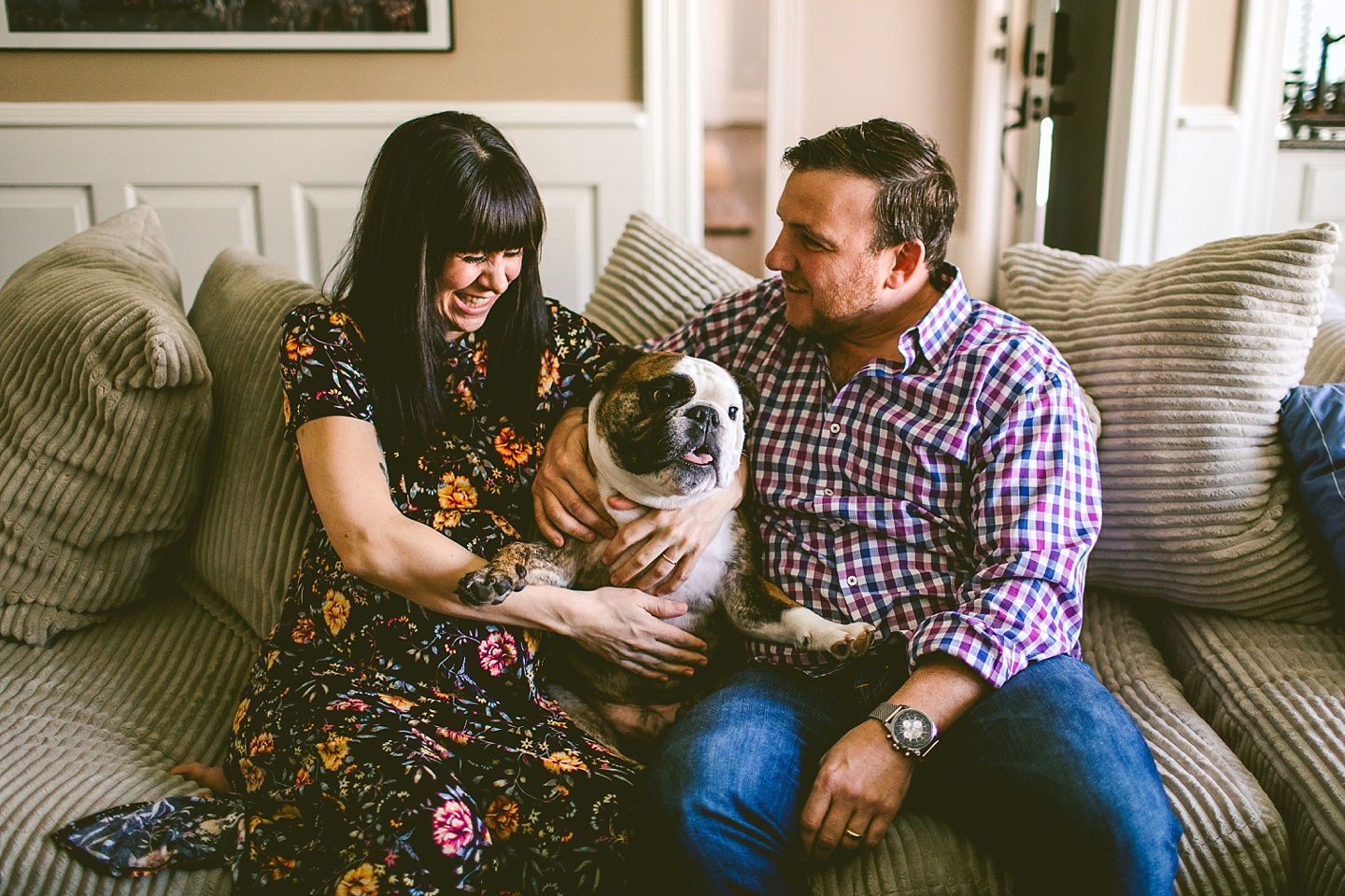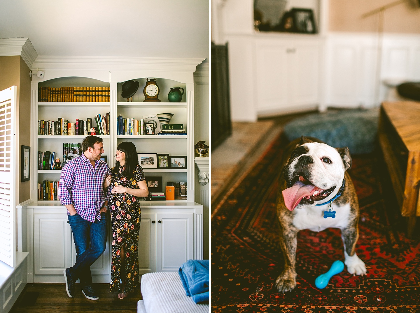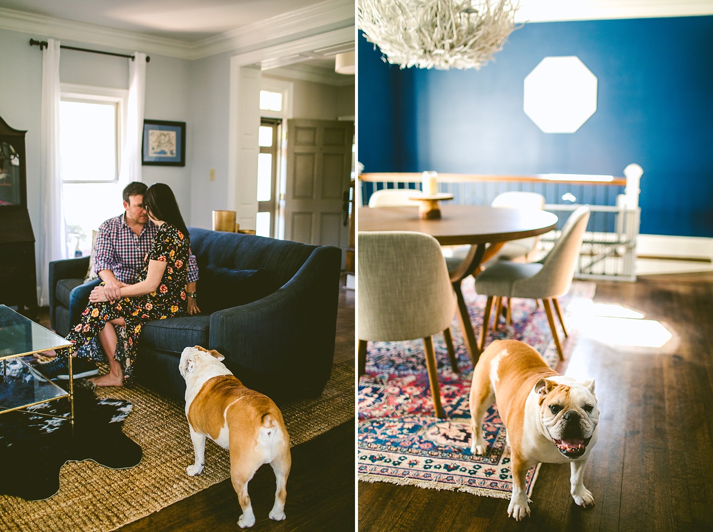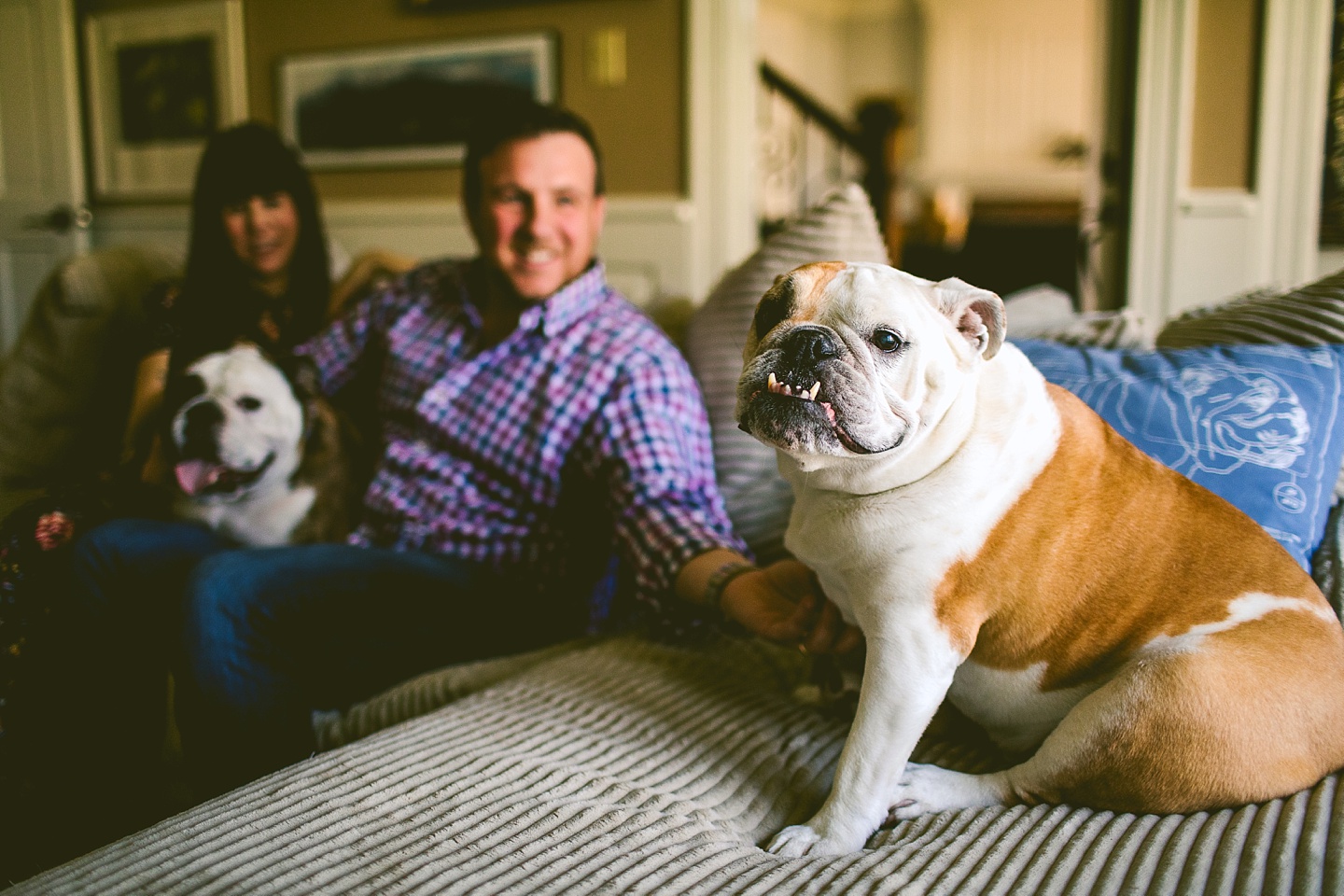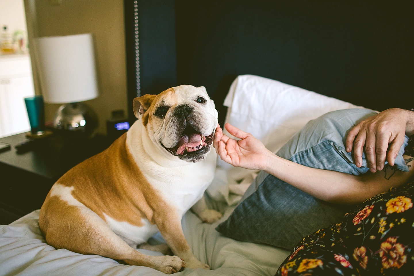 This maternity session had all the things we want out of any session: a Laura Palmer meanwhile hands tattoo, a David Lynch shrine, two English bulldogs, and a listening of “Bodhisattva” by Steely Dan. Also, Sarah’s haircut and X-Files discussions. We like them both a whole bunch, even if they didn’t have the world’s two most adorable English bulldogs who have the quintessential protruding jaws that any self-respecting bulldog would have. They also stick their legs out completely straight and have a bunch of face-rolls (the dogs… not Sarah and Chris) and their names are Seamus and Sasquatch. The point of this session was to document Sarah’s pregnancy and her and Chris’s life together with the pups before the arrival of baby boy in February, and we happily did just that in their wonderful home. Seamus is also getting up there in bulldog years so it was important to photograph his squishy face (he is the lighter, tanner bulldog). Sasquatch is his newer brother who was a gift to Chris on their wedding day (cutest squishiest gift ever).