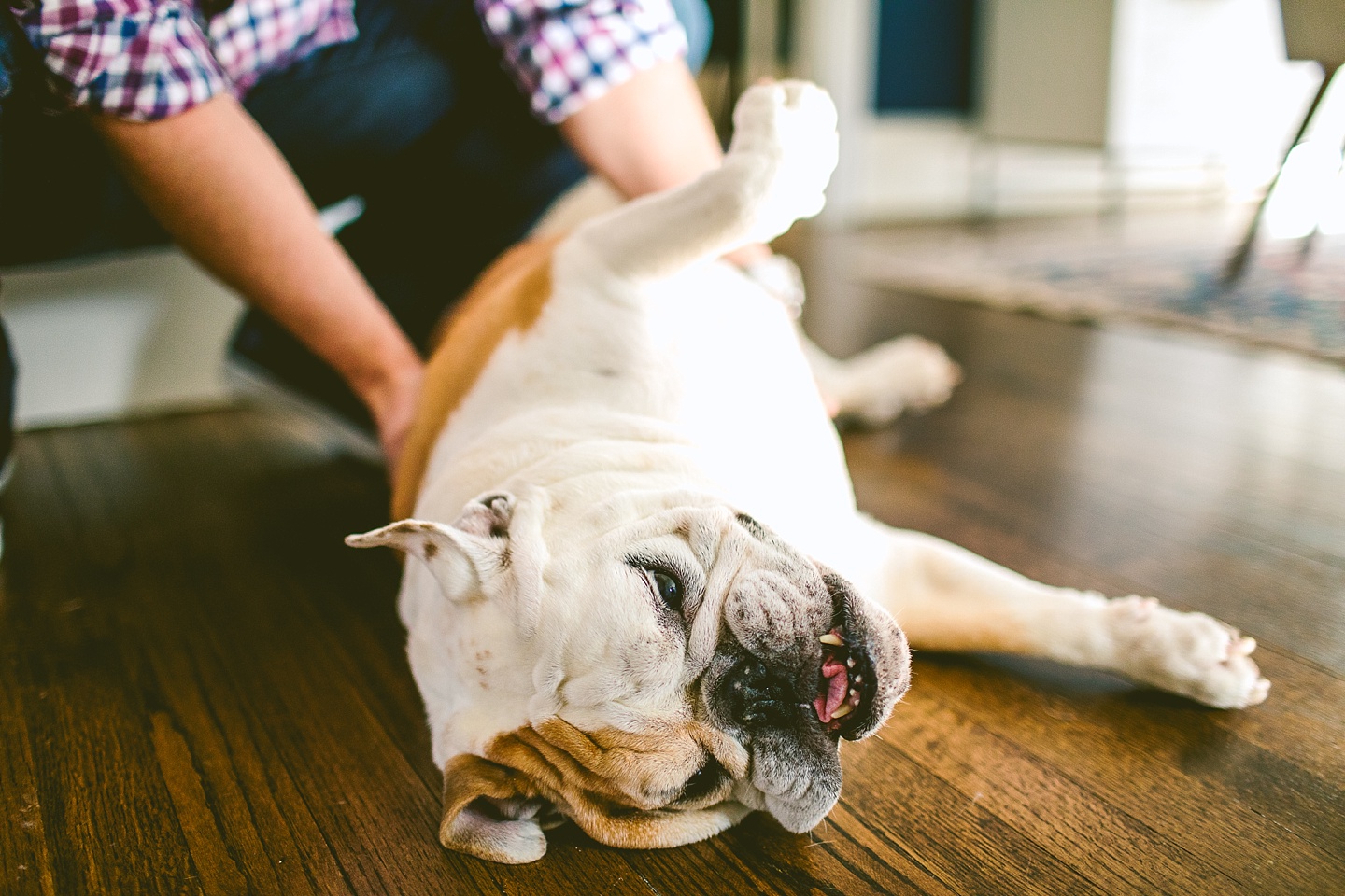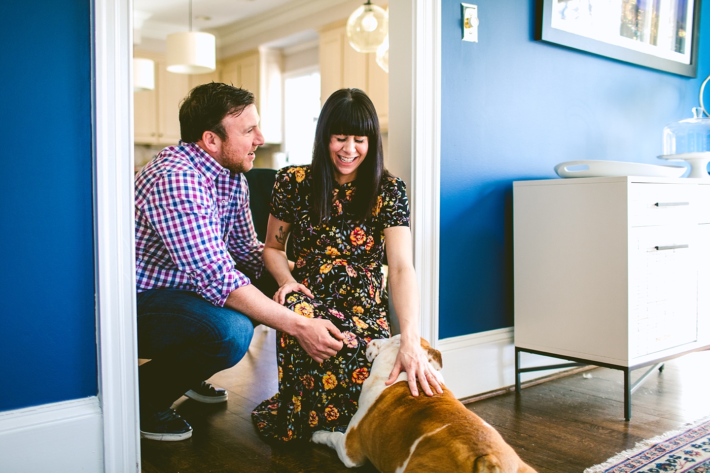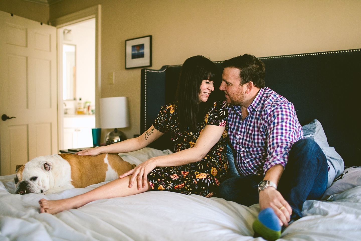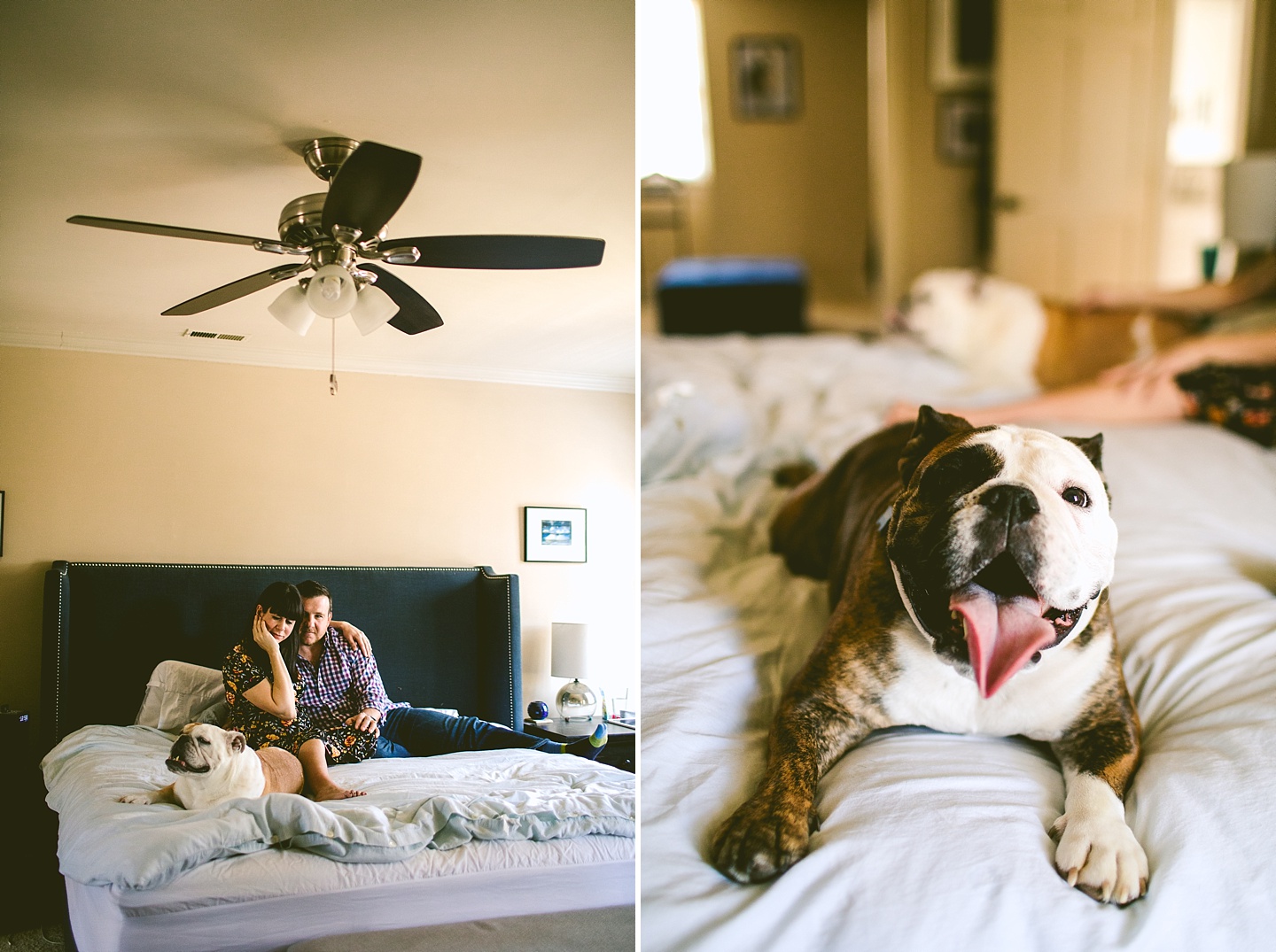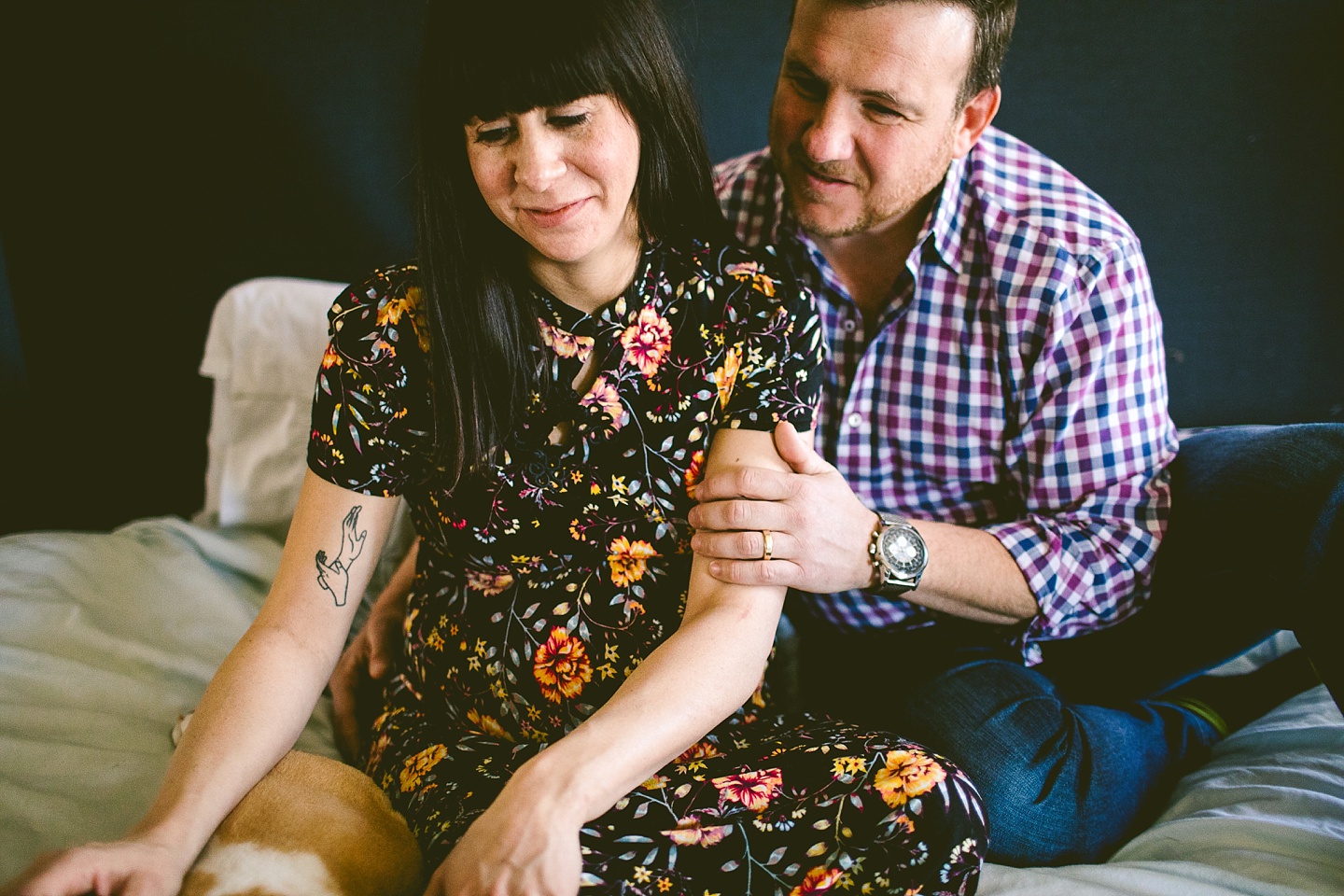 This maternity session had all the things we want out of any session: a Laura Palmer meanwhile hands tattoo, a David Lynch shrine, two English bulldogs, and a listening of “Bodhisattva” by Steely Dan. Also, Sarah’s haircut and X-Files discussions. We like them both a whole bunch, even if they didn’t have the world’s two most adorable English bulldogs who have the quintessential protruding jaws that any self-respecting bulldog would have. They also stick their legs out completely straight and have a bunch of face-rolls (the dogs… not Sarah and Chris) and their names are Seamus and Sasquatch. The point of this session was to document Sarah’s pregnancy and her and Chris’s life together with the pups before the arrival of baby boy in February, and we happily did just that in their wonderful home. Seamus is also getting up there in bulldog years so it was important to photograph his squishy face (he is the lighter, tanner bulldog). Sasquatch is his newer brother who was a gift to Chris on their wedding day (cutest squishiest gift ever).