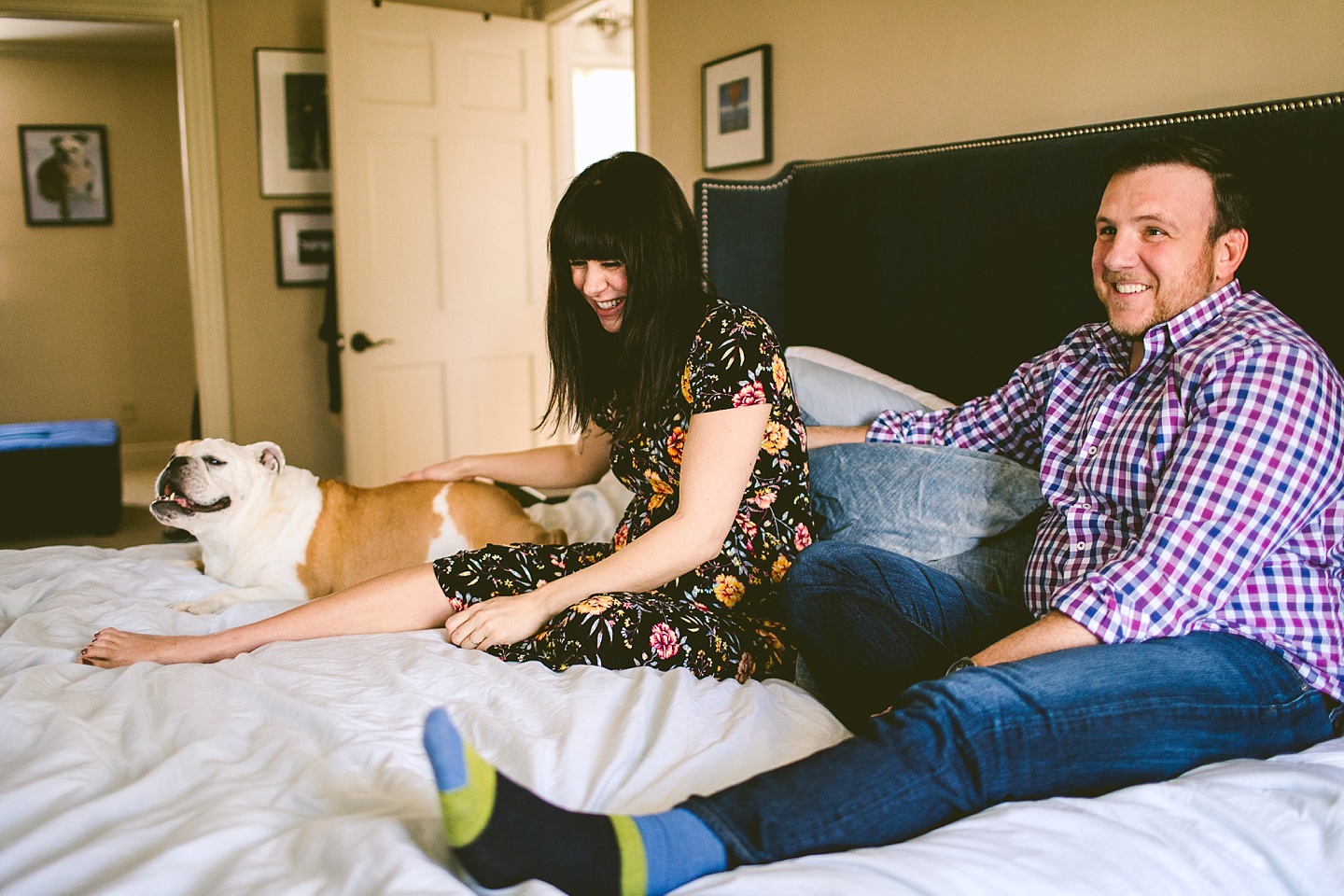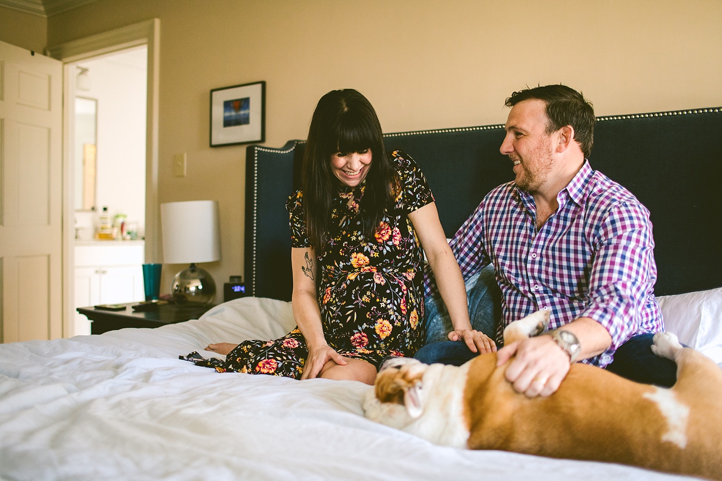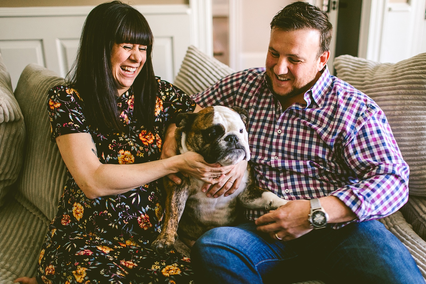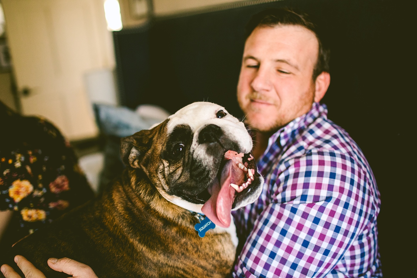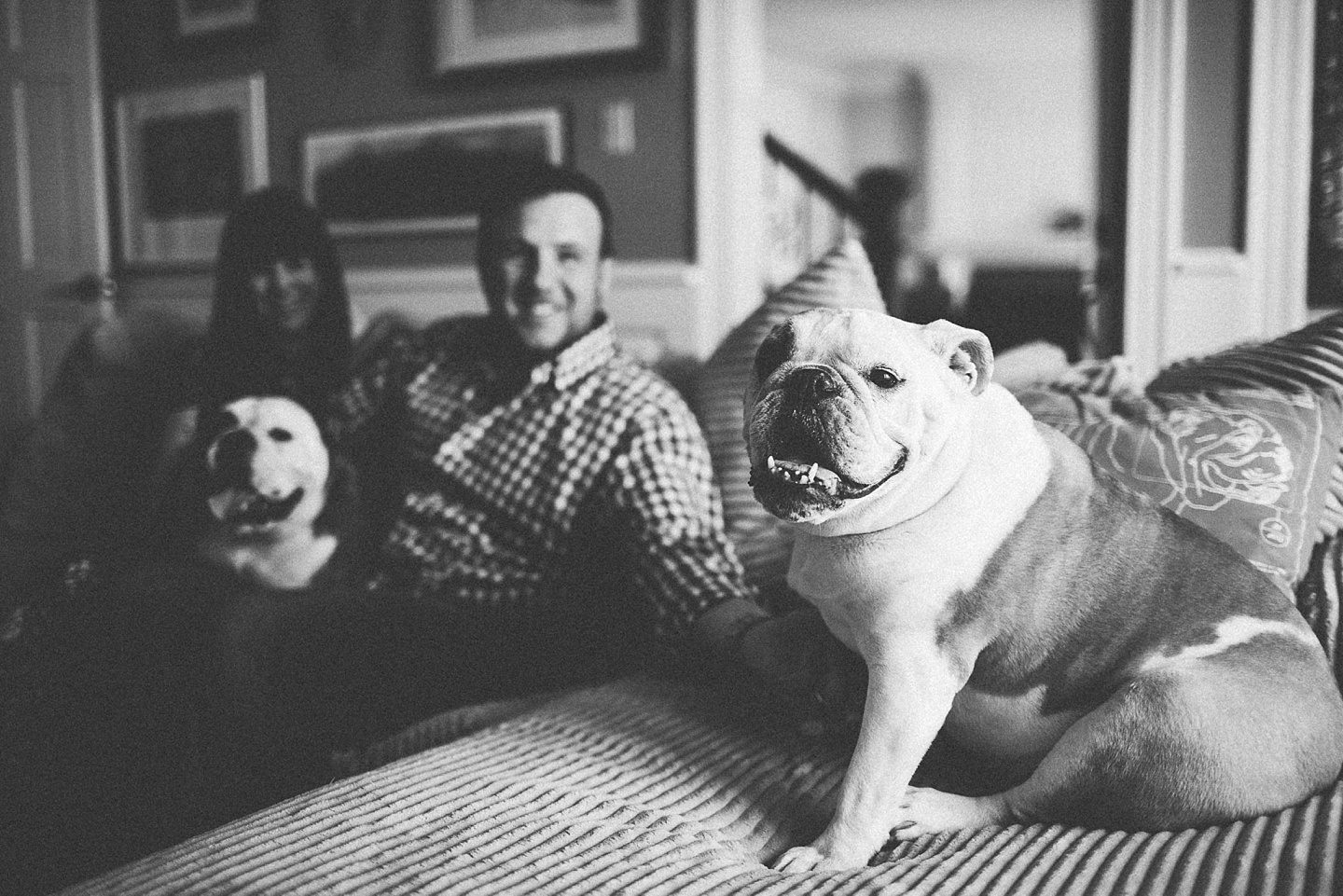 This maternity session had all the things we want out of any session: a Laura Palmer meanwhile hands tattoo, a David Lynch shrine, two English bulldogs, and a listening of “Bodhisattva” by Steely Dan. Also, Sarah’s haircut and X-Files discussions. We like them both a whole bunch, even if they didn’t have the world’s two most adorable English bulldogs who have the quintessential protruding jaws that any self-respecting bulldog would have. They also stick their legs out completely straight and have a bunch of face-rolls (the dogs… not Sarah and Chris) and their names are Seamus and Sasquatch. The point of this session was to document Sarah’s pregnancy and her and Chris’s life together with the pups before the arrival of baby boy in February, and we happily did just that in their wonderful home. Seamus is also getting up there in bulldog years so it was important to photograph his squishy face (he is the lighter, tanner bulldog). Sasquatch is his newer brother who was a gift to Chris on their wedding day (cutest squishiest gift ever).