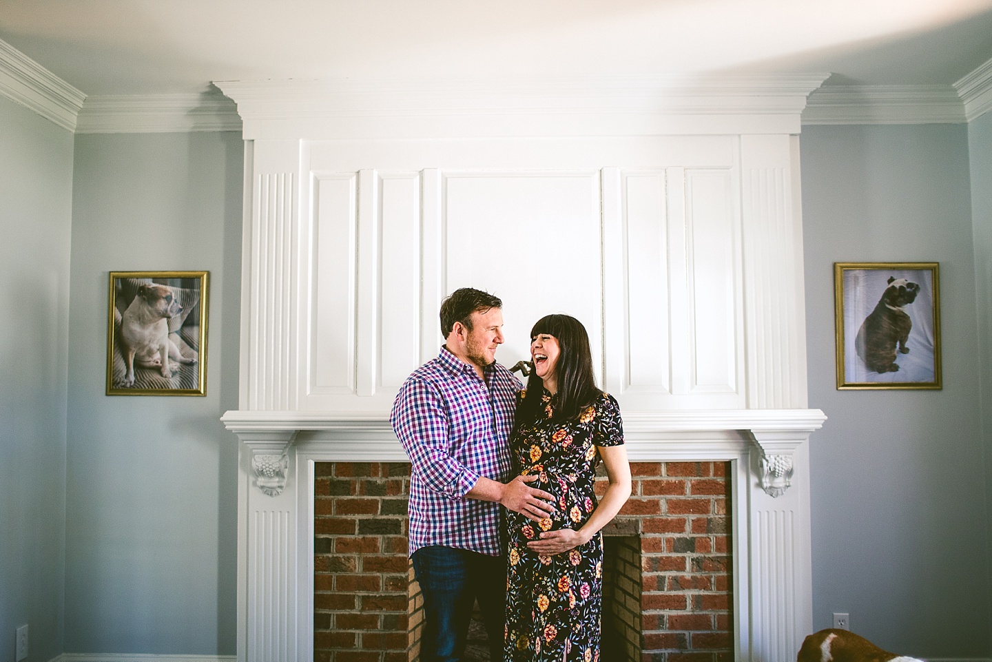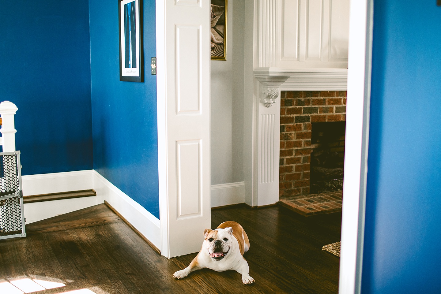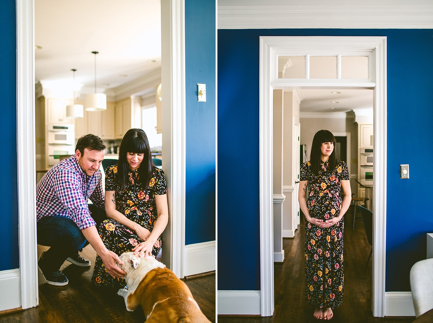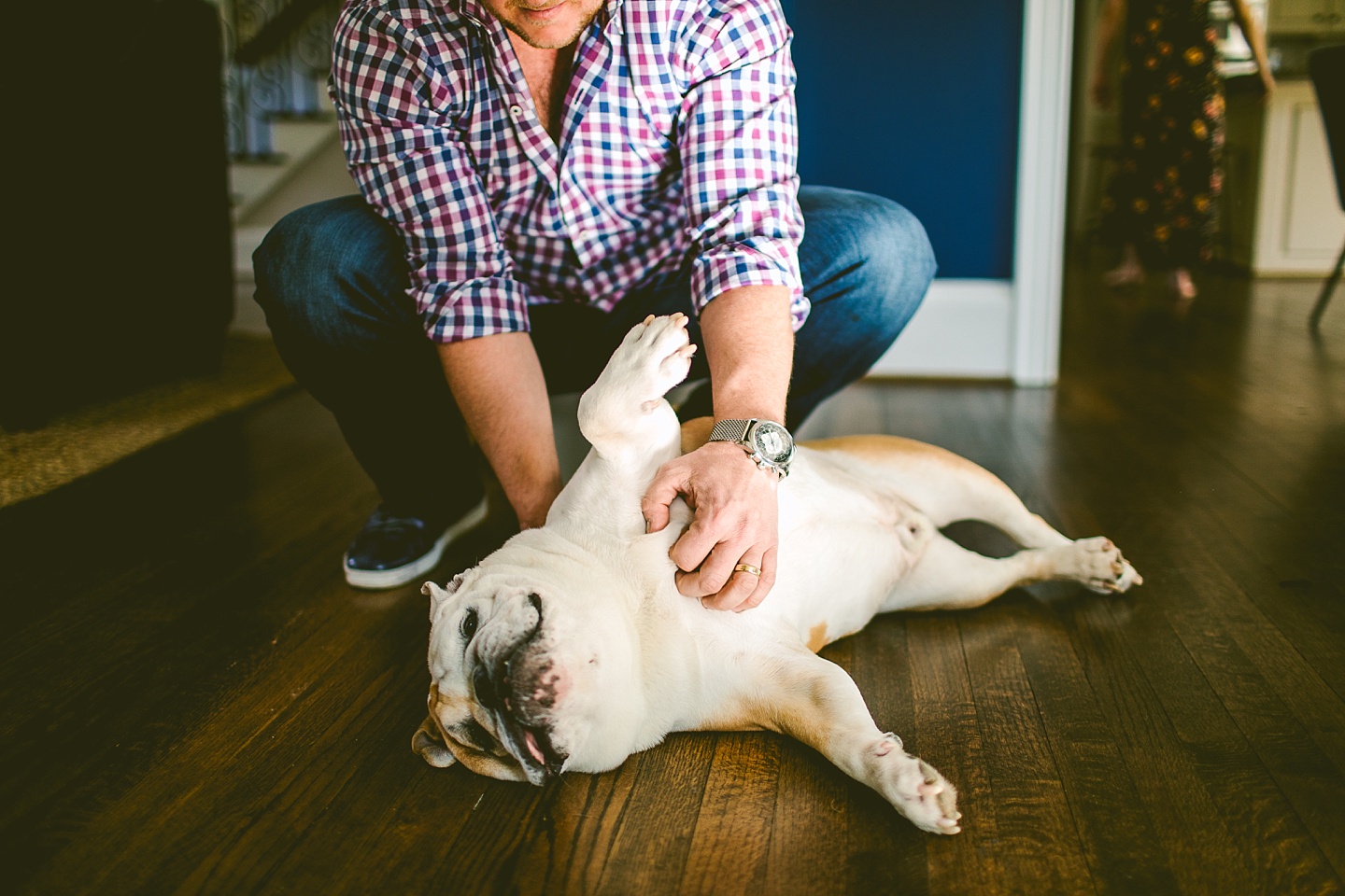 This maternity session had all the things we want out of any session: a Laura Palmer meanwhile hands tattoo, a David Lynch shrine, two English bulldogs, and a listening of “Bodhisattva” by Steely Dan. Also, Sarah’s haircut and X-Files discussions. We like them both a whole bunch, even if they didn’t have the world’s two most adorable English bulldogs who have the quintessential protruding jaws that any self-respecting bulldog would have. They also stick their legs out completely straight and have a bunch of face-rolls (the dogs… not Sarah and Chris) and their names are Seamus and Sasquatch. The point of this session was to document Sarah’s pregnancy and her and Chris’s life together with the pups before the arrival of baby boy in February, and we happily did just that in their wonderful home. Seamus is also getting up there in bulldog years so it was important to photograph his squishy face (he is the lighter, tanner bulldog). Sasquatch is his newer brother who was a gift to Chris on their wedding day (cutest squishiest gift ever).