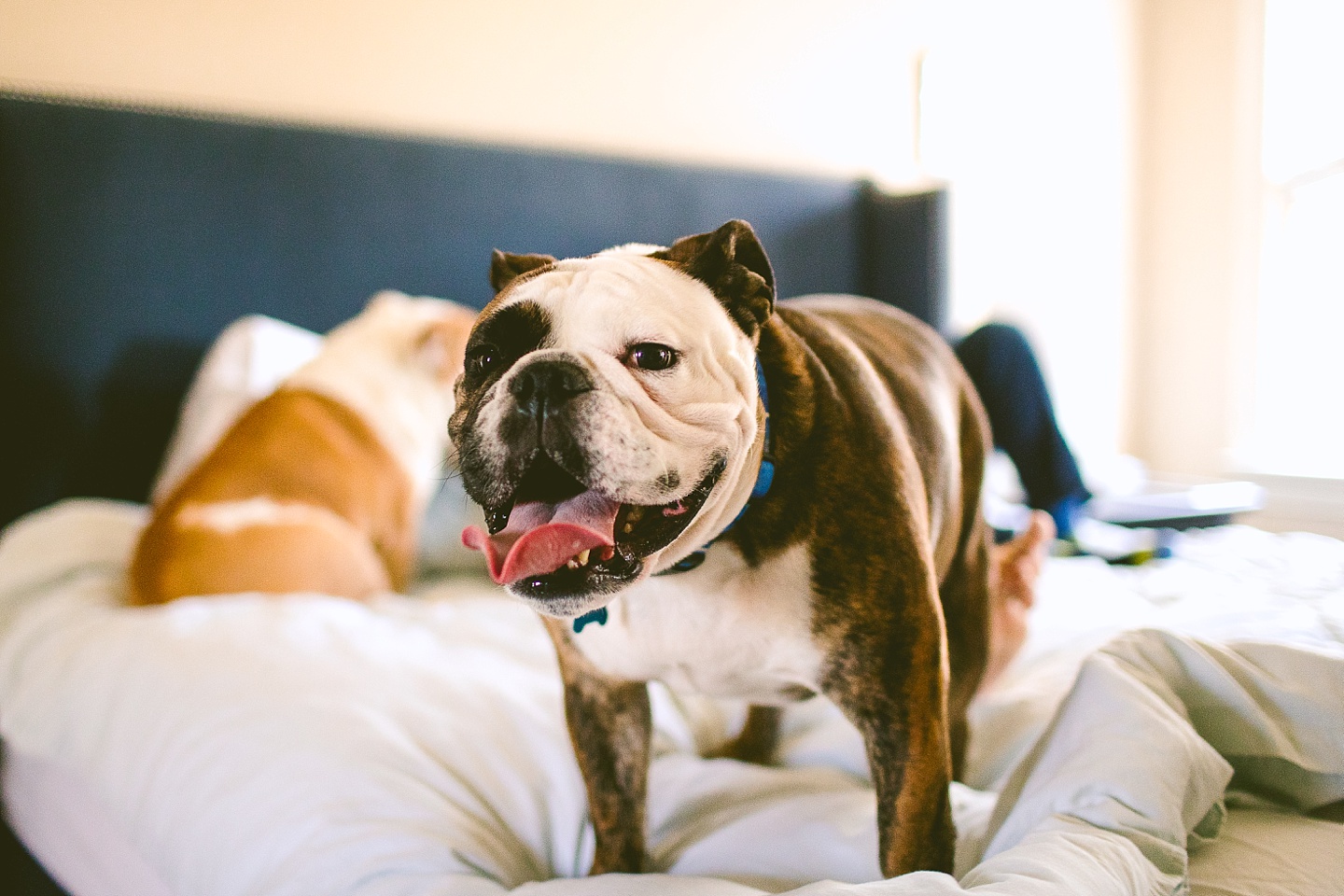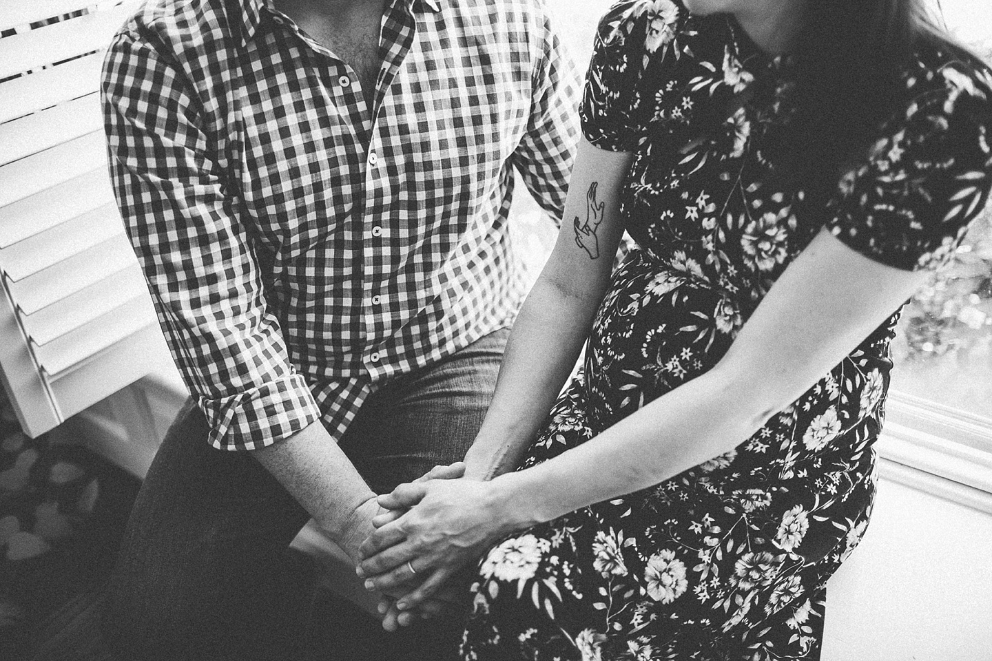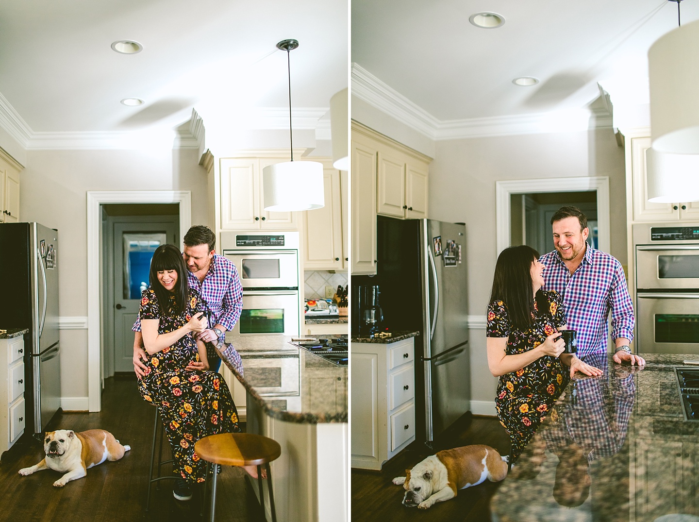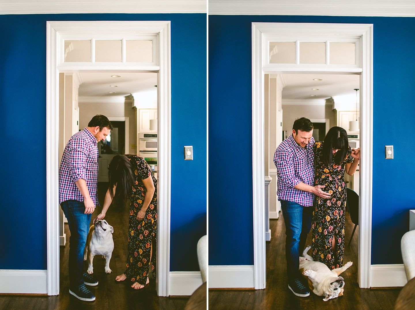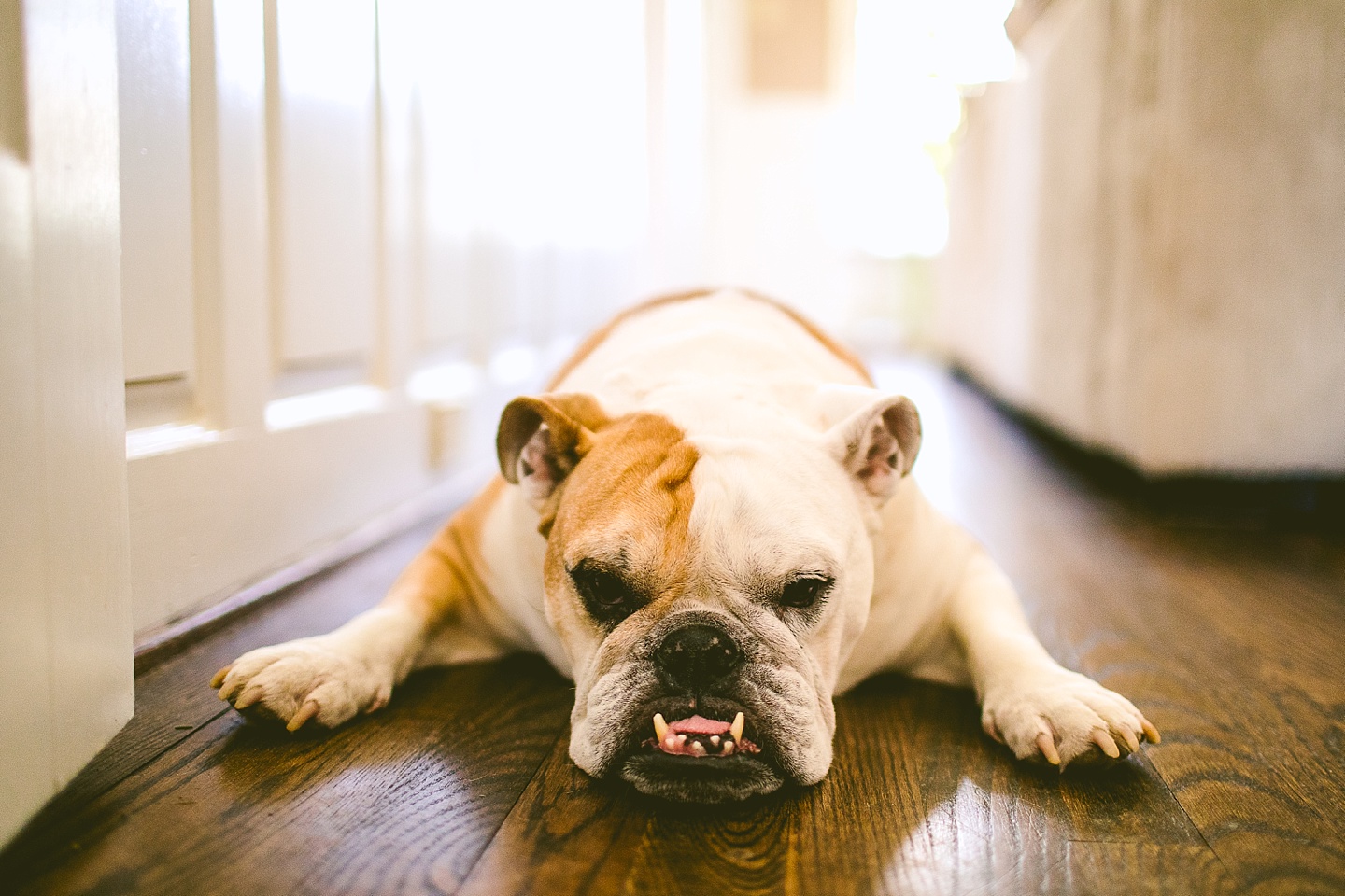 This maternity session had all the things we want out of any session: a Laura Palmer meanwhile hands tattoo, a David Lynch shrine, two English bulldogs, and a listening of “Bodhisattva” by Steely Dan. Also, Sarah’s haircut and X-Files discussions. We like them both a whole bunch, even if they didn’t have the world’s two most adorable English bulldogs who have the quintessential protruding jaws that any self-respecting bulldog would have. They also stick their legs out completely straight and have a bunch of face-rolls (the dogs… not Sarah and Chris) and their names are Seamus and Sasquatch. The point of this session was to document Sarah’s pregnancy and her and Chris’s life together with the pups before the arrival of baby boy in February, and we happily did just that in their wonderful home. Seamus is also getting up there in bulldog years so it was important to photograph his squishy face (he is the lighter, tanner bulldog). Sasquatch is his newer brother who was a gift to Chris on their wedding day (cutest squishiest gift ever).