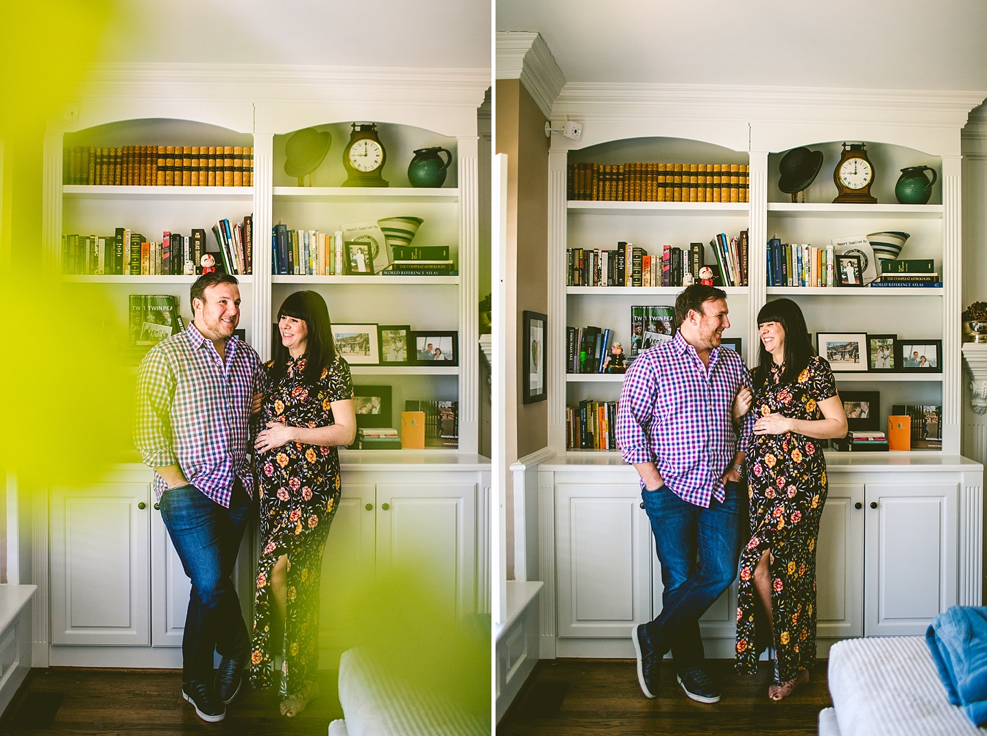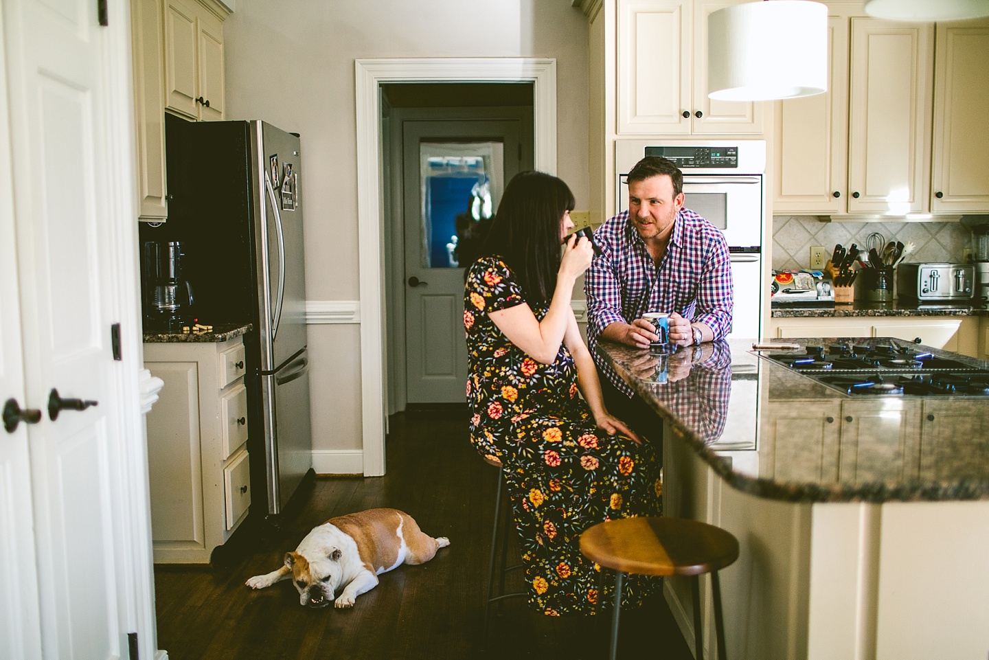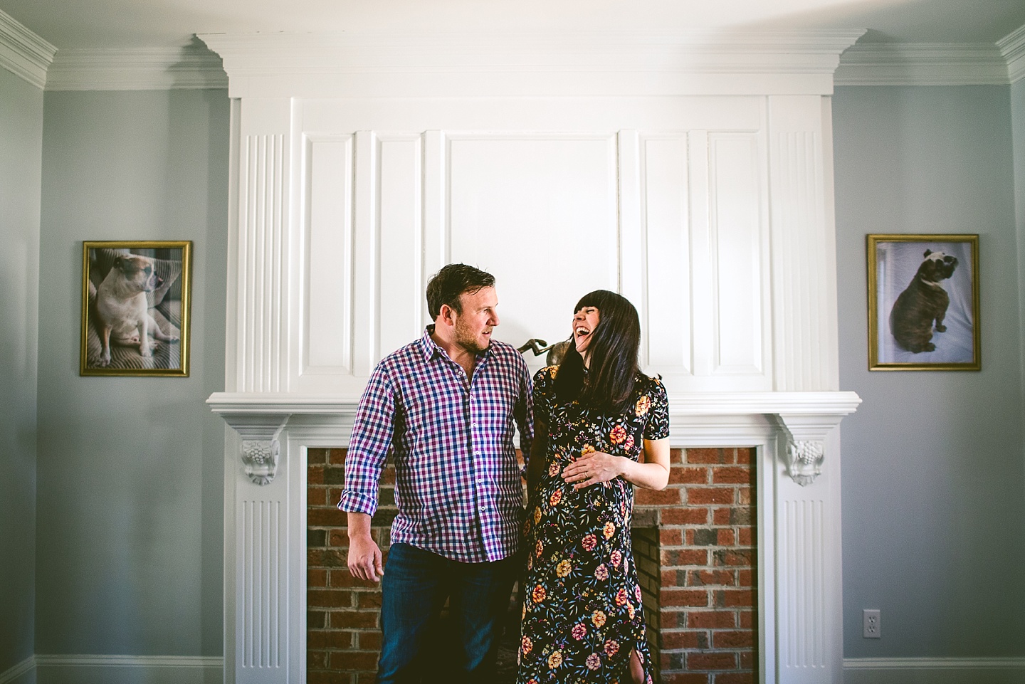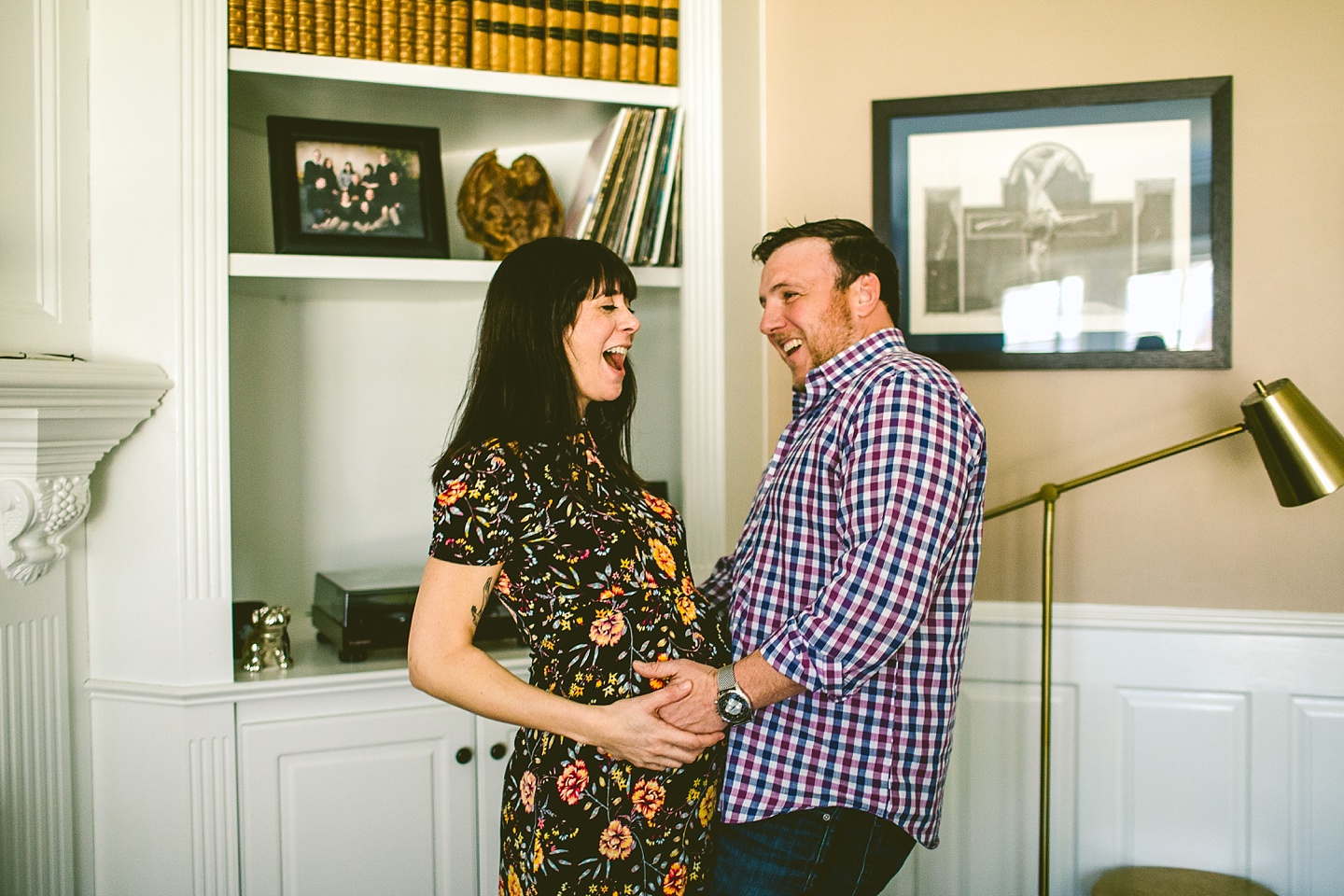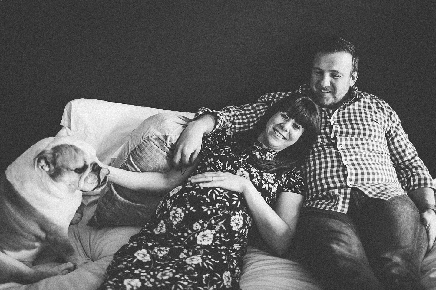 This maternity session had all the things we want out of any session: a Laura Palmer meanwhile hands tattoo, a David Lynch shrine, two English bulldogs, and a listening of “Bodhisattva” by Steely Dan. Also, Sarah’s haircut and X-Files discussions. We like them both a whole bunch, even if they didn’t have the world’s two most adorable English bulldogs who have the quintessential protruding jaws that any self-respecting bulldog would have. They also stick their legs out completely straight and have a bunch of face-rolls (the dogs… not Sarah and Chris) and their names are Seamus and Sasquatch. The point of this session was to document Sarah’s pregnancy and her and Chris’s life together with the pups before the arrival of baby boy in February, and we happily did just that in their wonderful home. Seamus is also getting up there in bulldog years so it was important to photograph his squishy face (he is the lighter, tanner bulldog). Sasquatch is his newer brother who was a gift to Chris on their wedding day (cutest squishiest gift ever).