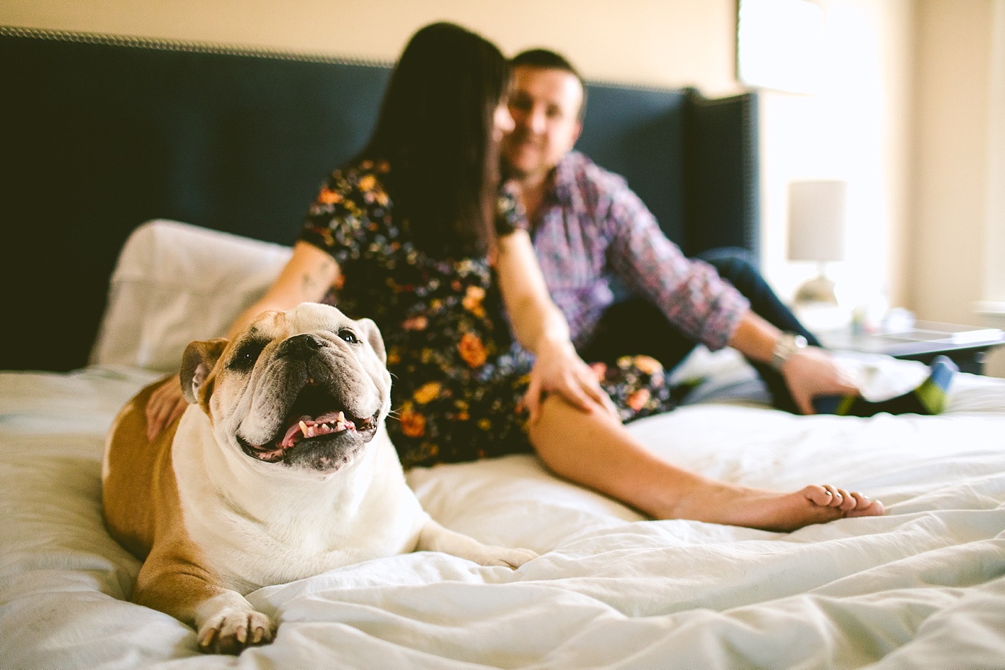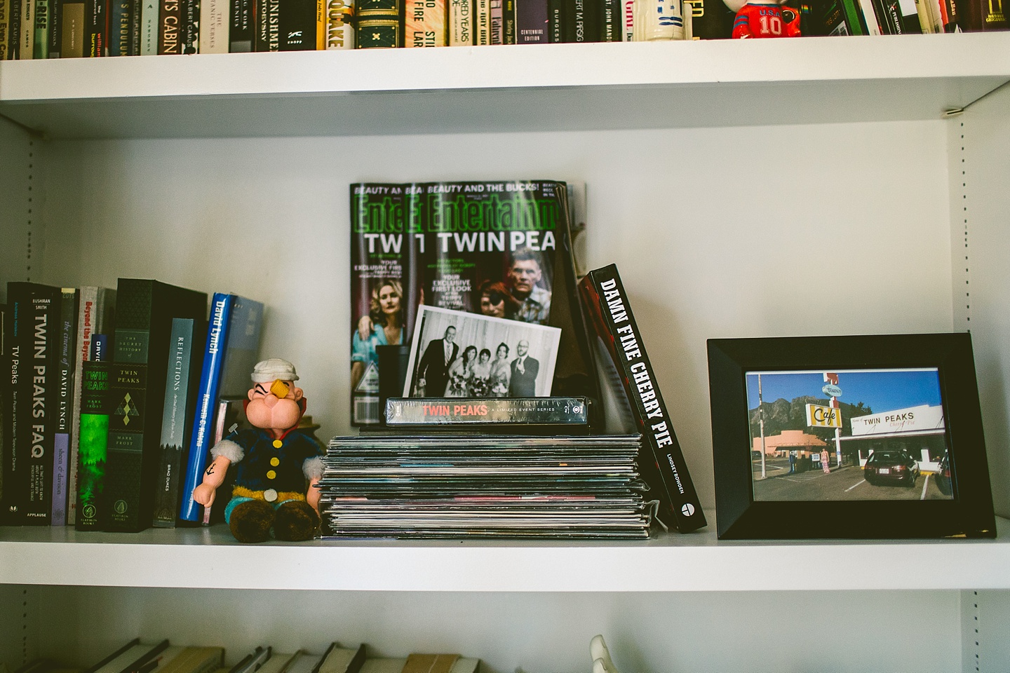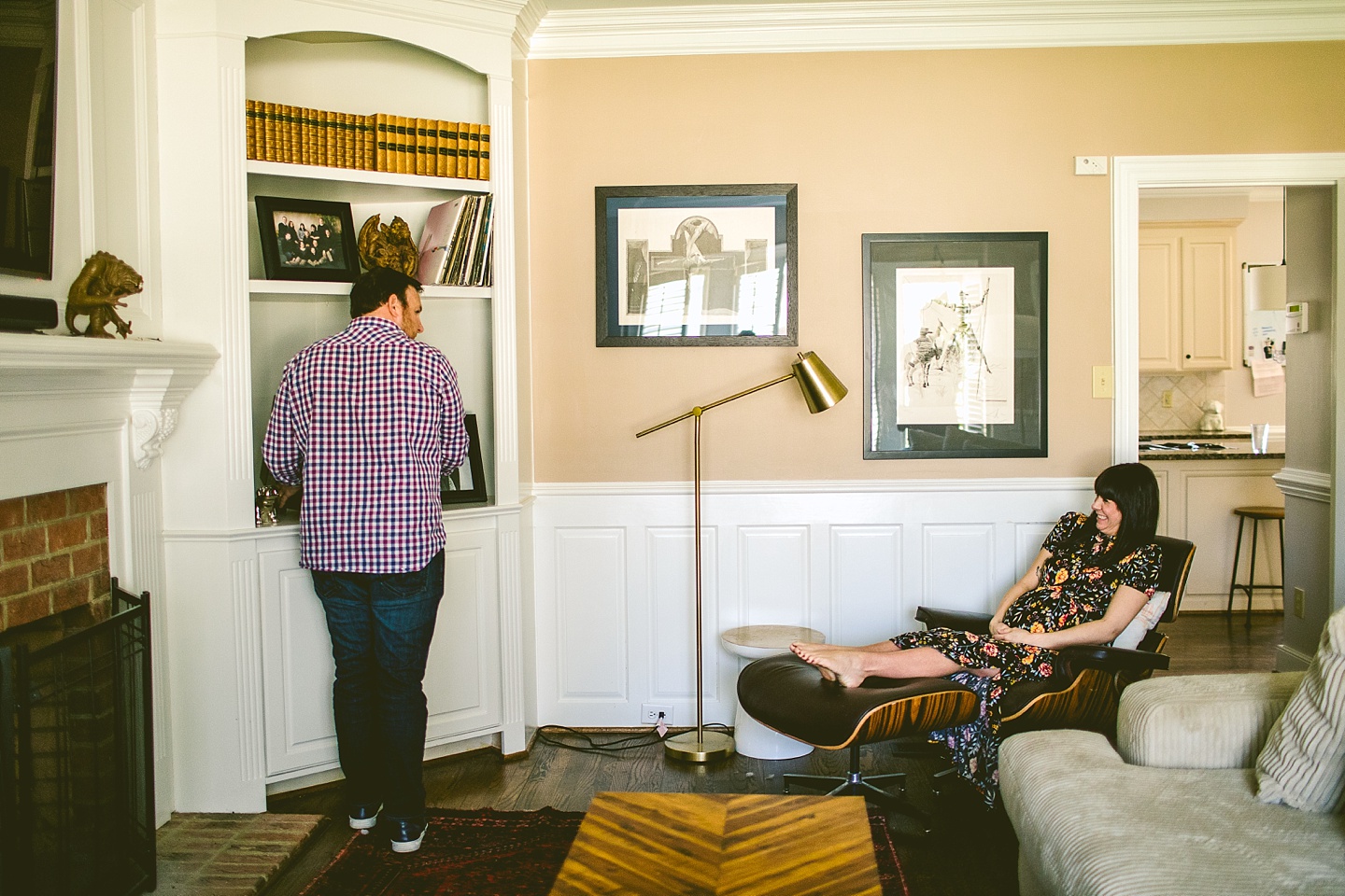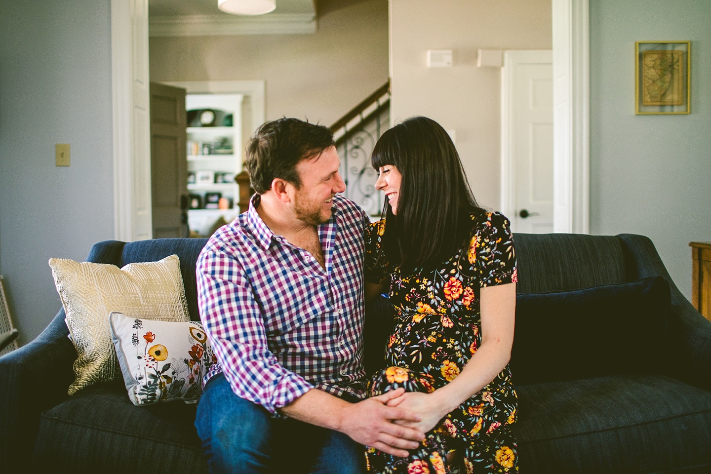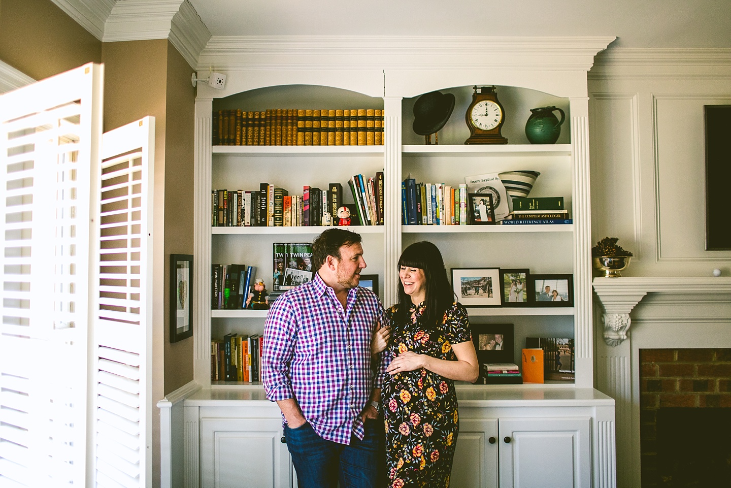 This maternity session had all the things we want out of any session: a Laura Palmer meanwhile hands tattoo, a David Lynch shrine, two English bulldogs, and a listening of “Bodhisattva” by Steely Dan. Also, Sarah’s haircut and X-Files discussions. We like them both a whole bunch, even if they didn’t have the world’s two most adorable English bulldogs who have the quintessential protruding jaws that any self-respecting bulldog would have. They also stick their legs out completely straight and have a bunch of face-rolls (the dogs… not Sarah and Chris) and their names are Seamus and Sasquatch. The point of this session was to document Sarah’s pregnancy and her and Chris’s life together with the pups before the arrival of baby boy in February, and we happily did just that in their wonderful home. Seamus is also getting up there in bulldog years so it was important to photograph his squishy face (he is the lighter, tanner bulldog). Sasquatch is his newer brother who was a gift to Chris on their wedding day (cutest squishiest gift ever).