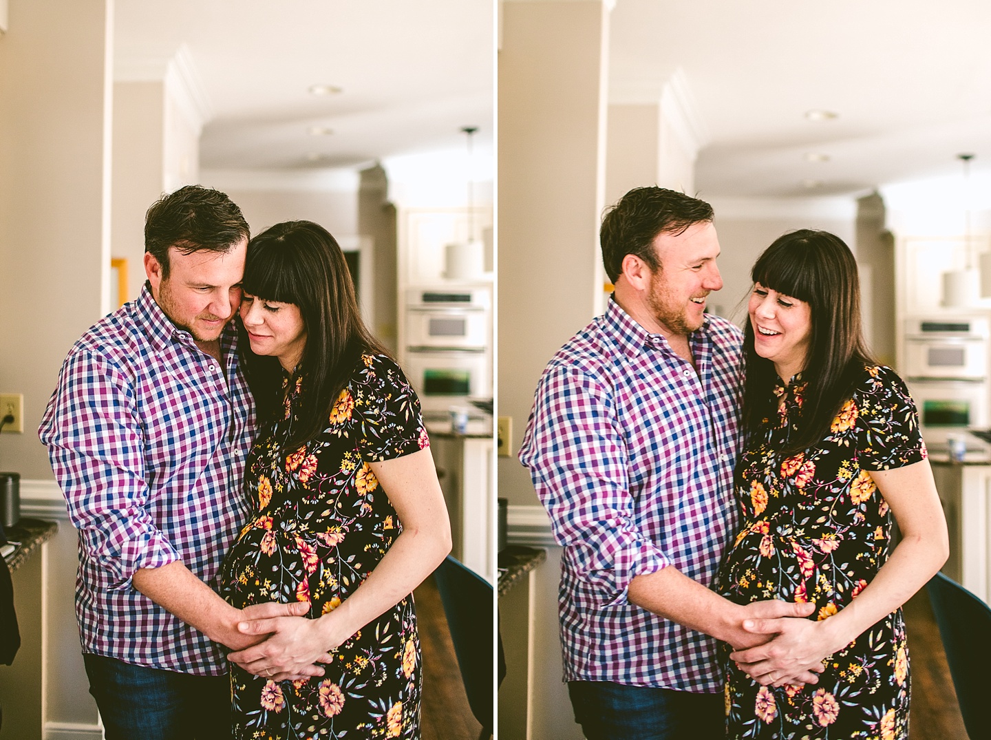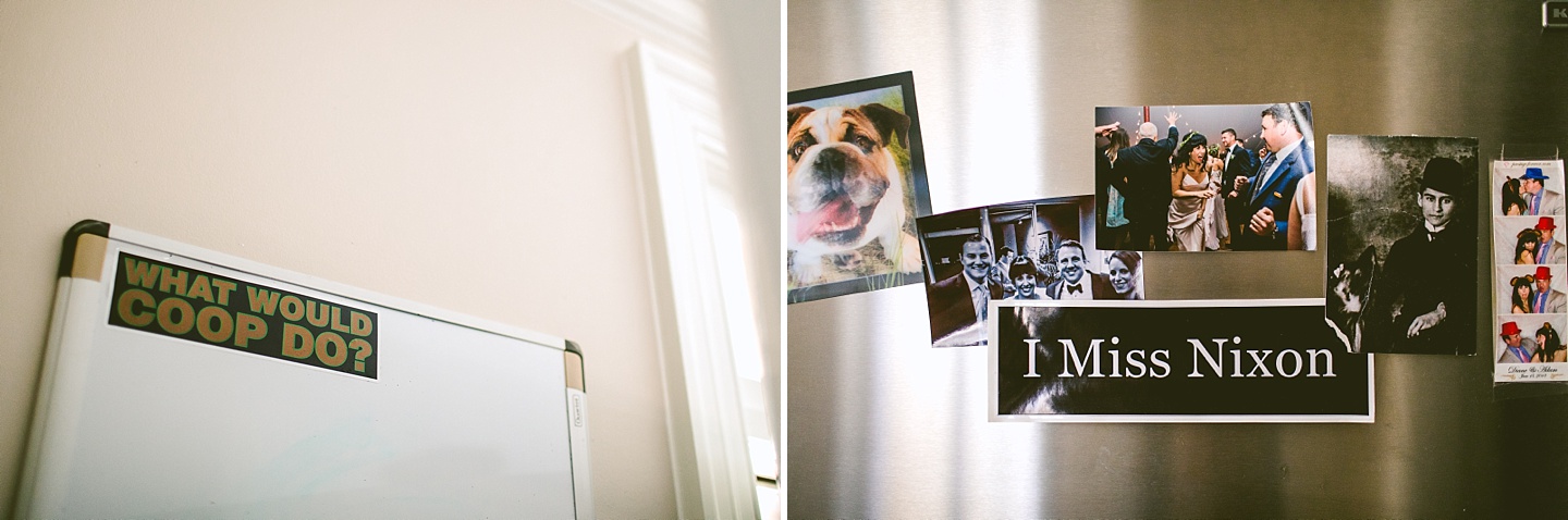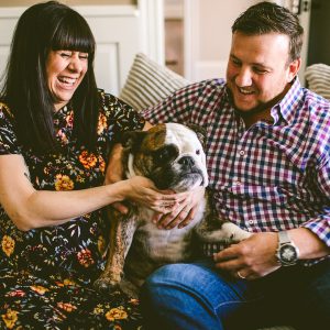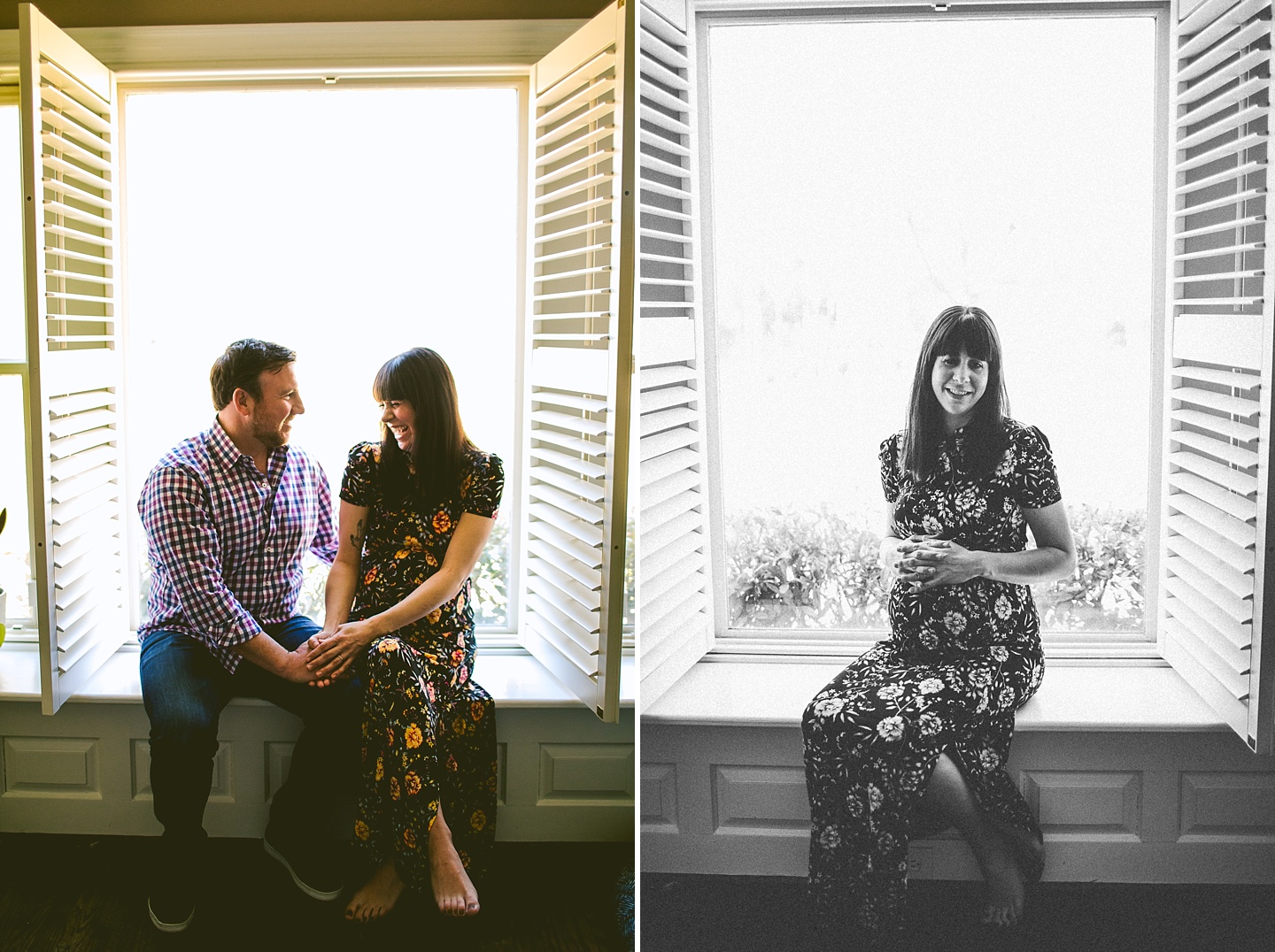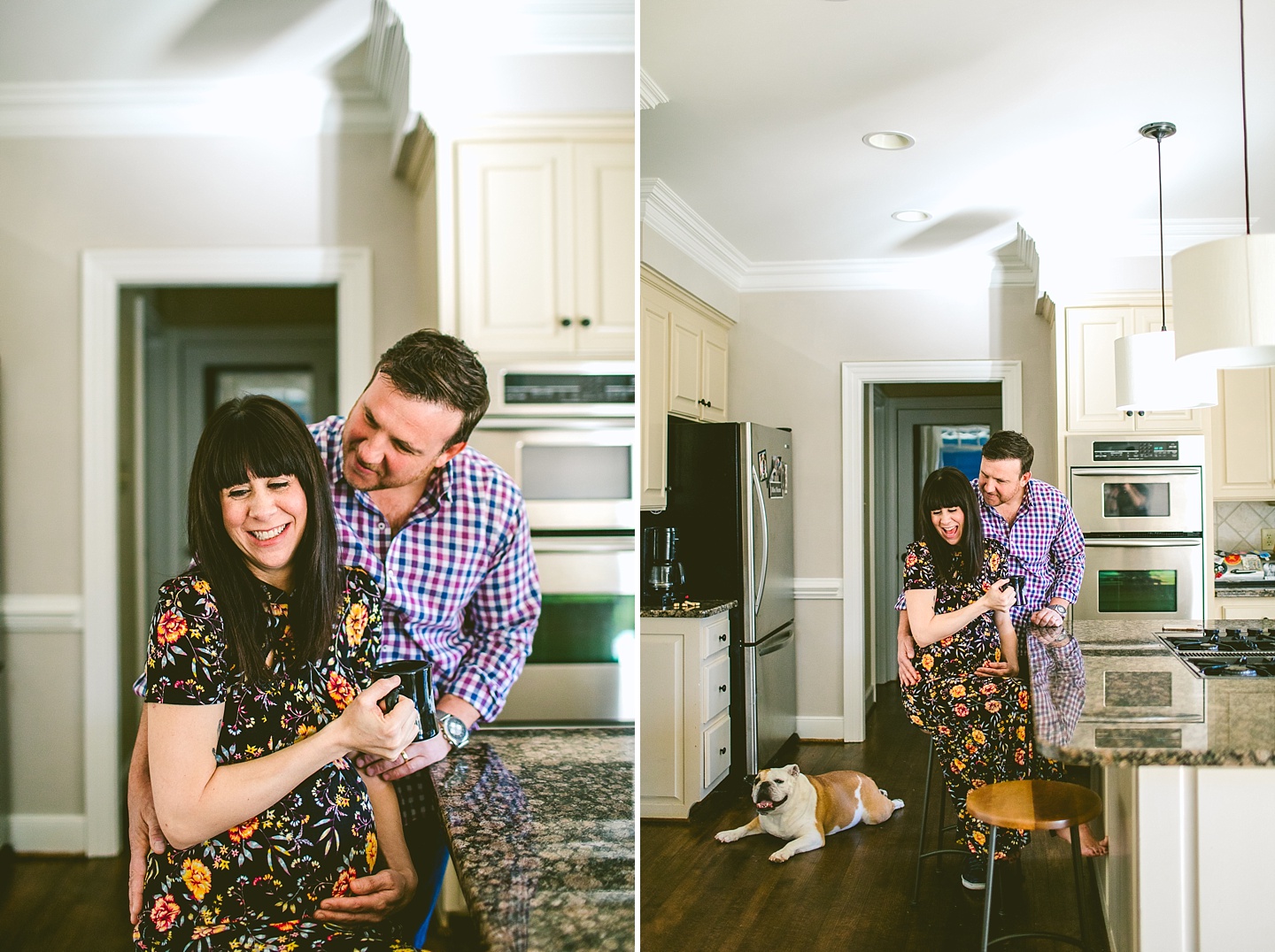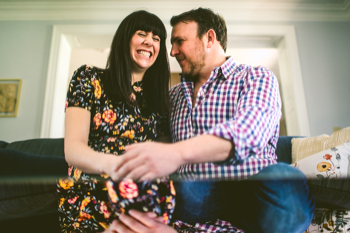 This maternity session had all the things we want out of any session: a Laura Palmer meanwhile hands tattoo, a David Lynch shrine, two English bulldogs, and a listening of “Bodhisattva” by Steely Dan. Also, Sarah’s haircut and X-Files discussions. We like them both a whole bunch, even if they didn’t have the world’s two most adorable English bulldogs who have the quintessential protruding jaws that any self-respecting bulldog would have. They also stick their legs out completely straight and have a bunch of face-rolls (the dogs… not Sarah and Chris) and their names are Seamus and Sasquatch. The point of this session was to document Sarah’s pregnancy and her and Chris’s life together with the pups before the arrival of baby boy in February, and we happily did just that in their wonderful home. Seamus is also getting up there in bulldog years so it was important to photograph his squishy face (he is the lighter, tanner bulldog). Sasquatch is his newer brother who was a gift to Chris on their wedding day (cutest squishiest gift ever).