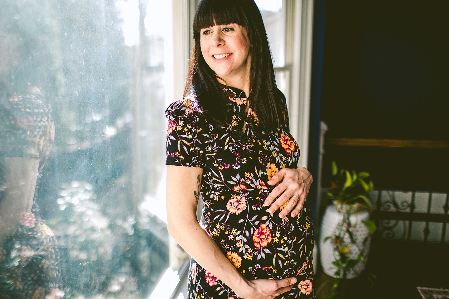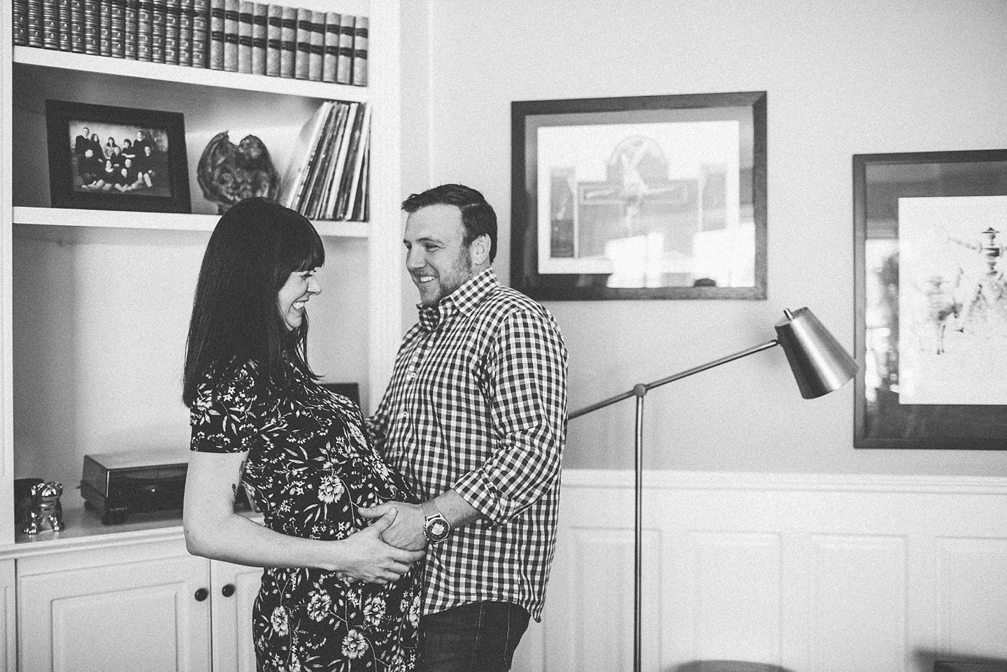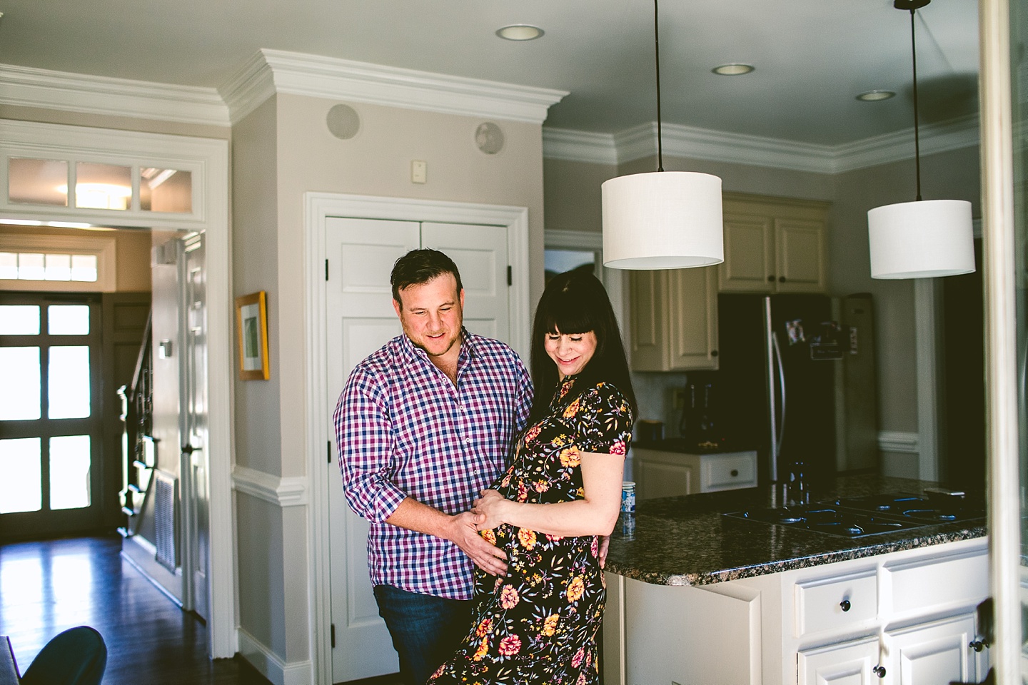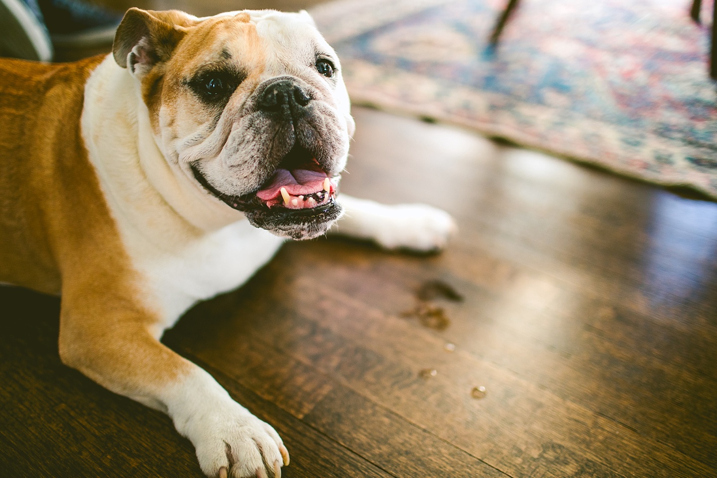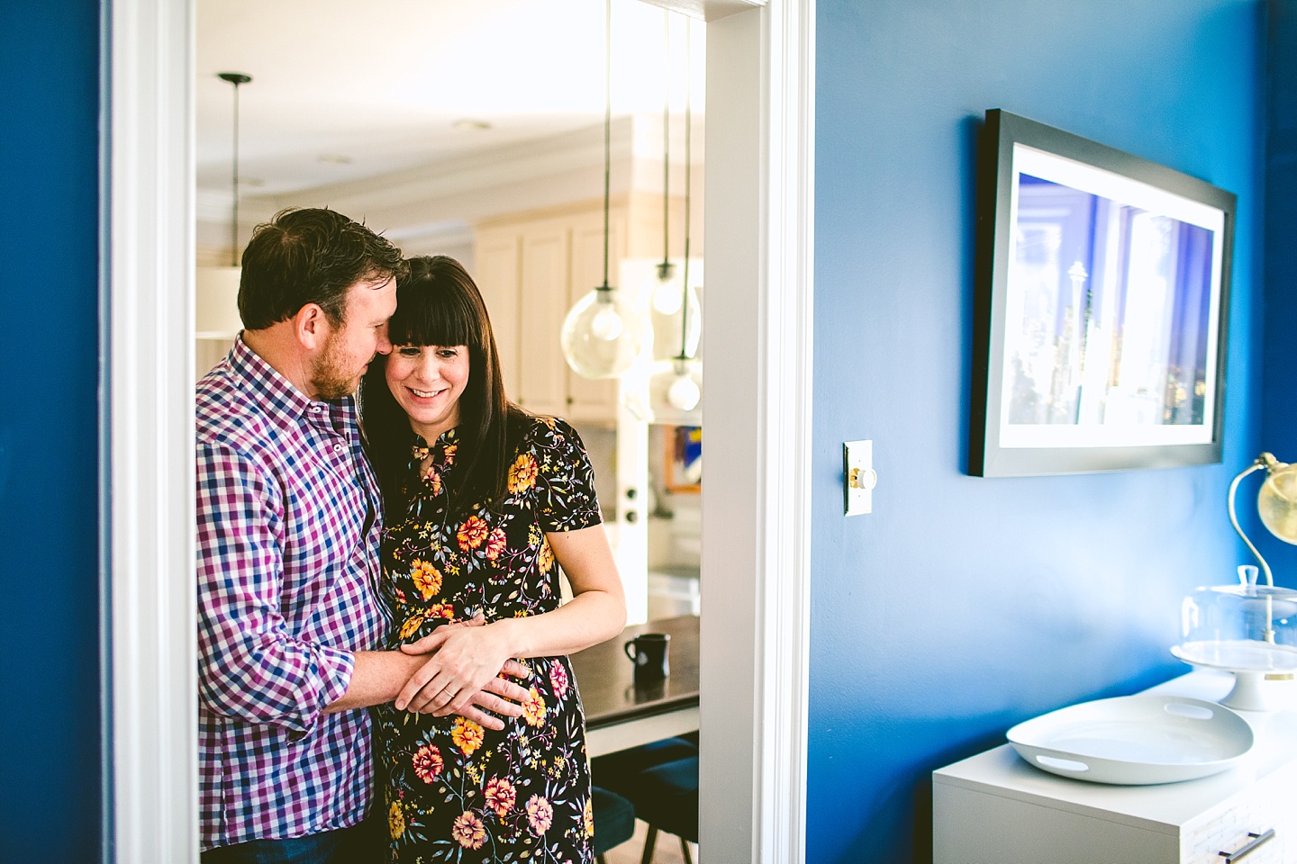 This maternity session had all the things we want out of any session: a Laura Palmer meanwhile hands tattoo, a David Lynch shrine, two English bulldogs, and a listening of “Bodhisattva” by Steely Dan. Also, Sarah’s haircut and X-Files discussions. We like them both a whole bunch, even if they didn’t have the world’s two most adorable English bulldogs who have the quintessential protruding jaws that any self-respecting bulldog would have. They also stick their legs out completely straight and have a bunch of face-rolls (the dogs… not Sarah and Chris) and their names are Seamus and Sasquatch. The point of this session was to document Sarah’s pregnancy and her and Chris’s life together with the pups before the arrival of baby boy in February, and we happily did just that in their wonderful home. Seamus is also getting up there in bulldog years so it was important to photograph his squishy face (he is the lighter, tanner bulldog). Sasquatch is his newer brother who was a gift to Chris on their wedding day (cutest squishiest gift ever).