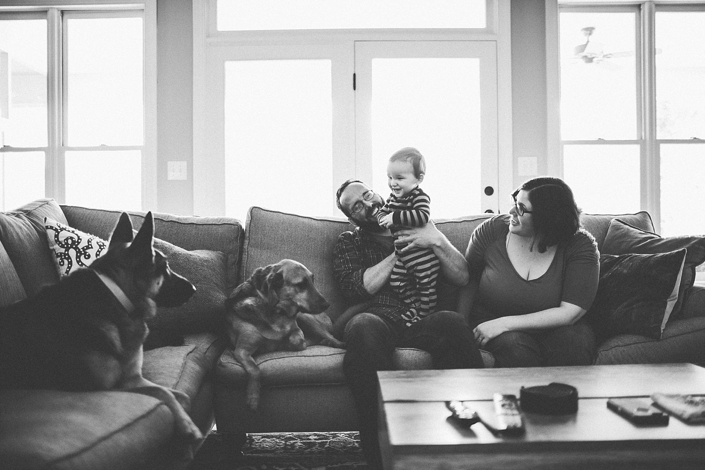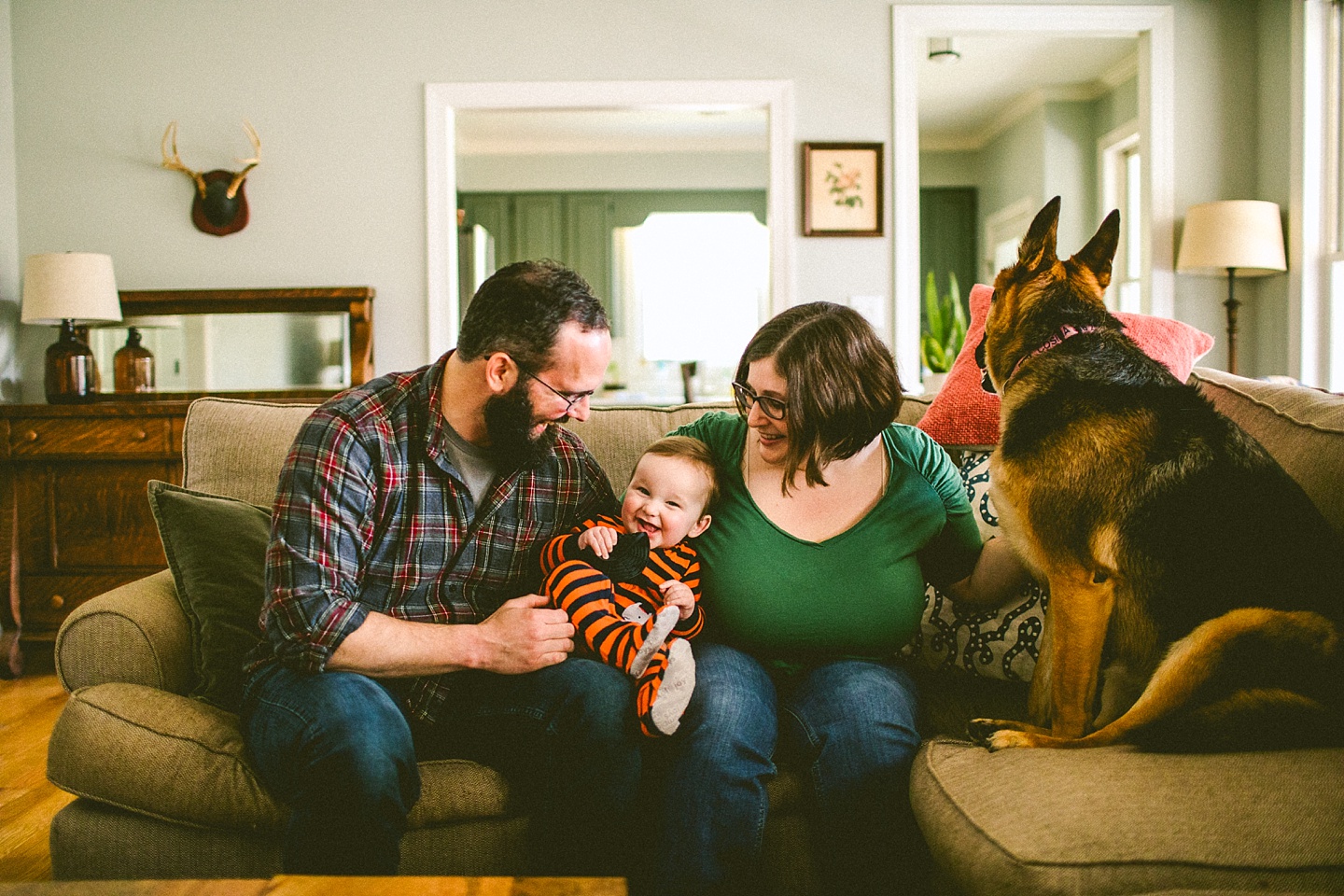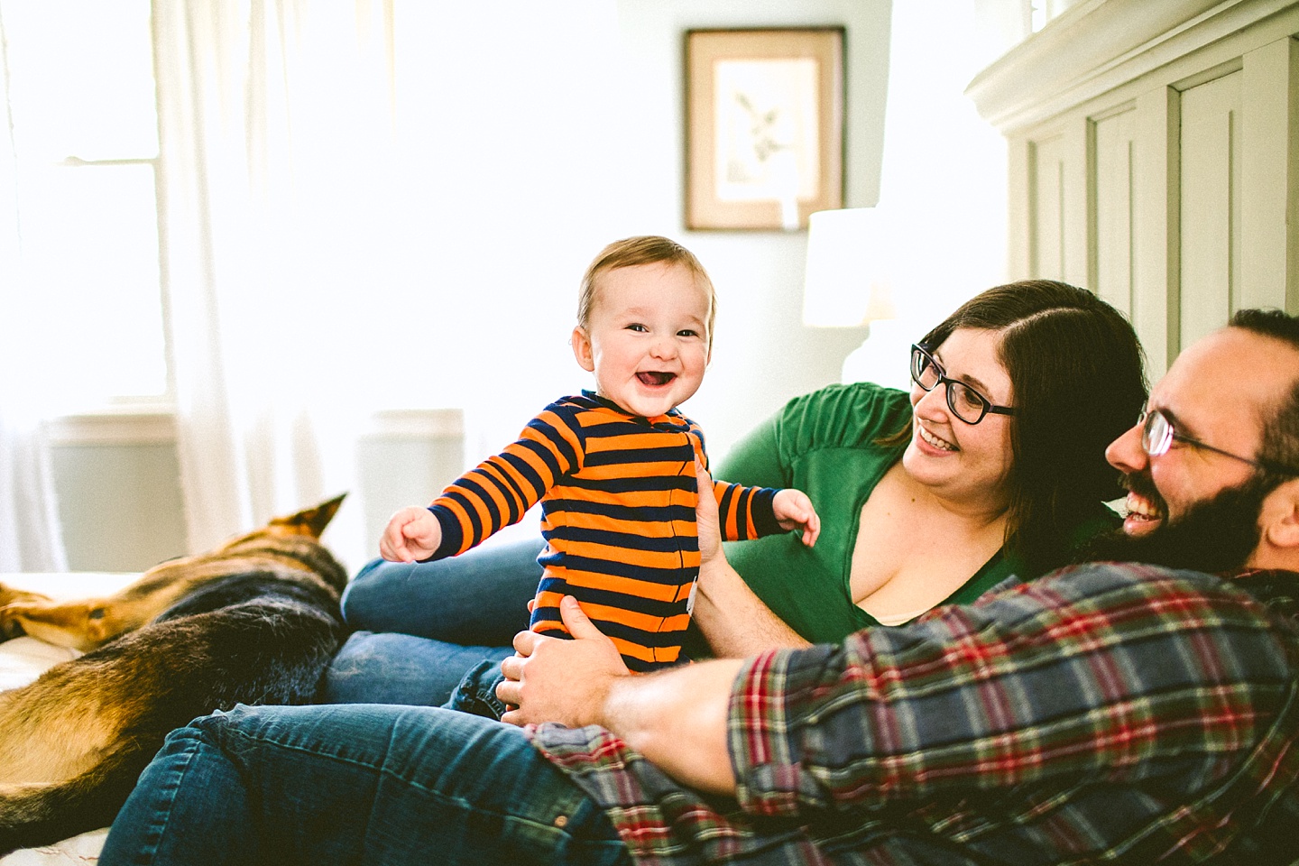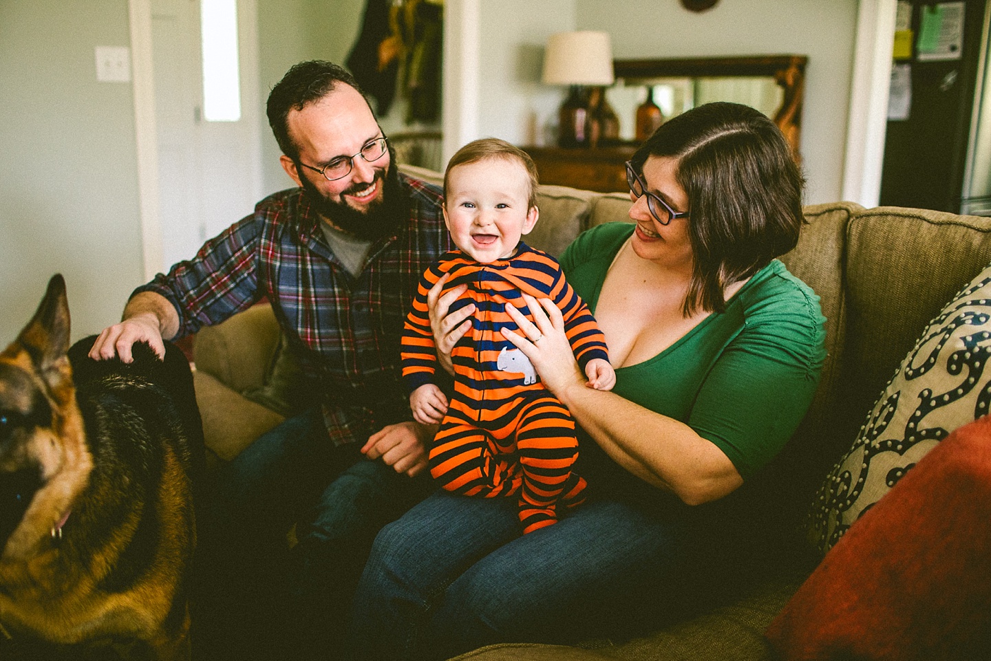 Elliott, while stealing the majority of the spotlight, is accompanied by his parents Gina and Pete. They dressed him in striped footie pajamas that paid tribute to Sudan, the world’s last male northern white rhino, who had died just before our session. Much respect. Gina and Pete are really cool and the most handy people we’ve ever encountered. Almost everything in their house has been built or sanded/stained or wired by Pete. He casually threw out there that he’s even made all the lamps and picture frames. They have an apple orchard they just planted! They have a backsplash they just tiled! They are crafty and cute and we like them too. Also in the adorable accessory department are Jethro (hound mix) and Cosima (German Shepherd) who are VERY GOOD boys and girls. Lots of sitting, lots of staying, lots of casually and cutely glancing at the camera. Fairly certain that Cosima has some sort of secret modeling pact with Elliott to land a high-profile baby food commercial together, and I don’t have a baby, but I’d still order whatever they were selling anyway.