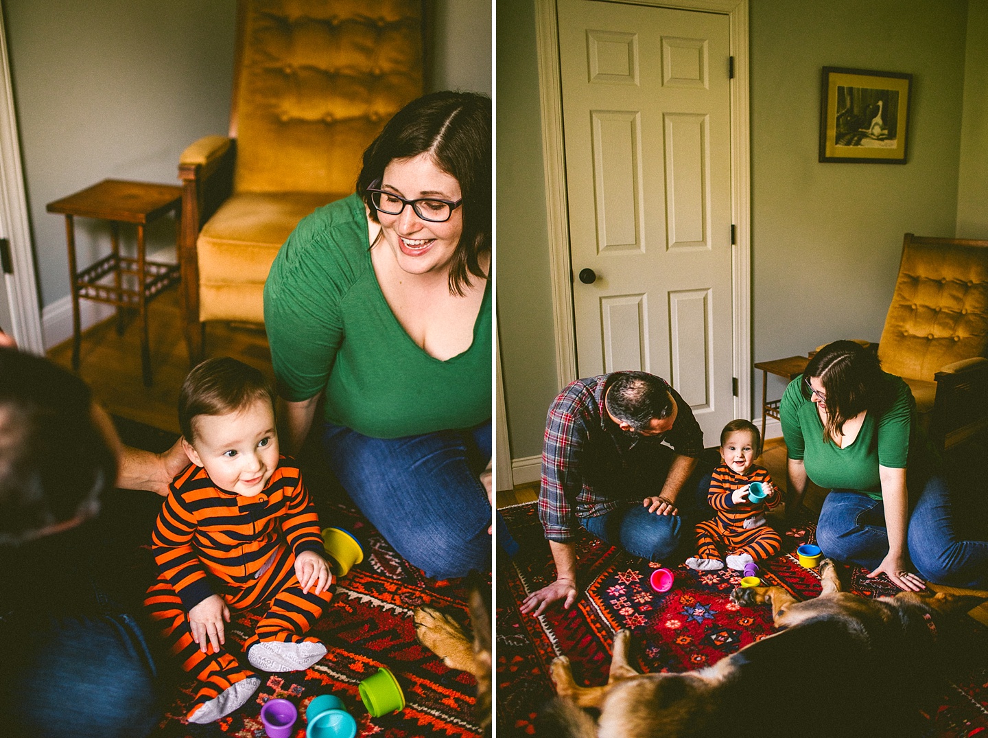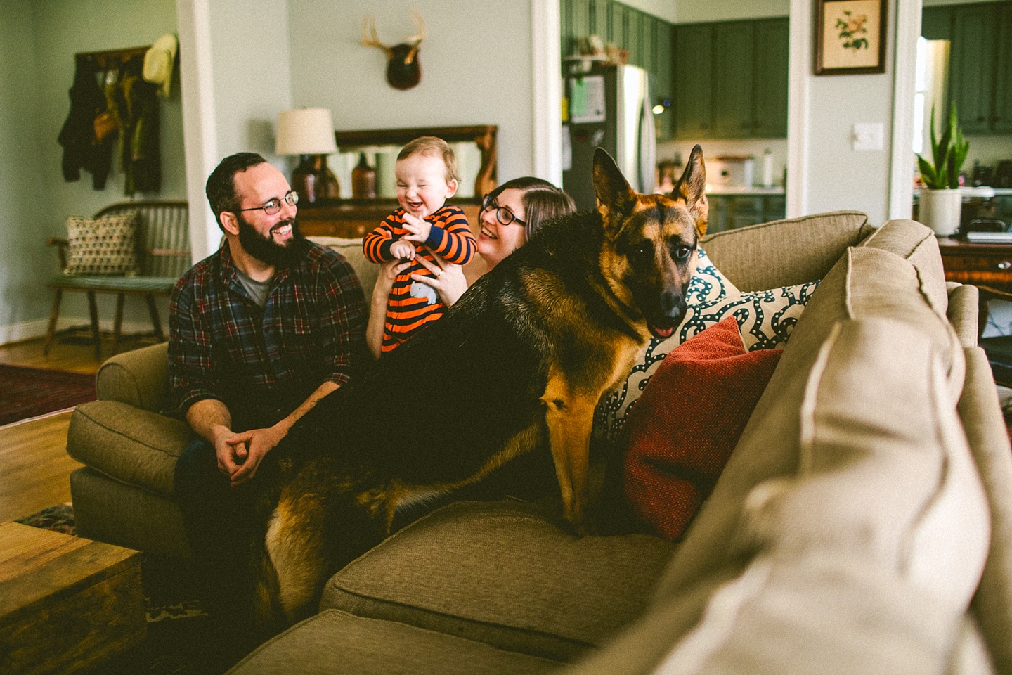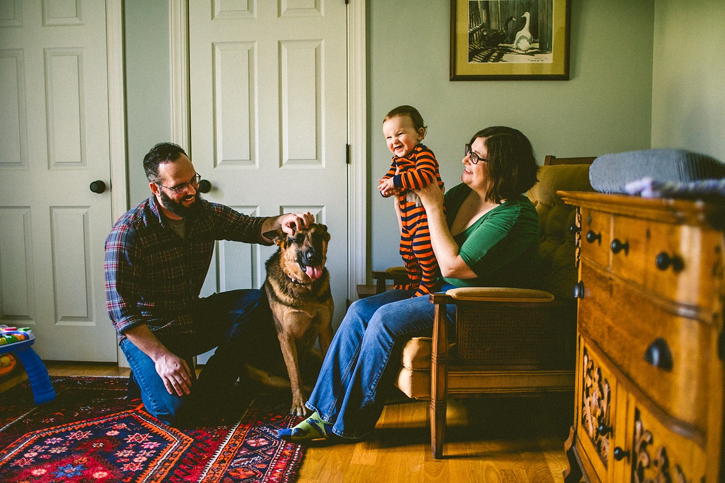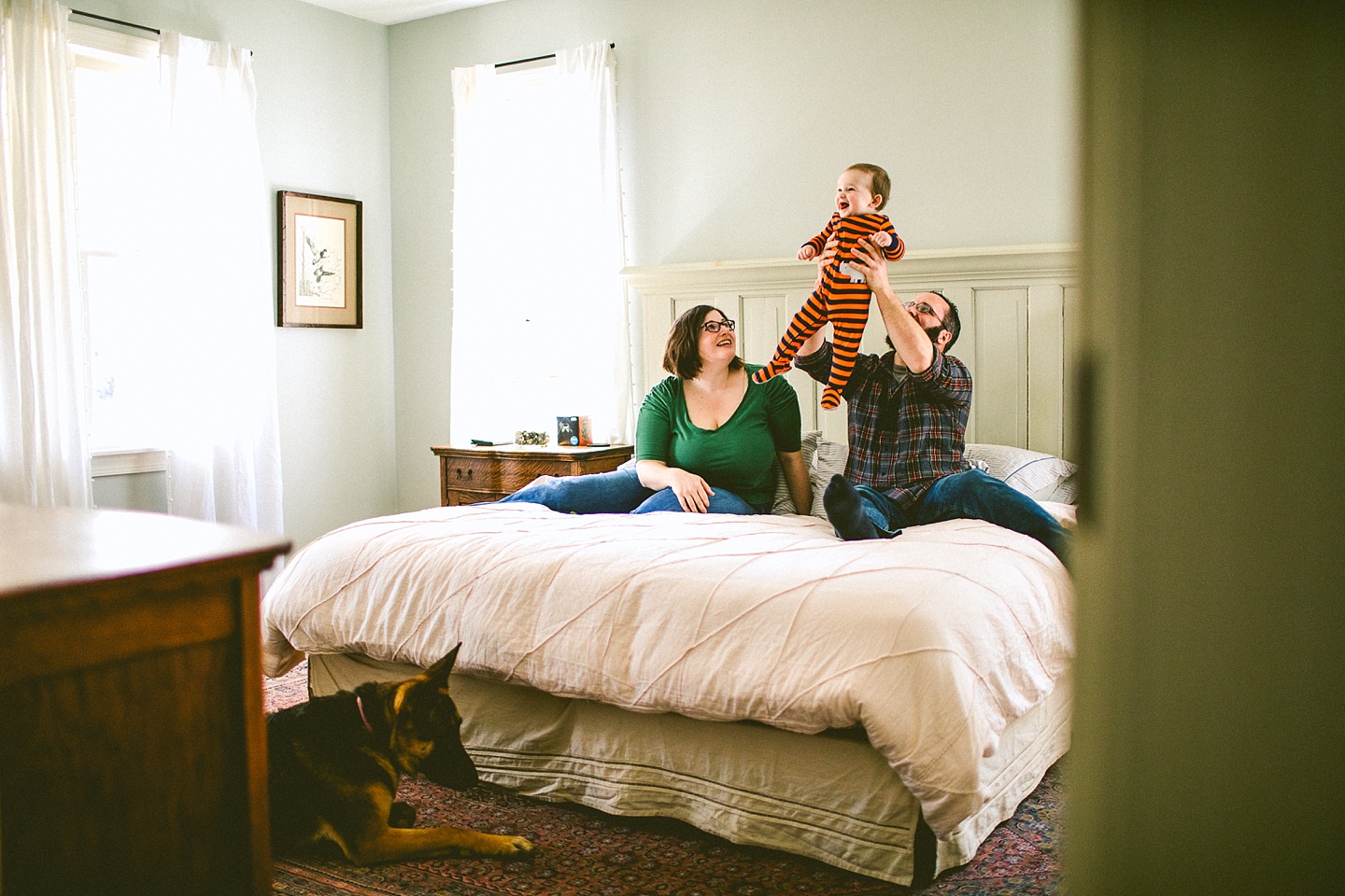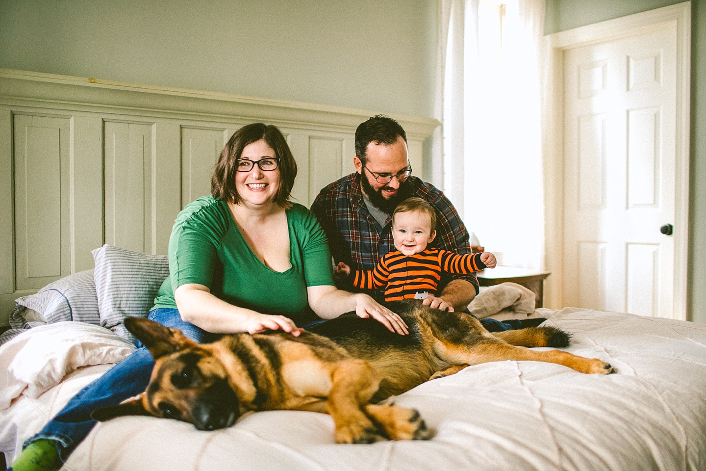 Elliott, while stealing the majority of the spotlight, is accompanied by his parents Gina and Pete. They dressed him in striped footie pajamas that paid tribute to Sudan, the world’s last male northern white rhino, who had died just before our session. Much respect. Gina and Pete are really cool and the most handy people we’ve ever encountered. Almost everything in their house has been built or sanded/stained or wired by Pete. He casually threw out there that he’s even made all the lamps and picture frames. They have an apple orchard they just planted! They have a backsplash they just tiled! They are crafty and cute and we like them too. Also in the adorable accessory department are Jethro (hound mix) and Cosima (German Shepherd) who are VERY GOOD boys and girls. Lots of sitting, lots of staying, lots of casually and cutely glancing at the camera. Fairly certain that Cosima has some sort of secret modeling pact with Elliott to land a high-profile baby food commercial together, and I don’t have a baby, but I’d still order whatever they were selling anyway.