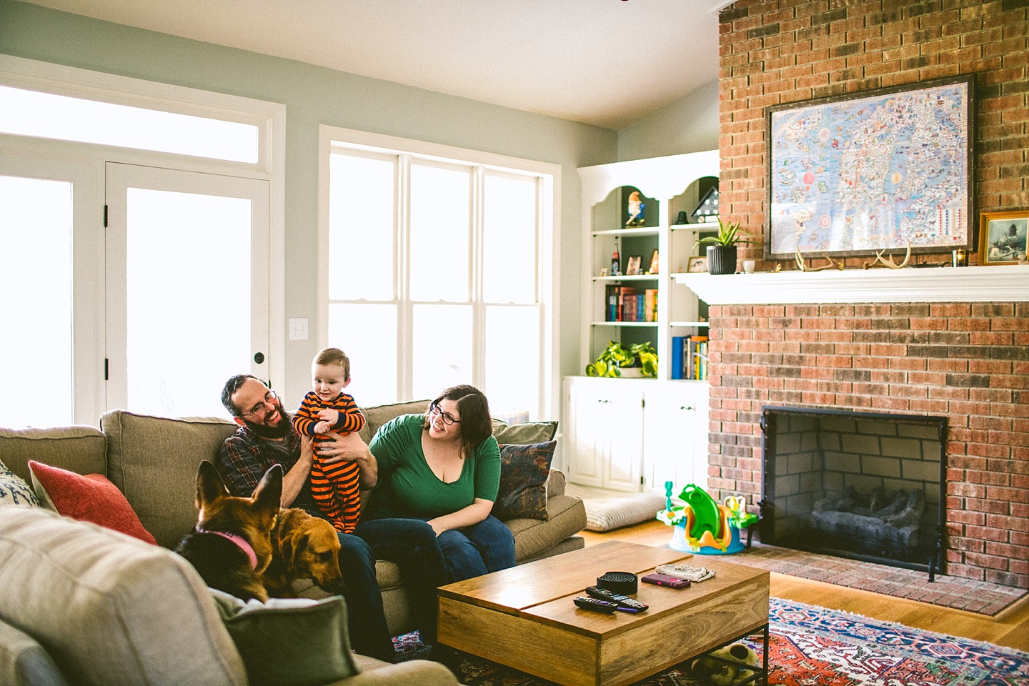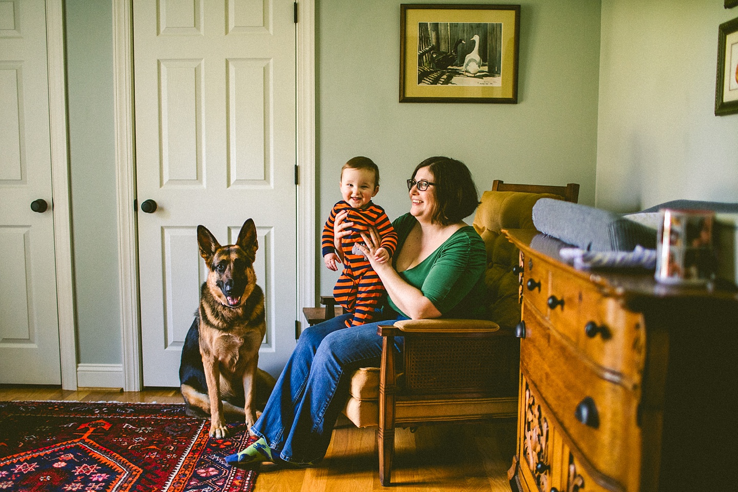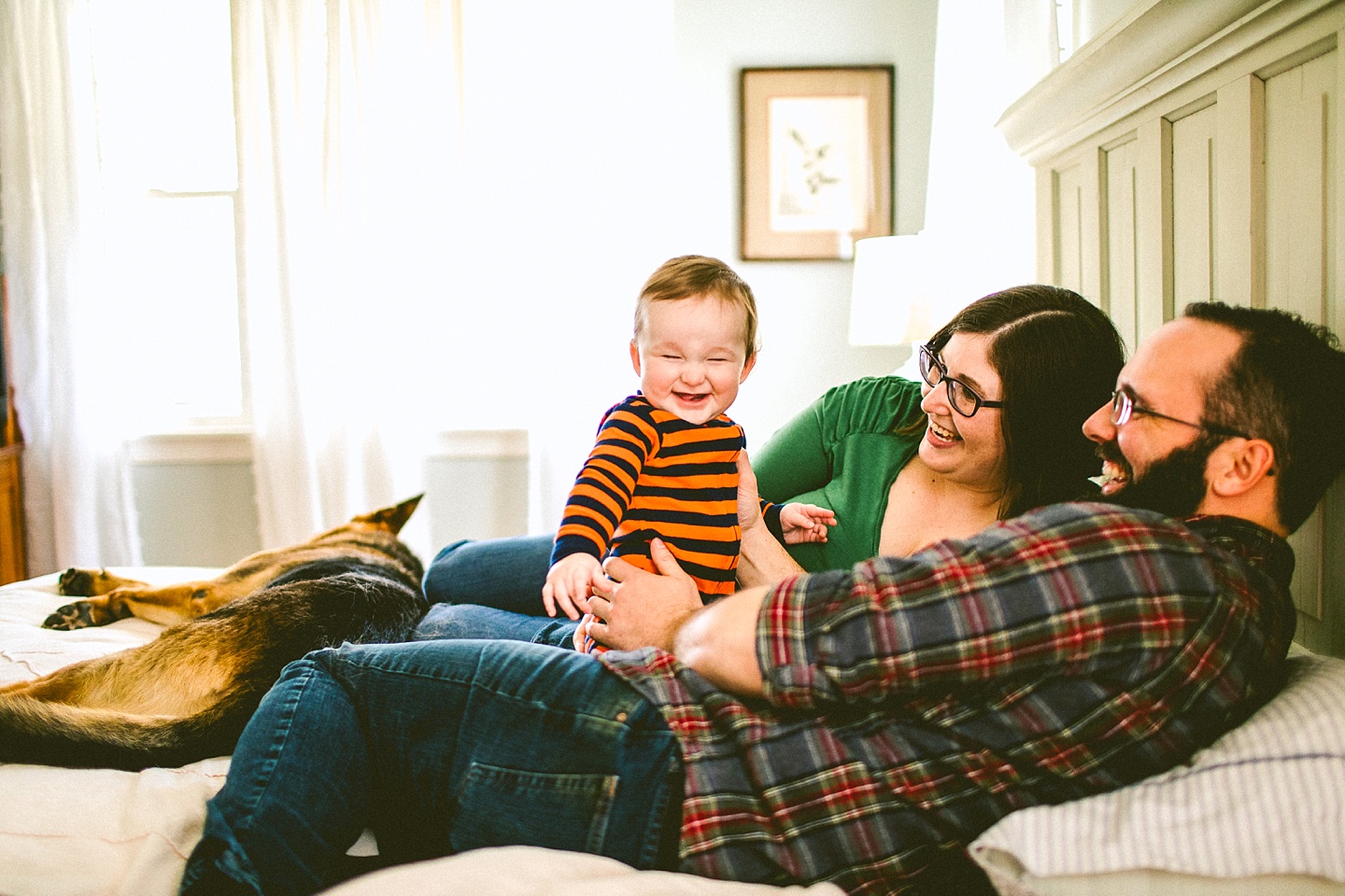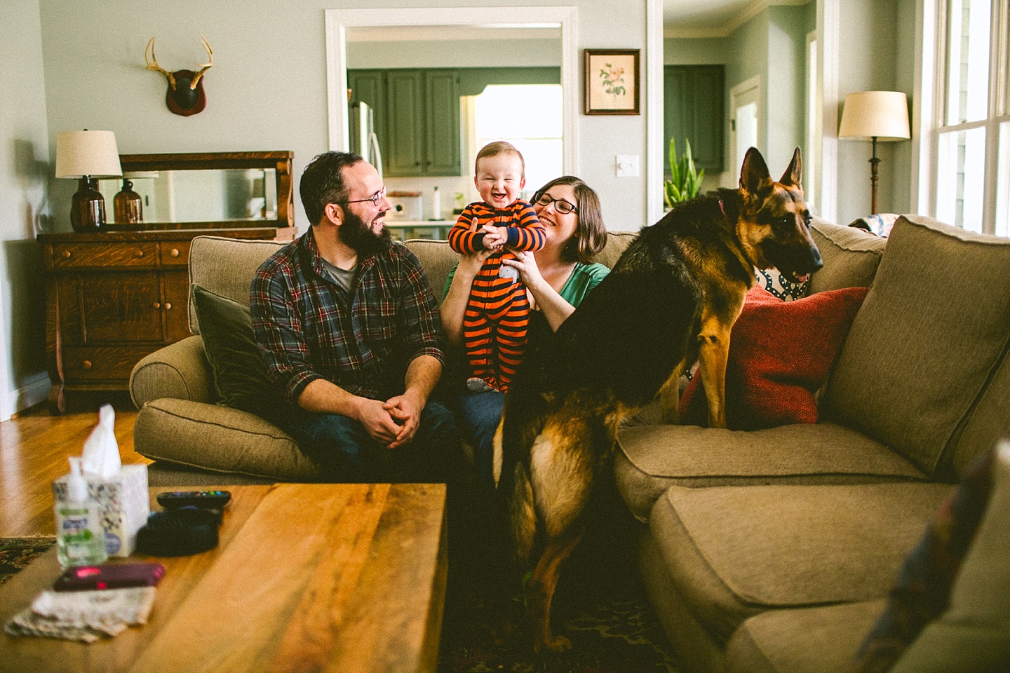 Elliott, while stealing the majority of the spotlight, is accompanied by his parents Gina and Pete. They dressed him in striped footie pajamas that paid tribute to Sudan, the world’s last male northern white rhino, who had died just before our session. Much respect. Gina and Pete are really cool and the most handy people we’ve ever encountered. Almost everything in their house has been built or sanded/stained or wired by Pete. He casually threw out there that he’s even made all the lamps and picture frames. They have an apple orchard they just planted! They have a backsplash they just tiled! They are crafty and cute and we like them too. Also in the adorable accessory department are Jethro (hound mix) and Cosima (German Shepherd) who are VERY GOOD boys and girls. Lots of sitting, lots of staying, lots of casually and cutely glancing at the camera. Fairly certain that Cosima has some sort of secret modeling pact with Elliott to land a high-profile baby food commercial together, and I don’t have a baby, but I’d still order whatever they were selling anyway.