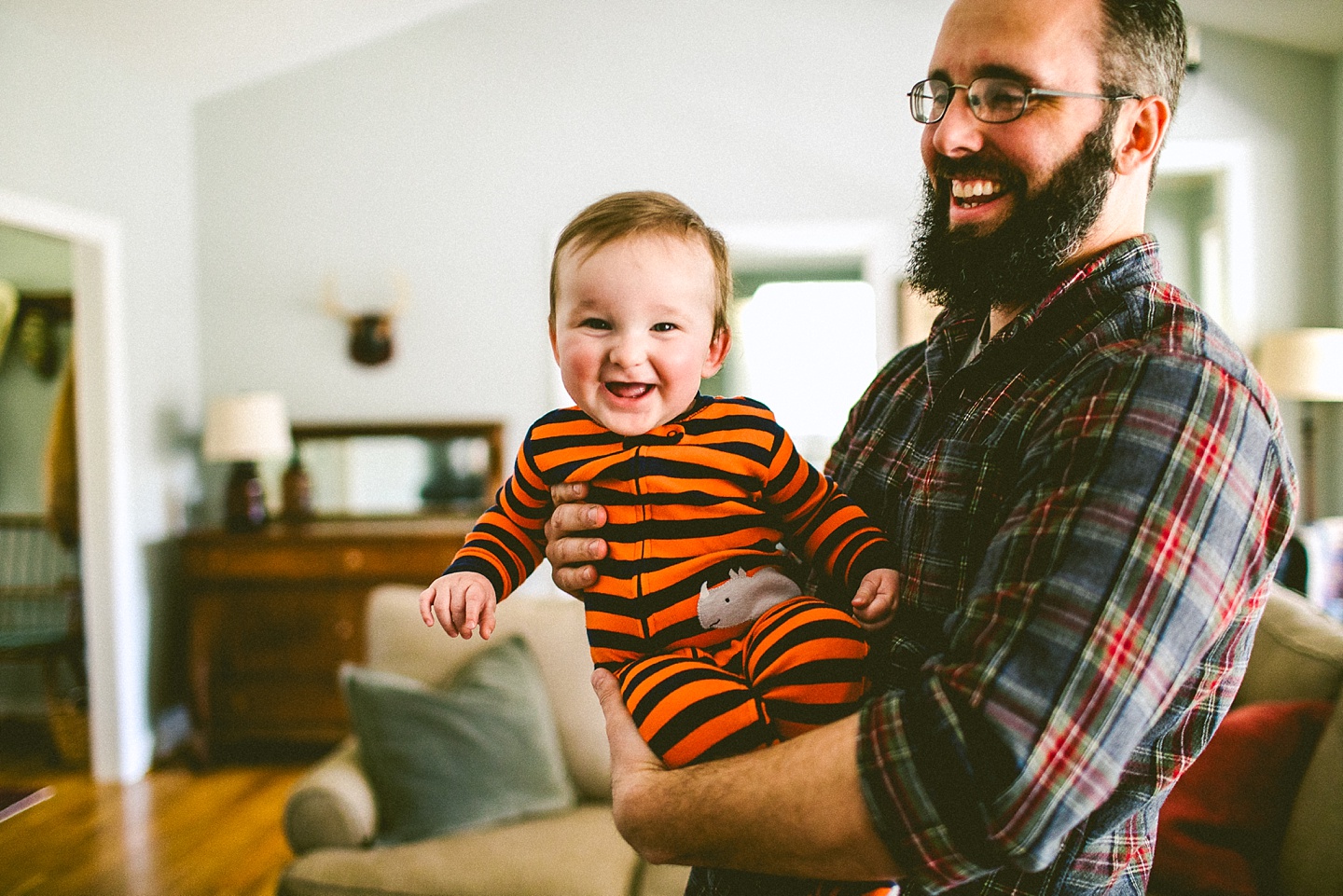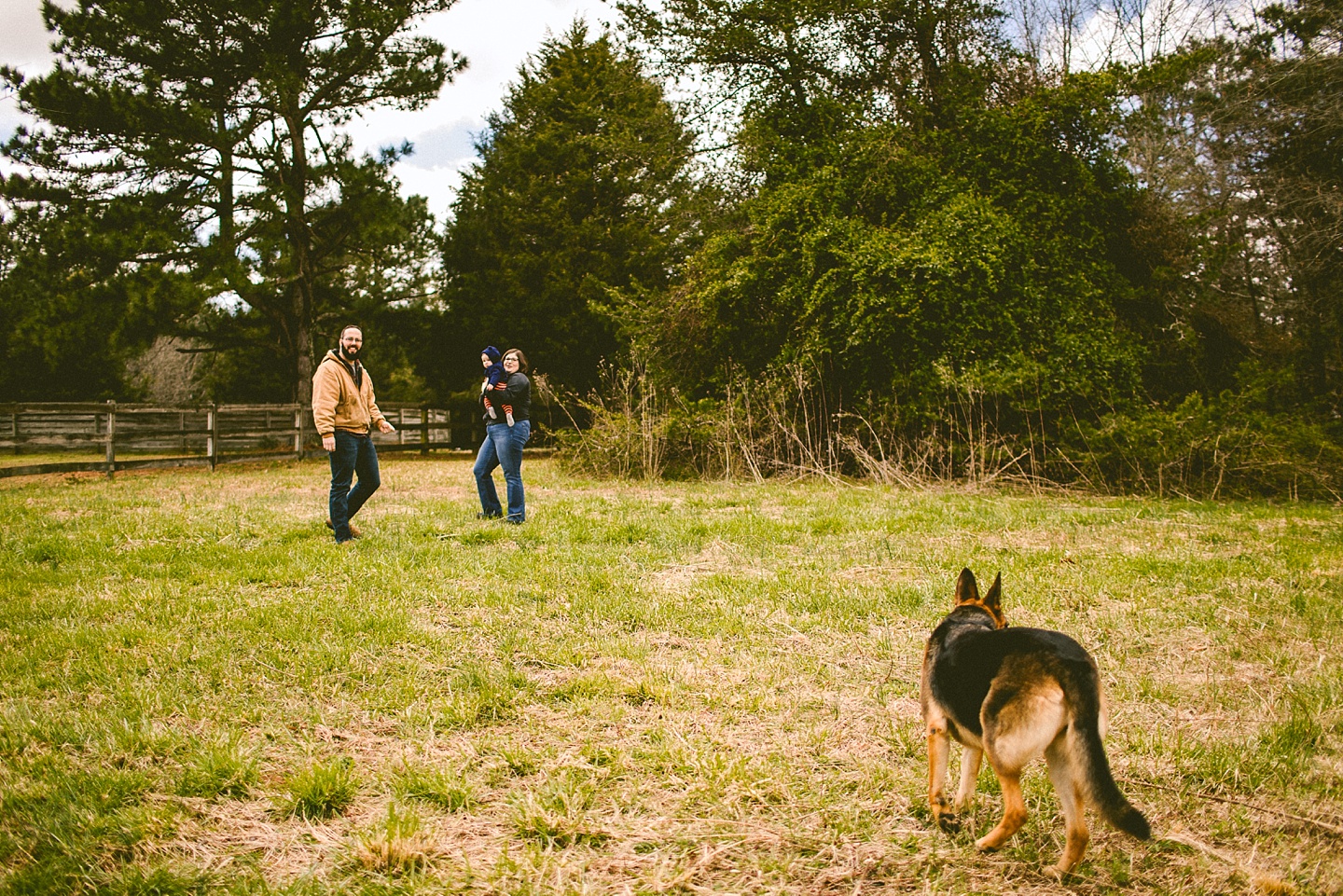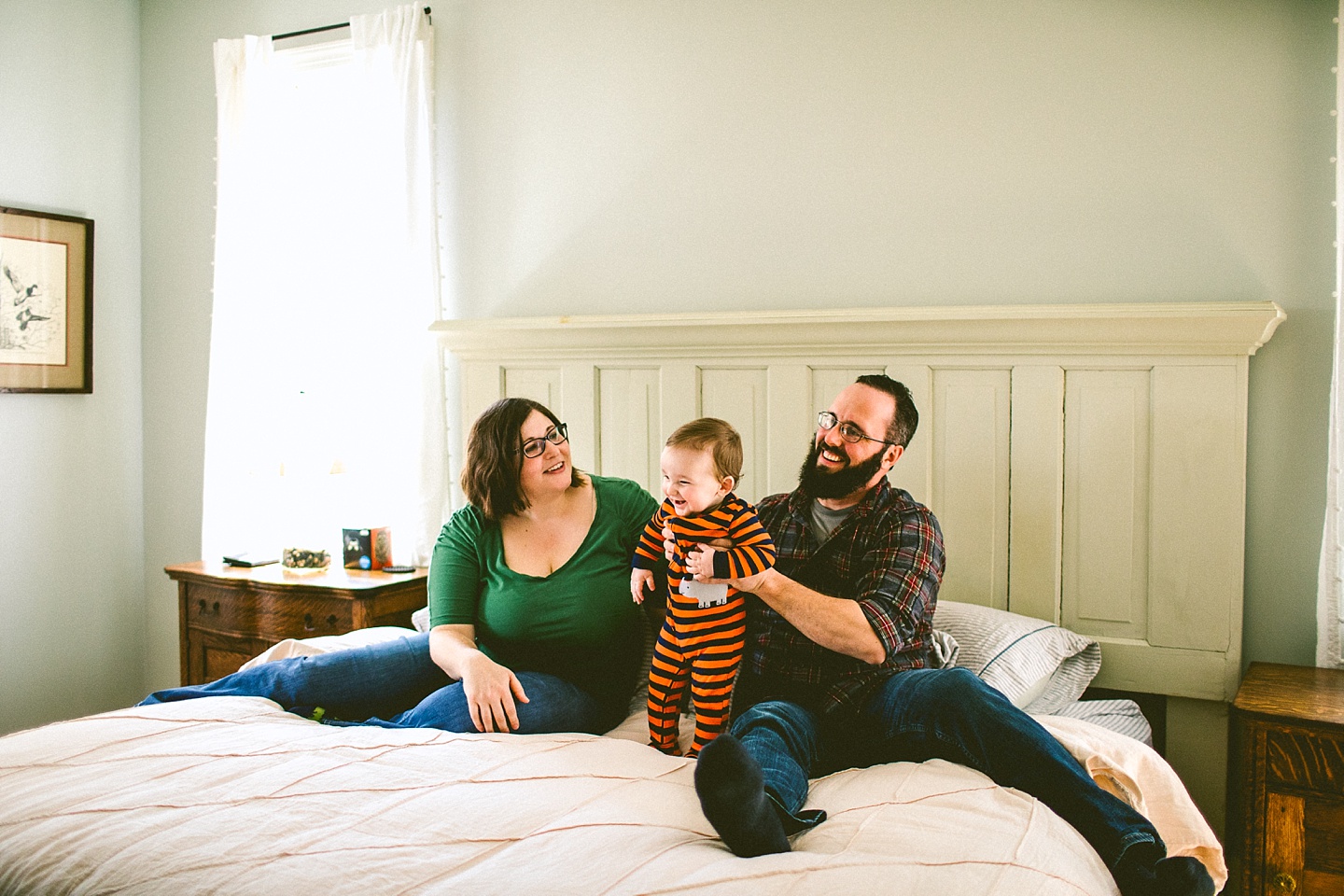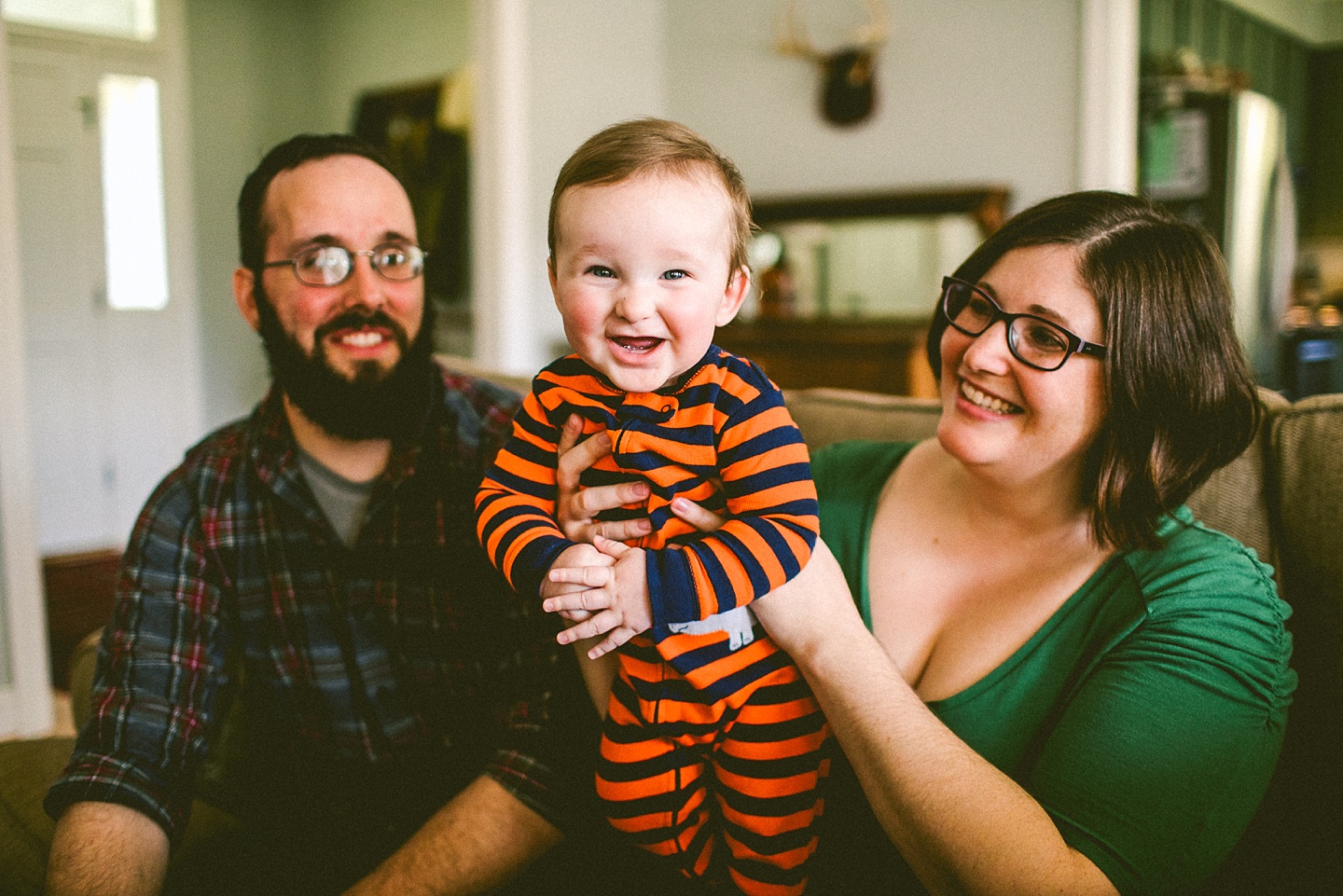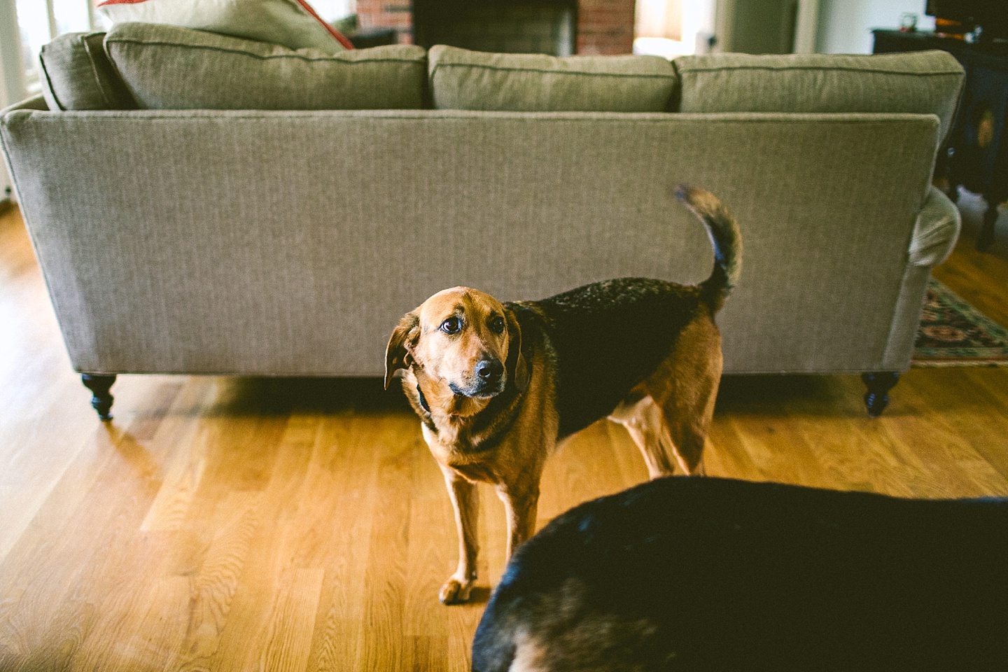 Elliott, while stealing the majority of the spotlight, is accompanied by his parents Gina and Pete. They dressed him in striped footie pajamas that paid tribute to Sudan, the world’s last male northern white rhino, who had died just before our session. Much respect. Gina and Pete are really cool and the most handy people we’ve ever encountered. Almost everything in their house has been built or sanded/stained or wired by Pete. He casually threw out there that he’s even made all the lamps and picture frames. They have an apple orchard they just planted! They have a backsplash they just tiled! They are crafty and cute and we like them too. Also in the adorable accessory department are Jethro (hound mix) and Cosima (German Shepherd) who are VERY GOOD boys and girls. Lots of sitting, lots of staying, lots of casually and cutely glancing at the camera. Fairly certain that Cosima has some sort of secret modeling pact with Elliott to land a high-profile baby food commercial together, and I don’t have a baby, but I’d still order whatever they were selling anyway.