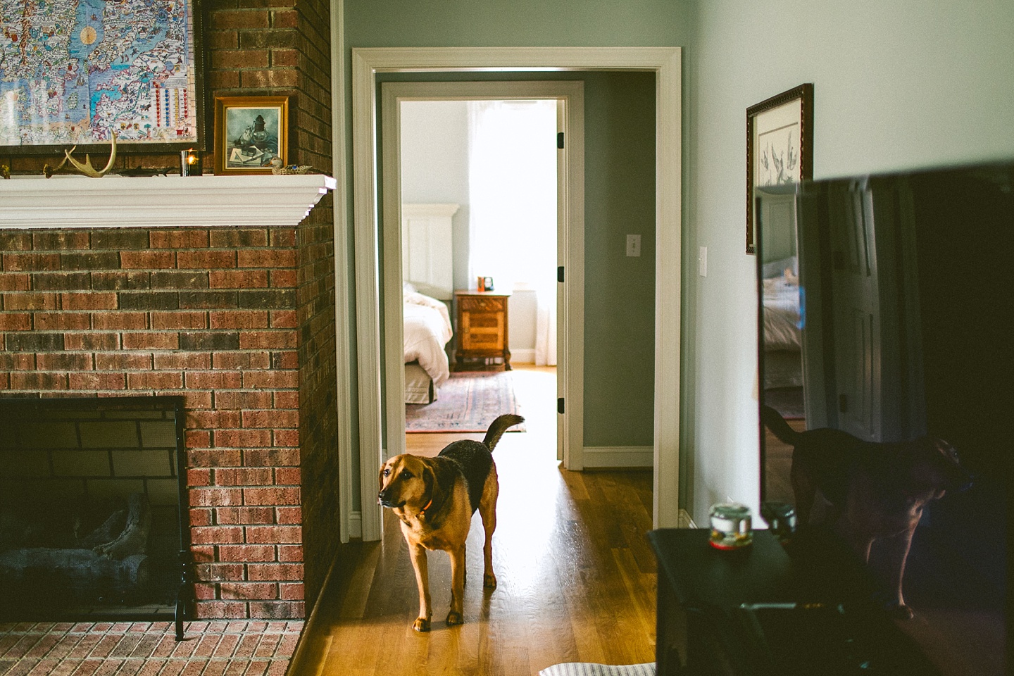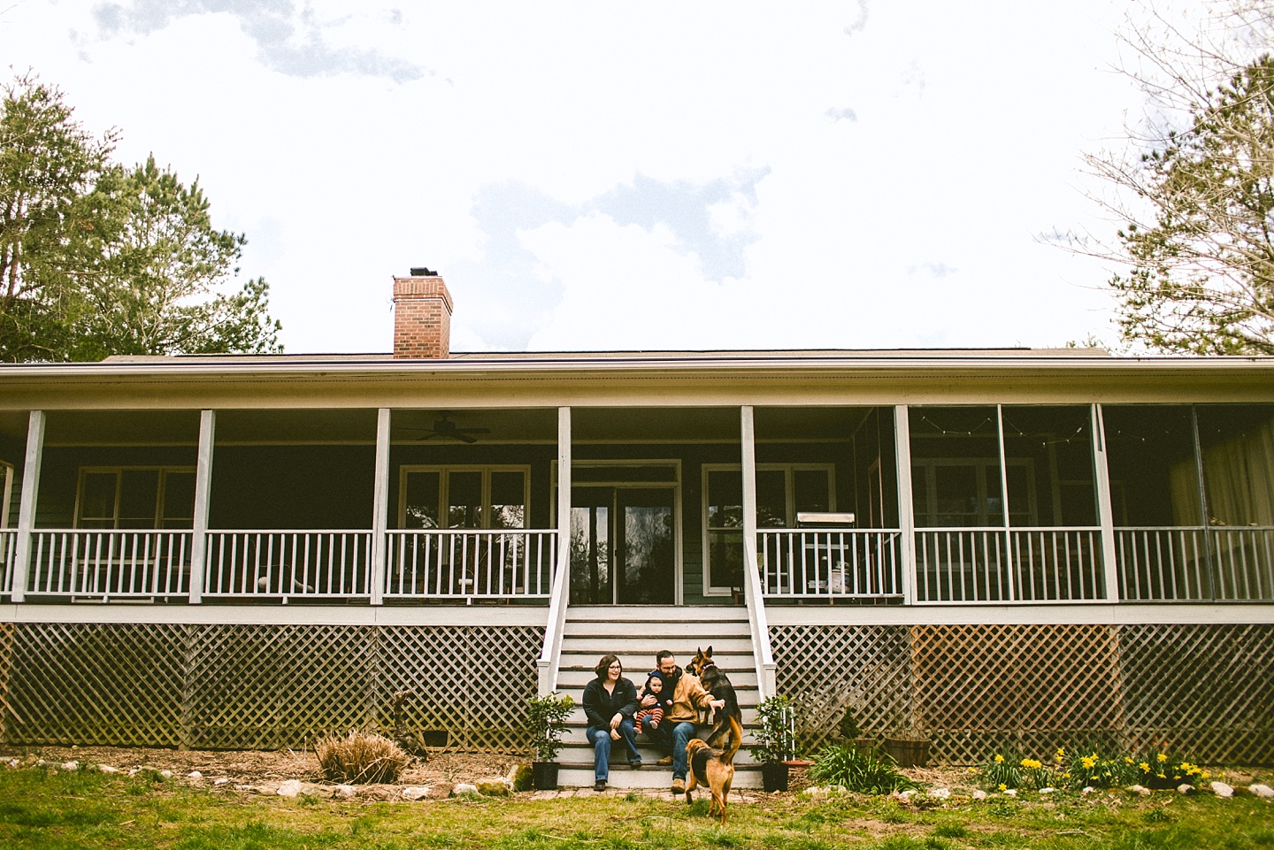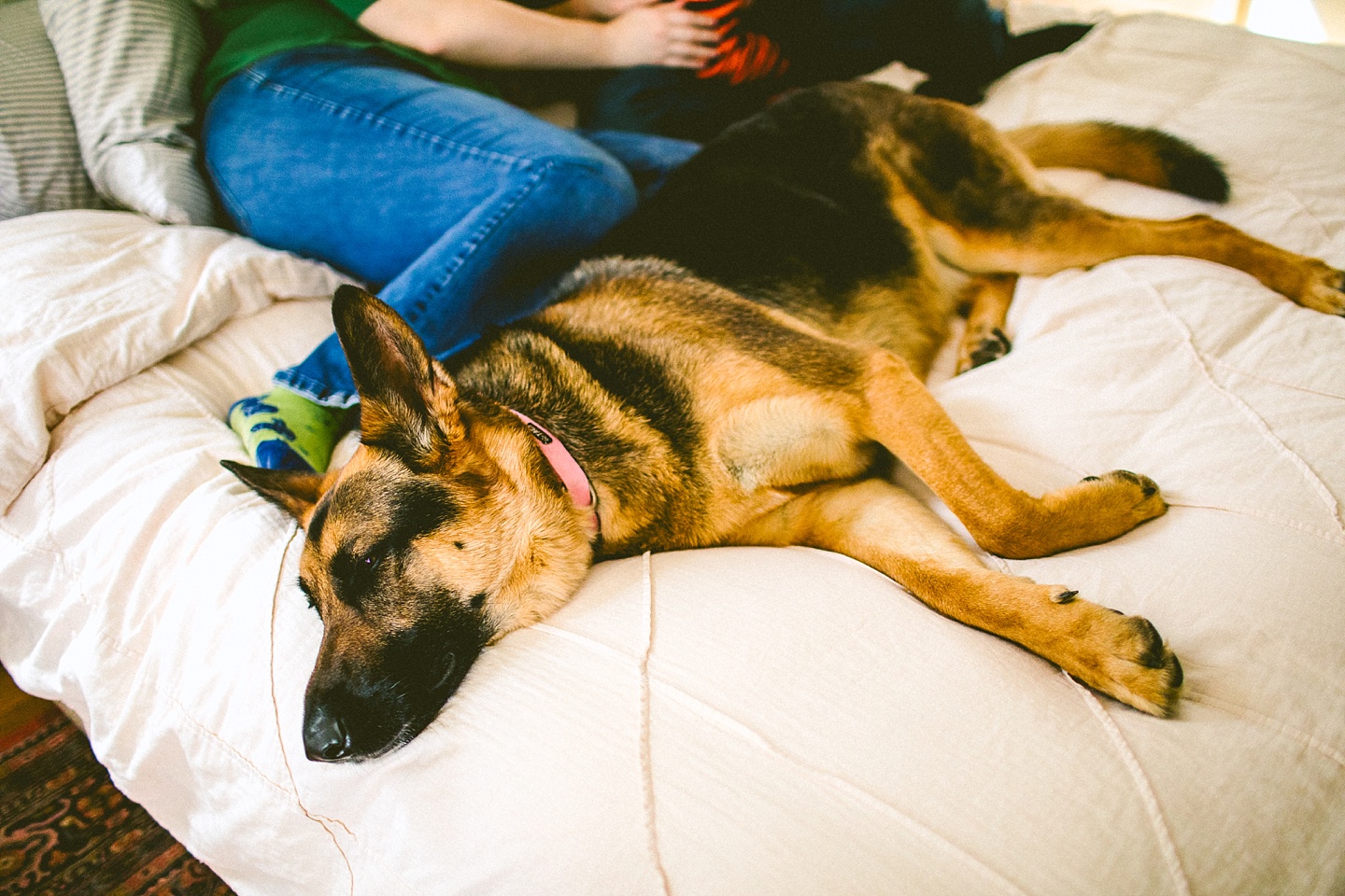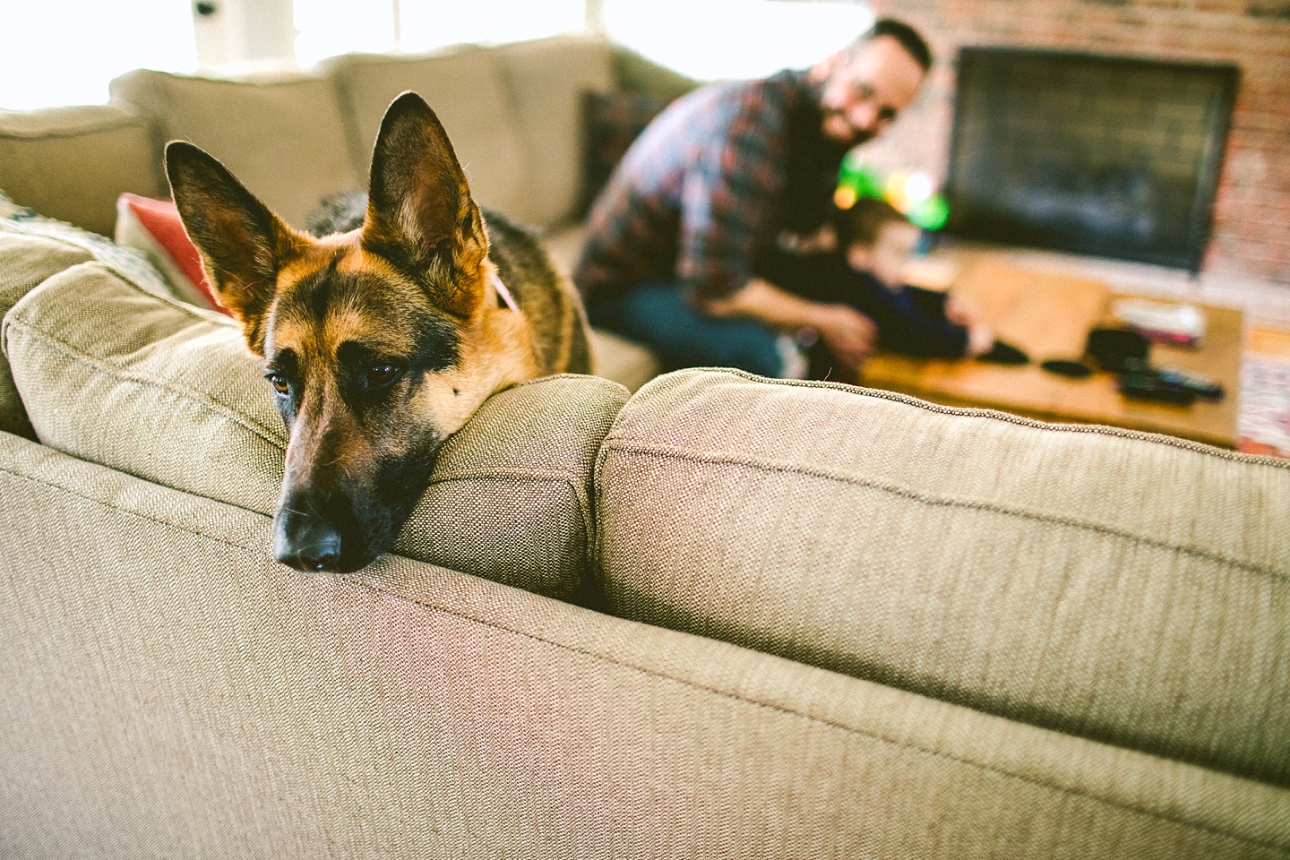 Elliott, while stealing the majority of the spotlight, is accompanied by his parents Gina and Pete. They dressed him in striped footie pajamas that paid tribute to Sudan, the world’s last male northern white rhino, who had died just before our session. Much respect. Gina and Pete are really cool and the most handy people we’ve ever encountered. Almost everything in their house has been built or sanded/stained or wired by Pete. He casually threw out there that he’s even made all the lamps and picture frames. They have an apple orchard they just planted! They have a backsplash they just tiled! They are crafty and cute and we like them too. Also in the adorable accessory department are Jethro (hound mix) and Cosima (German Shepherd) who are VERY GOOD boys and girls. Lots of sitting, lots of staying, lots of casually and cutely glancing at the camera. Fairly certain that Cosima has some sort of secret modeling pact with Elliott to land a high-profile baby food commercial together, and I don’t have a baby, but I’d still order whatever they were selling anyway.