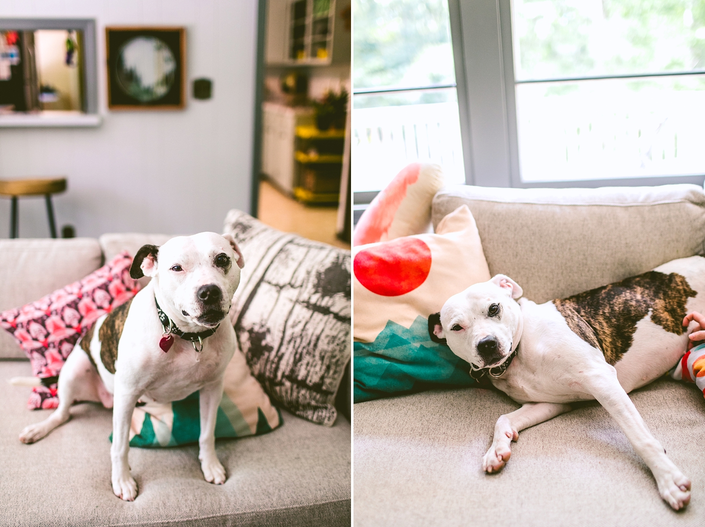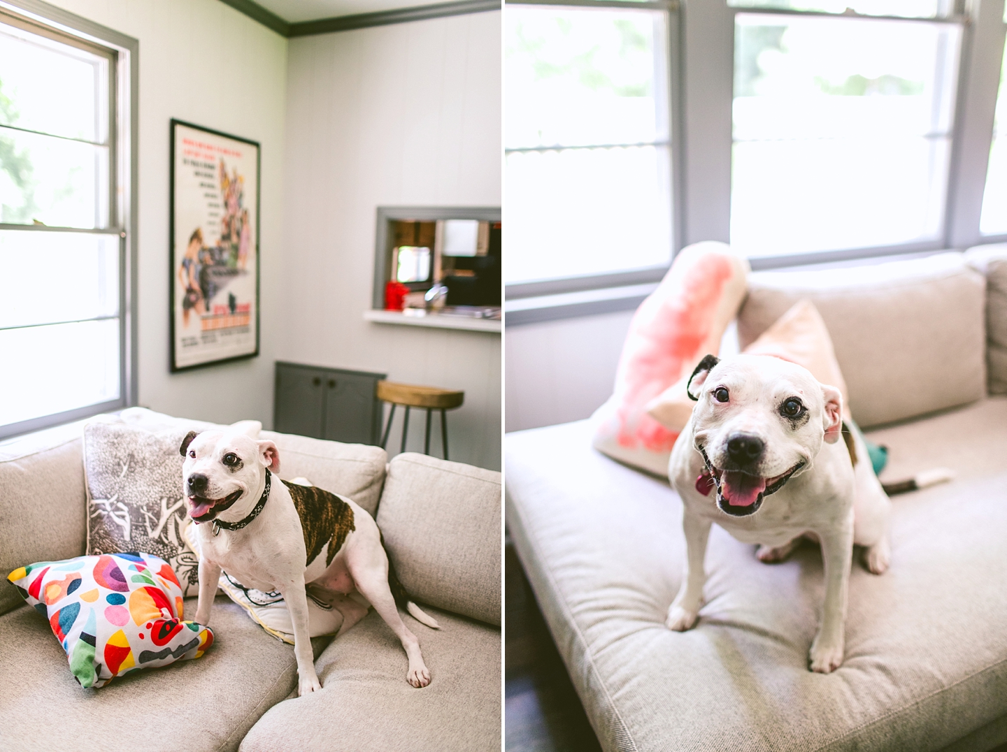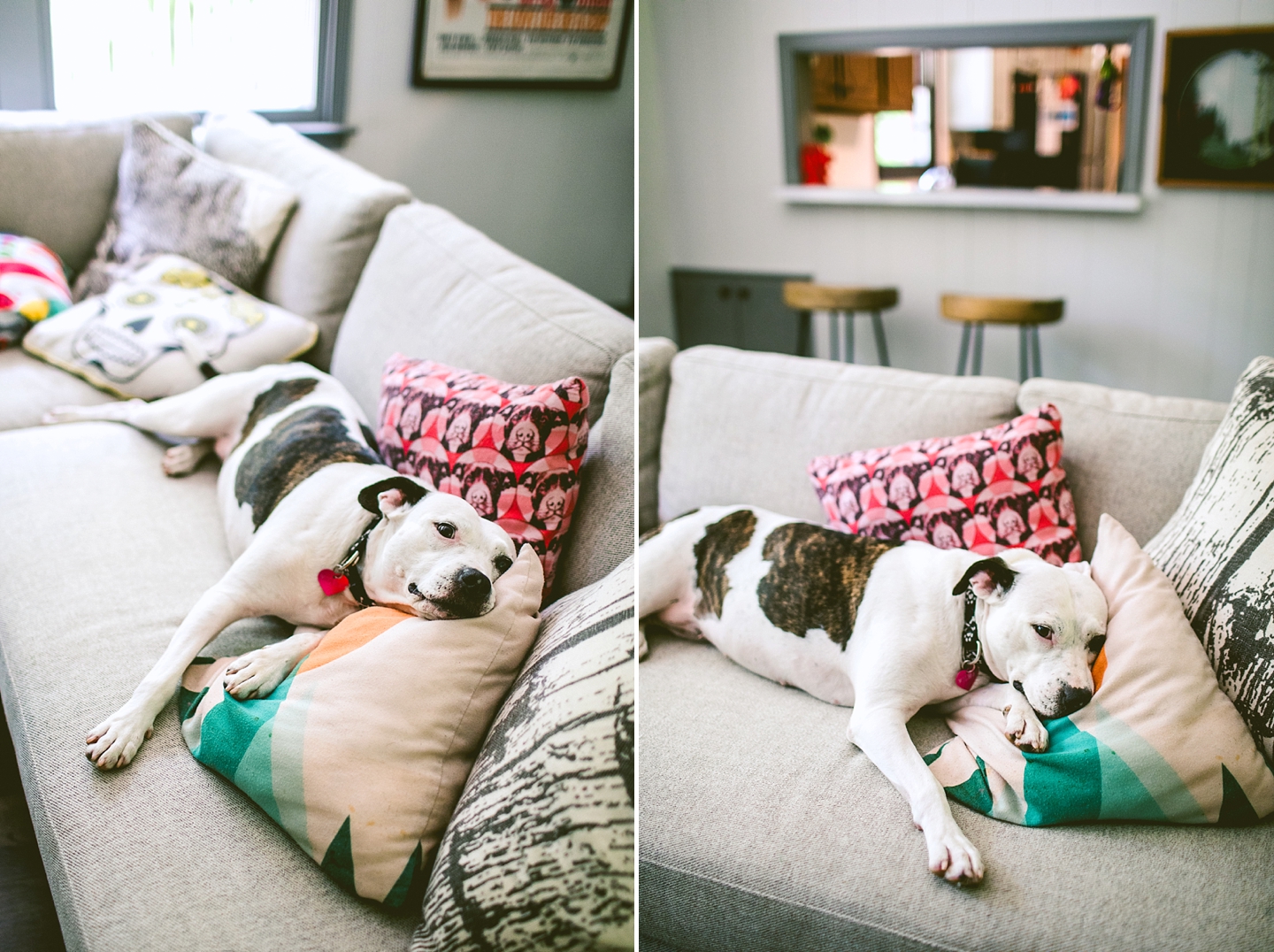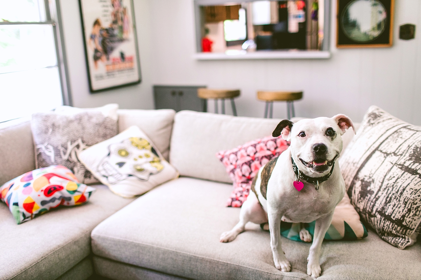 Wilma is one of the most charismatic and amusing furry creatures we have ever had the pleasure of meeting. She is incredibly happy at all times, and quirky and ridiculous 90% of the time. Words can’t really explain the adorably ridiculous vibe that she gives off, but I can try. Mostly, she’s just really obsessed with the couch. Like, super obsessed. When Jessica wrote me to ask for pictures of Wilma for her 5 year adoptiversary, she told me about the couch (she also told me about her fantastically awesome airbrushed and glitter WILMA shirt from the State Fair that I forced her to wear for a few pictures because there’s no way you can tell me that you got an airbrushed shirt with your dog’s name on it at the fair and expect me not to make you wear it… and she also told me about the custom Wilma beer koozies in her and Dustin’s possession. Wilma, clearly, is very much loved and for good reason). But I had no idea how much the couch was truly, truly loved until we visited and saw her expression of pure delight being anywhere near it, but mostly sitting on it, sprawling on it, and relaxing over a variety of throw pillows.