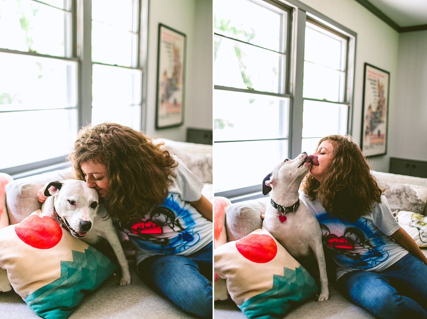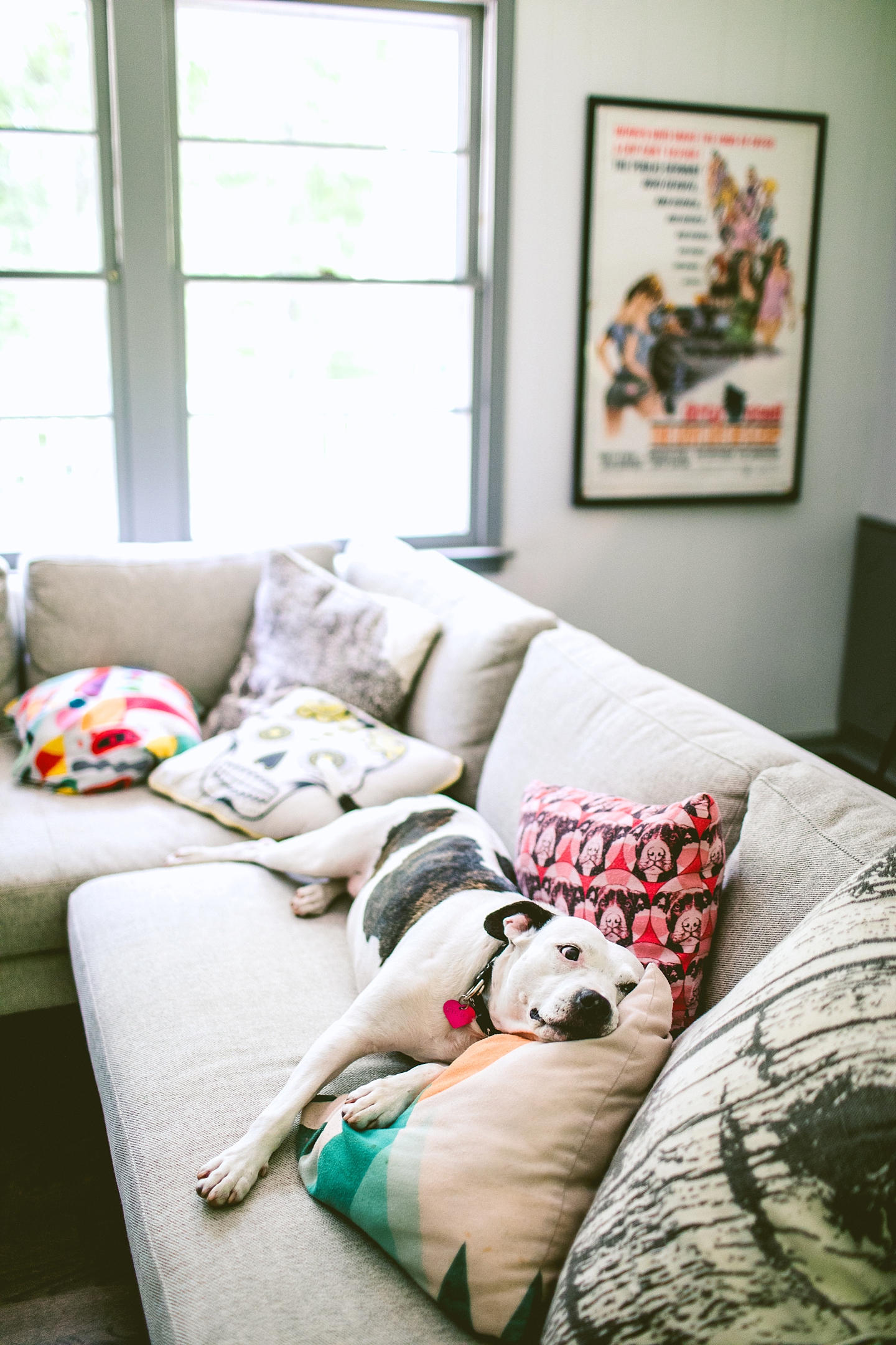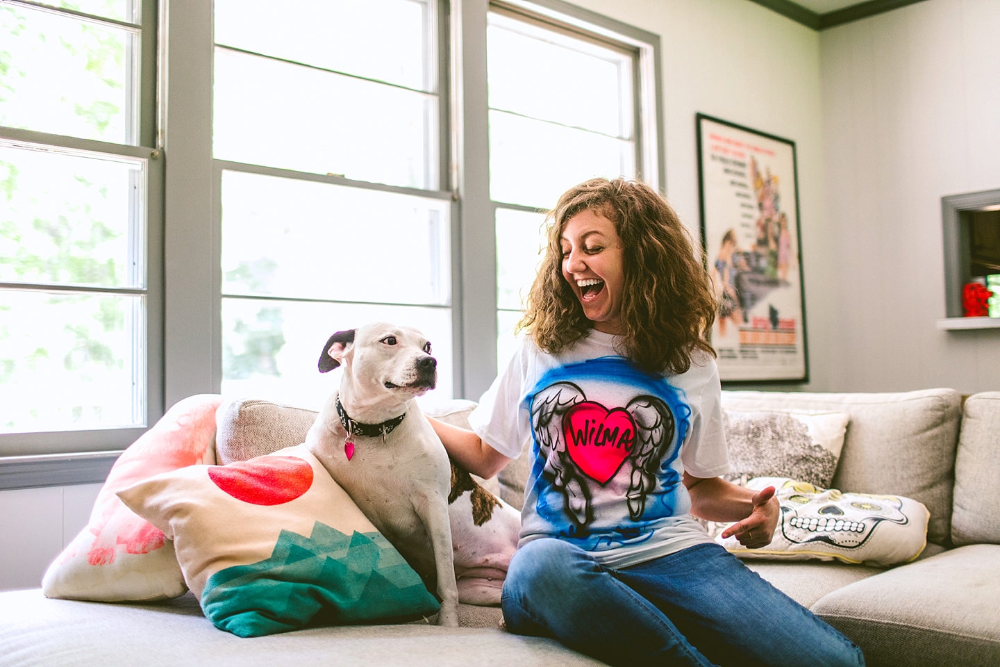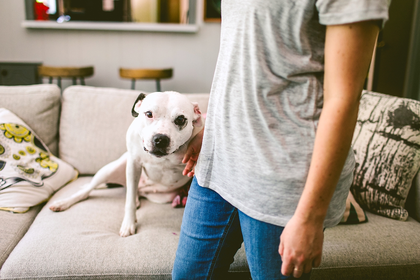 Wilma is one of the most charismatic and amusing furry creatures we have ever had the pleasure of meeting. She is incredibly happy at all times, and quirky and ridiculous 90% of the time. Words can’t really explain the adorably ridiculous vibe that she gives off, but I can try. Mostly, she’s just really obsessed with the couch. Like, super obsessed. When Jessica wrote me to ask for pictures of Wilma for her 5 year adoptiversary, she told me about the couch (she also told me about her fantastically awesome airbrushed and glitter WILMA shirt from the State Fair that I forced her to wear for a few pictures because there’s no way you can tell me that you got an airbrushed shirt with your dog’s name on it at the fair and expect me not to make you wear it… and she also told me about the custom Wilma beer koozies in her and Dustin’s possession. Wilma, clearly, is very much loved and for good reason). But I had no idea how much the couch was truly, truly loved until we visited and saw her expression of pure delight being anywhere near it, but mostly sitting on it, sprawling on it, and relaxing over a variety of throw pillows.