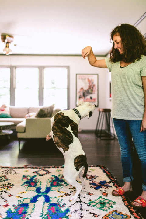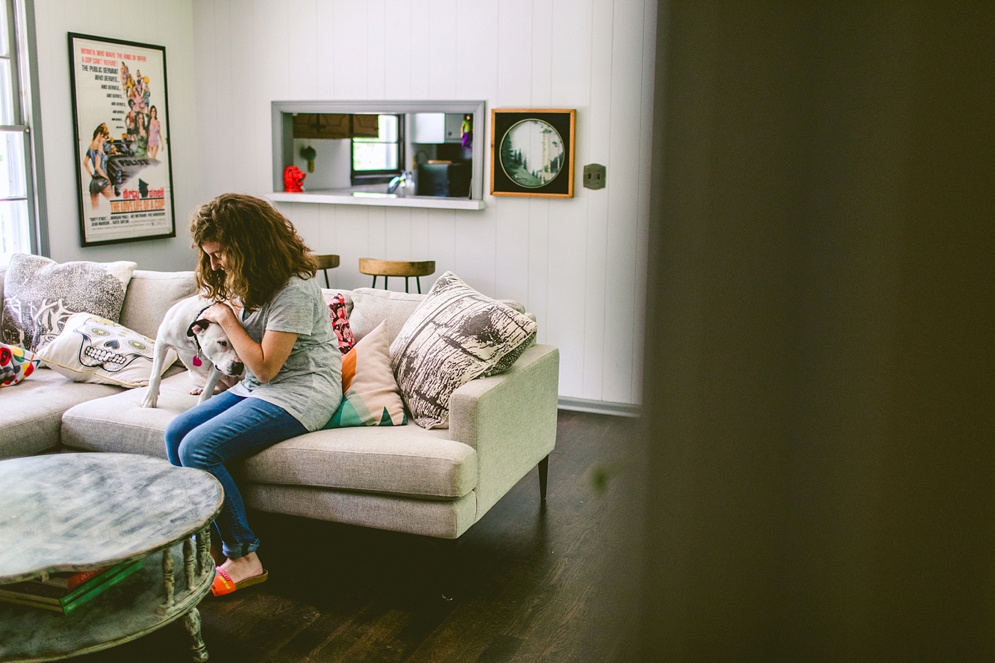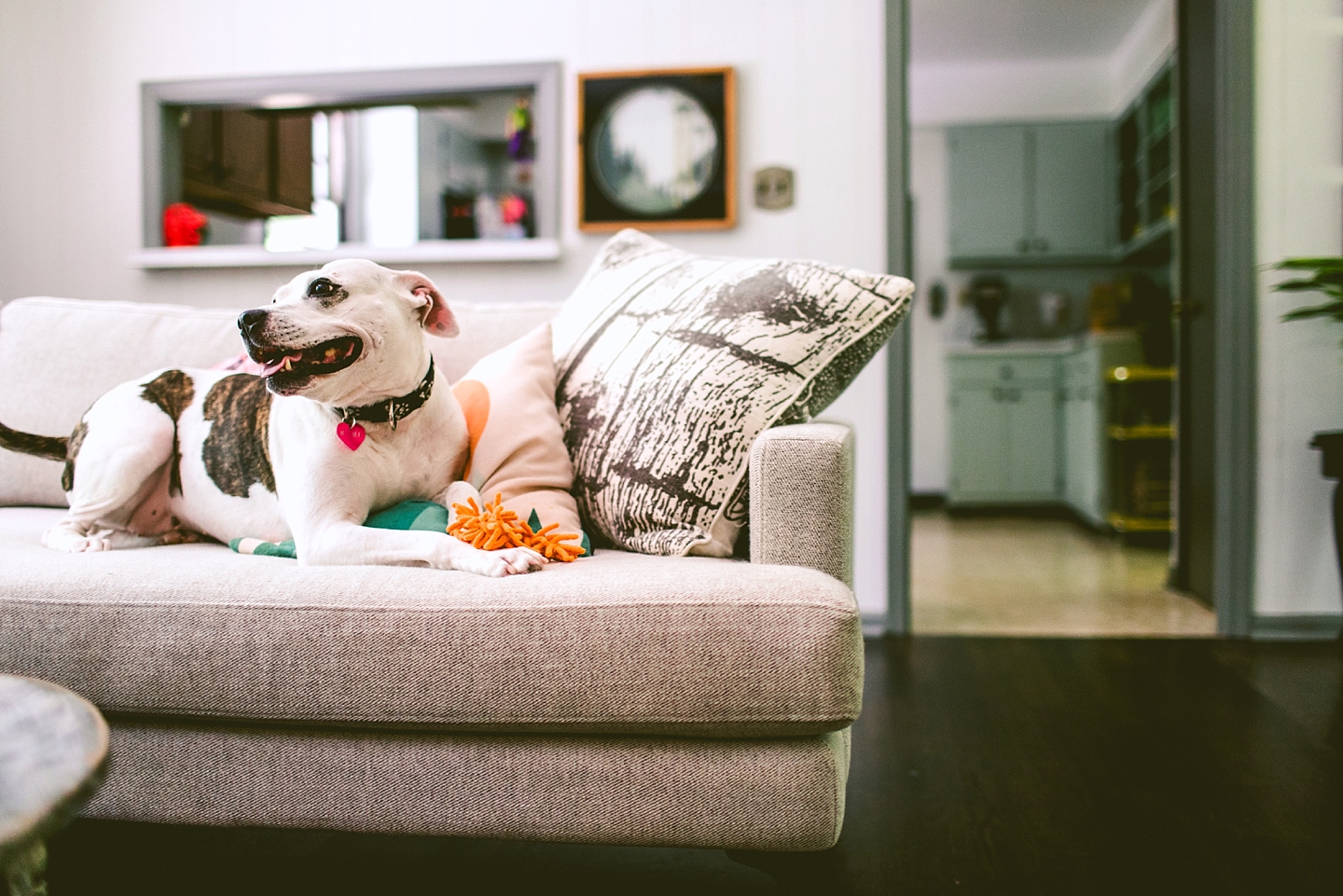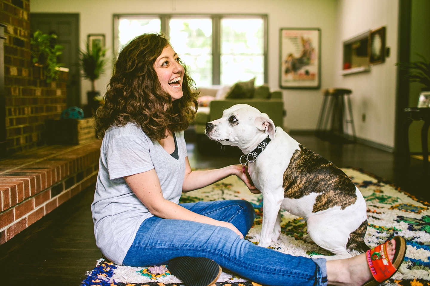 Wilma is one of the most charismatic and amusing furry creatures we have ever had the pleasure of meeting. She is incredibly happy at all times, and quirky and ridiculous 90% of the time. Words can’t really explain the adorably ridiculous vibe that she gives off, but I can try. Mostly, she’s just really obsessed with the couch. Like, super obsessed. When Jessica wrote me to ask for pictures of Wilma for her 5 year adoptiversary, she told me about the couch (she also told me about her fantastically awesome airbrushed and glitter WILMA shirt from the State Fair that I forced her to wear for a few pictures because there’s no way you can tell me that you got an airbrushed shirt with your dog’s name on it at the fair and expect me not to make you wear it… and she also told me about the custom Wilma beer koozies in her and Dustin’s possession. Wilma, clearly, is very much loved and for good reason). But I had no idea how much the couch was truly, truly loved until we visited and saw her expression of pure delight being anywhere near it, but mostly sitting on it, sprawling on it, and relaxing over a variety of throw pillows.
