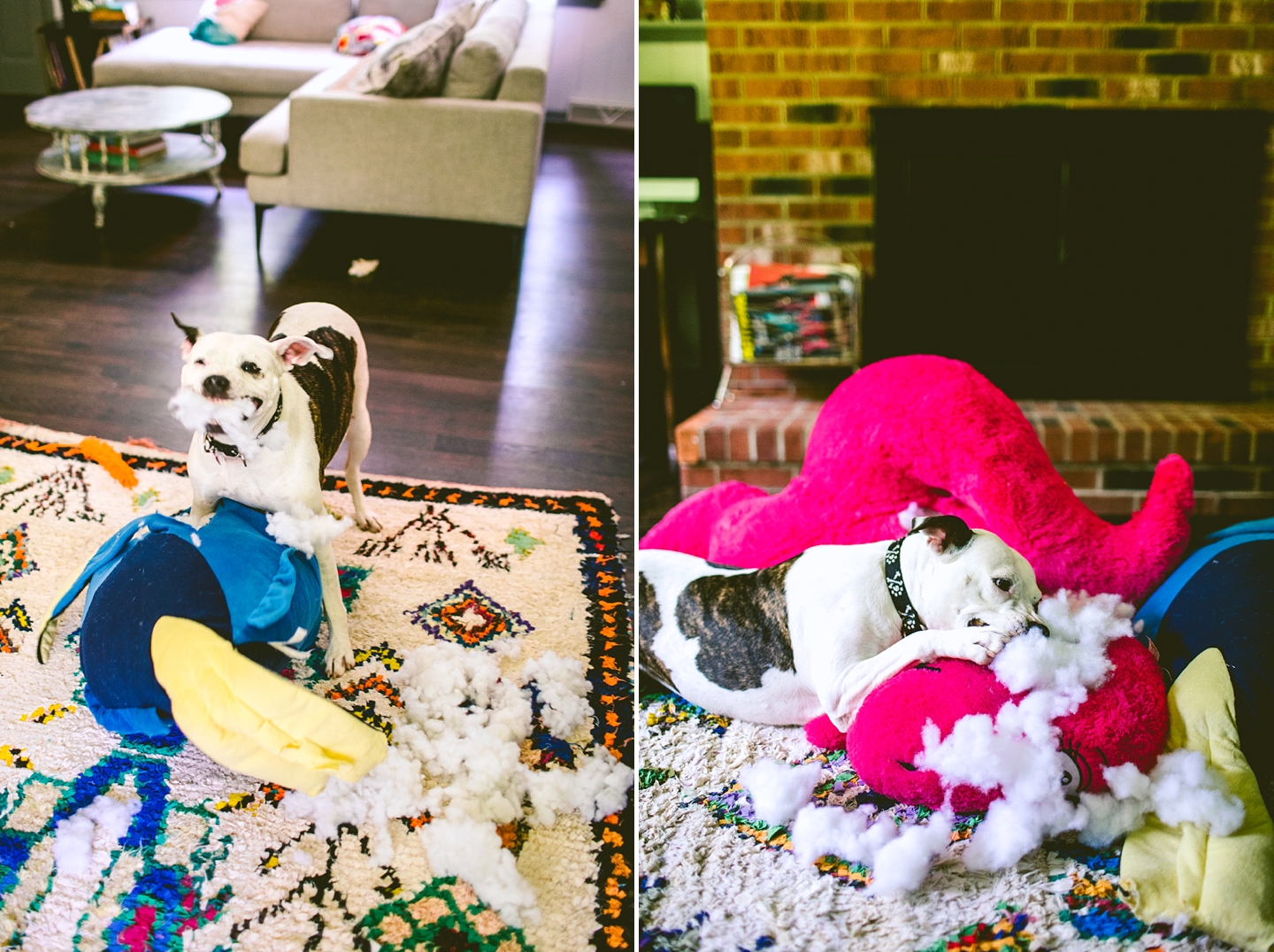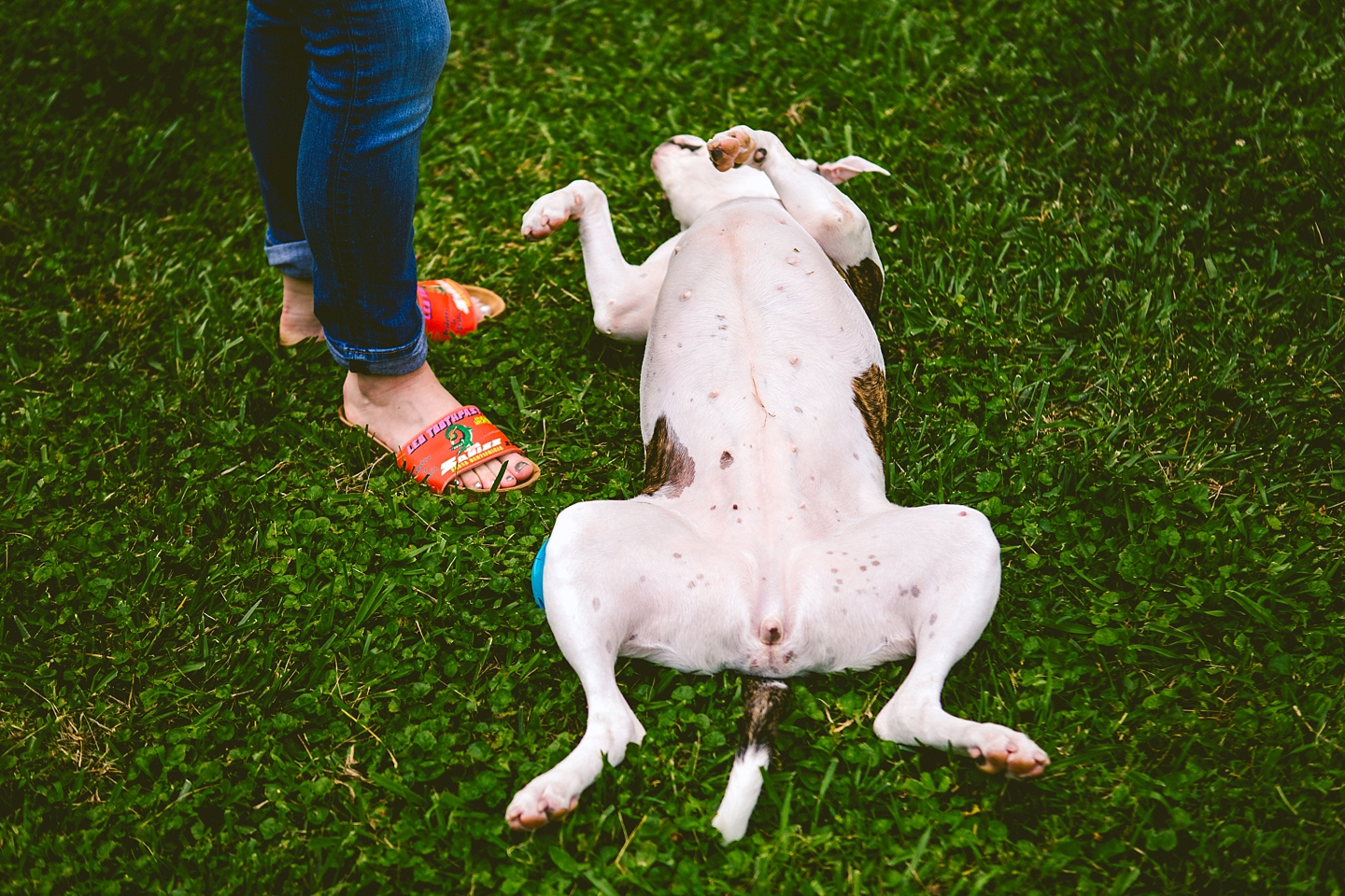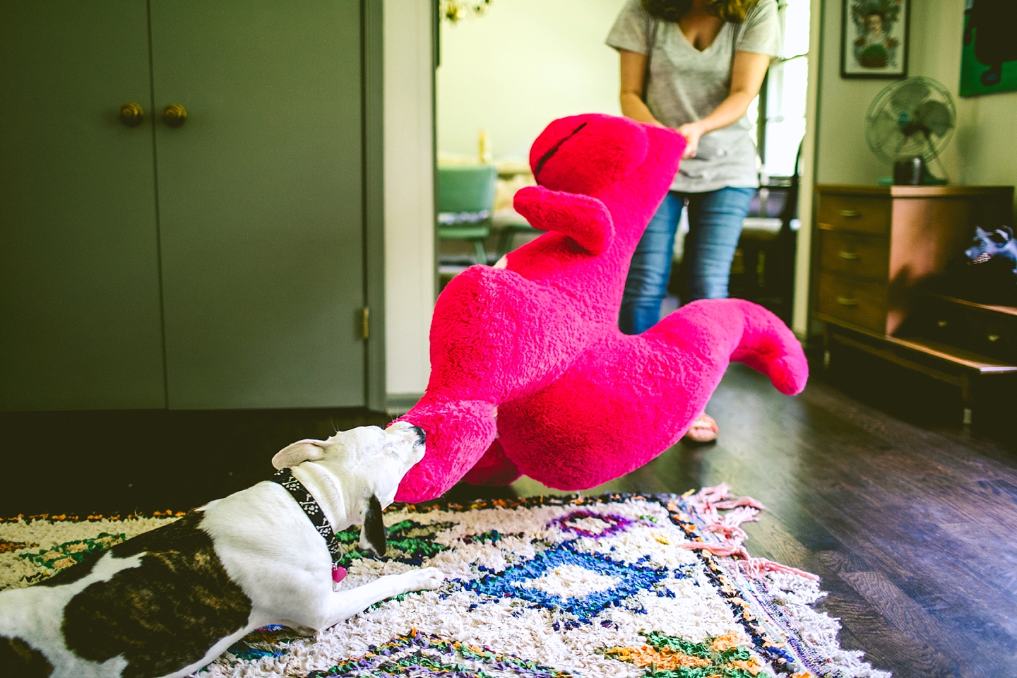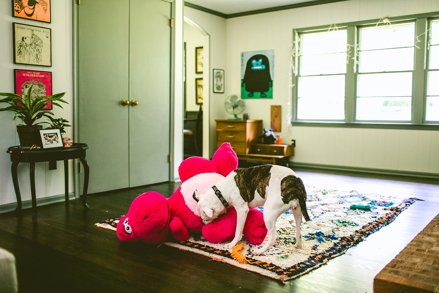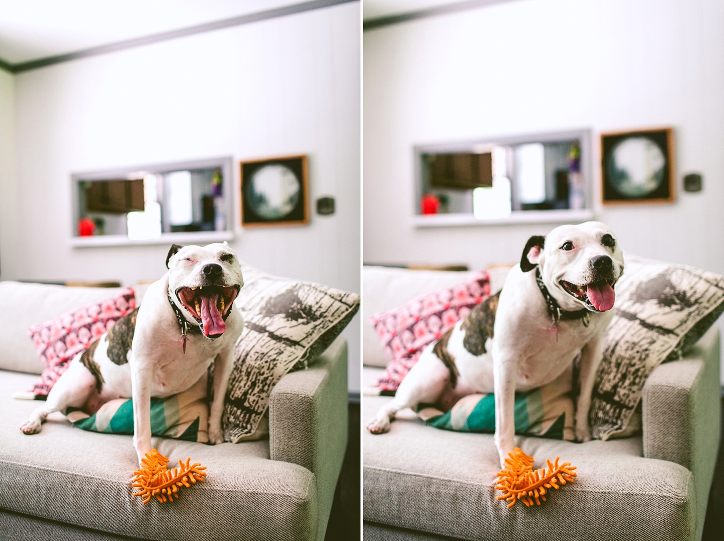 In addition to loving her couch and not wanting to ever get off the couch, she also enjoys walking outside to simply stand in the lawn (heavy coaxing was needed to play because Wilma is exceedingly lazy in the most wonderful way), laying on her back for belly rubs, and licking Jessica and Dustin (who have the most amazing old Volkswagen but also the most amazing kitchen appliances I’ve ever seen [not pictured here] in their amazing house). But one of the best things that happened was Jessica telling me she bought Wilma a pink dinosaur to destroy, and then Jessica proceeded to drag out this HUGE ass dinosaur from a spare room… the size of which is the large and giant type which your boyfriend would win for you at a carnival and you wouldn’t know what to do with it because you really can’t be expected to carry that around all night. I was expecting, you know, a dog toy. But apparently, in another highly amusing trait she has, Wilma enjoys opening a hole in each of these stuffed creatures and ripping out the stuffing like she’s disemboweling prey in the Serengeti. I can’t explain Wilma, but I do love her. And I love the love her people exhibit for her. So happy to take these pictures for Jessica+Dustin of their lovely little girl!