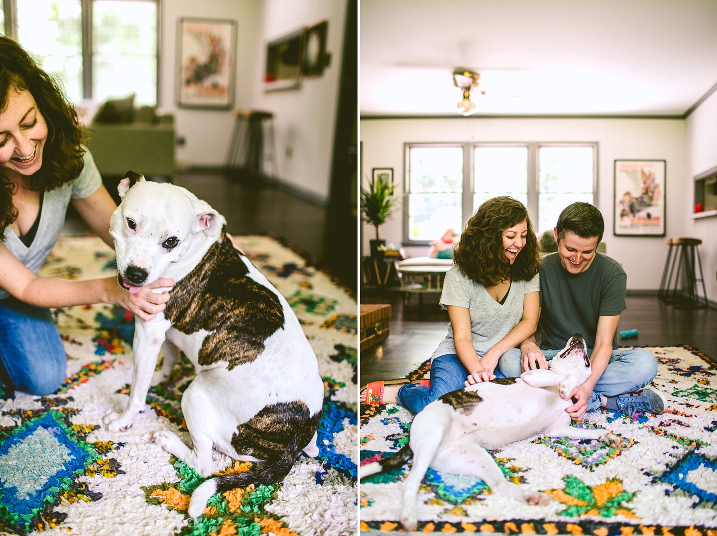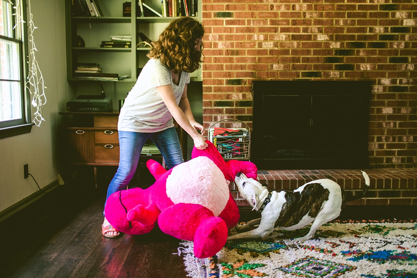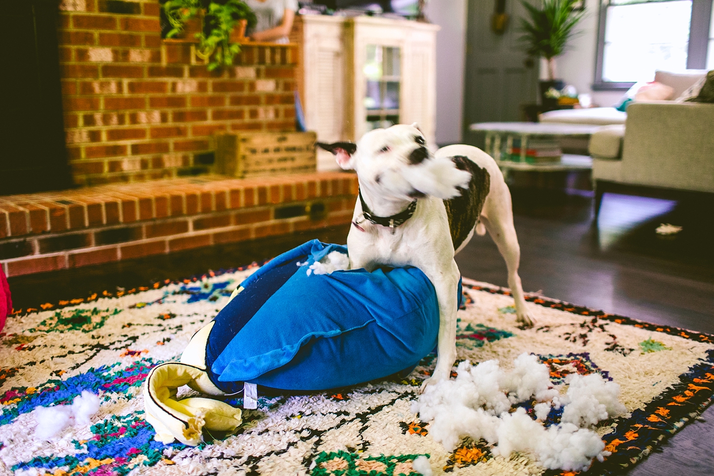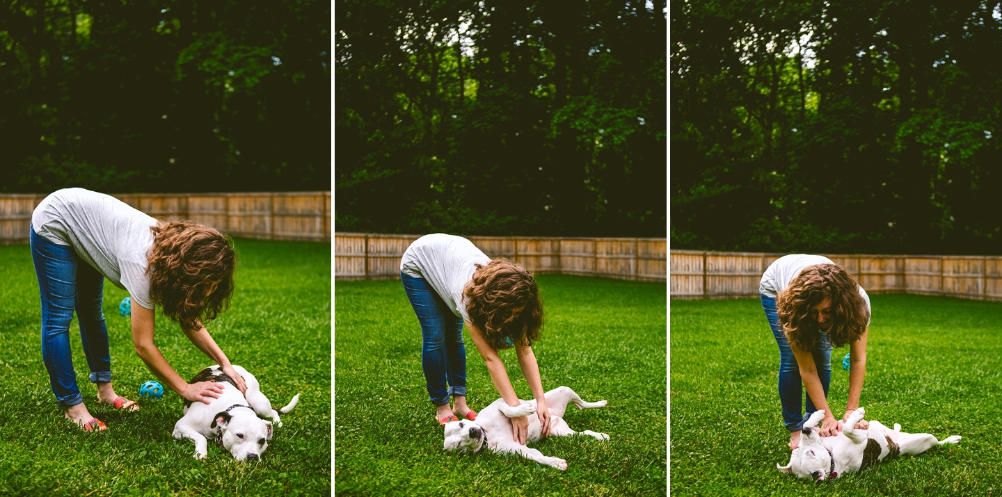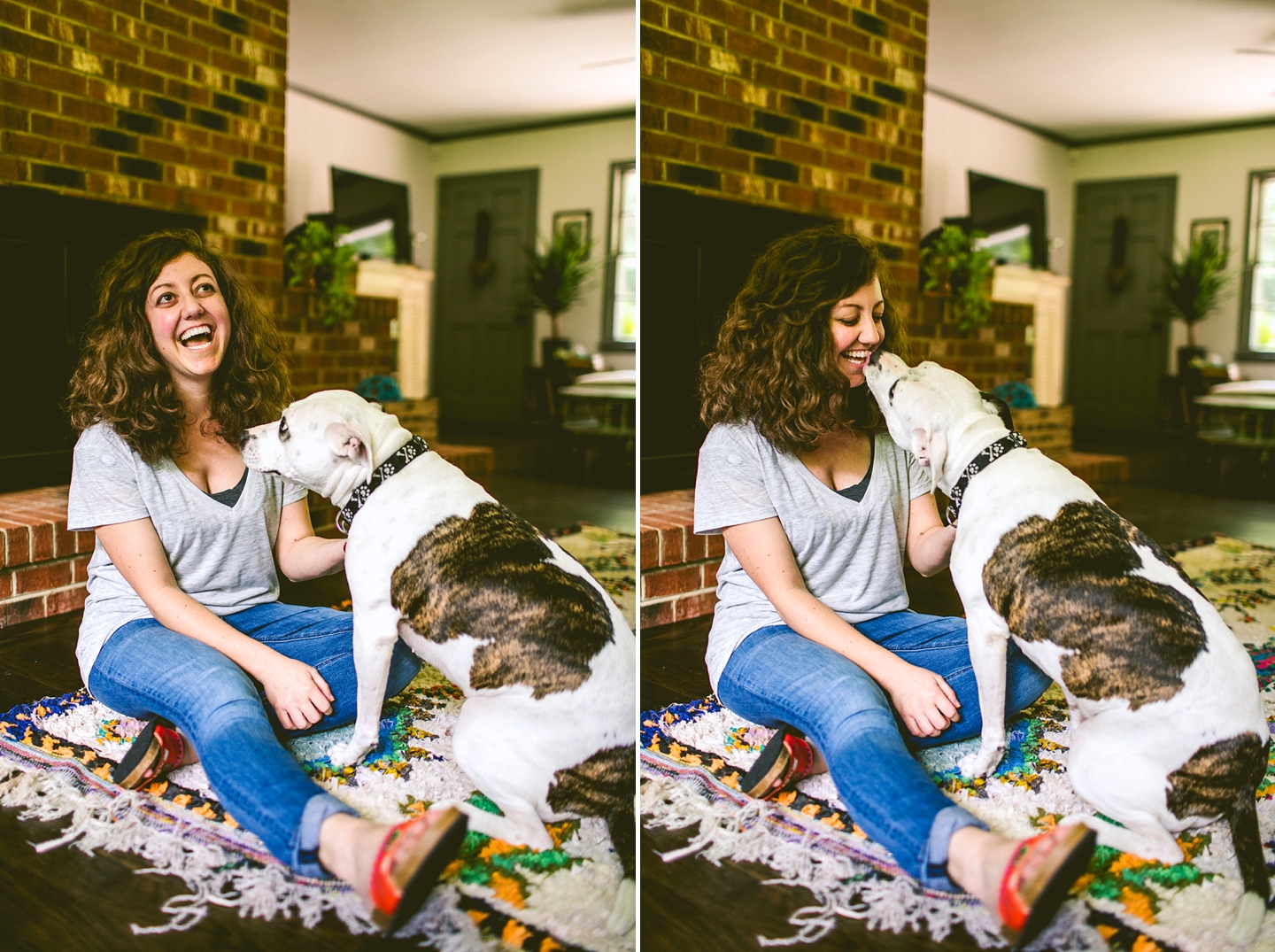 In addition to loving her couch and not wanting to ever get off the couch, she also enjoys walking outside to simply stand in the lawn (heavy coaxing was needed to play because Wilma is exceedingly lazy in the most wonderful way), laying on her back for belly rubs, and licking Jessica and Dustin (who have the most amazing old Volkswagen but also the most amazing kitchen appliances I’ve ever seen [not pictured here] in their amazing house). But one of the best things that happened was Jessica telling me she bought Wilma a pink dinosaur to destroy, and then Jessica proceeded to drag out this HUGE ass dinosaur from a spare room… the size of which is the large and giant type which your boyfriend would win for you at a carnival and you wouldn’t know what to do with it because you really can’t be expected to carry that around all night. I was expecting, you know, a dog toy. But apparently, in another highly amusing trait she has, Wilma enjoys opening a hole in each of these stuffed creatures and ripping out the stuffing like she’s disemboweling prey in the Serengeti. I can’t explain Wilma, but I do love her. And I love the love her people exhibit for her. So happy to take these pictures for Jessica+Dustin of their lovely little girl!