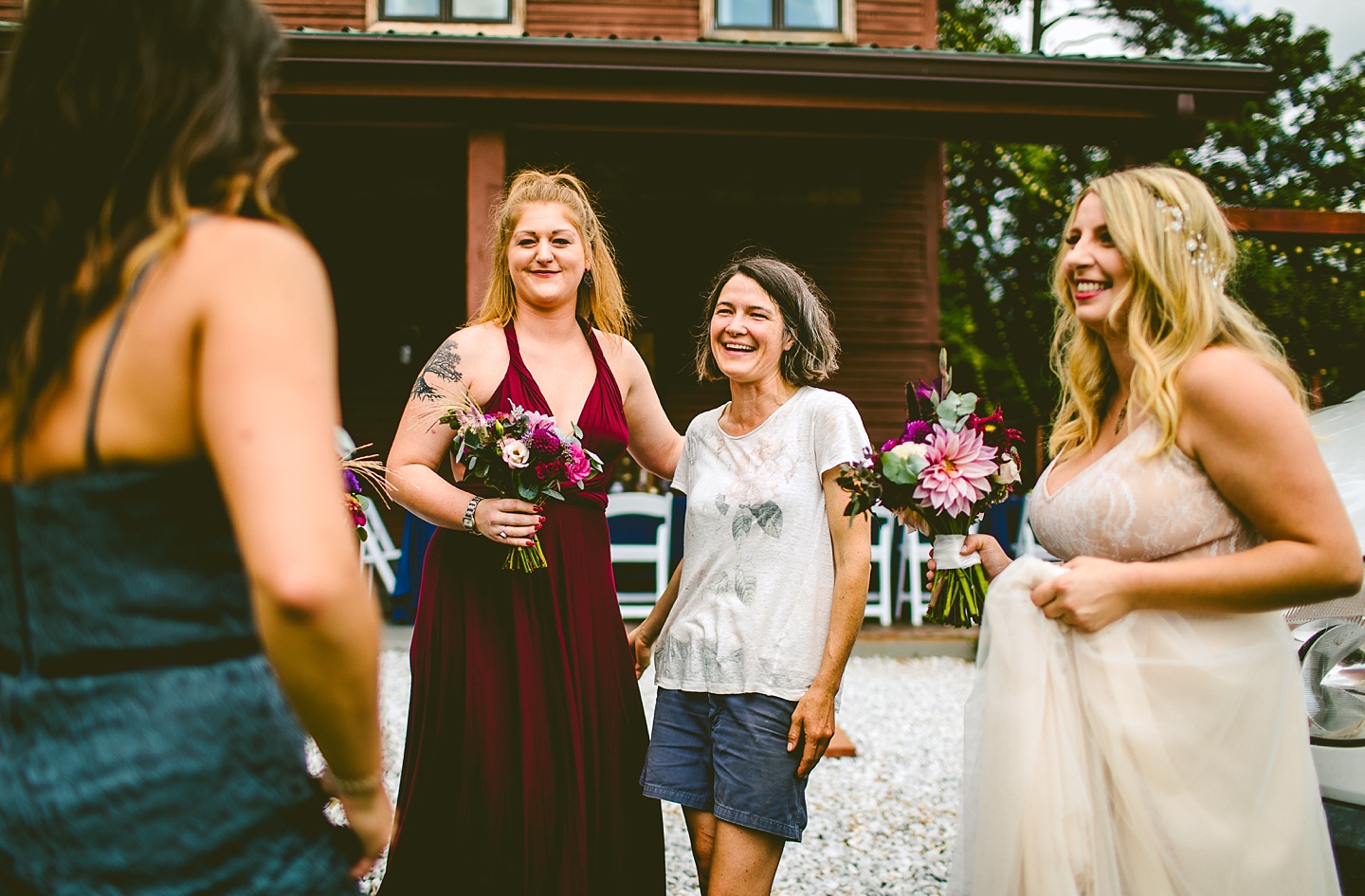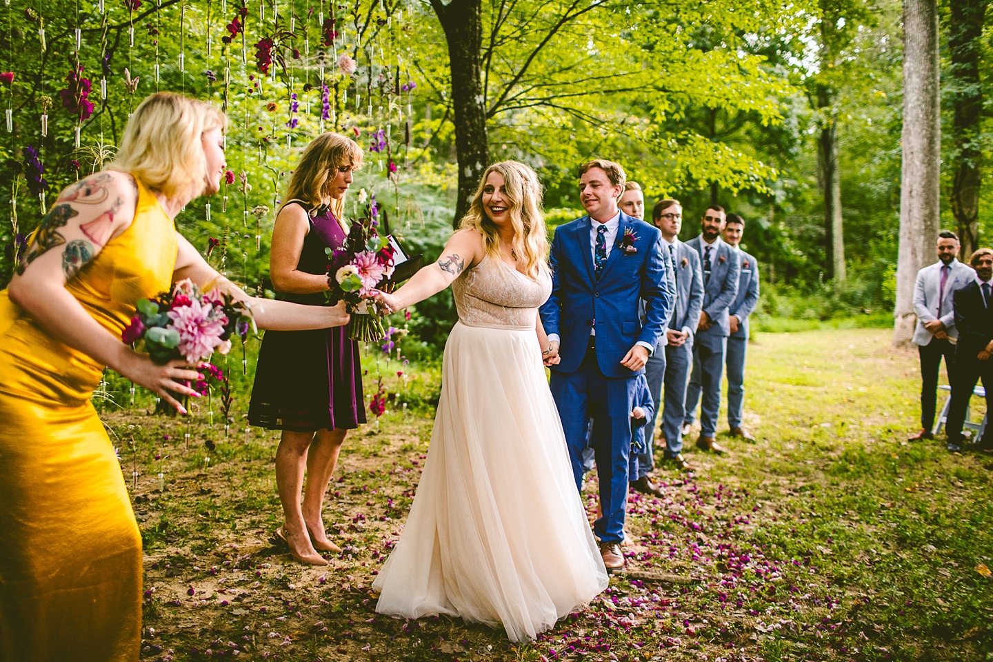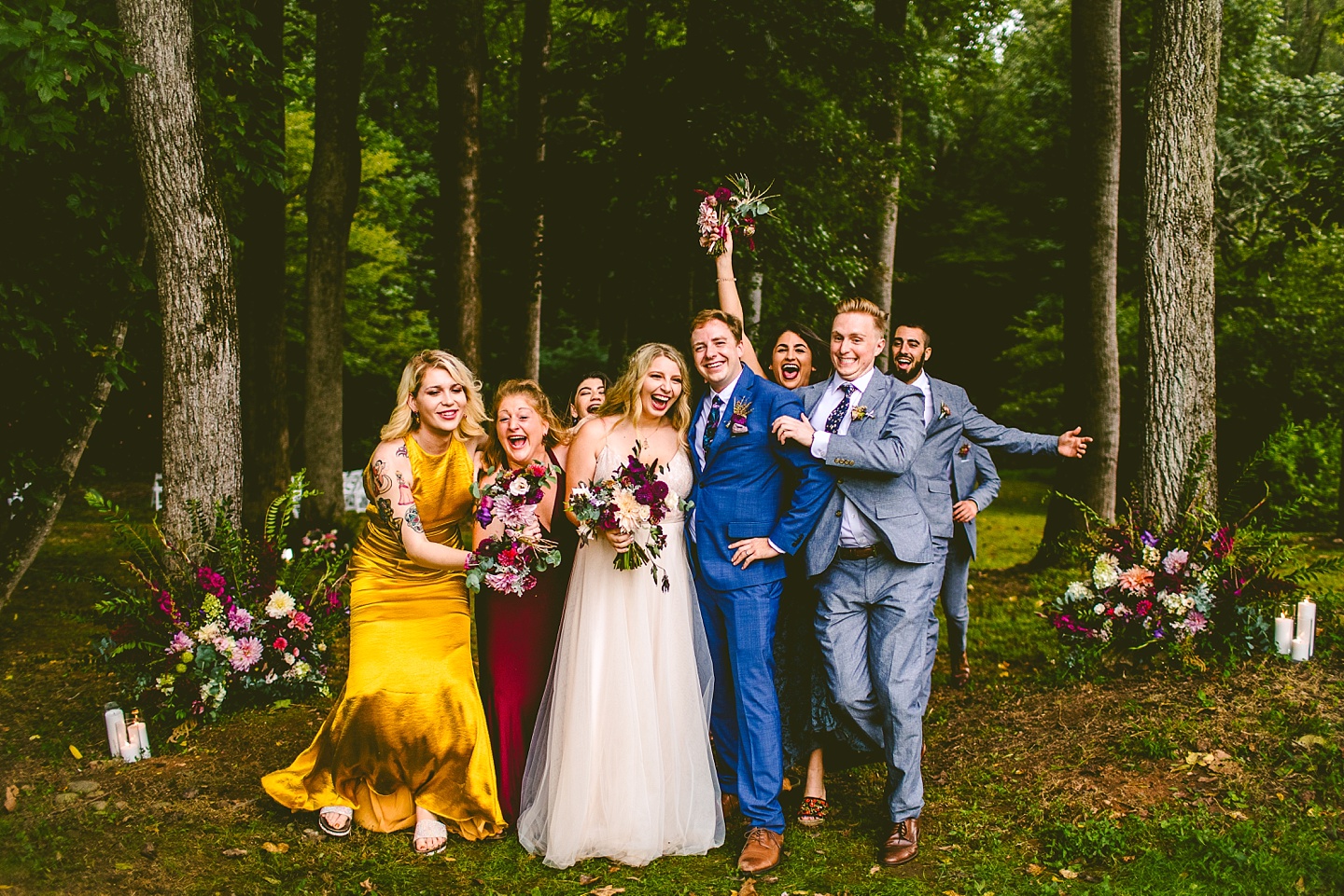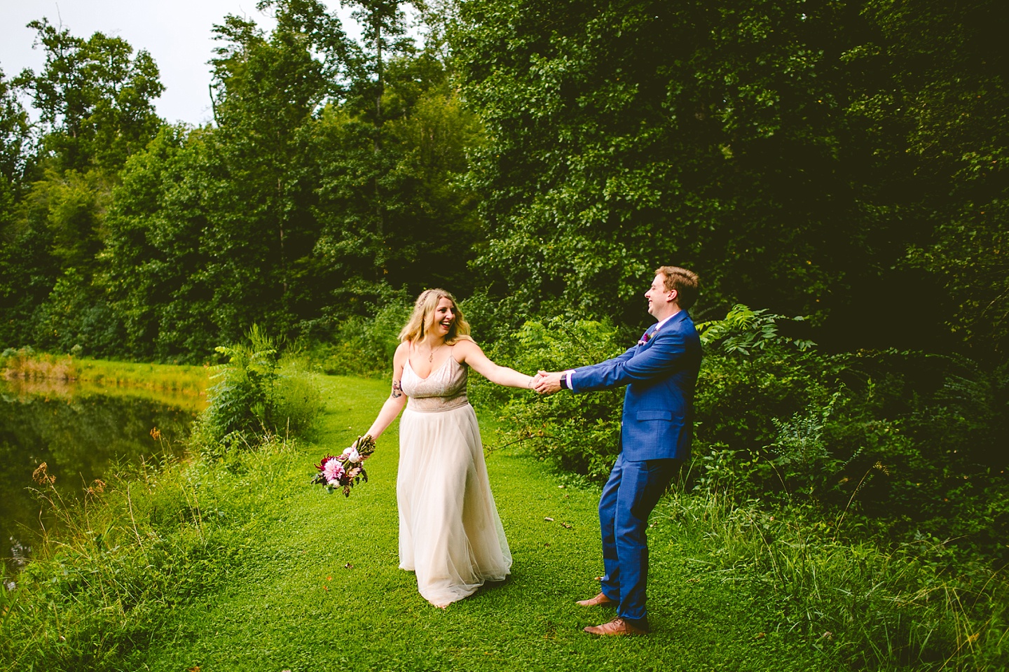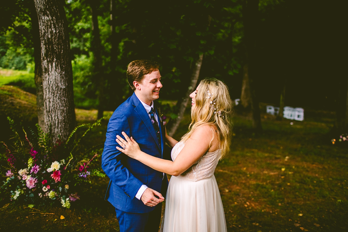 This wedding had one of the best floral altars I’ve ever seen, a vivacious bride and groom who are so supportive and caring for one another, and a band called the Harmonica Lewinskies. I daresay that I’ve never heard of a band with such a great name, and I don’t expect I’ll ever find a better one. They were formed by one of Edy and Andy’s close friends who passed away a few years ago, and they’ve since kept in touch with his bandmates who were there to support them as they got married. So not only do they have the best name, but they also have a personal connection to the couple, and everyone felt like family. Edy and Andy were married at the edge of the forest in some of the most beautiful afternoon lighting on a gorgeous day! There was thunder, but no rain, and it was all quite perfect. They danced the night away in the barn with all their family and friends. We’re so happy to have had such a loving and joyful couple as our clients. Congrats, Edy+Andy!