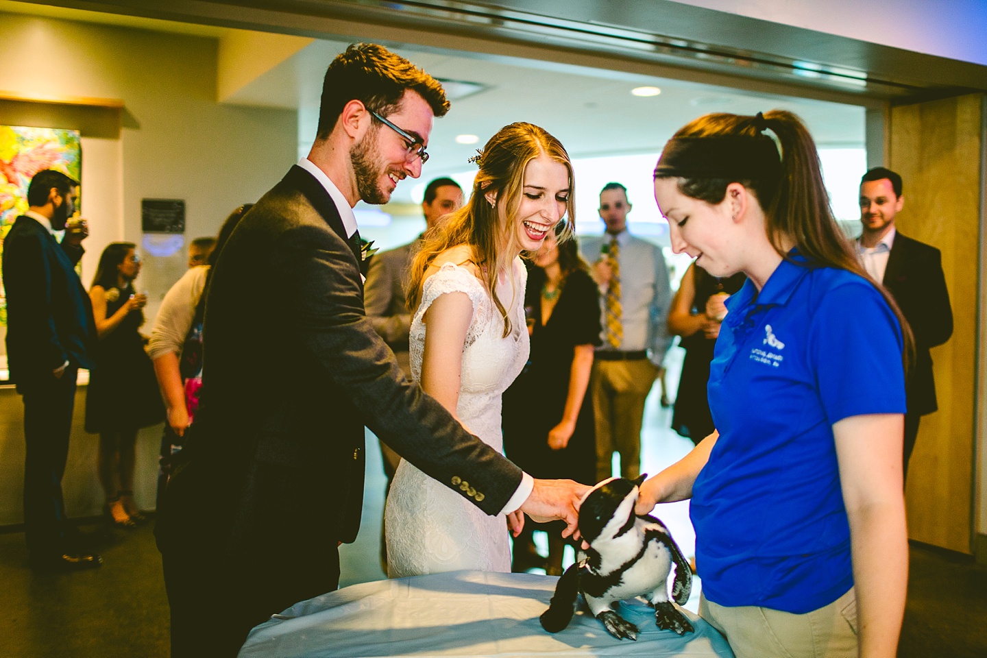 The reception of the wedding took place at PPG Aquarium at the Pittsburgh Zoo where the very large sting rays that you can pet quickly became the most popular wedding guests (if you held your hand above the water by a couple inches, they should slide up the glass and touch your hand with their… nose? face? what does a stingray have?). Both locations – Sara’s childhood church and the PPG Aquarium – were quite fitting as Sara was born and raised in the ‘Burgh (although Ed hails from Ohio). They both live in New York City now, but Sara wanted to capture the ‘Burgh atmosphere in all locations. We had an amazing time at their wedding and wish them both the very best at their super awesome tv/film jobs in New York!